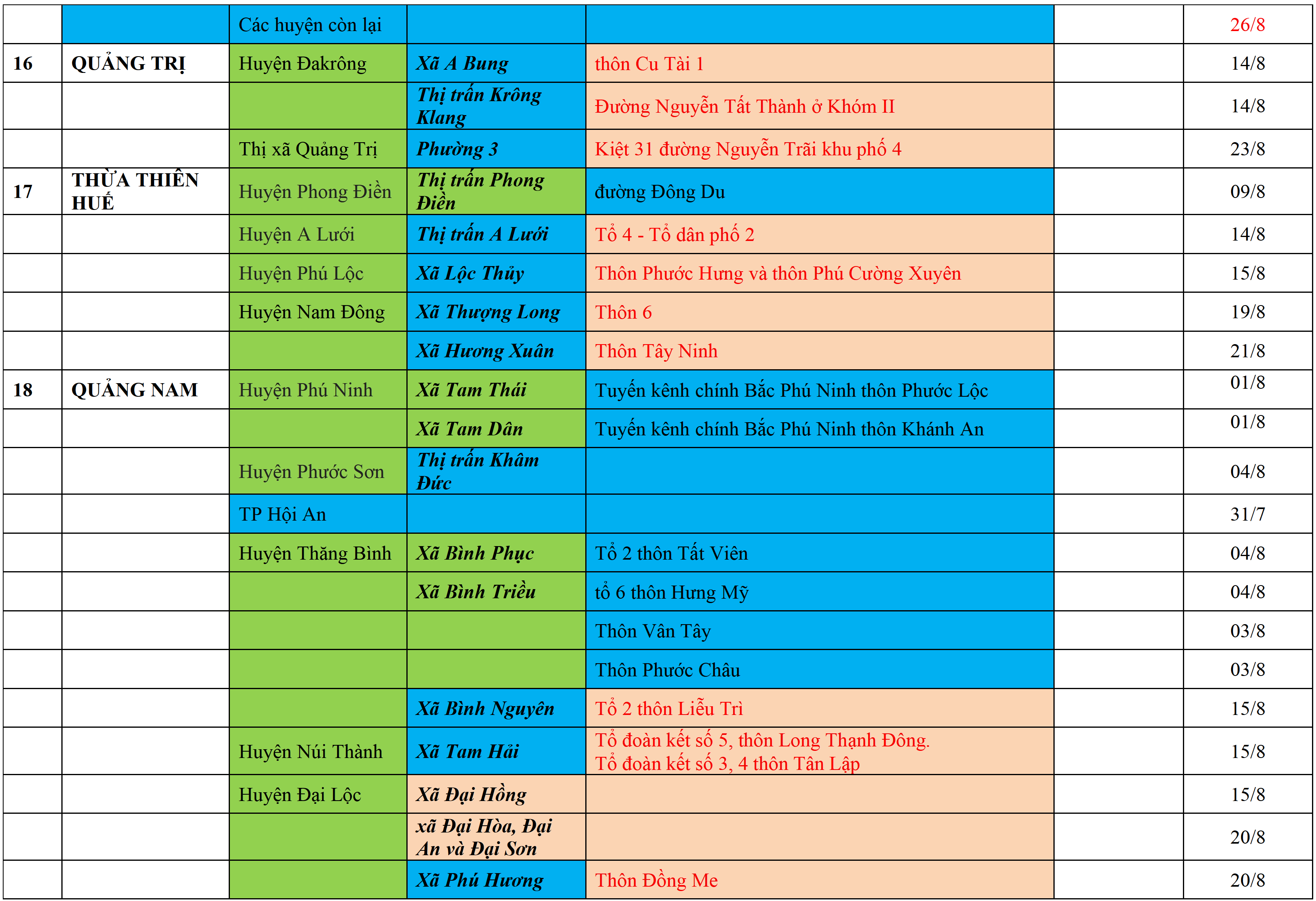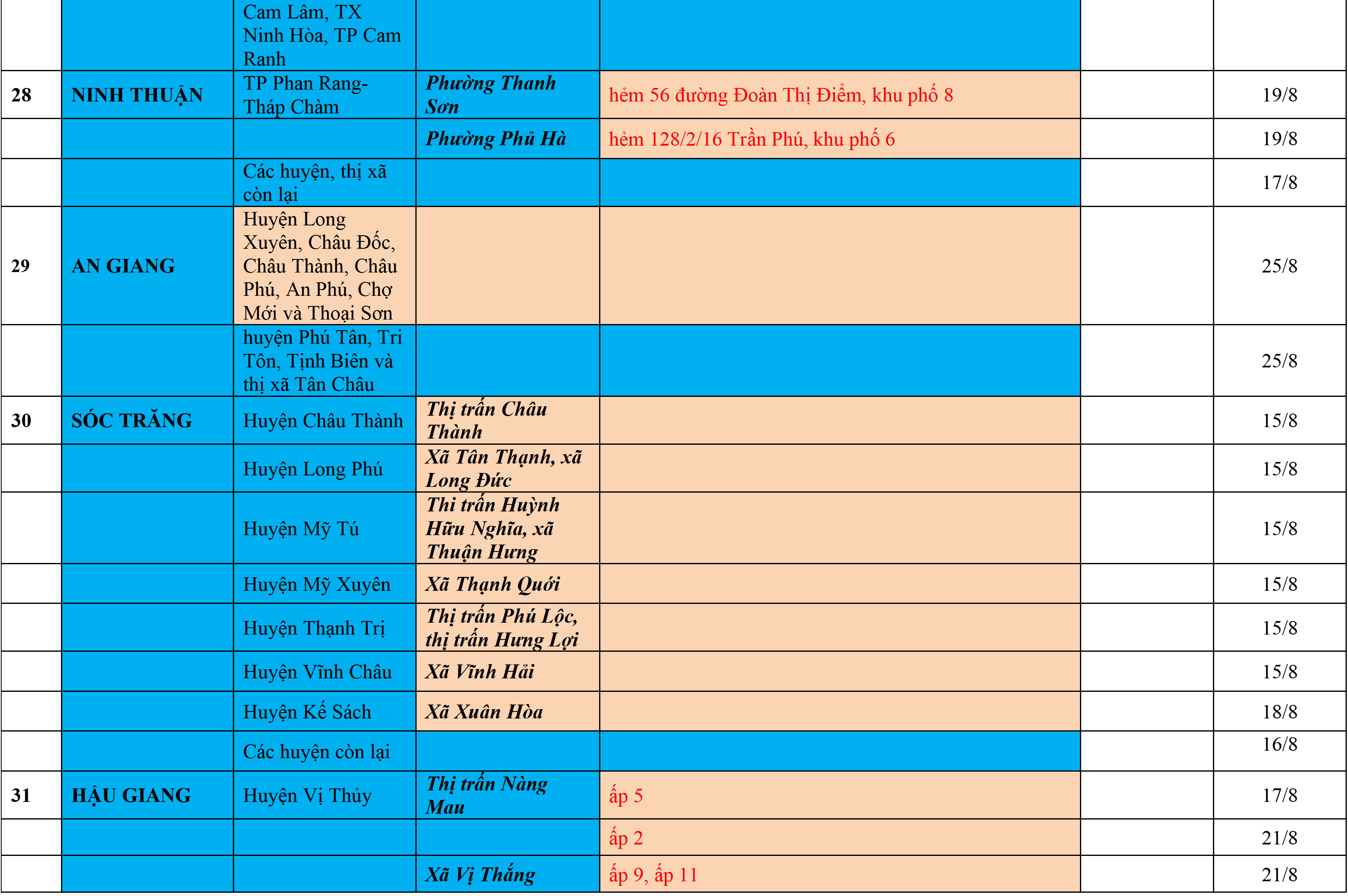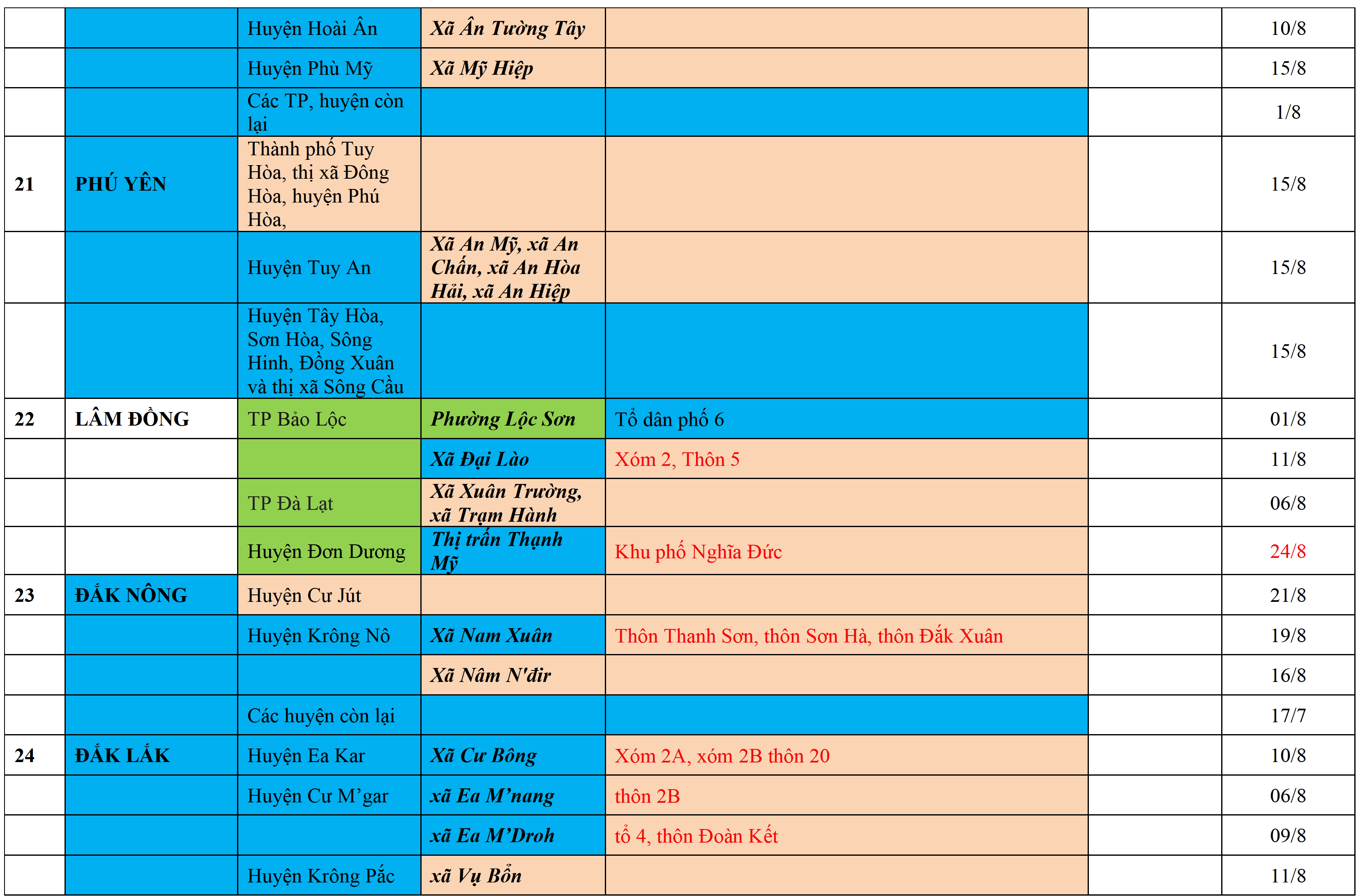 Màu nâu: TẠM DỪNG TIẾP NHẬN; Màu cam: CÁCH LY TẬP TRUNG 14 NGÀY; Màu xanh nước biển: CÁCH LY TẠI NHÀ 14 NGÀY; Màu xanh mạ: KHAI BÁO, GIÁM SÁT Y TẾ; Màu trắng: KHAI BÁO Y TẾ VÀ THỰC HIỆN 5K.