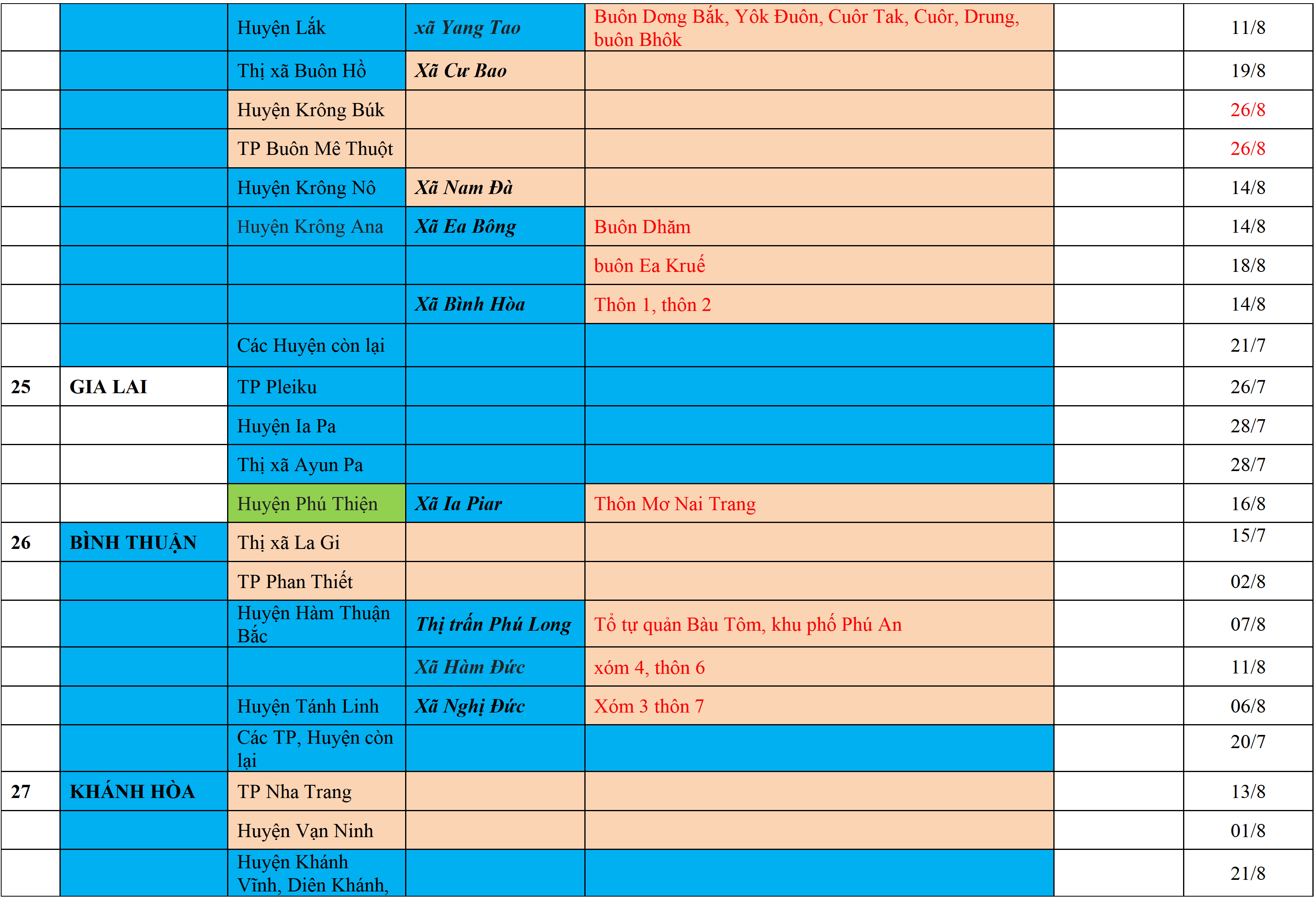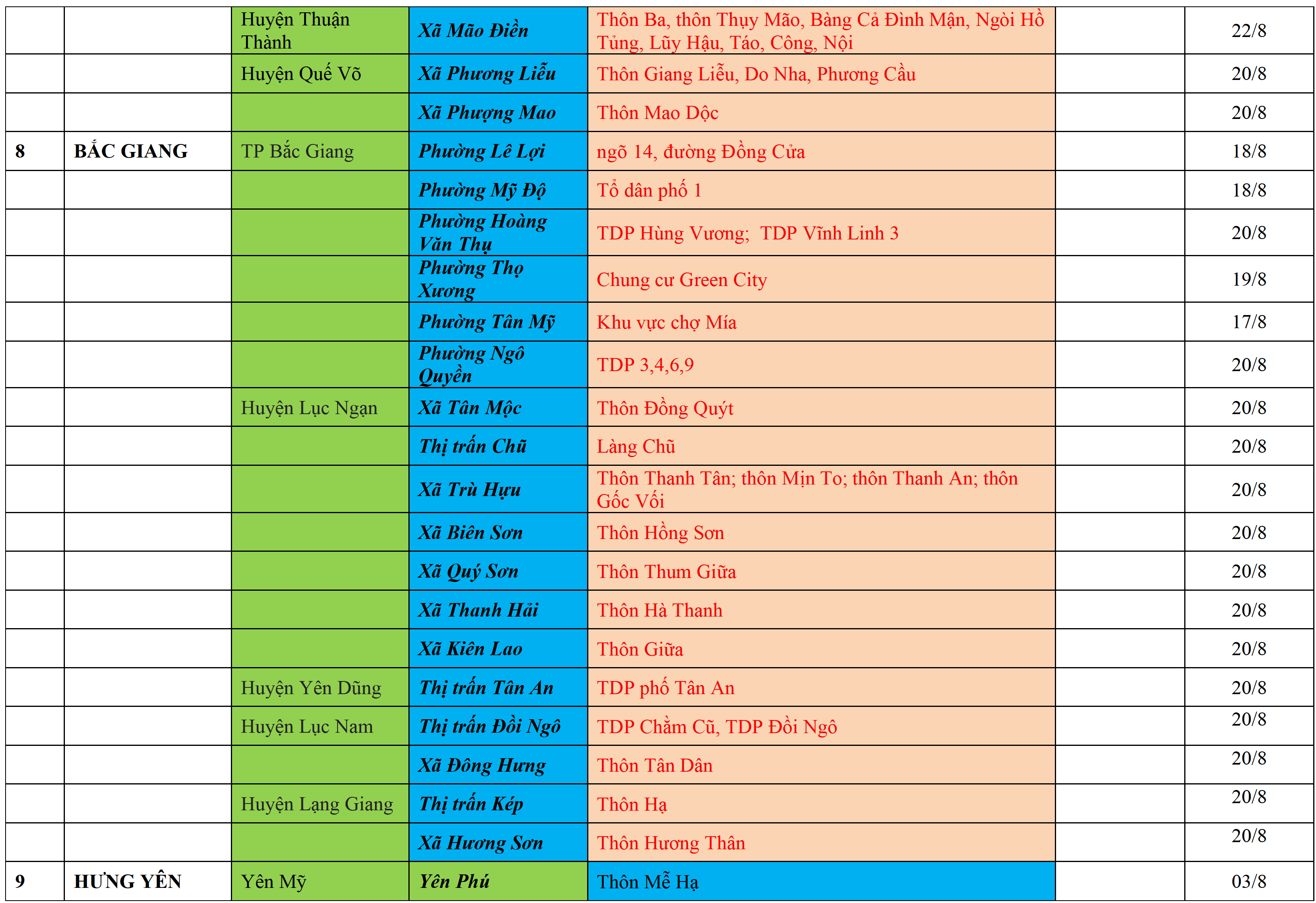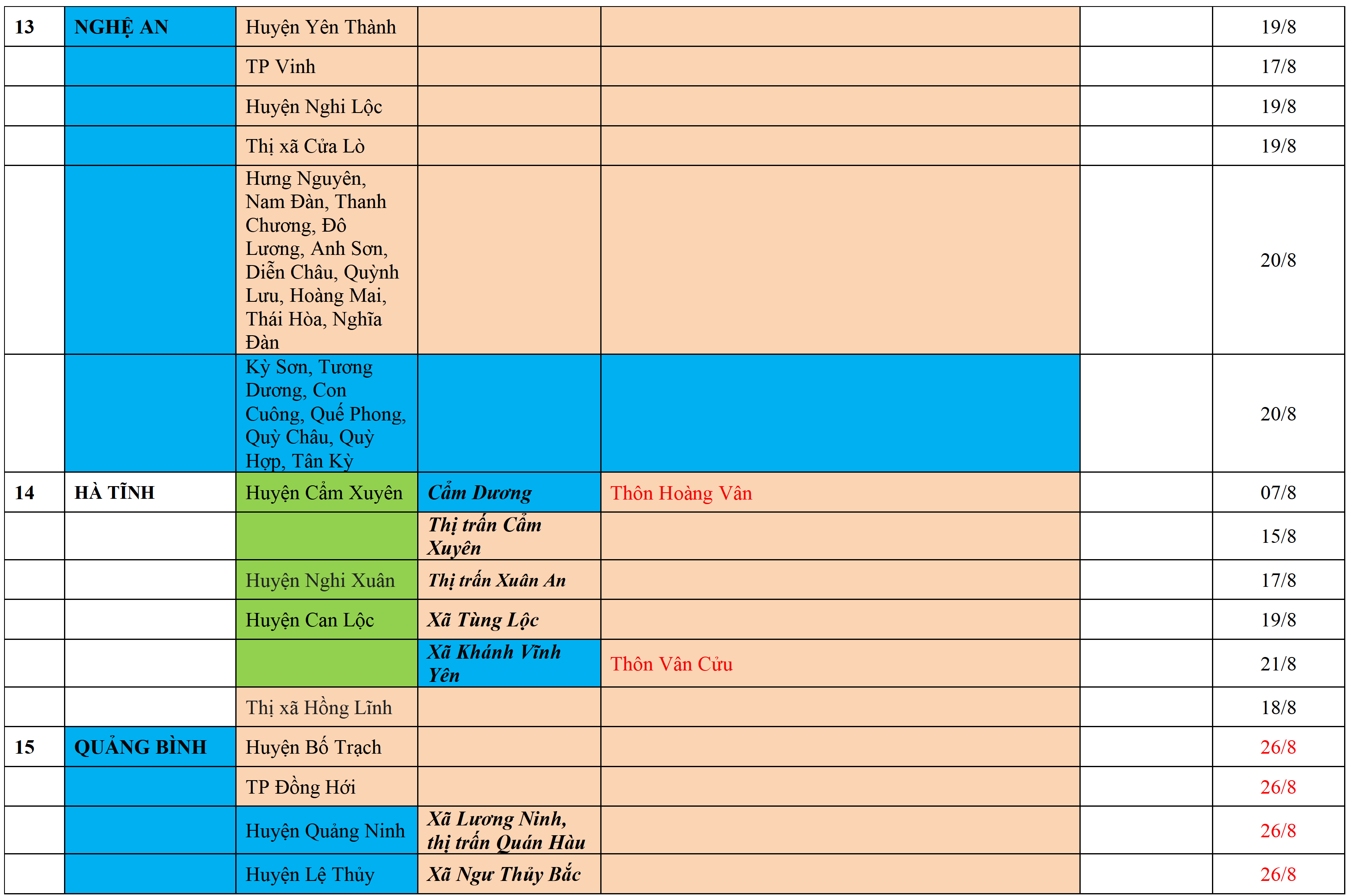 Màu nâu: TẠM DỪNG TIẾP NHẬN; Màu cam: CÁCH LY TẬP TRUNG 14 NGÀY; Màu xanh nước biển: CÁCH LY TẠI NHÀ 14 NGÀY; Màu xanh mạ: KHAI BÁO, GIÁM SÁT Y TẾ; Màu trắng: KHAI BÁO Y TẾ VÀ THỰC HIỆN 5K.