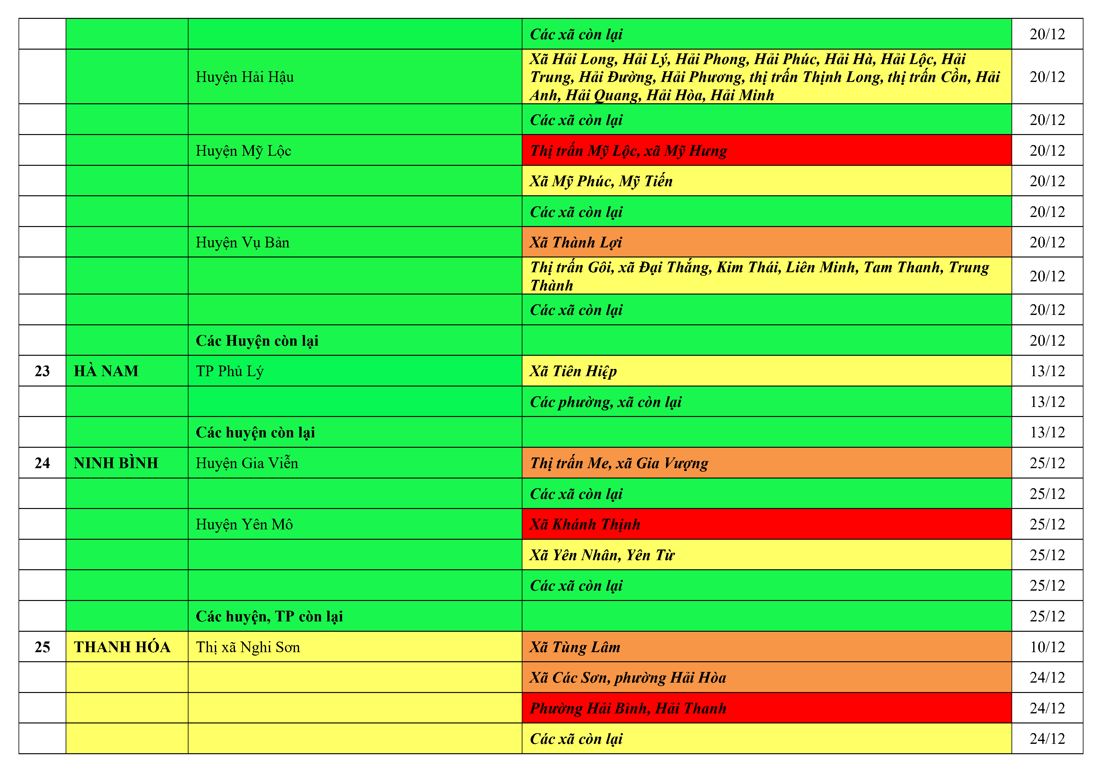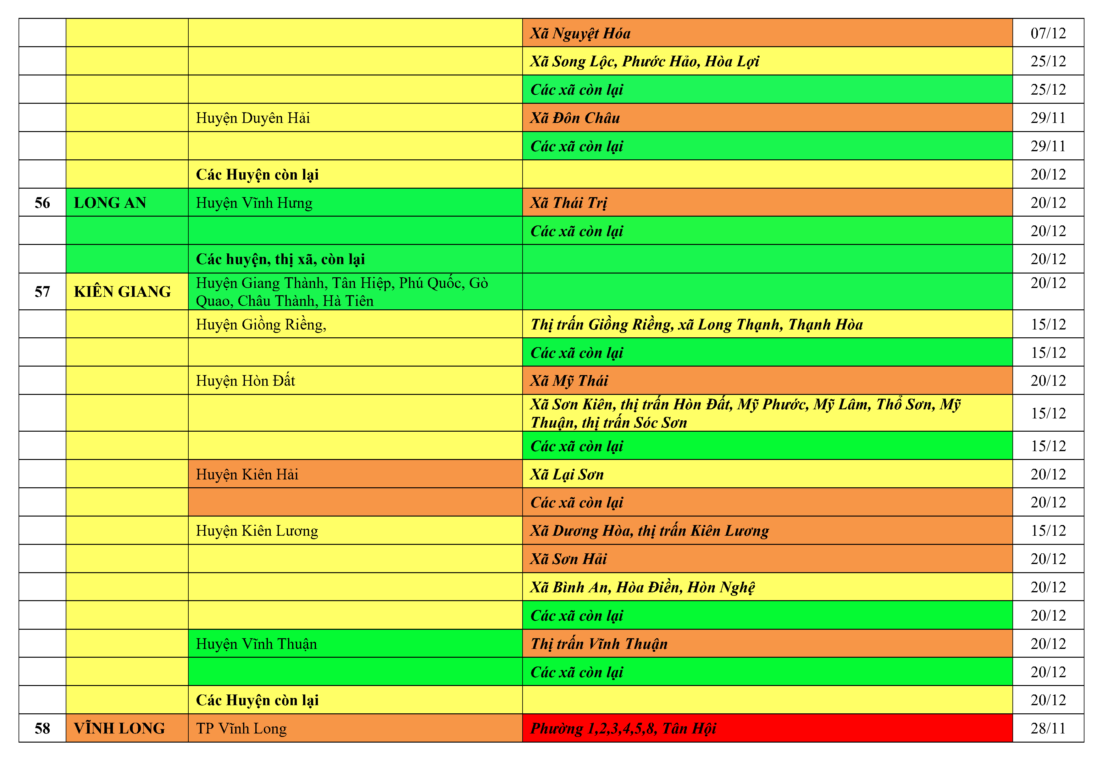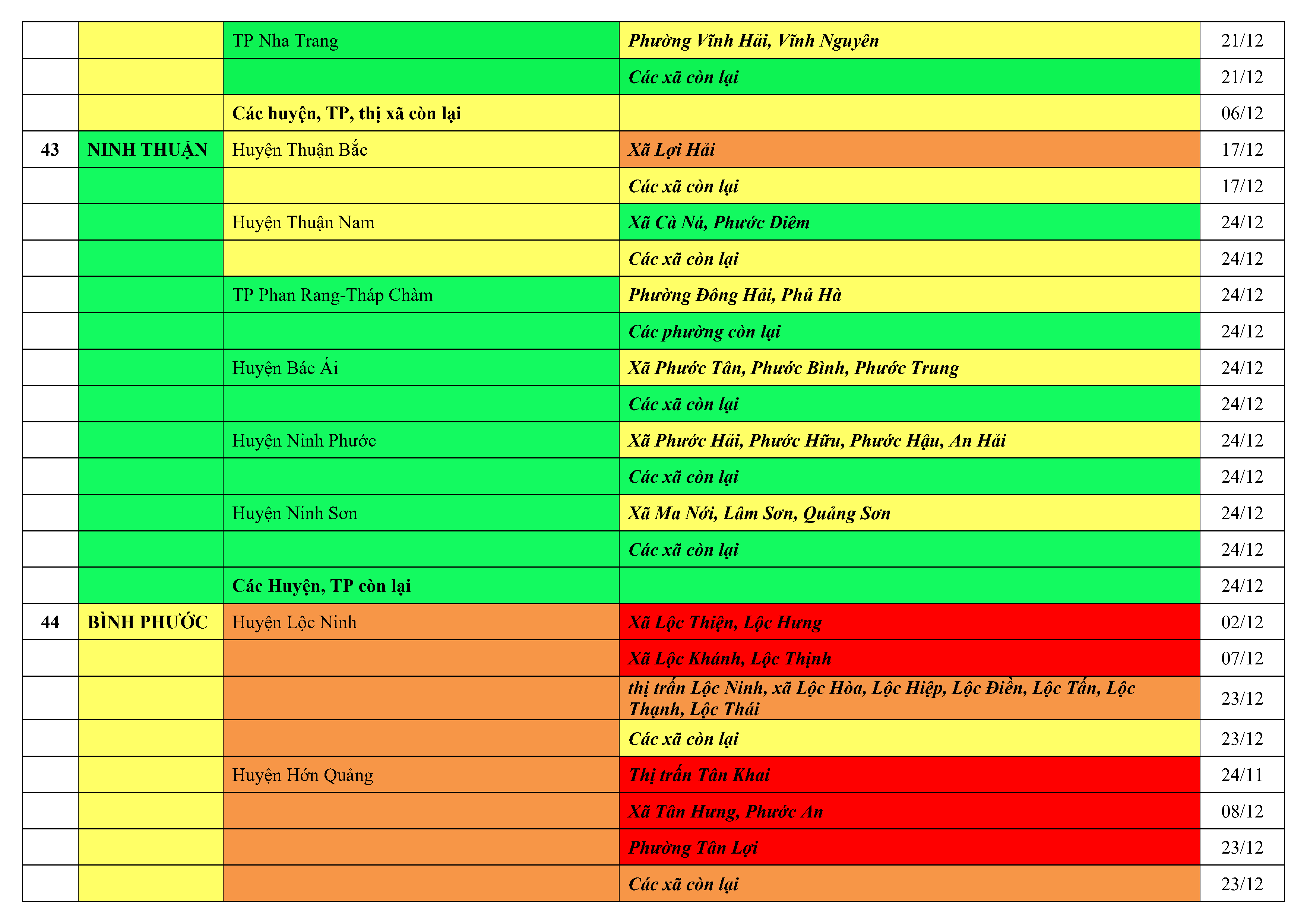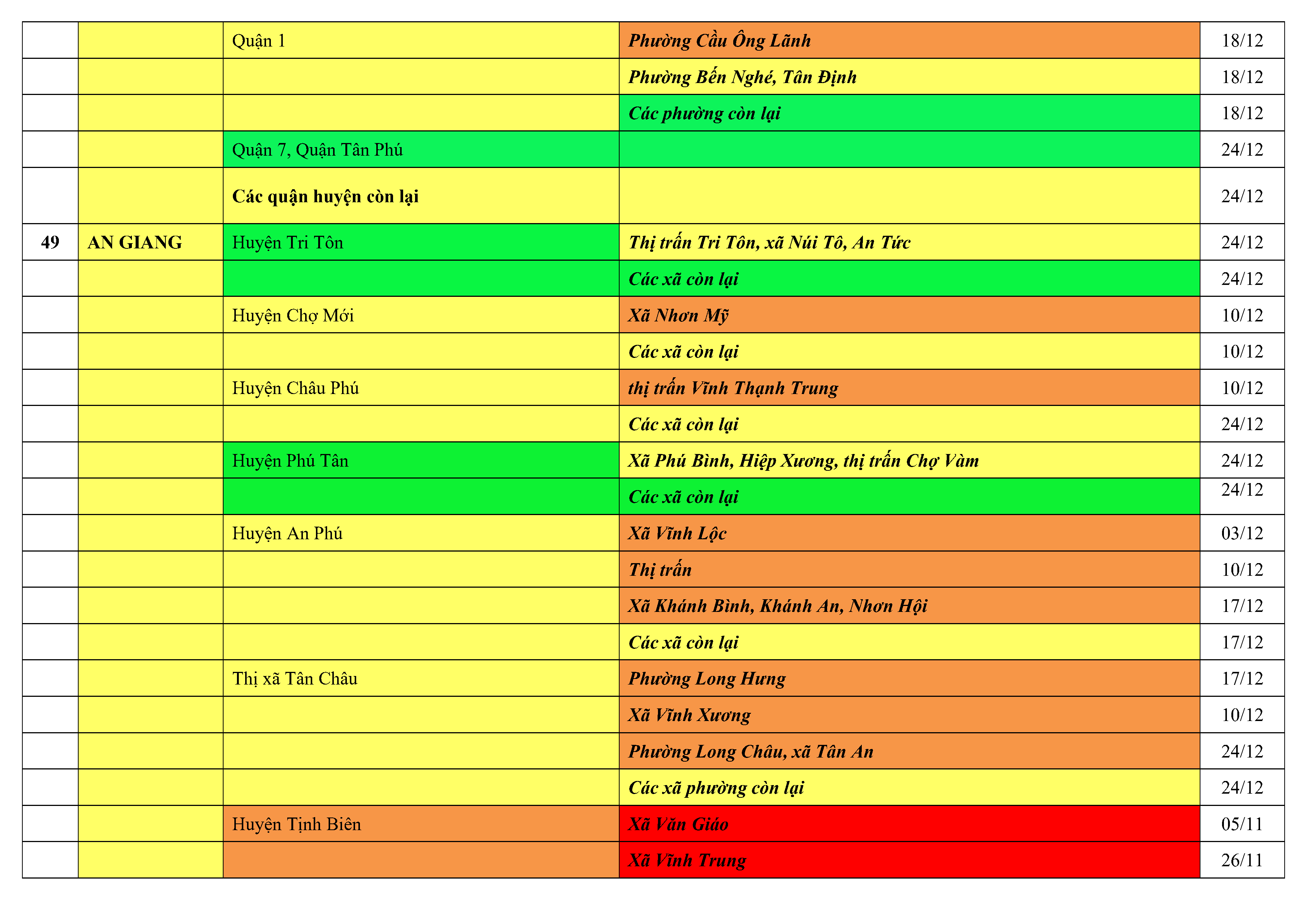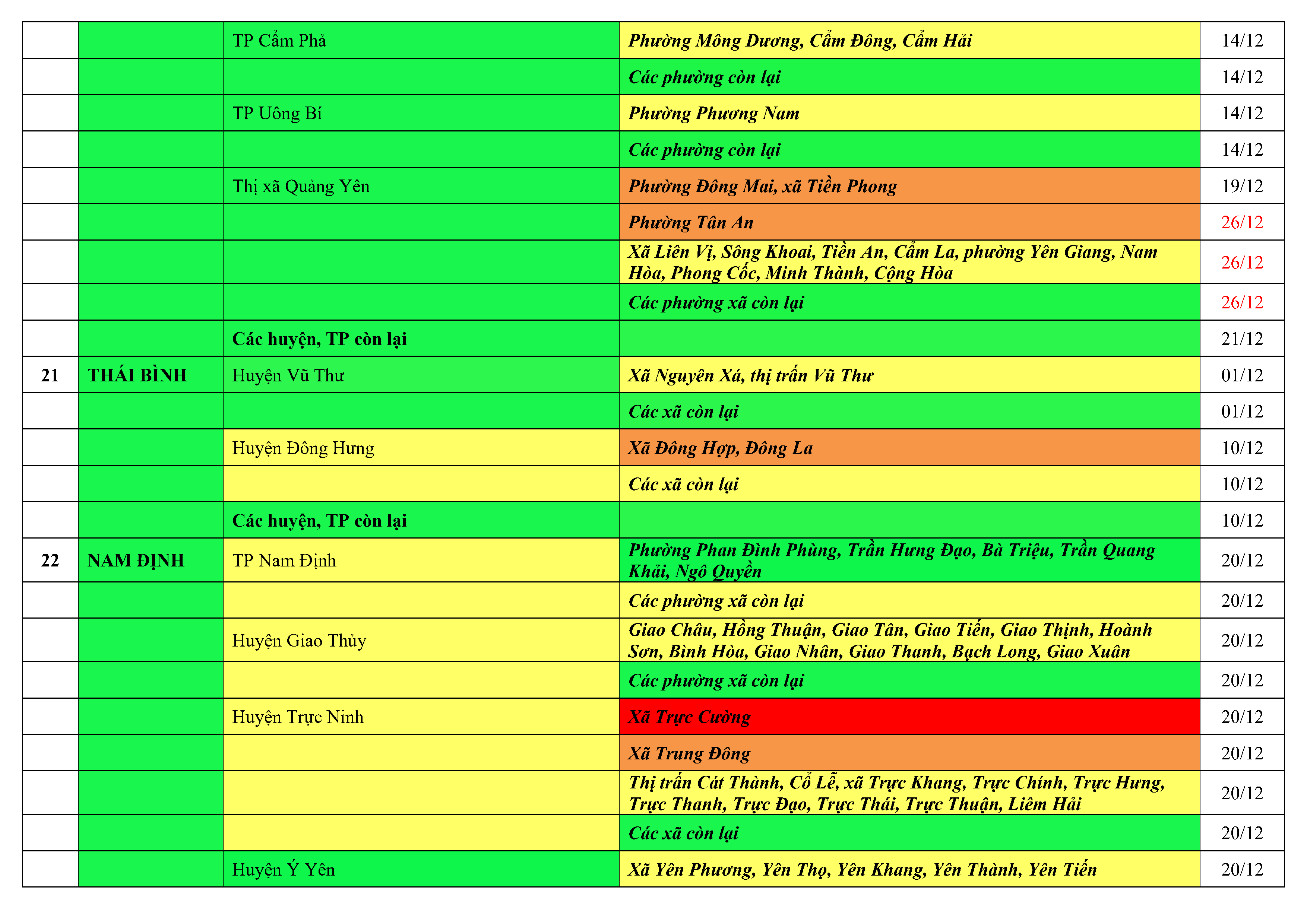 Lưu ý: Các tỉnh, thành phố không có tên trong bảng màu, đi lại bình thường, tuân thủ các biện pháp phòng chống dịch theo chỉ đạo của Bộ Y tế; khai báo y tế, thực hiện nghiêm 5K.