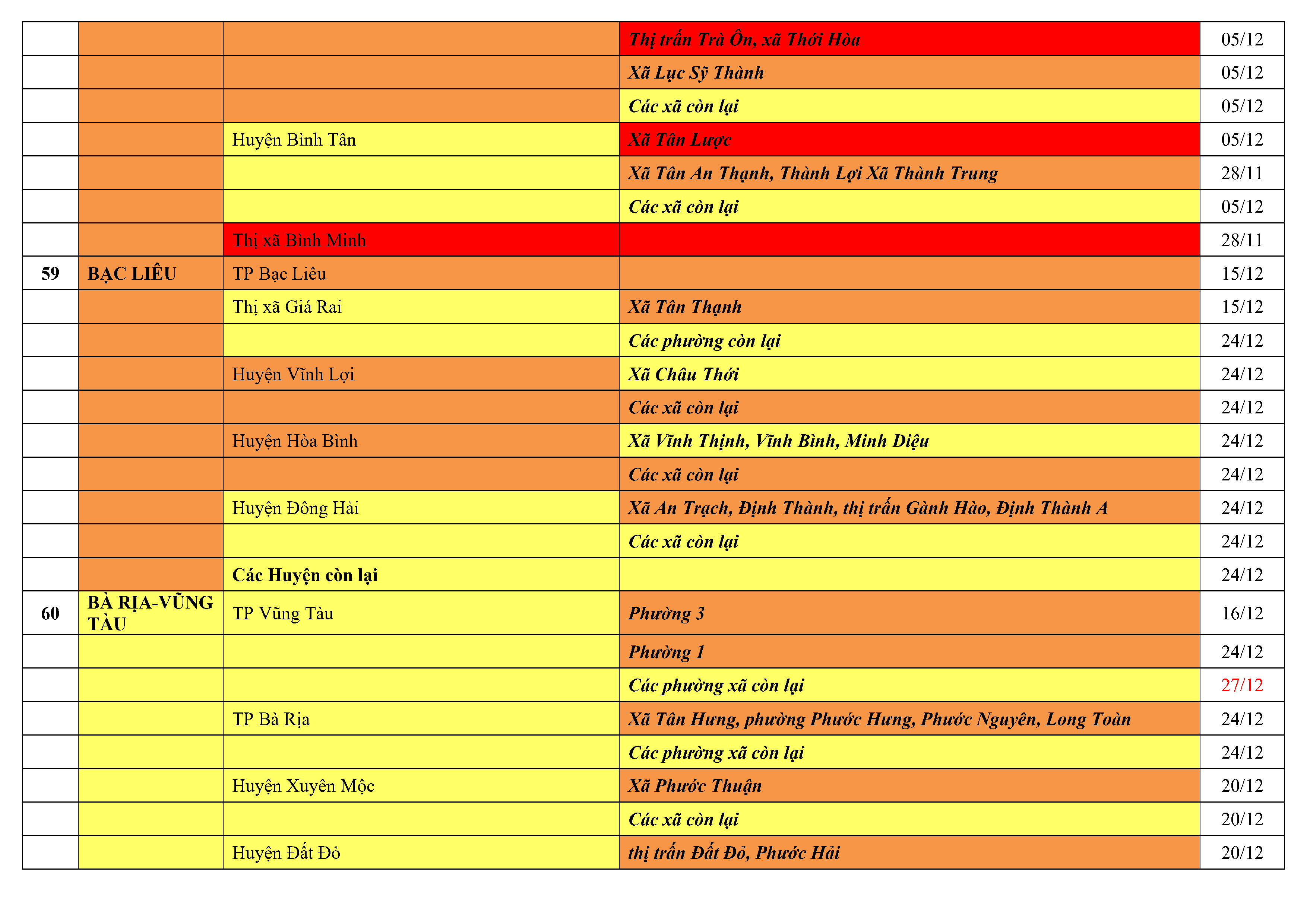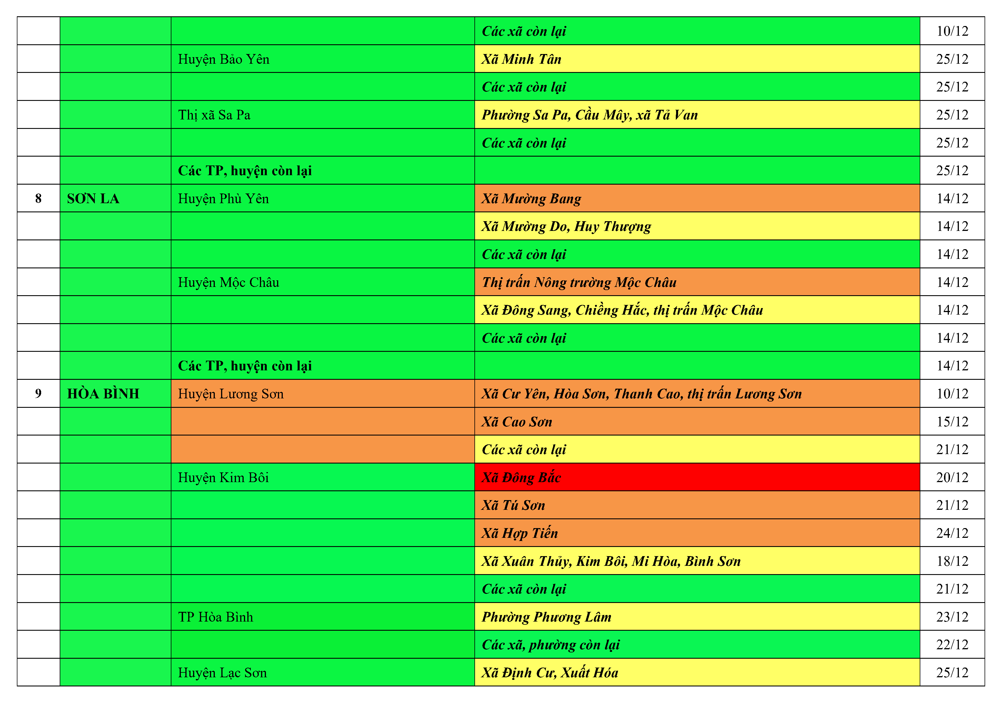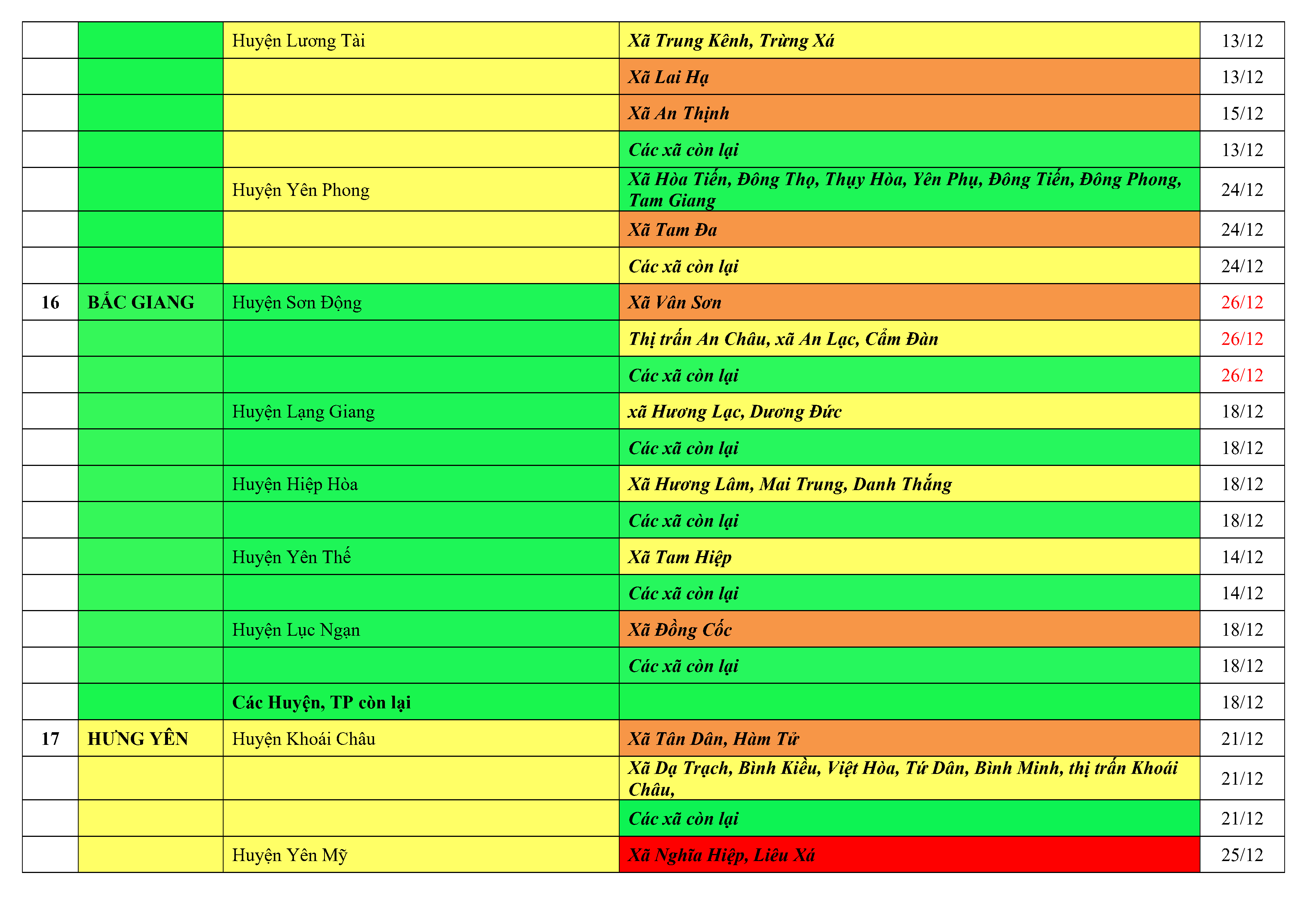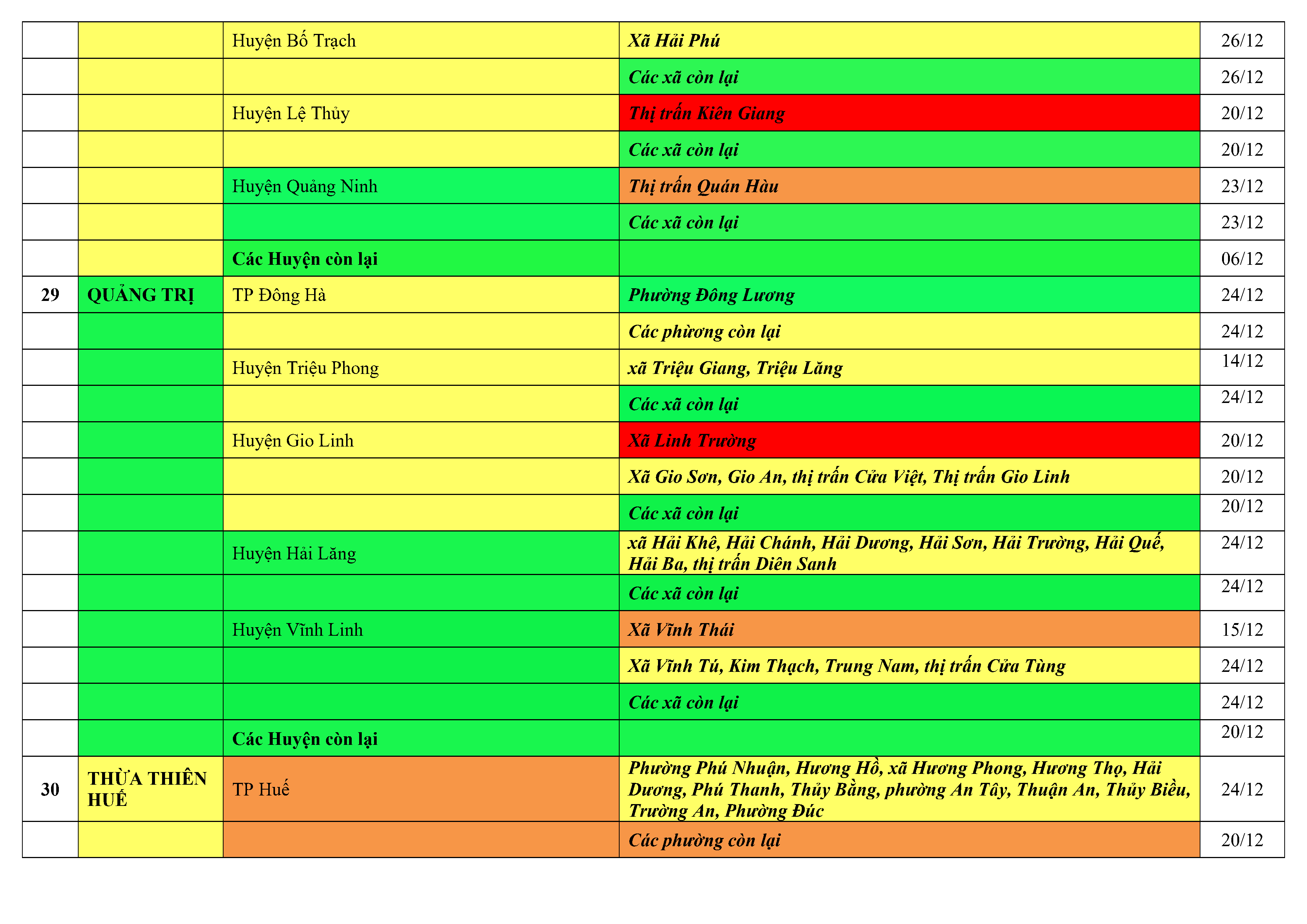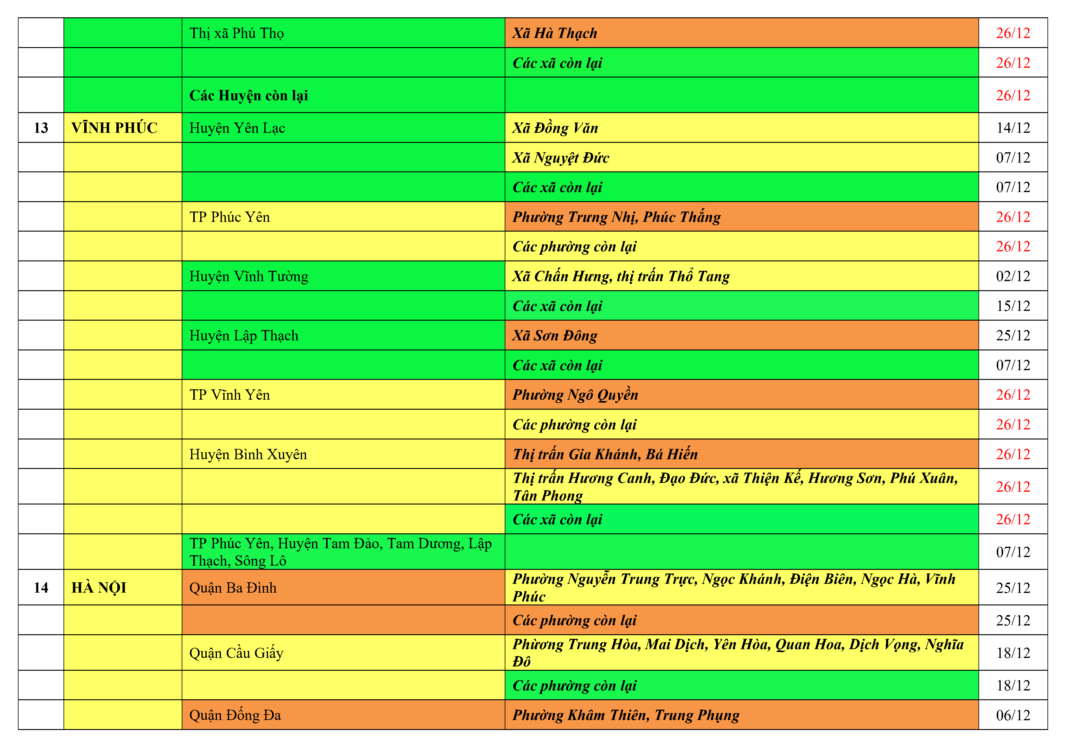 Lưu ý: Các tỉnh, thành phố không có tên trong bảng màu, đi lại bình thường, tuân thủ các biện pháp phòng chống dịch theo chỉ đạo của Bộ Y tế; khai báo y tế, thực hiện nghiêm 5K.
