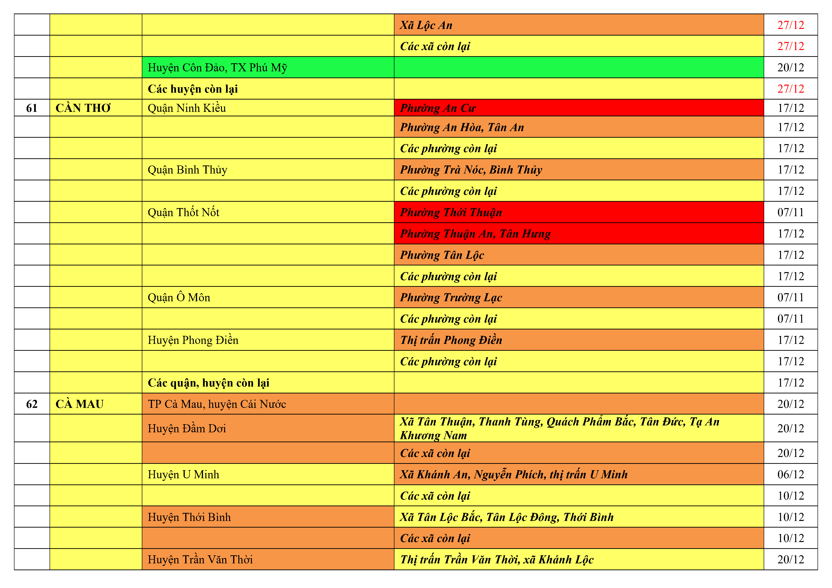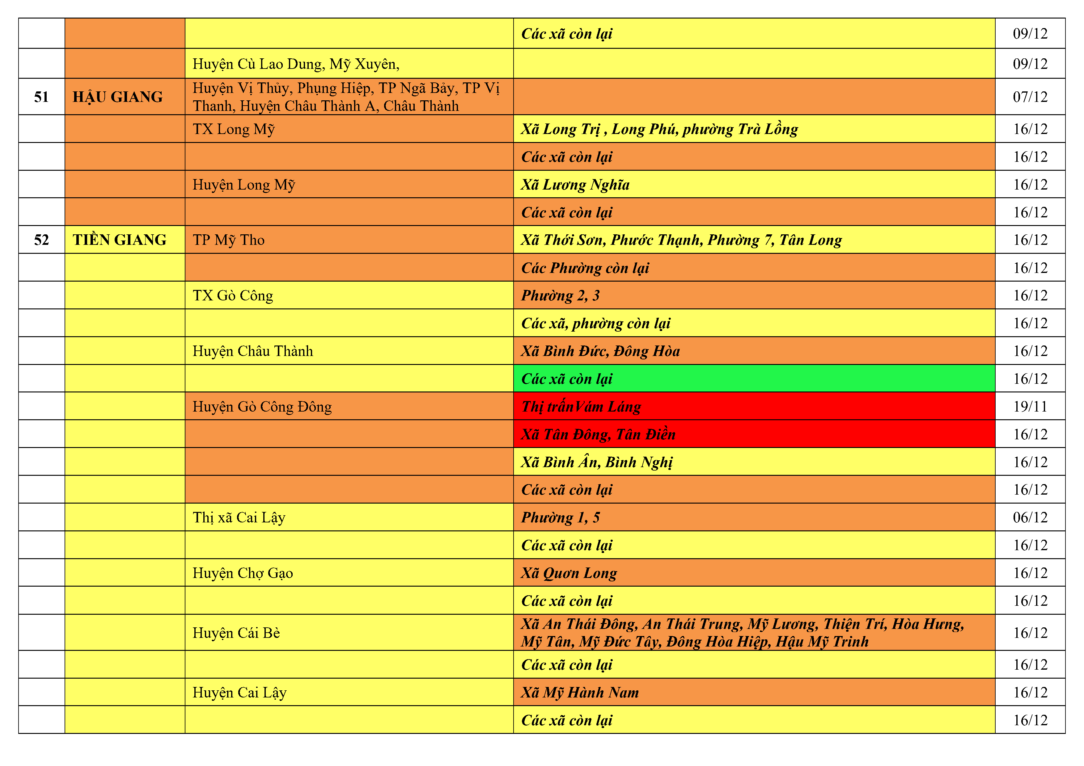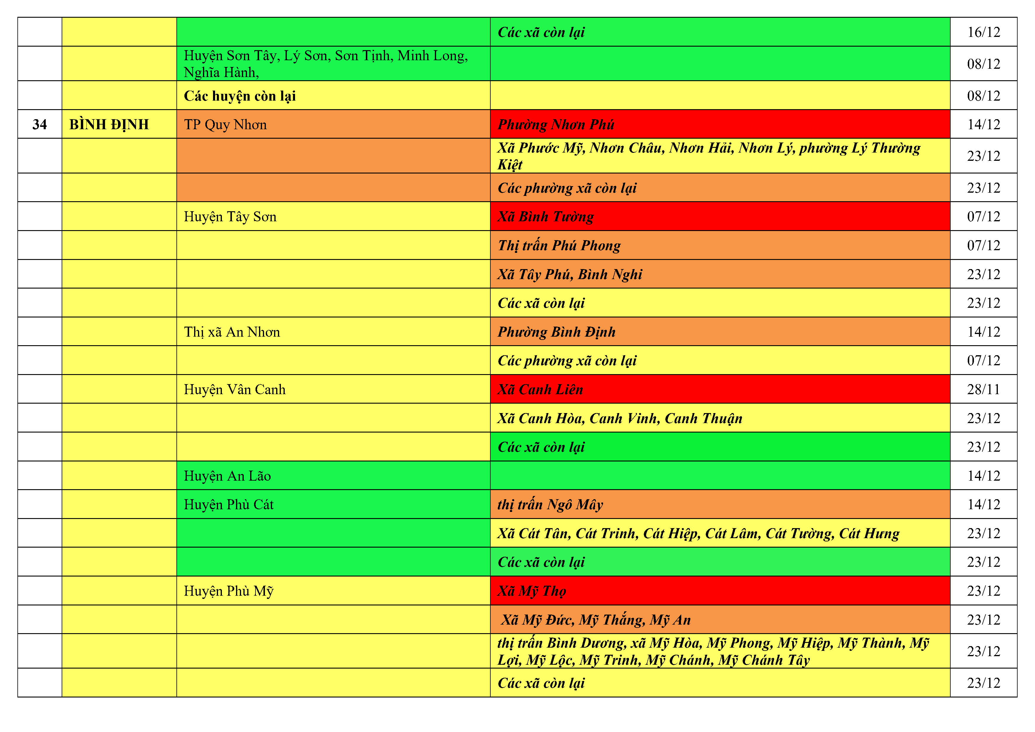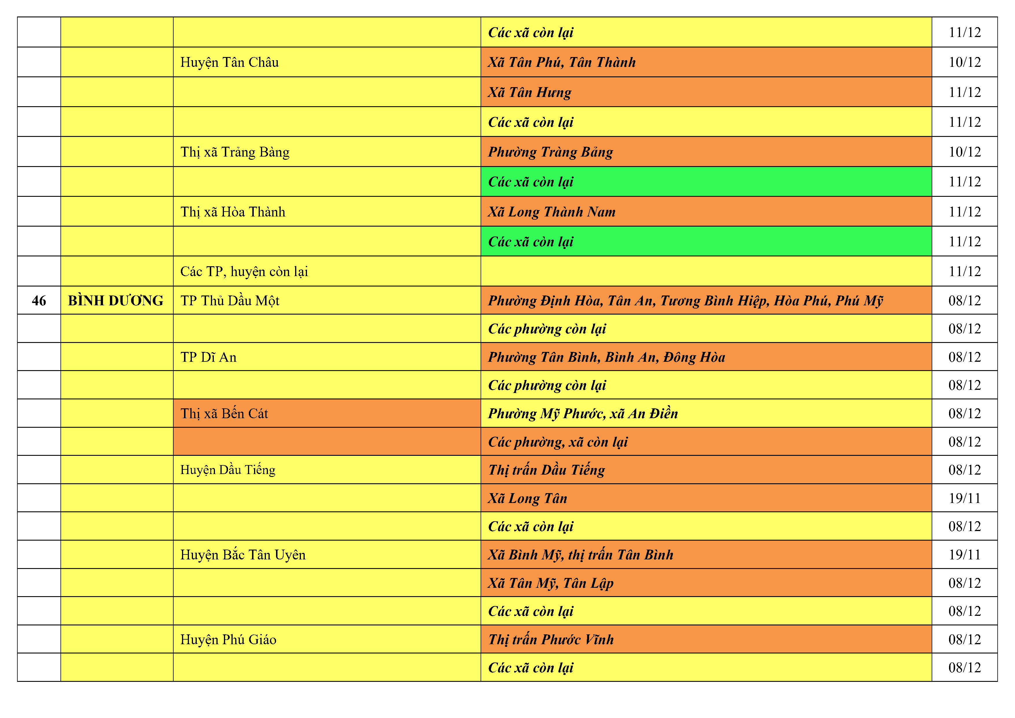 Lưu ý: Các tỉnh, thành phố không có tên trong bảng màu, đi lại bình thường, tuân thủ các biện pháp phòng chống dịch theo chỉ đạo của Bộ Y tế; khai báo y tế, thực hiện nghiêm 5K.