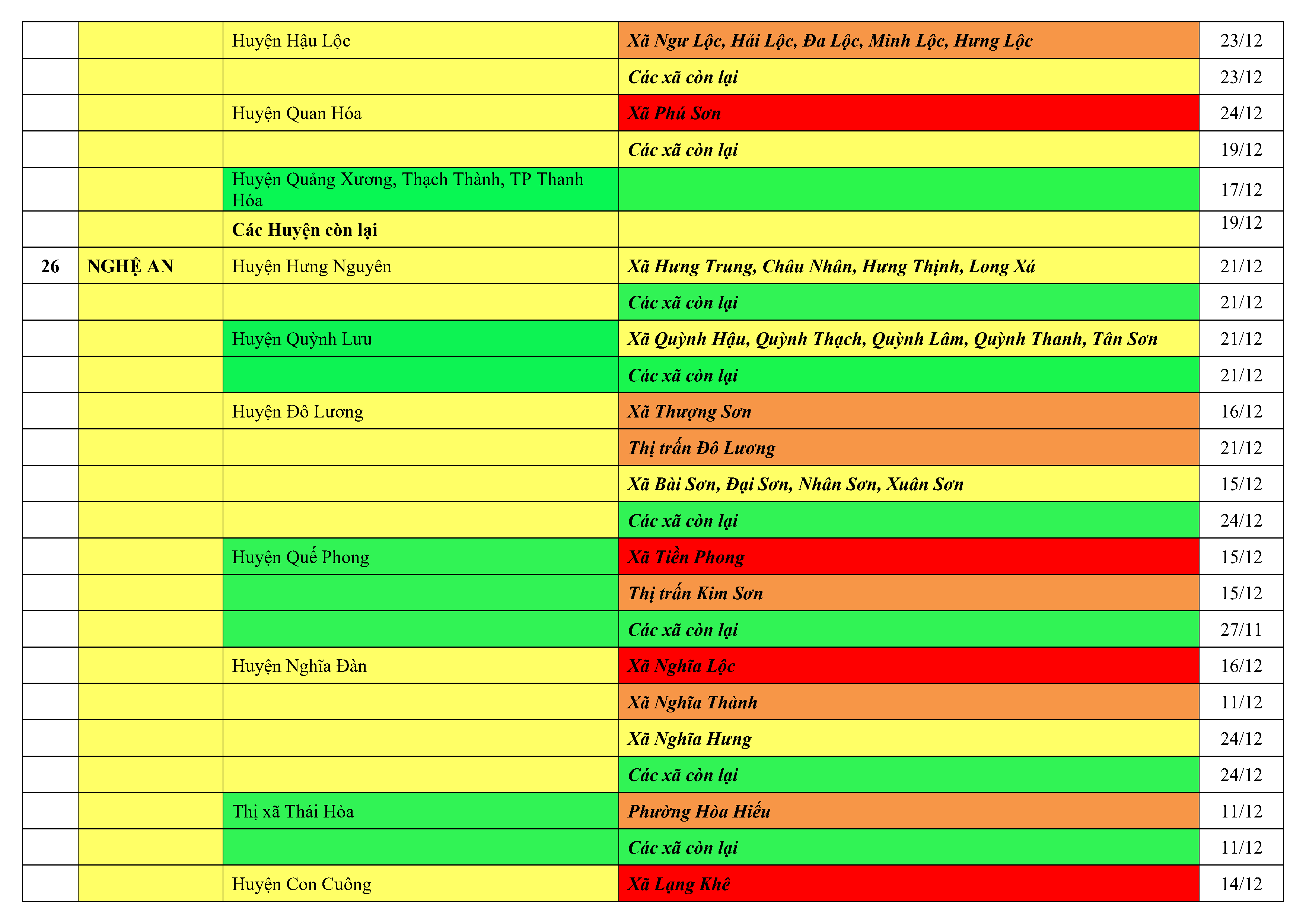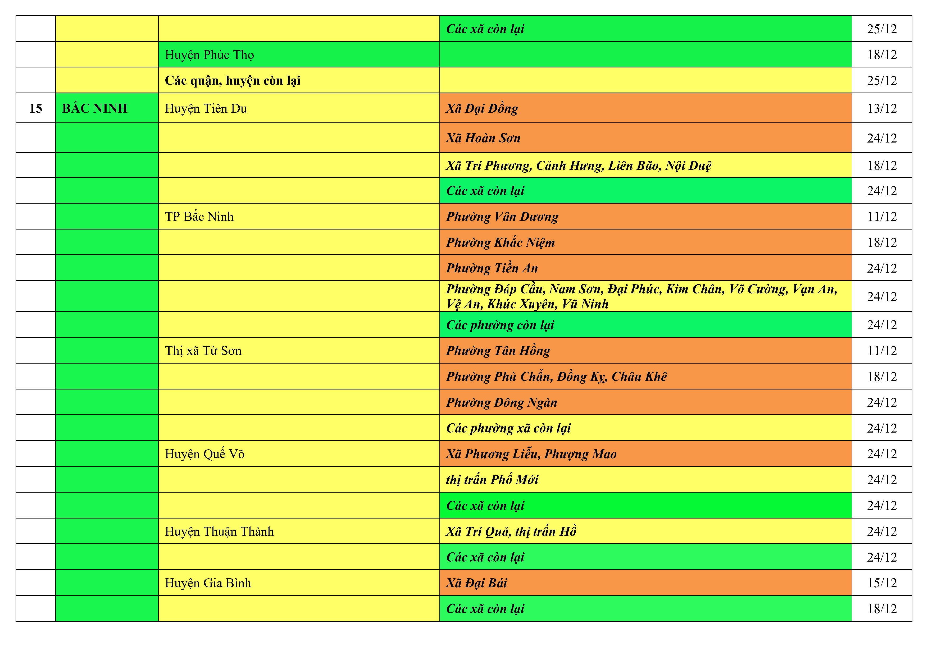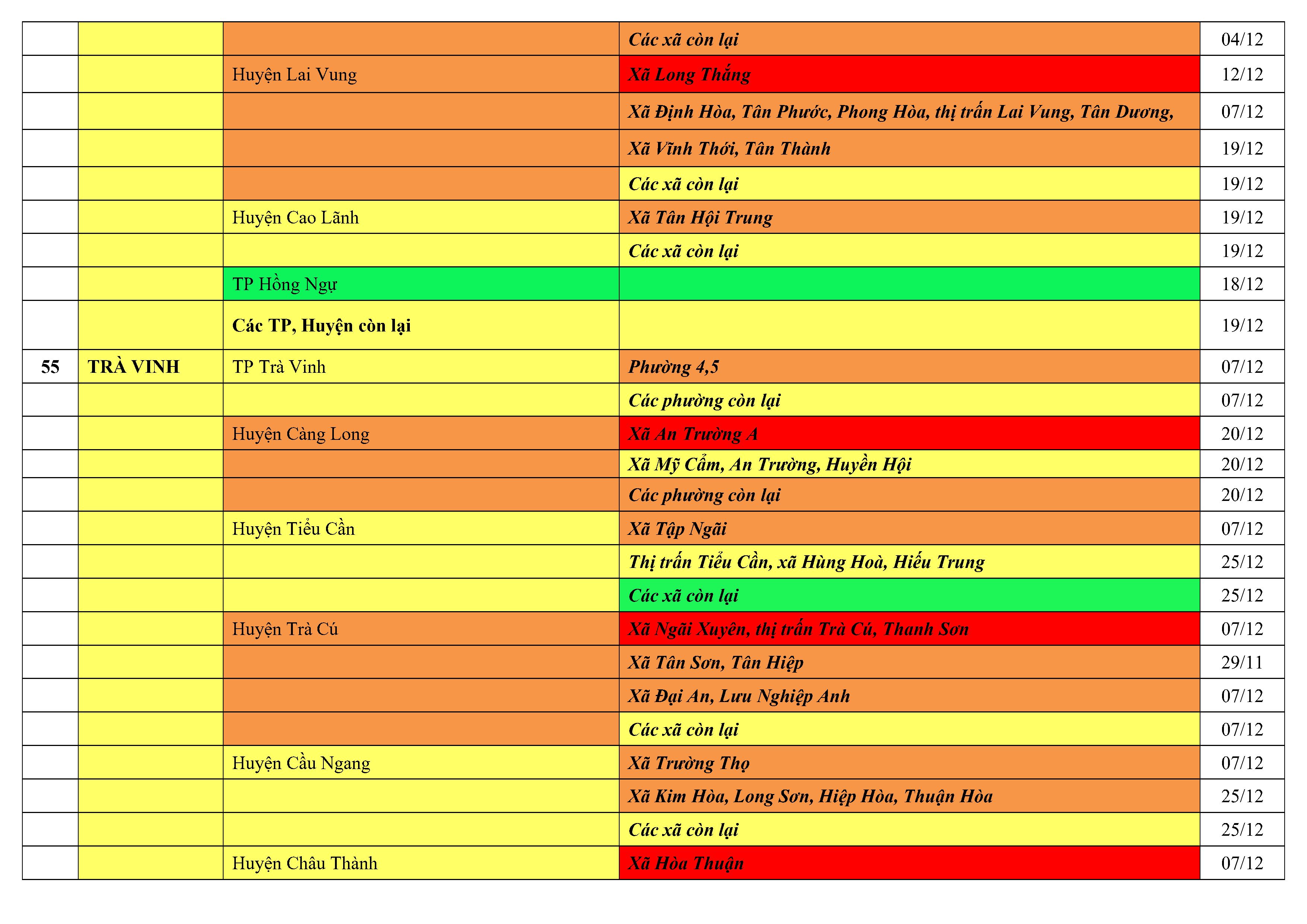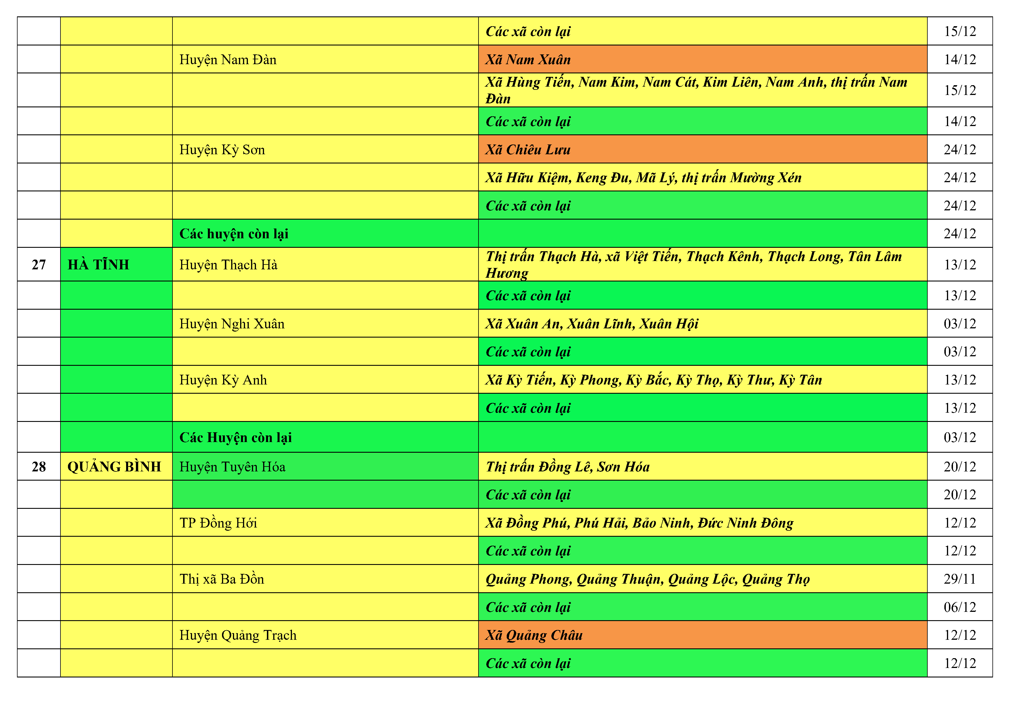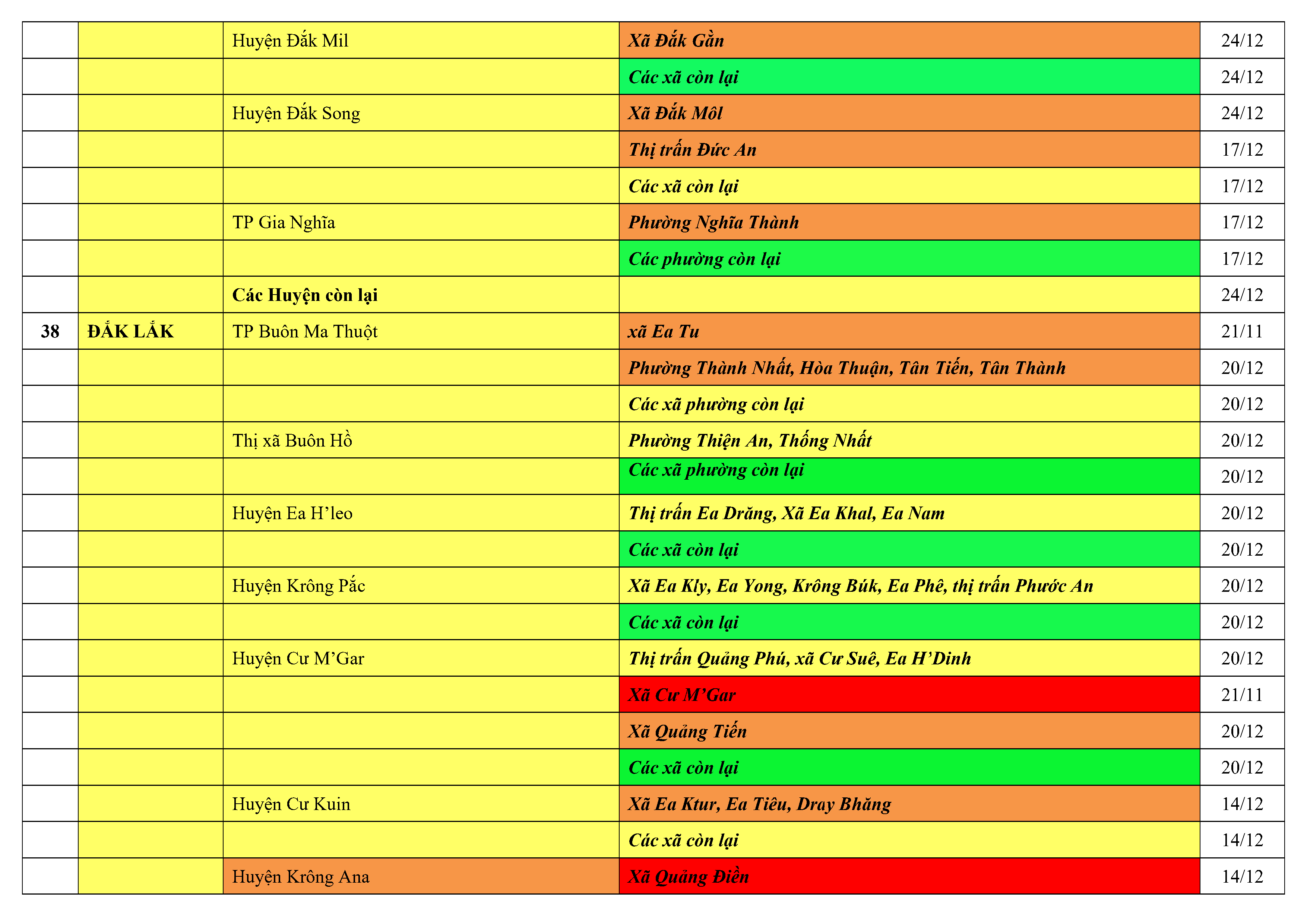 Lưu ý: Các tỉnh, thành phố không có tên trong bảng màu, đi lại bình thường, tuân thủ các biện pháp phòng chống dịch theo chỉ đạo của Bộ Y tế; khai báo y tế, thực hiện nghiêm 5K.