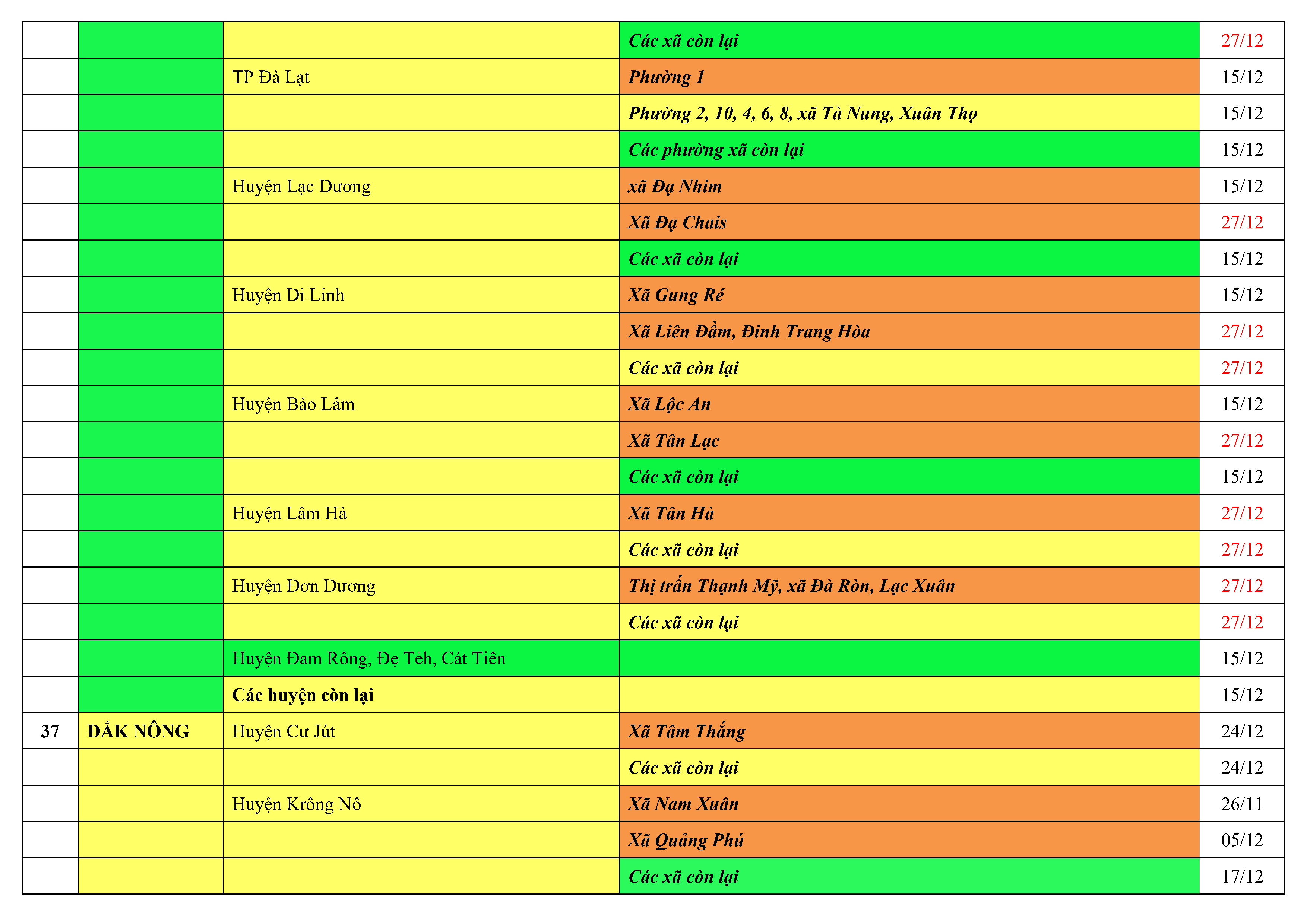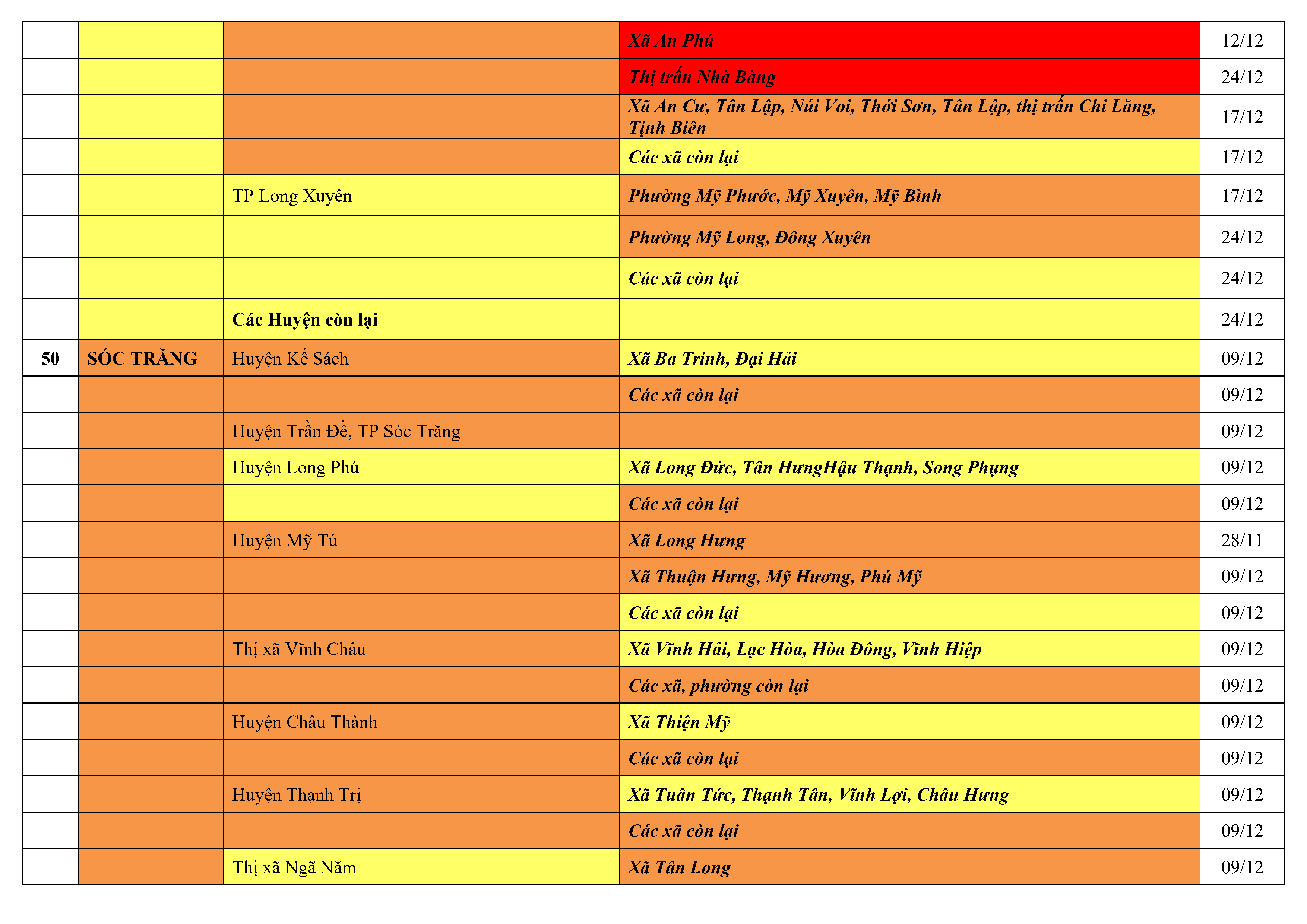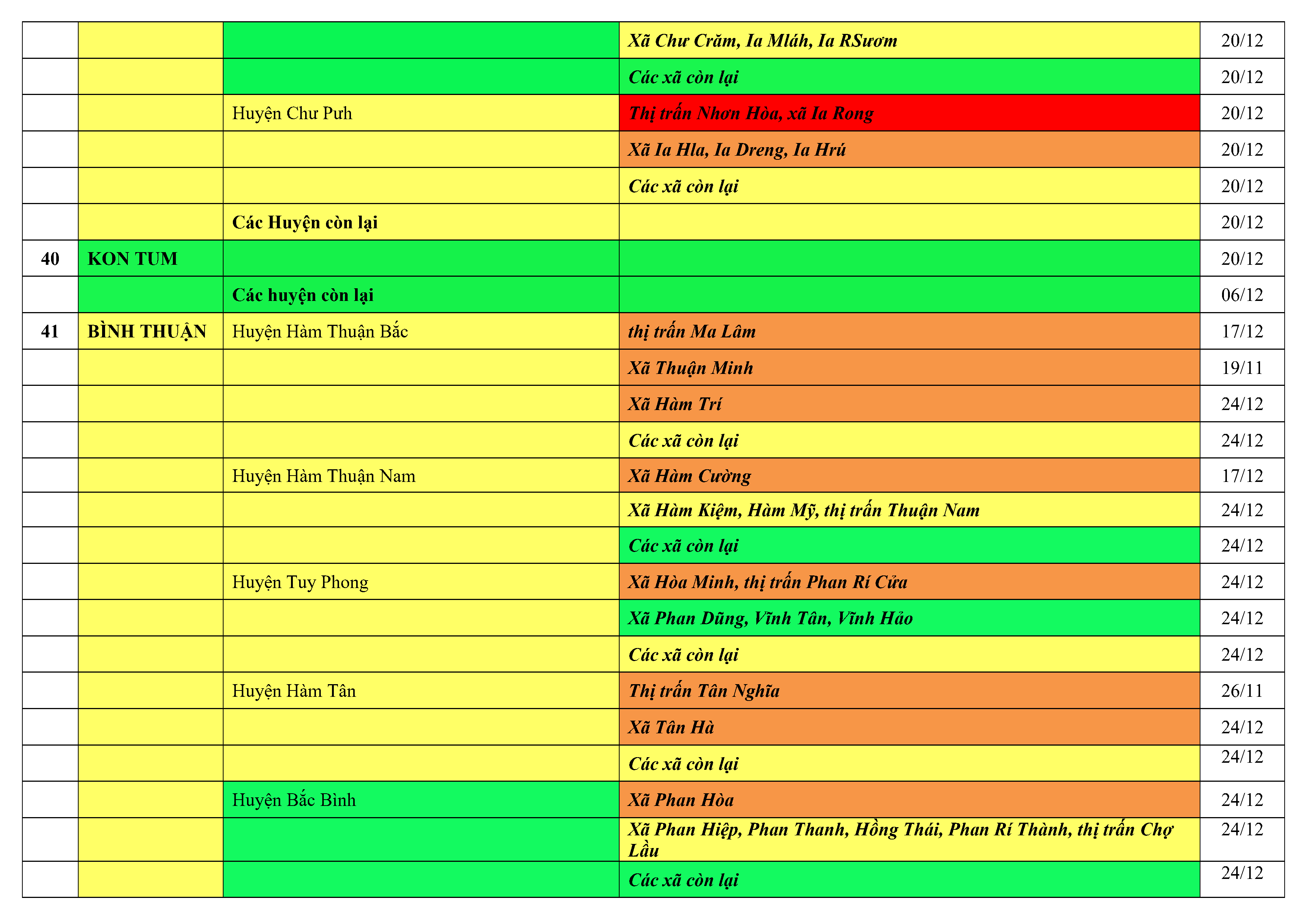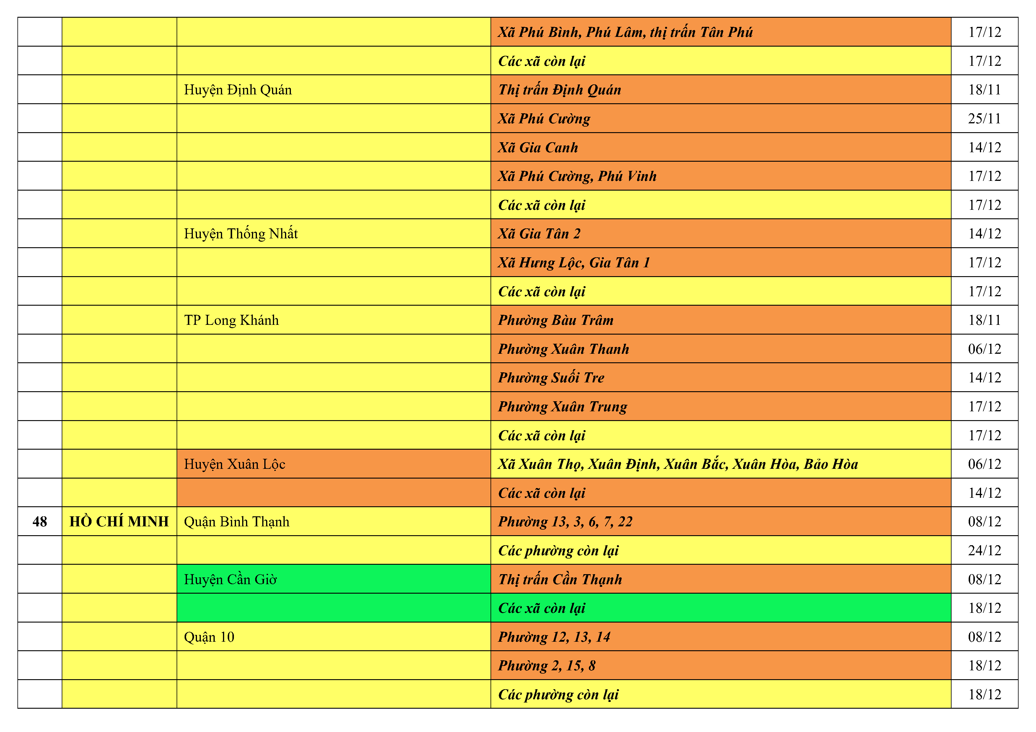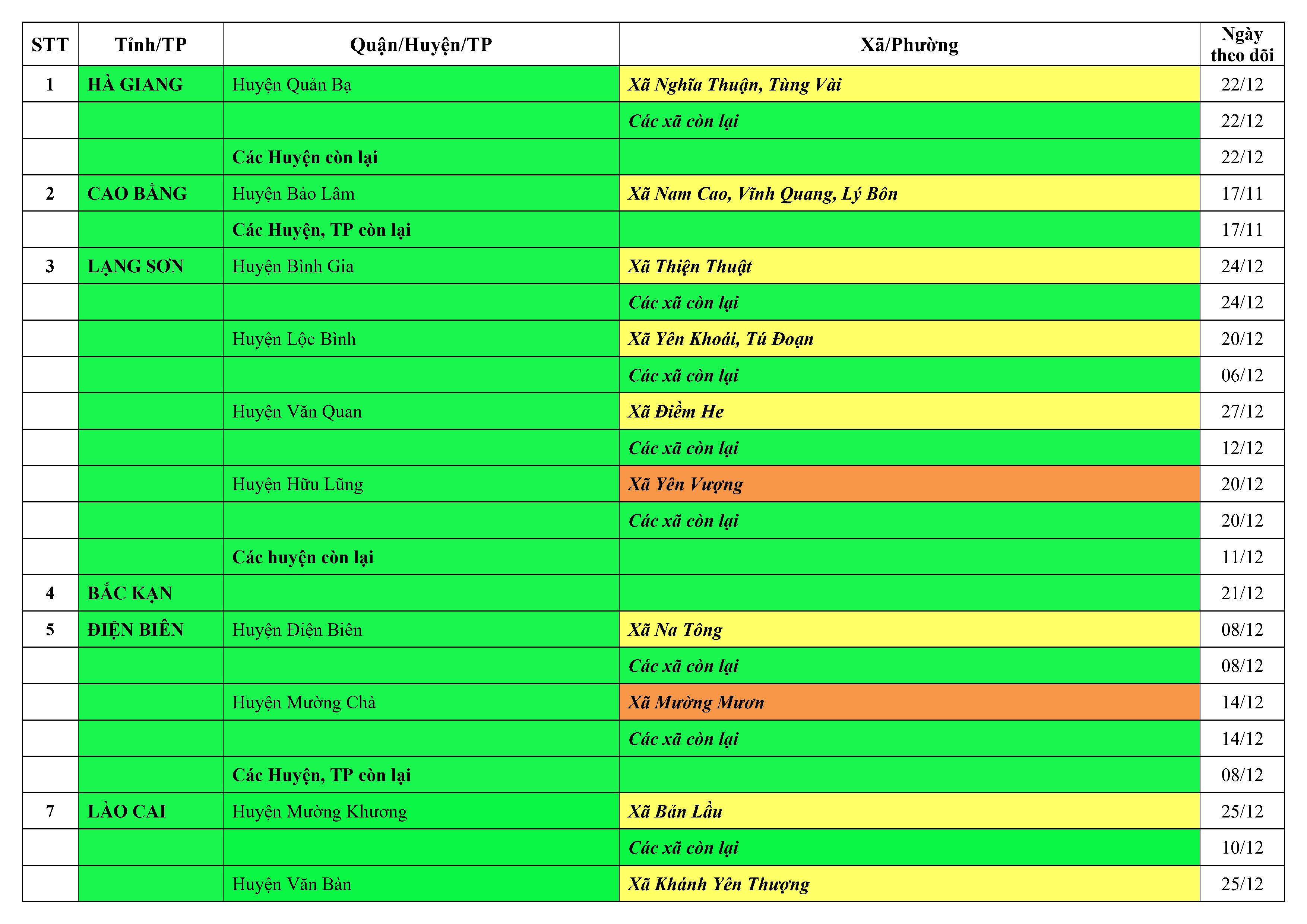 Lưu ý: Các tỉnh, thành phố không có tên trong bảng màu, đi lại bình thường, tuân thủ các biện pháp phòng chống dịch theo chỉ đạo của Bộ Y tế; khai báo y tế, thực hiện nghiêm 5K.
