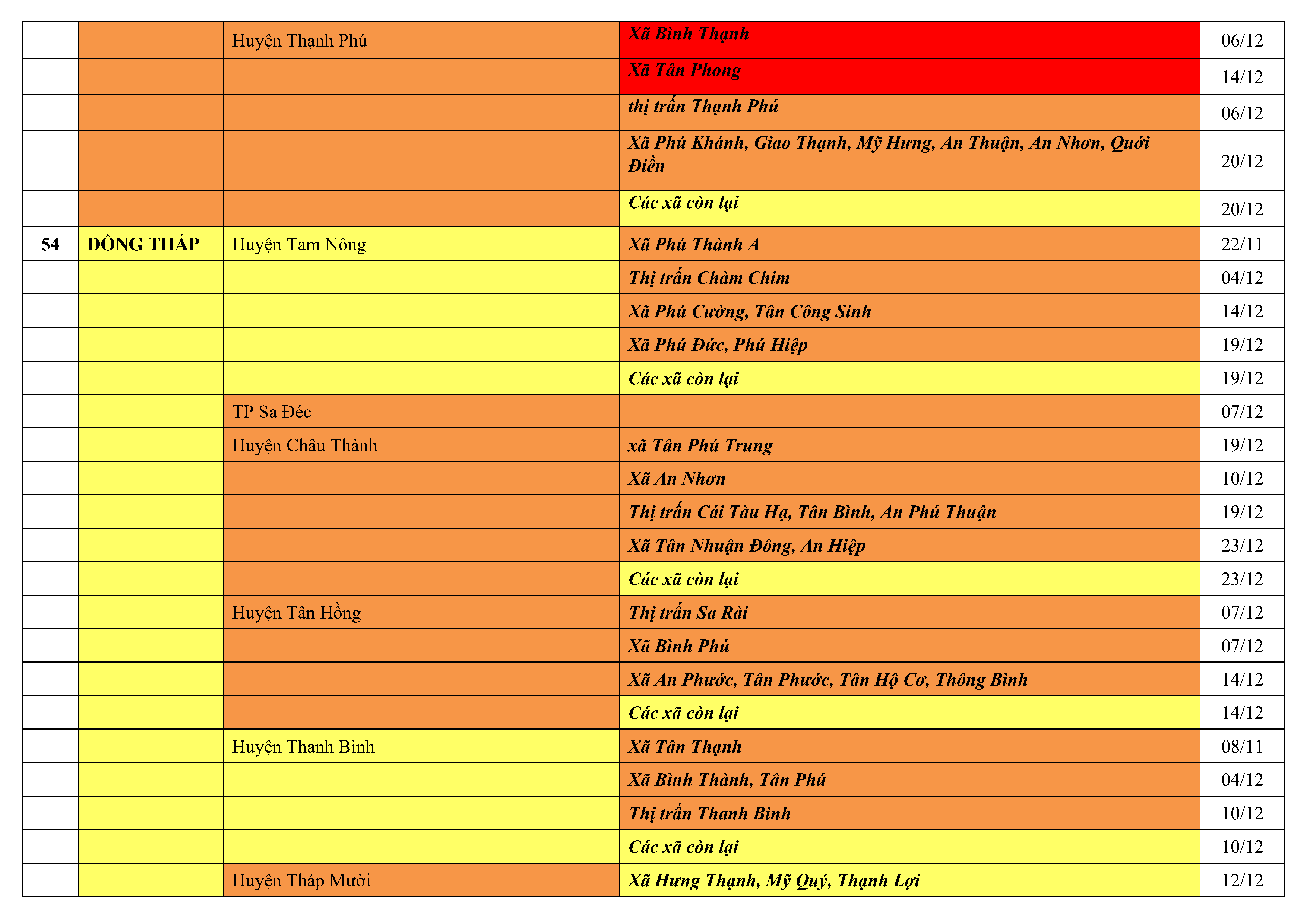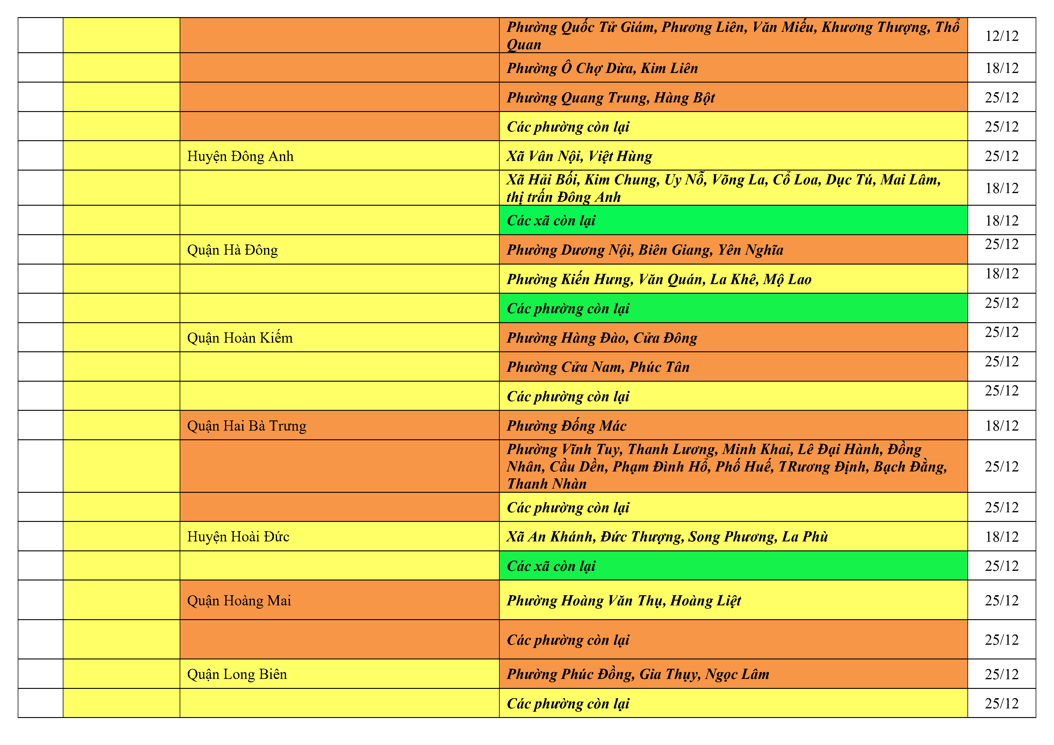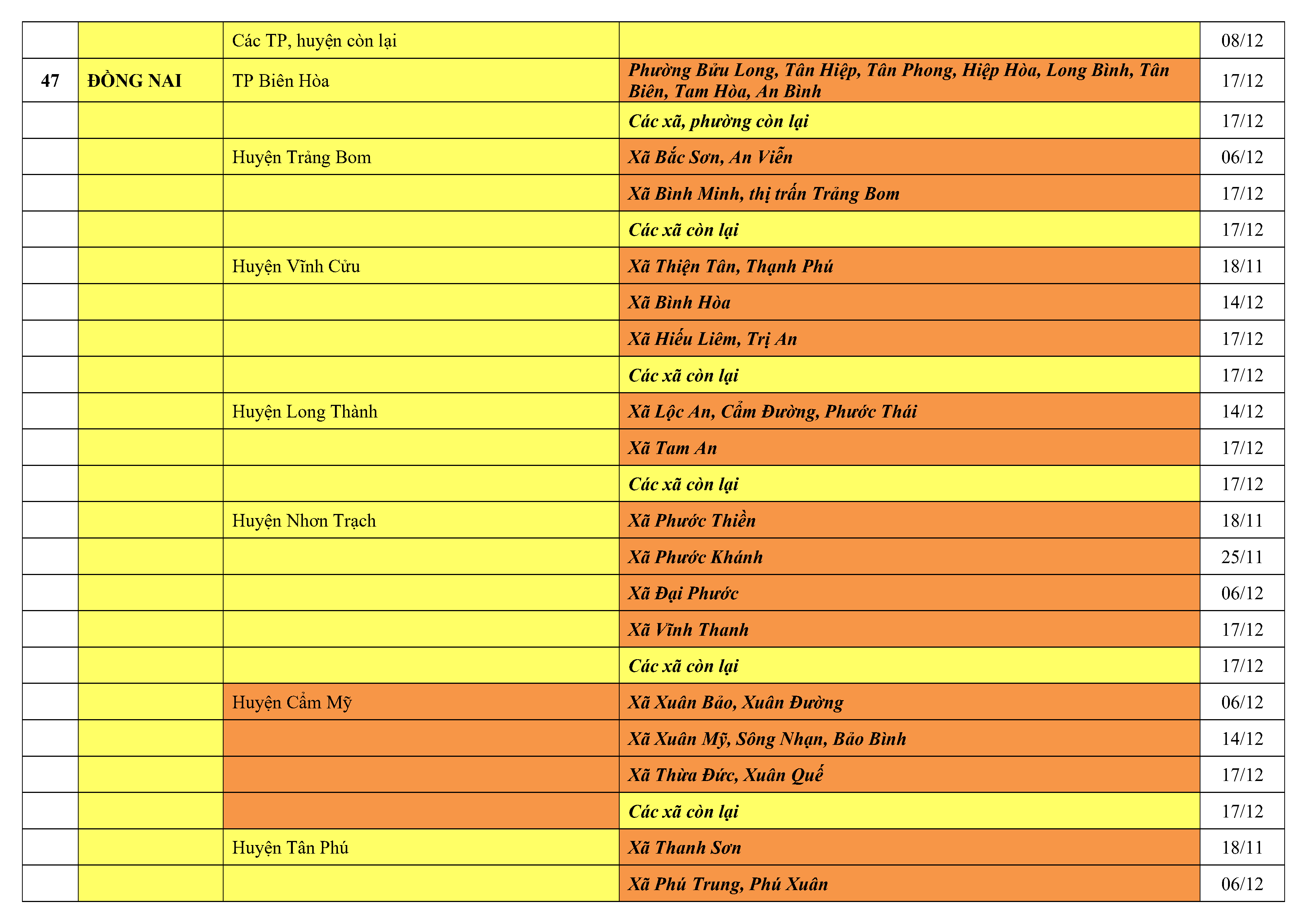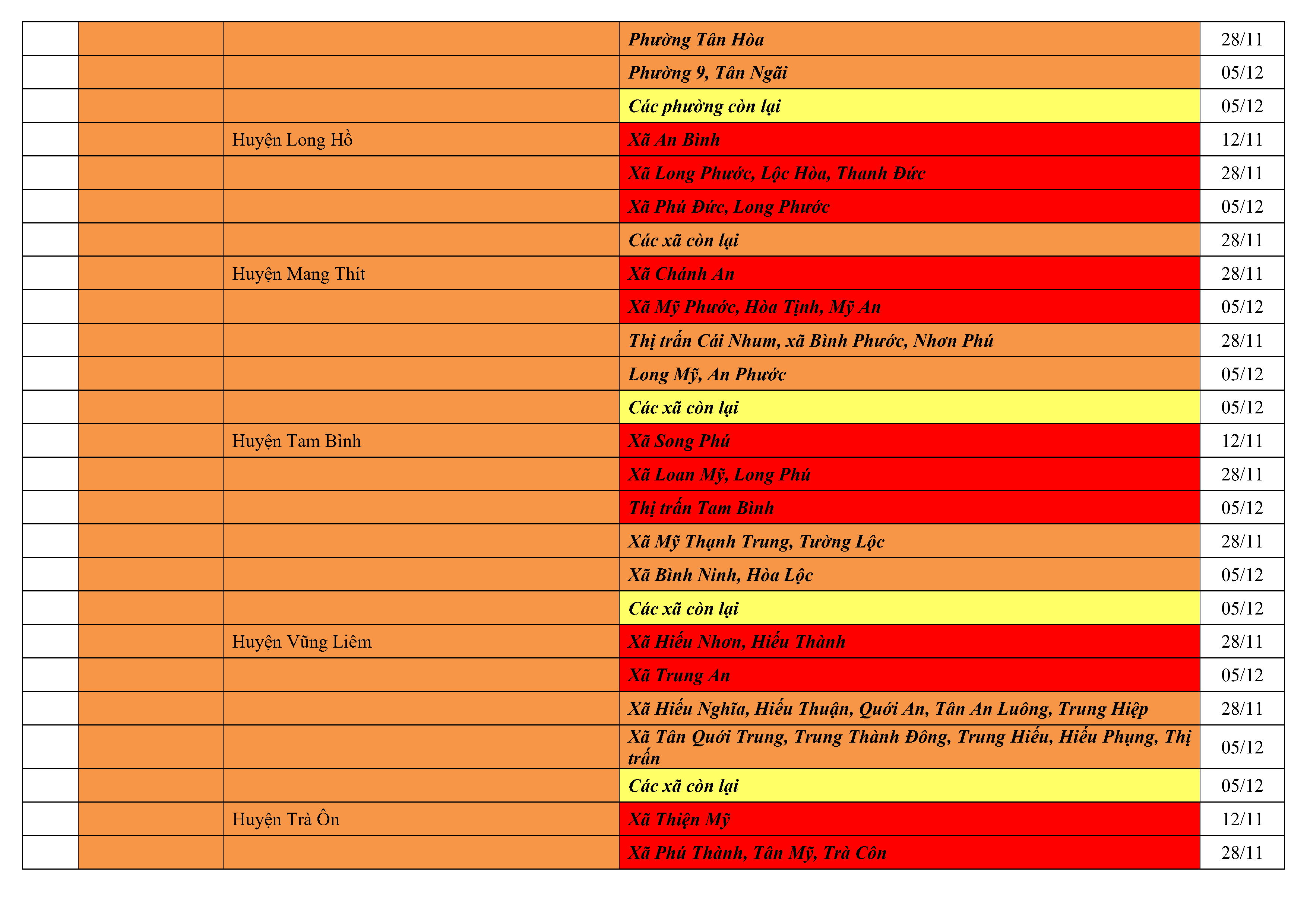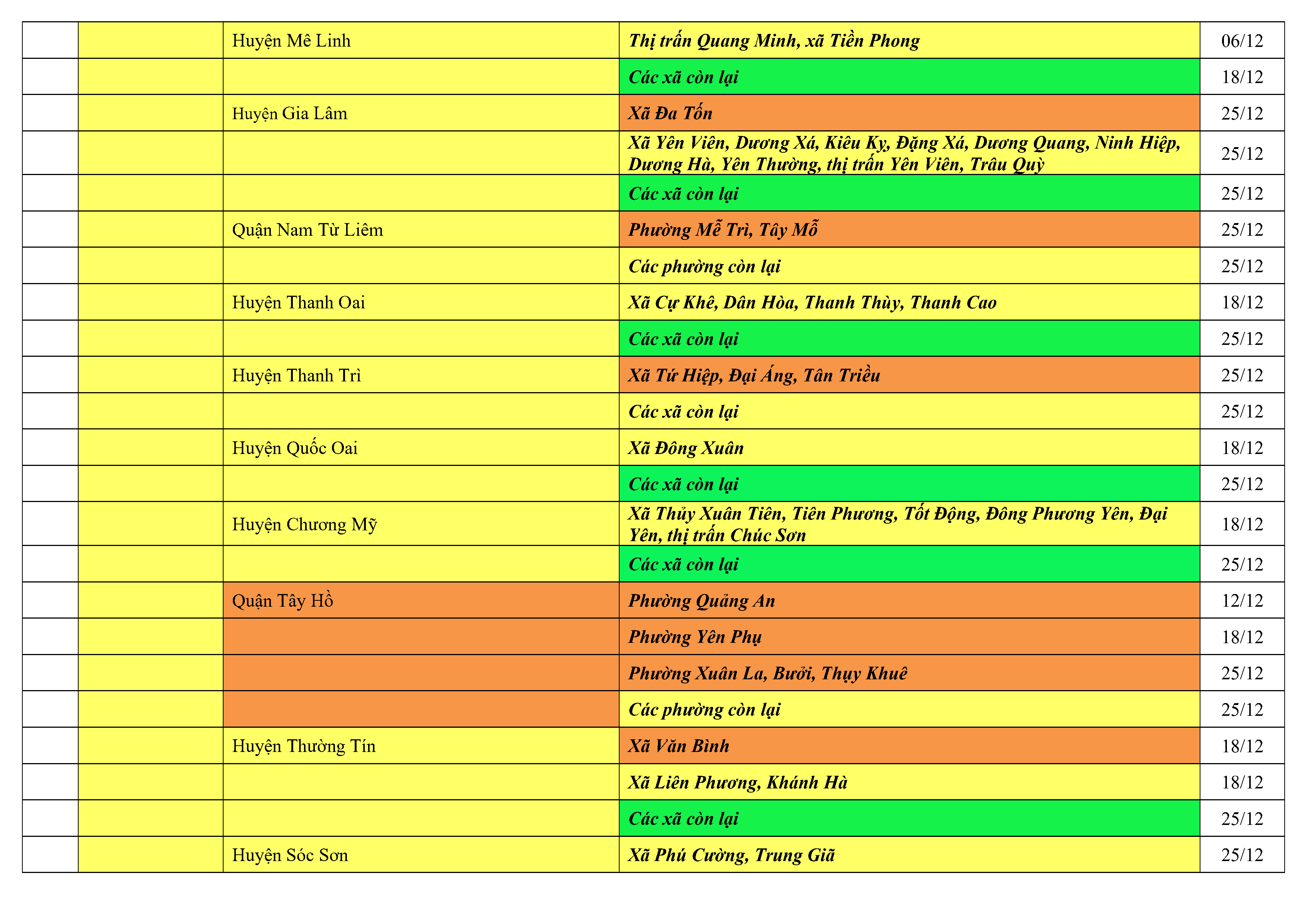 Lưu ý: Các tỉnh, thành phố không có tên trong bảng màu, đi lại bình thường, tuân thủ các biện pháp phòng chống dịch theo chỉ đạo của Bộ Y tế; khai báo y tế, thực hiện nghiêm 5K.