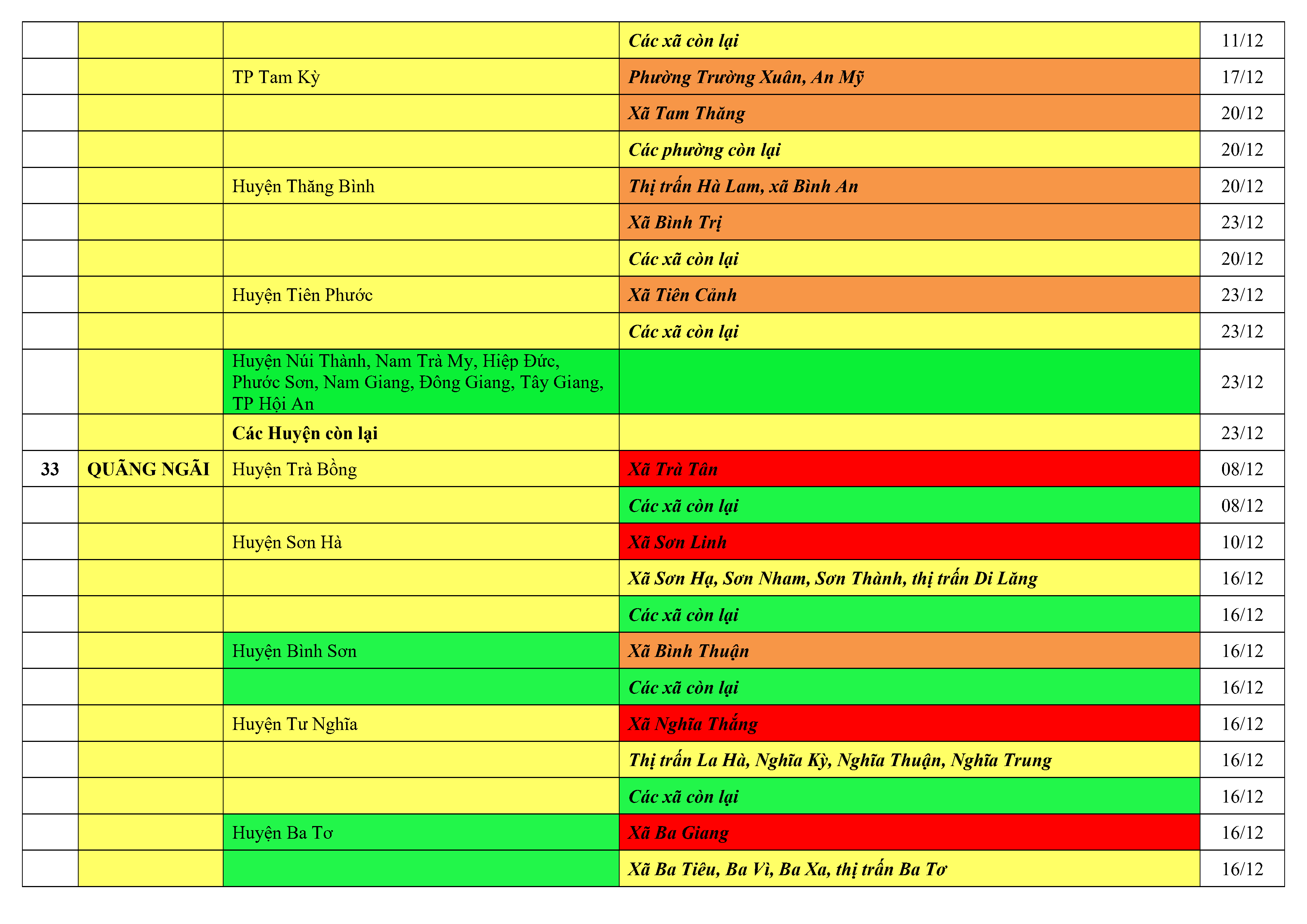 Áp dụng biện pháp tương ứng màu sắc ô cột theo thôn xóm; xã phường; quận huyện; tỉnh thành phố. Cách ly y tế dựa vào việc tiếp xúc, đi đến địa điểm và nơi cư trú có ca bệnh, theo Thông báo của Bộ Y tế, các tỉnh thành phố.