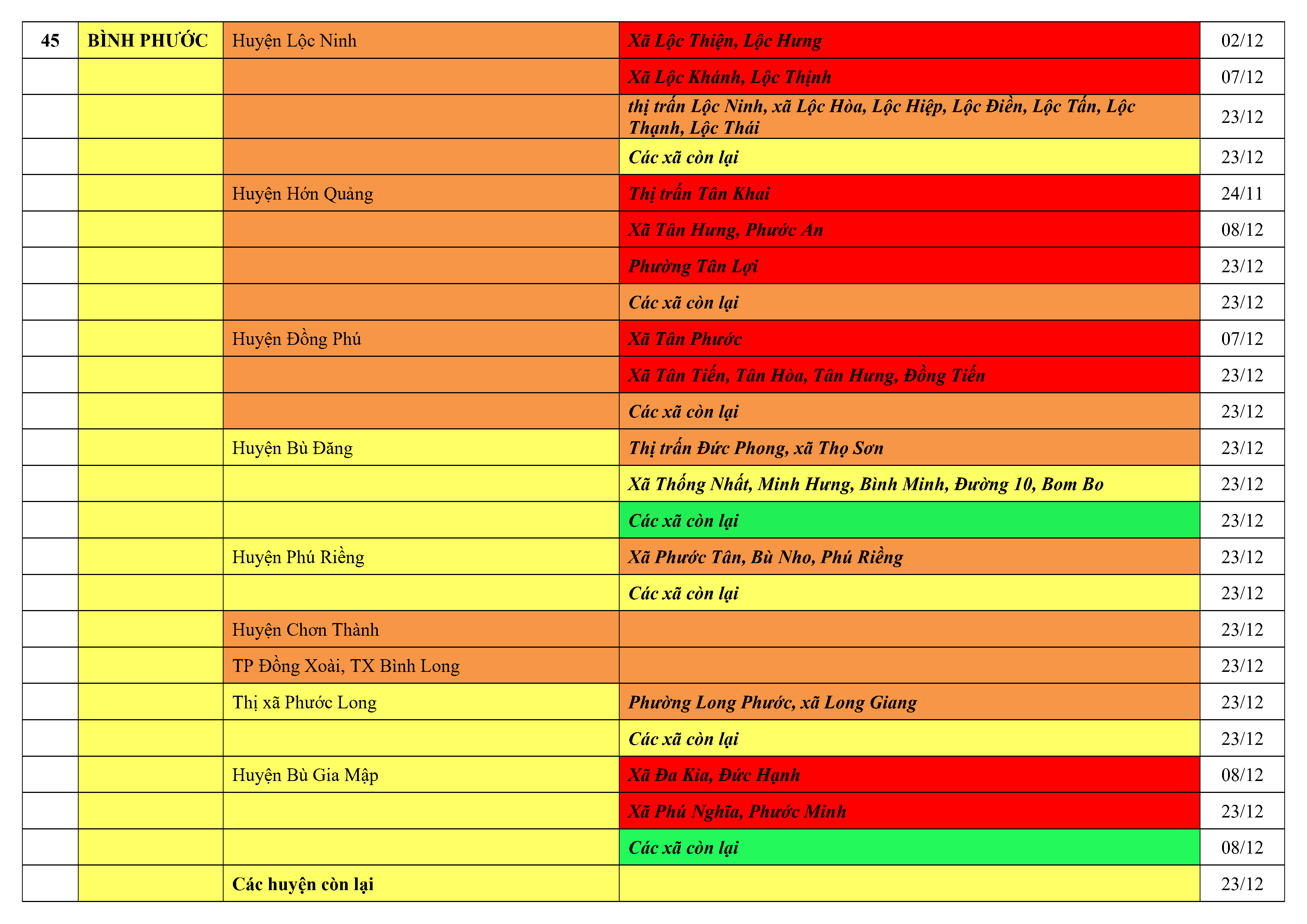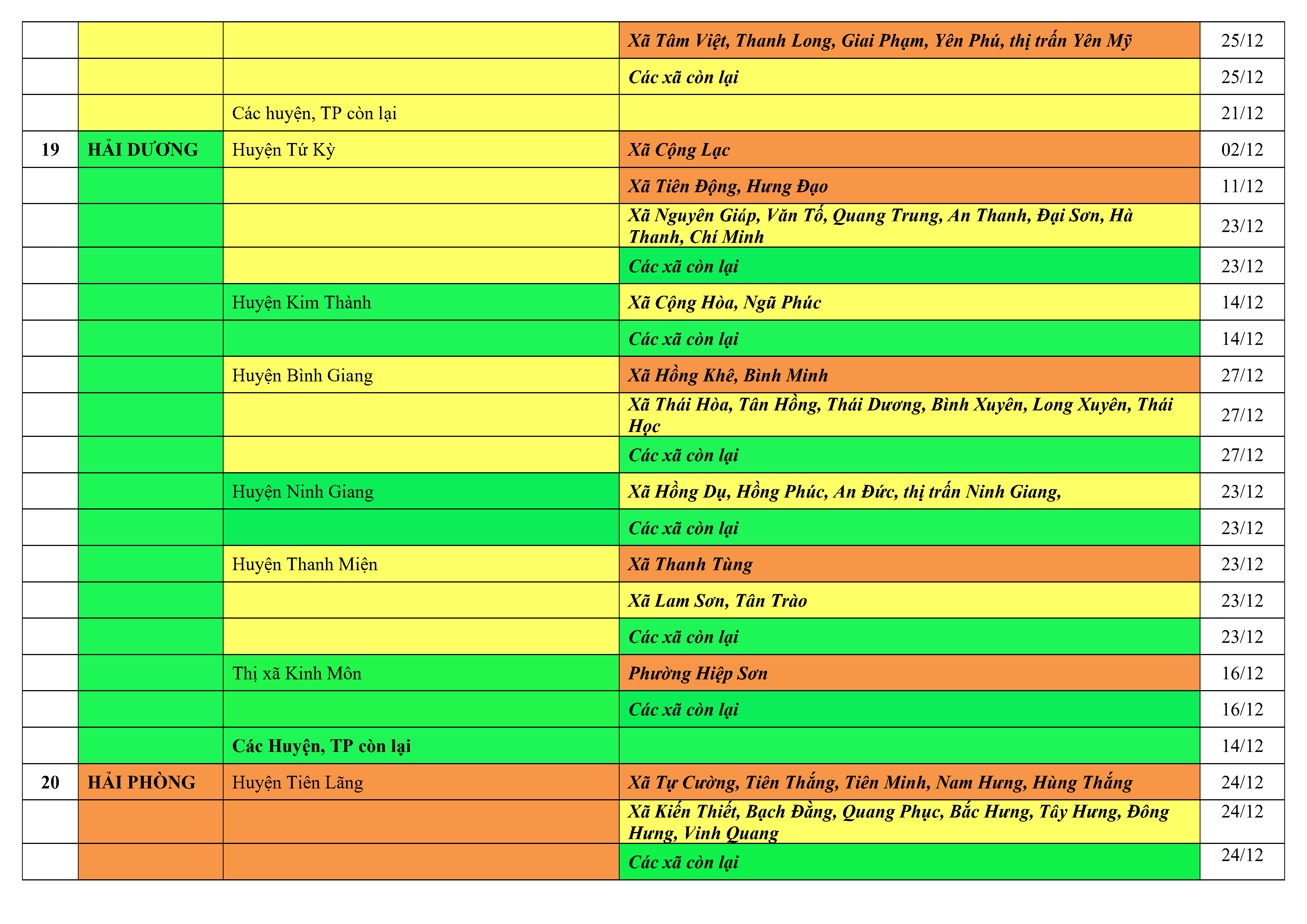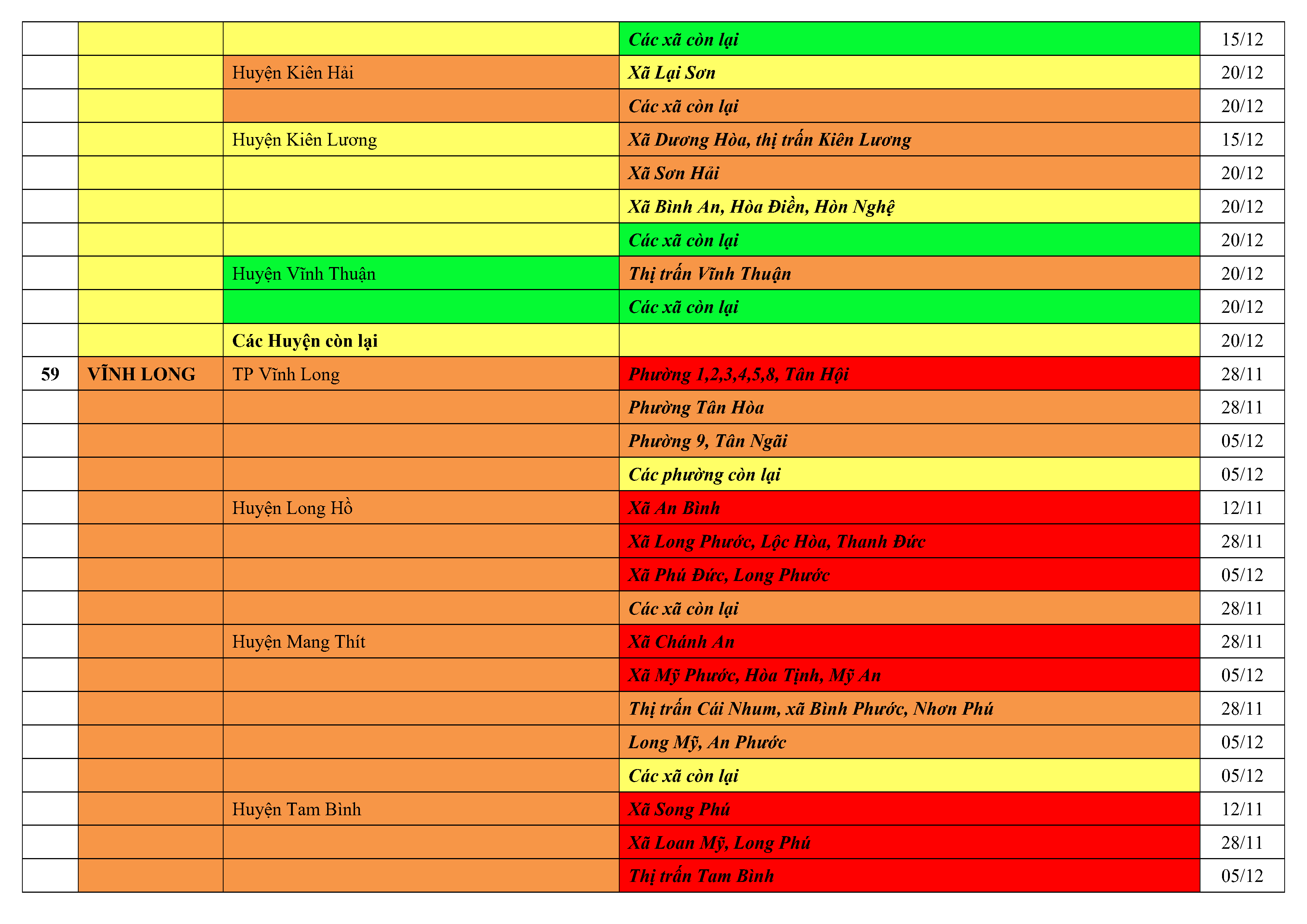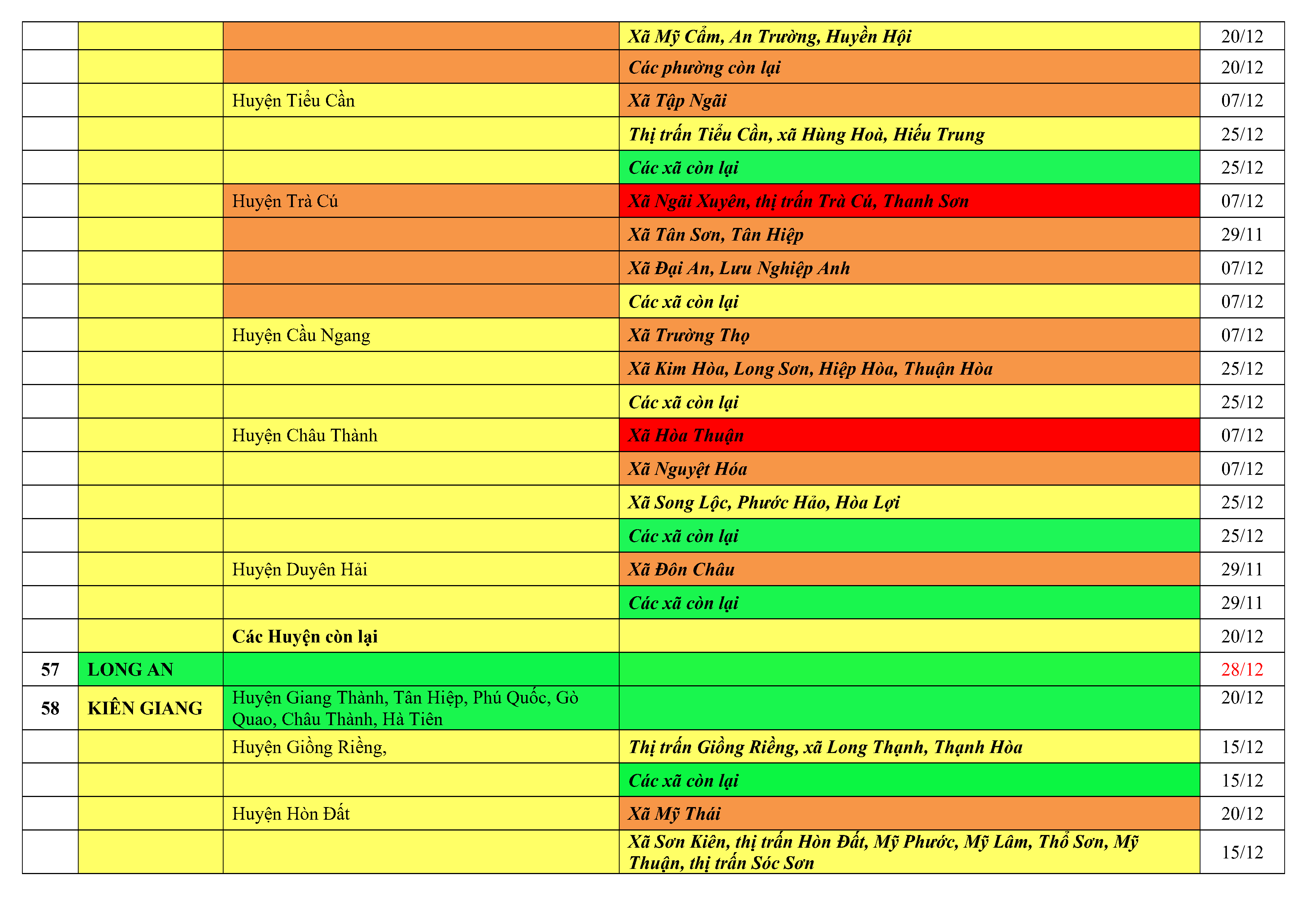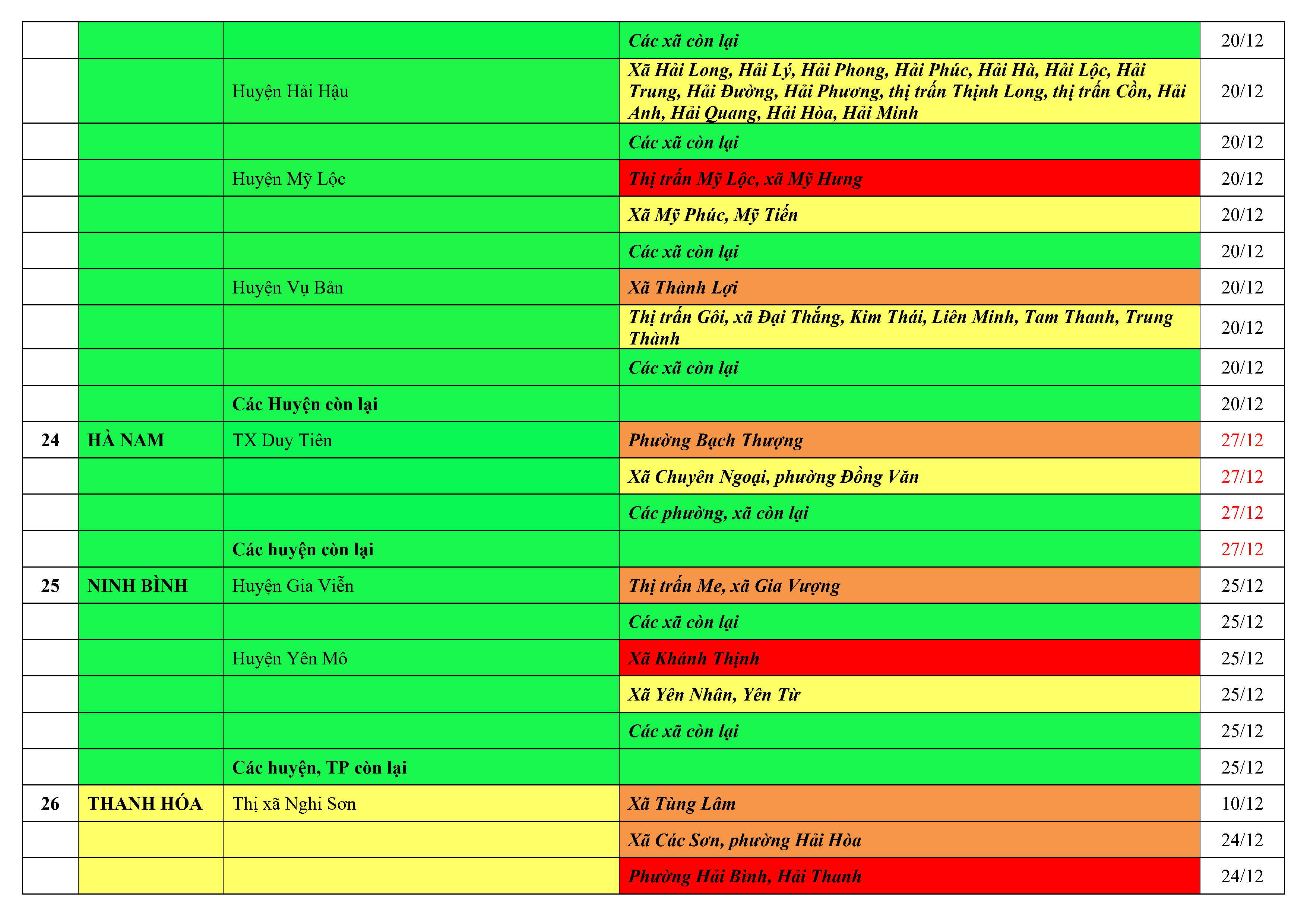 Lưu ý: Các tỉnh, thành phố không có tên trong bảng màu, đi lại bình thường, tuân thủ các biện pháp phòng chống dịch theo chỉ đạo của Bộ Y tế; khai báo y tế, thực hiện nghiêm 5K.