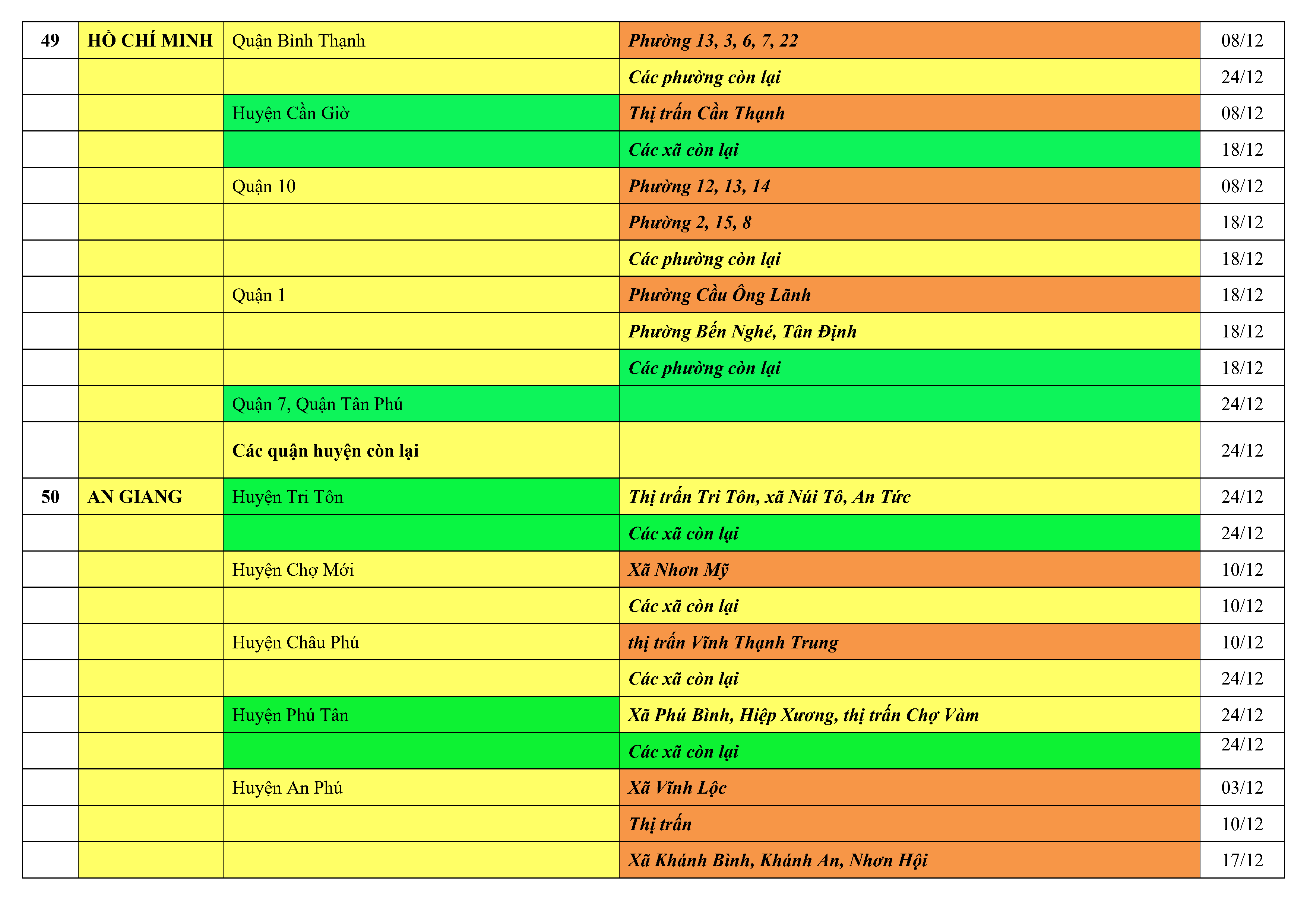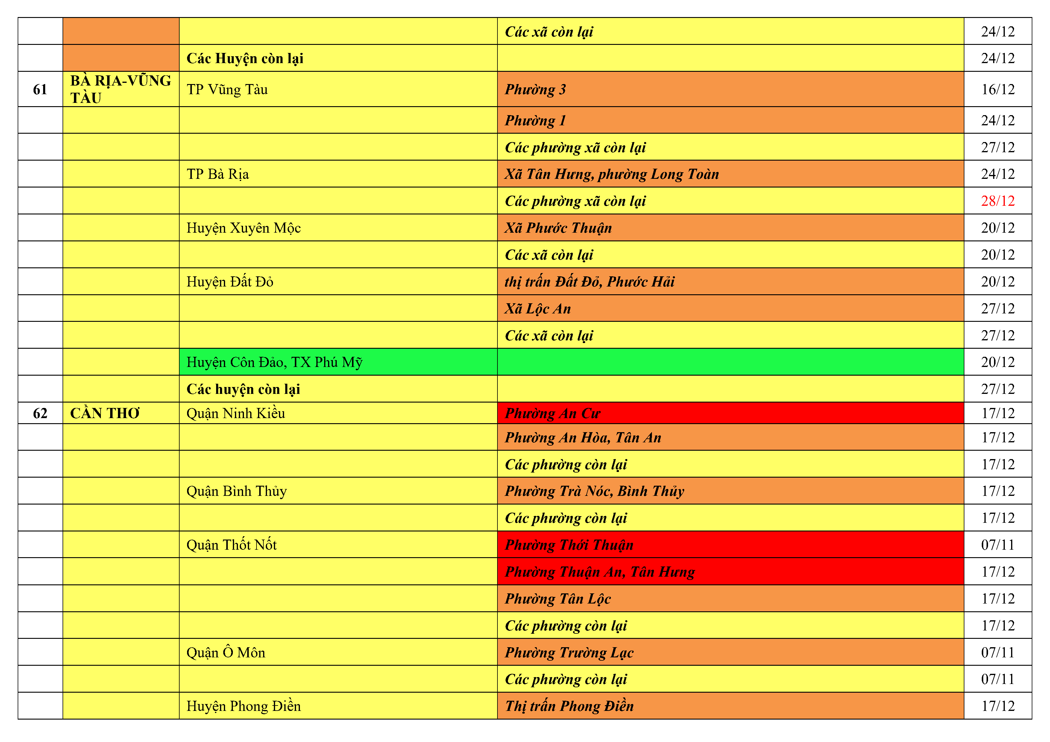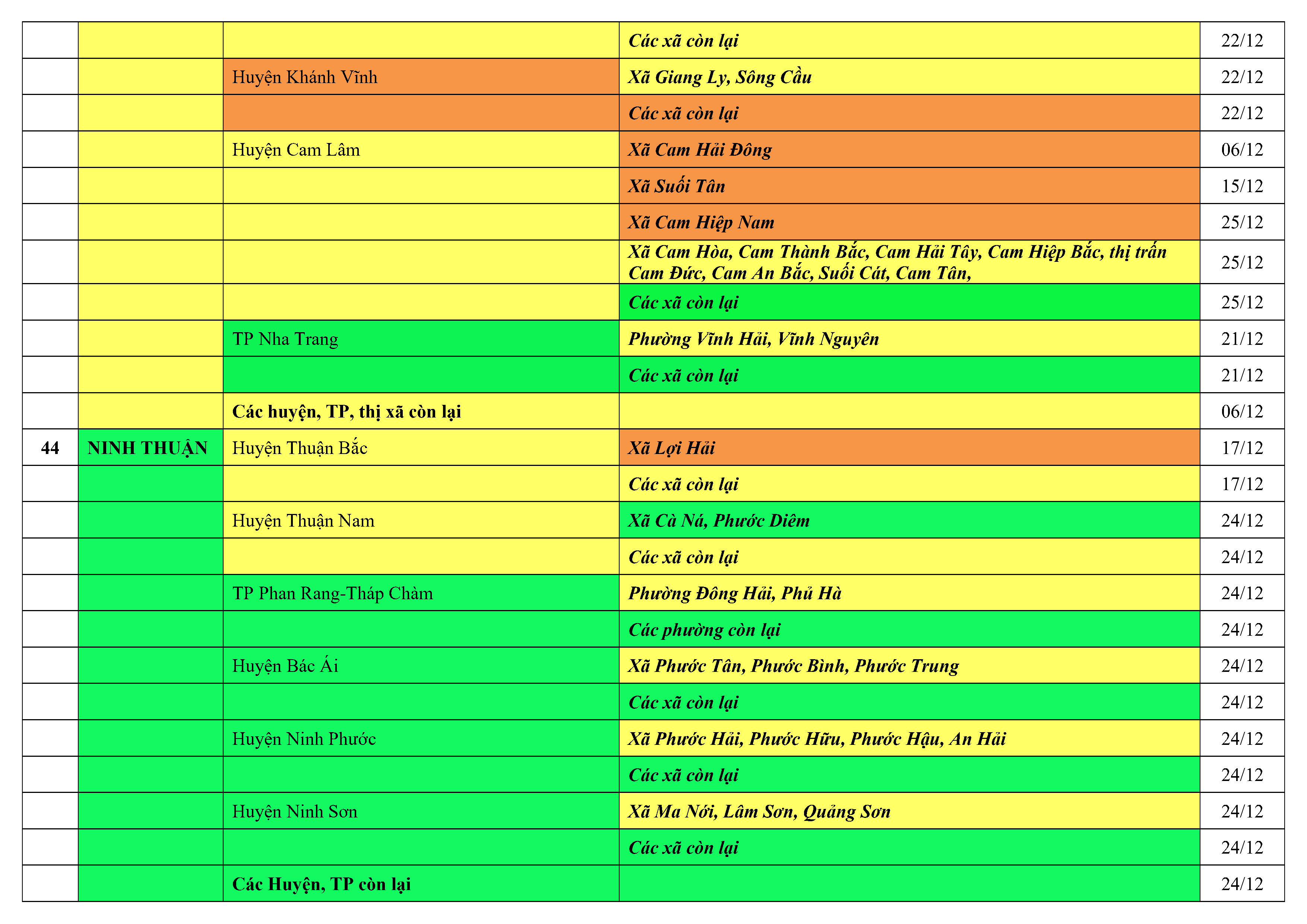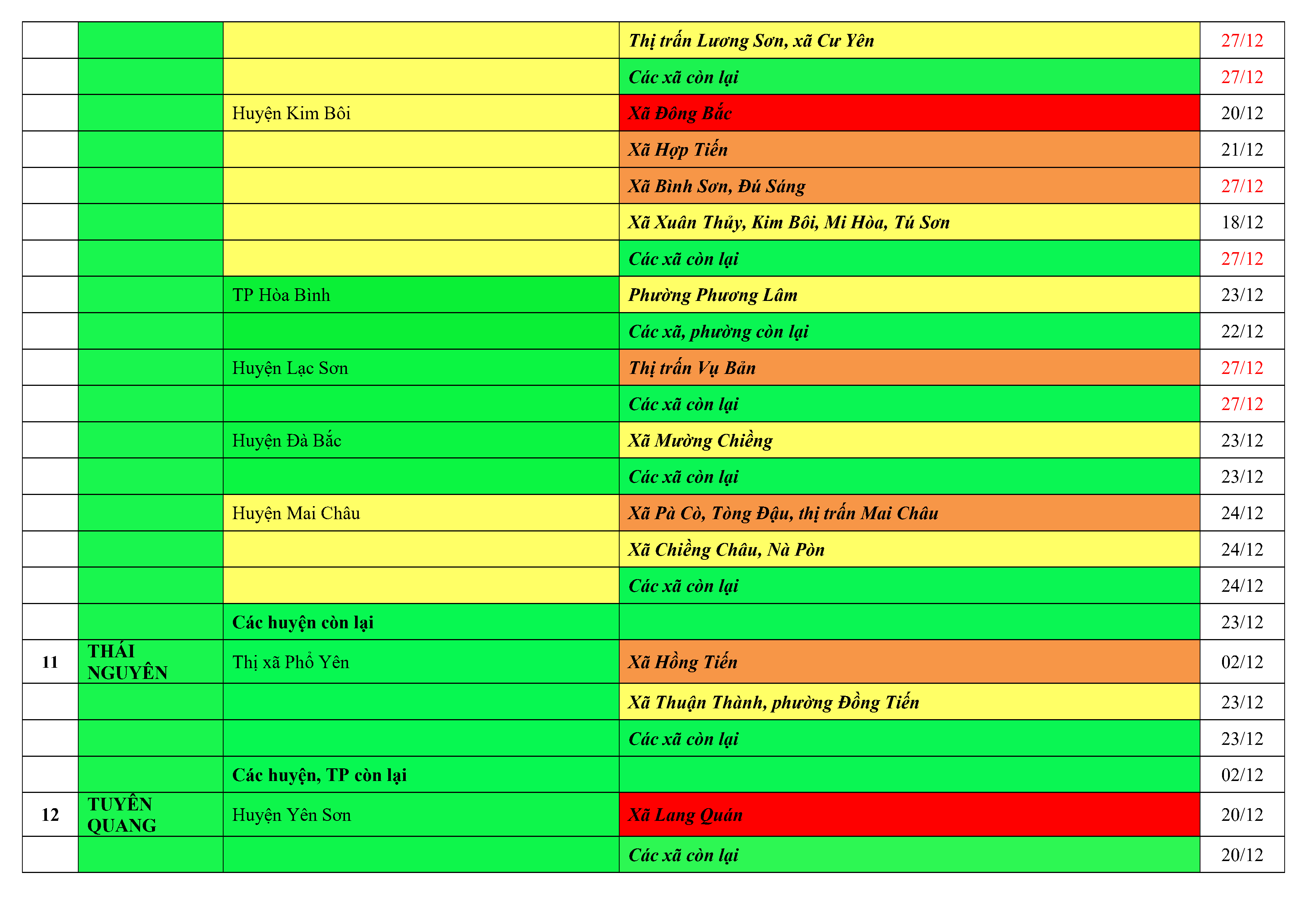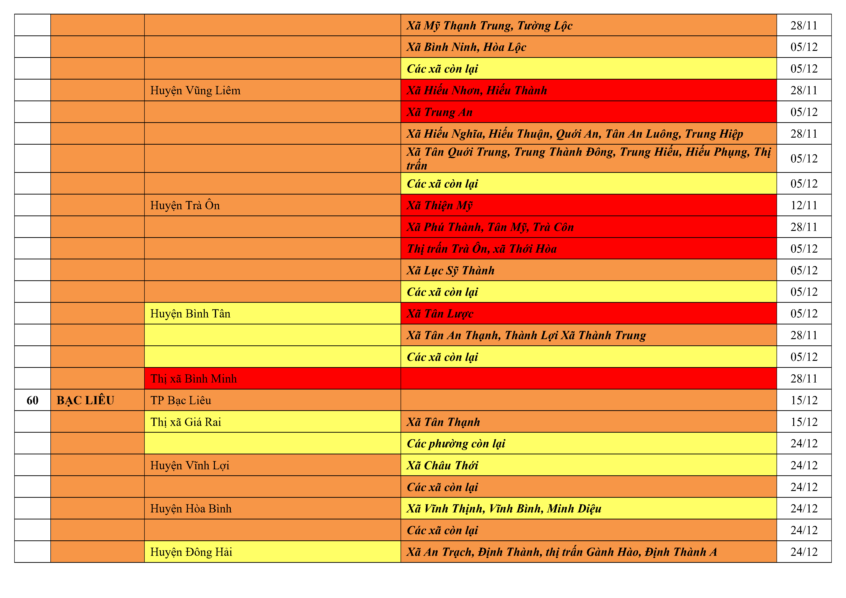 Lưu ý: Các tỉnh, thành phố không có tên trong bảng màu, đi lại bình thường, tuân thủ các biện pháp phòng chống dịch theo chỉ đạo của Bộ Y tế; khai báo y tế, thực hiện nghiêm 5K.