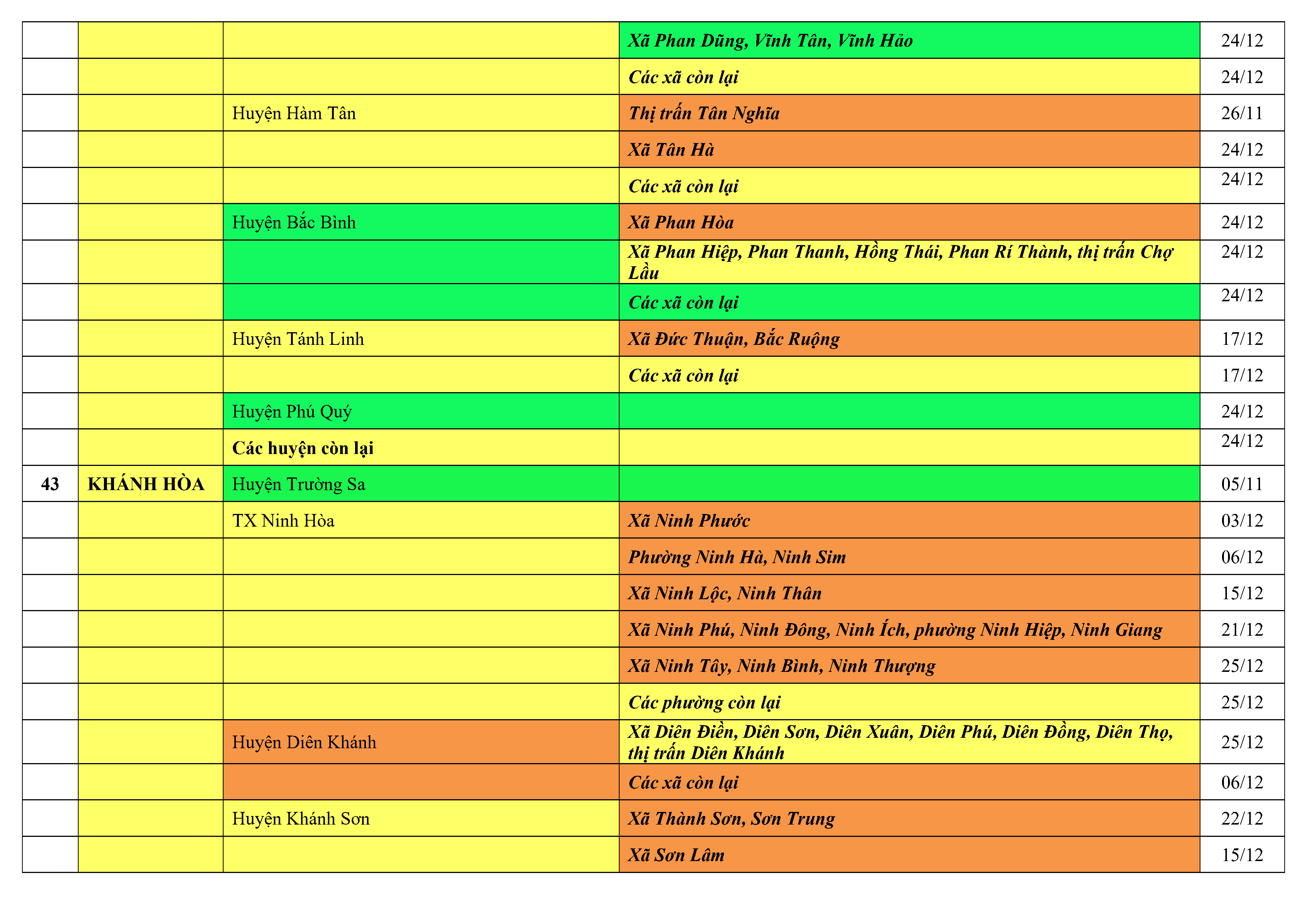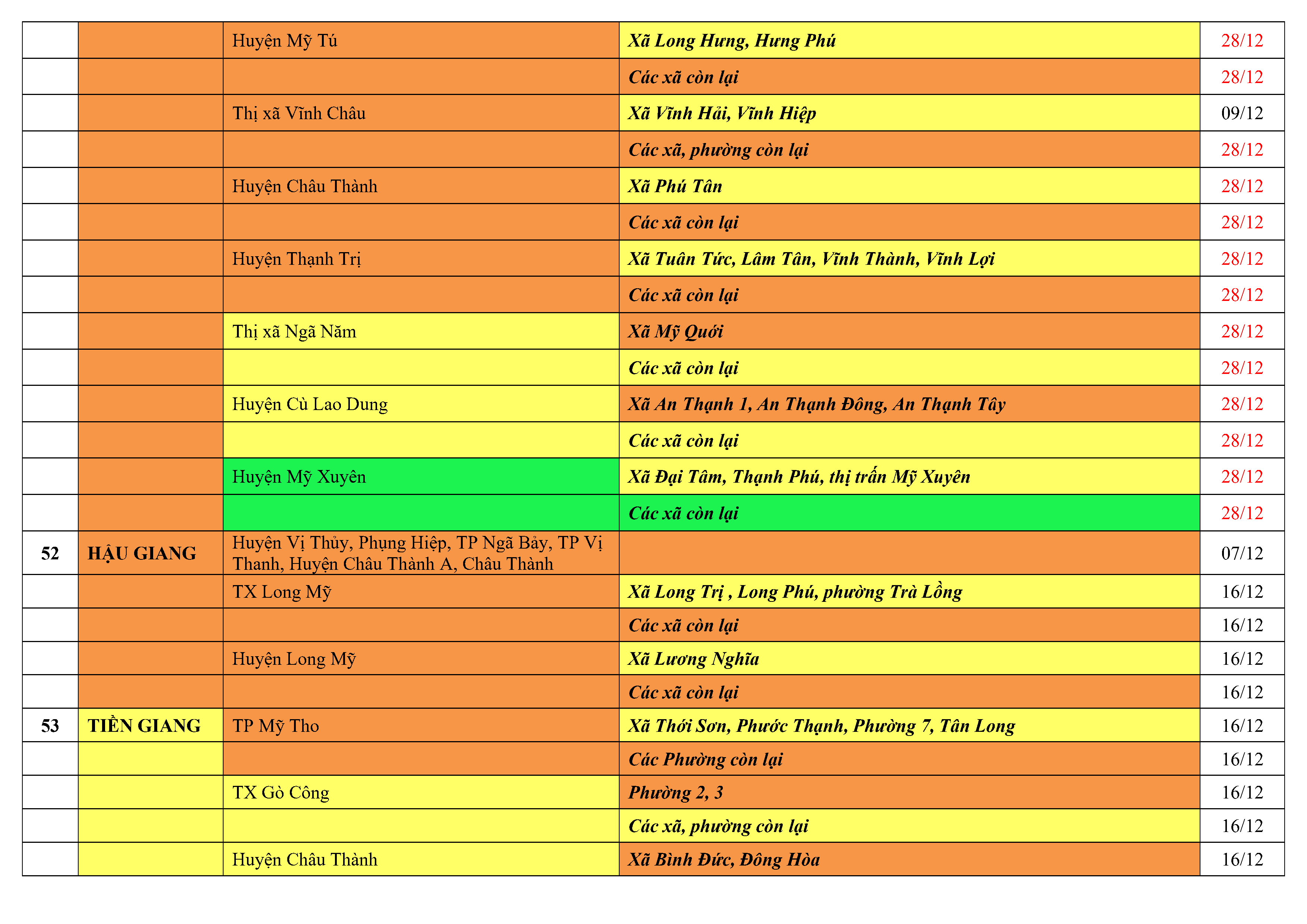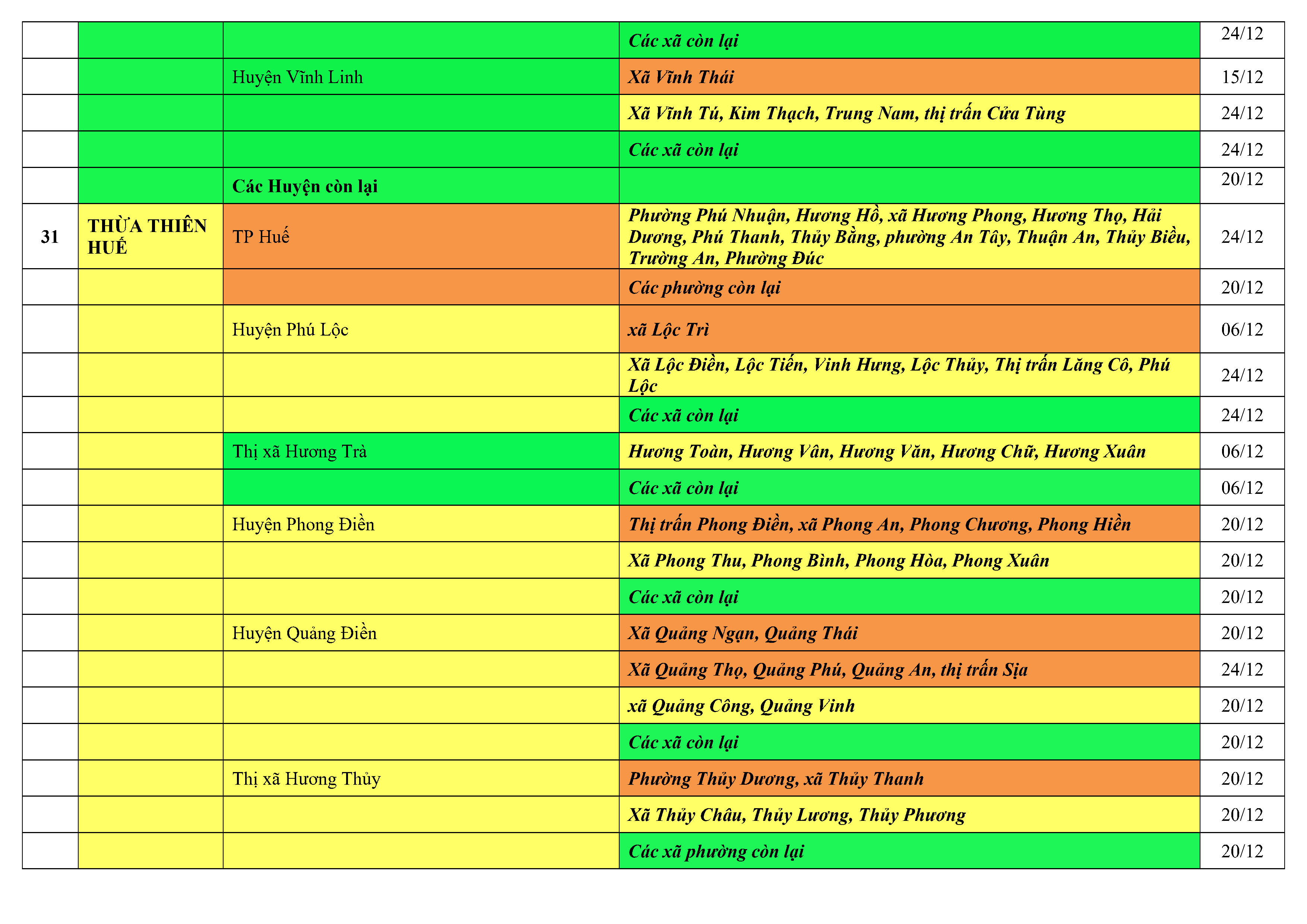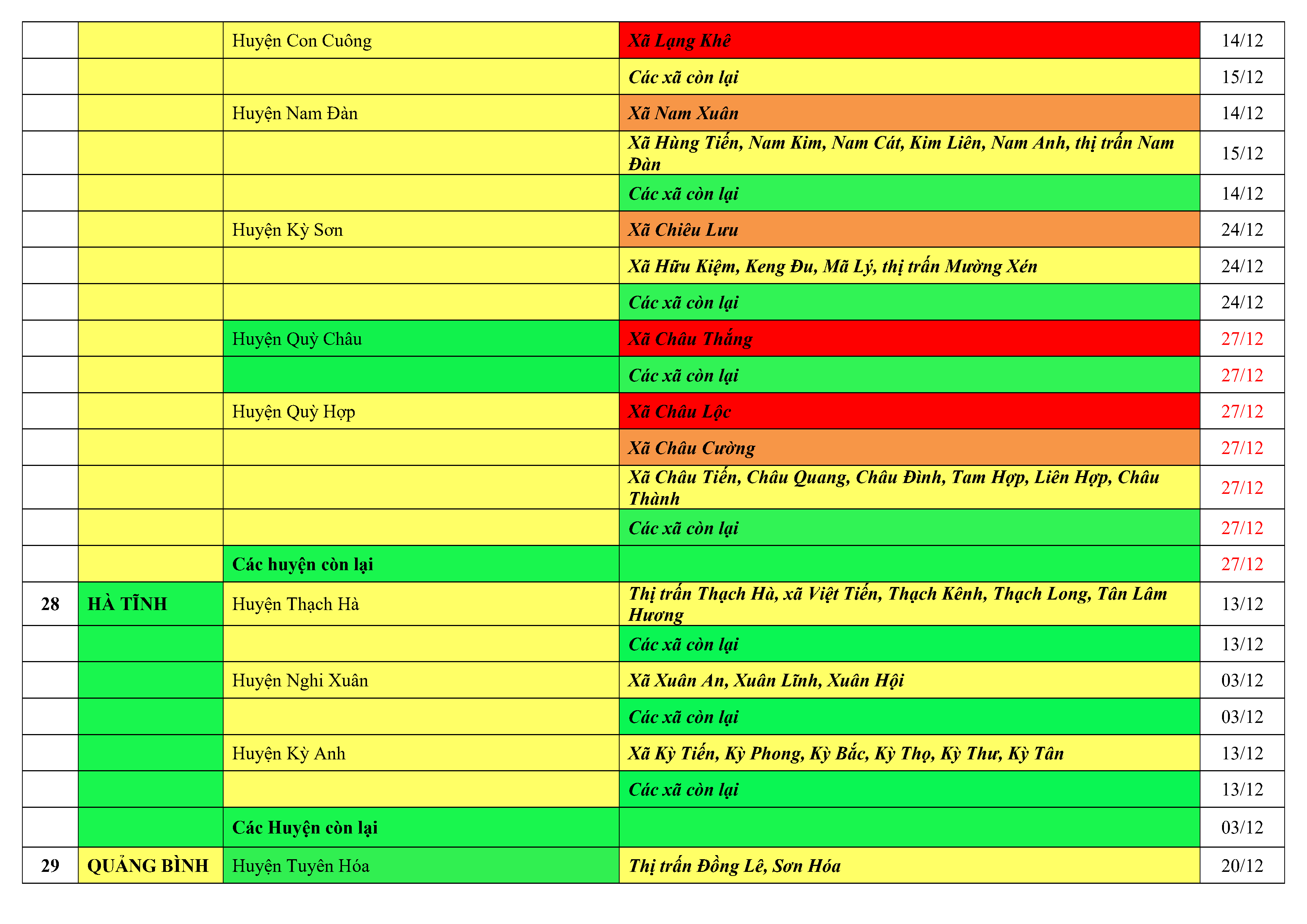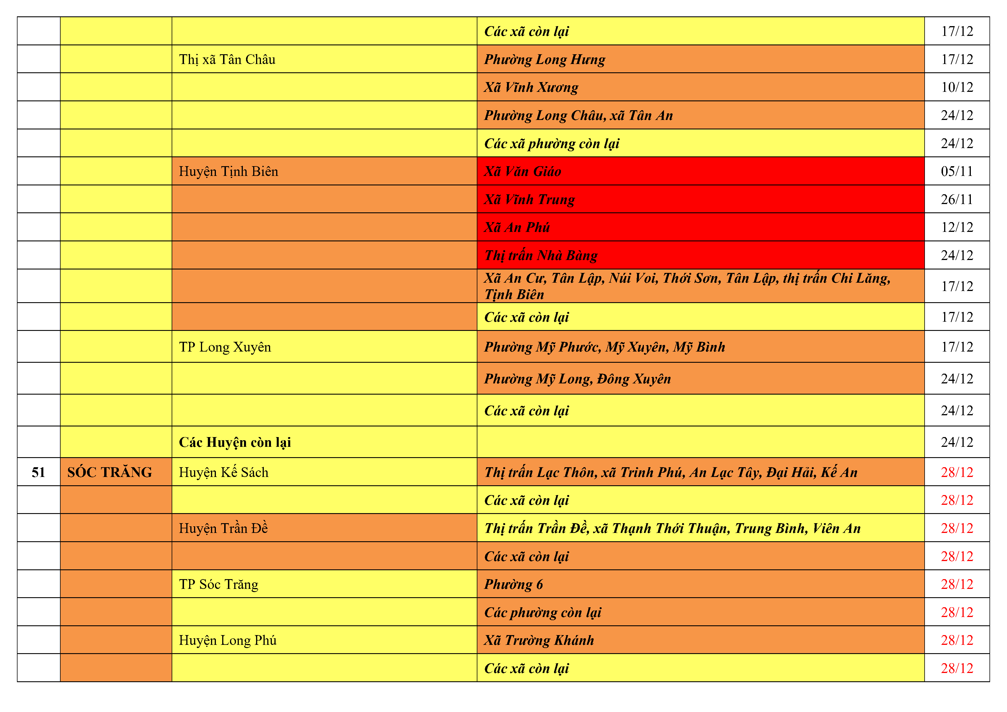 Lưu ý: Các tỉnh, thành phố không có tên trong bảng màu, đi lại bình thường, tuân thủ các biện pháp phòng chống dịch theo chỉ đạo của Bộ Y tế; khai báo y tế, thực hiện nghiêm 5K.