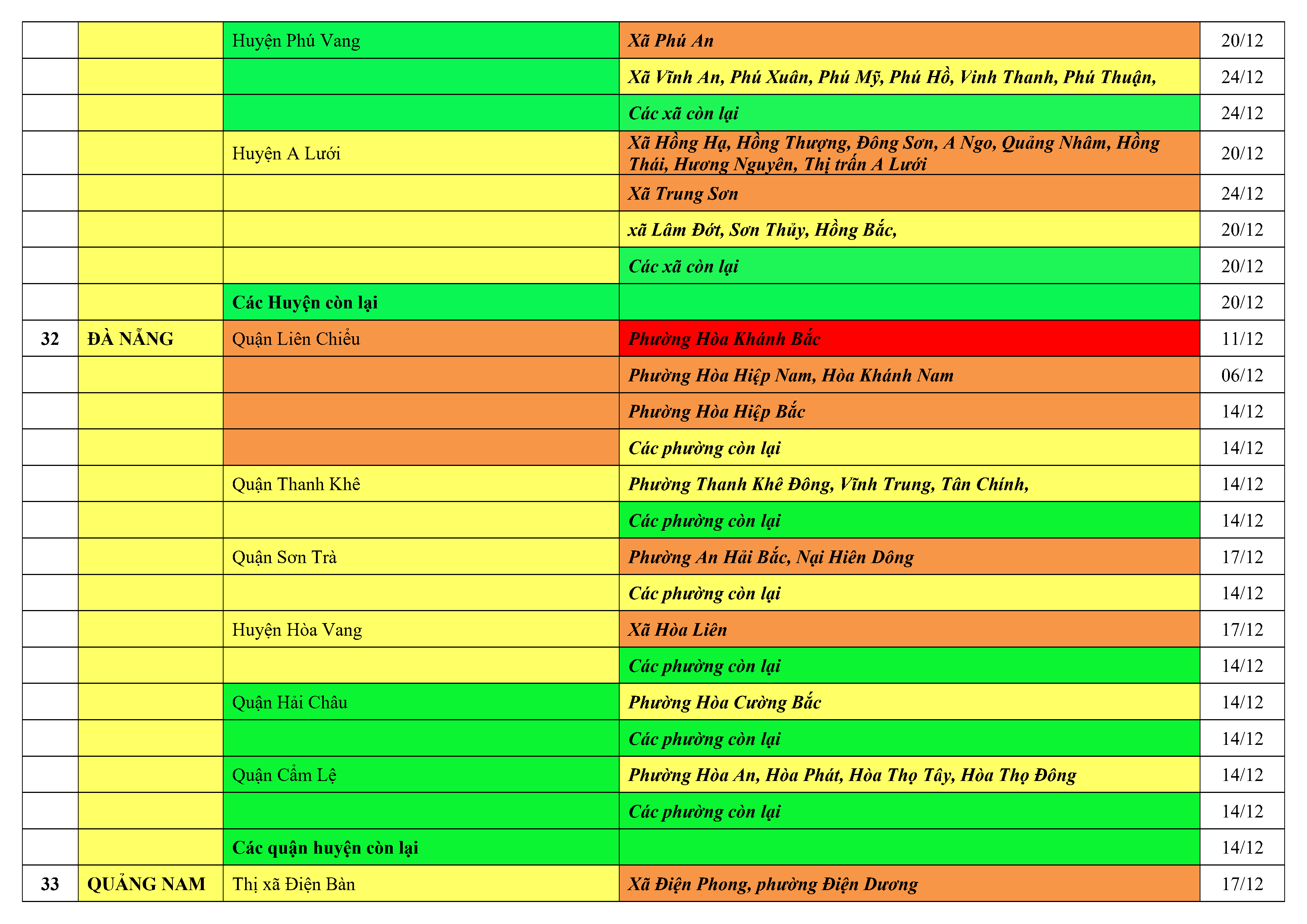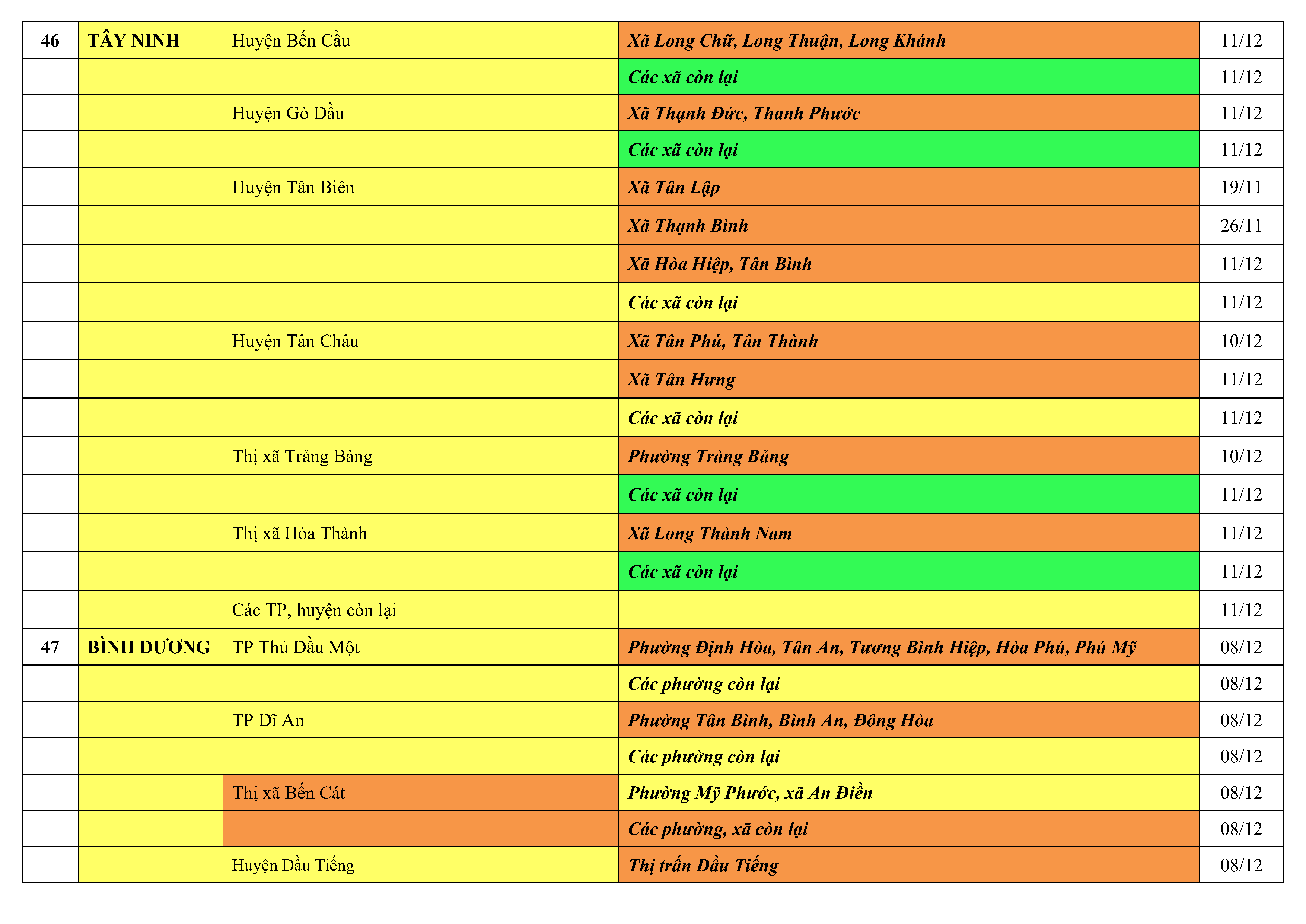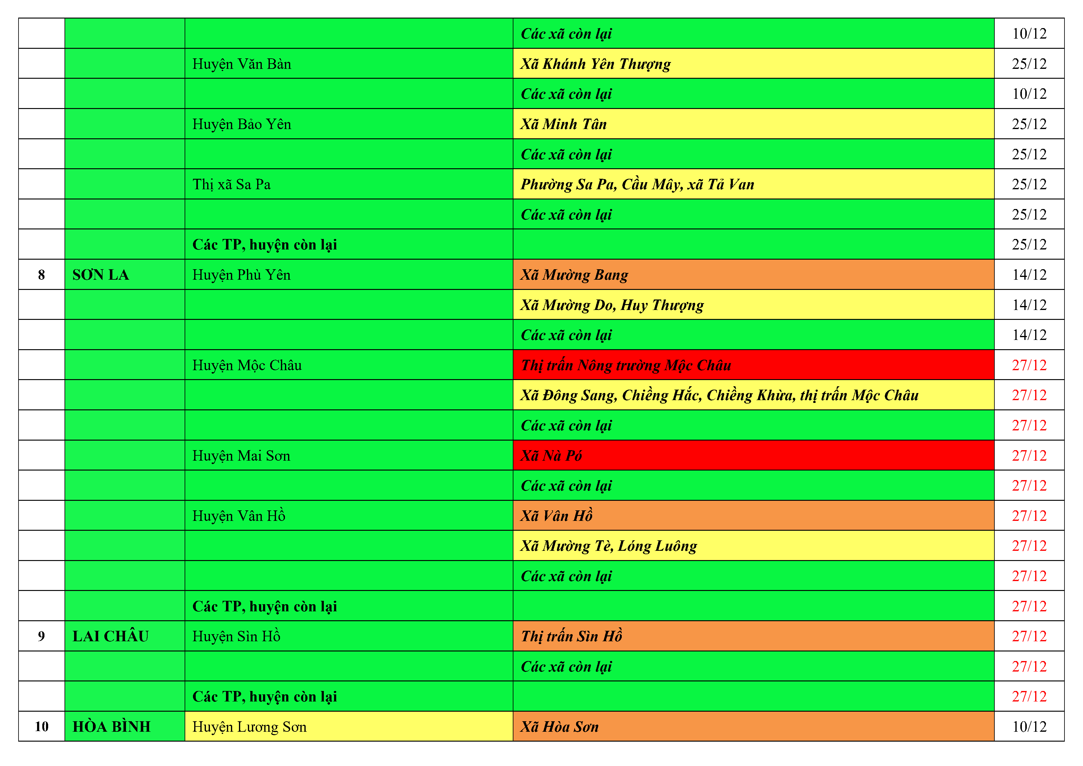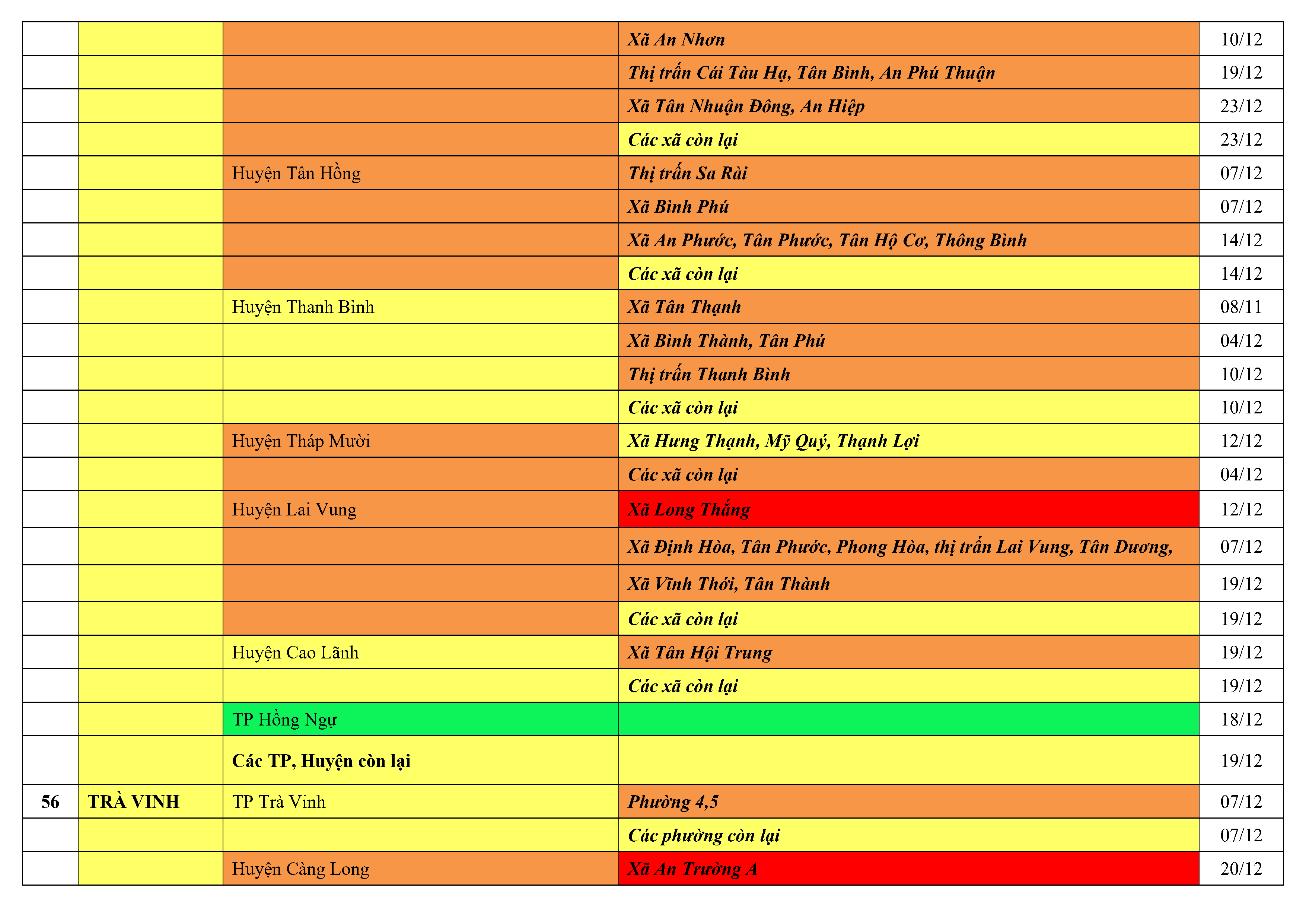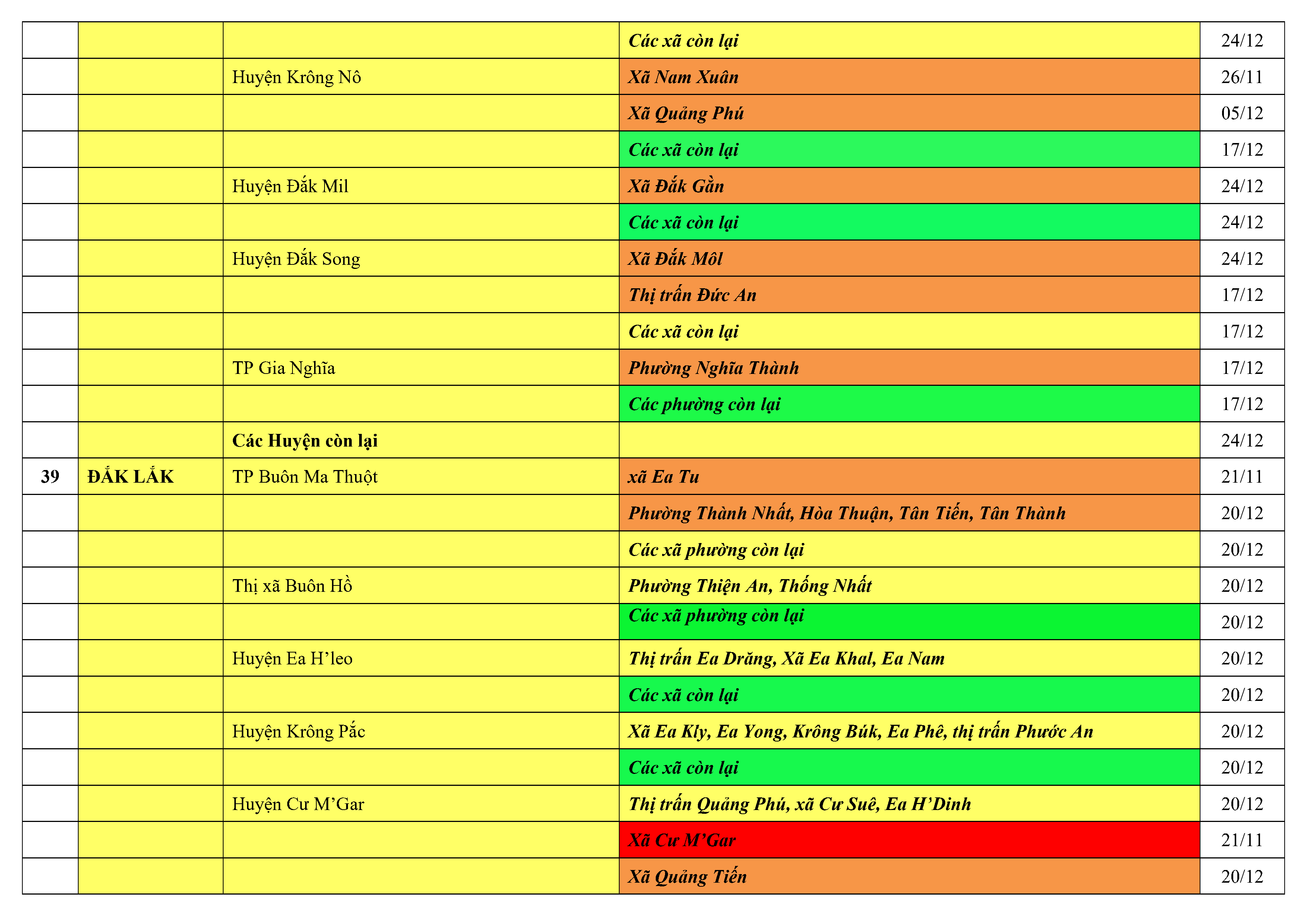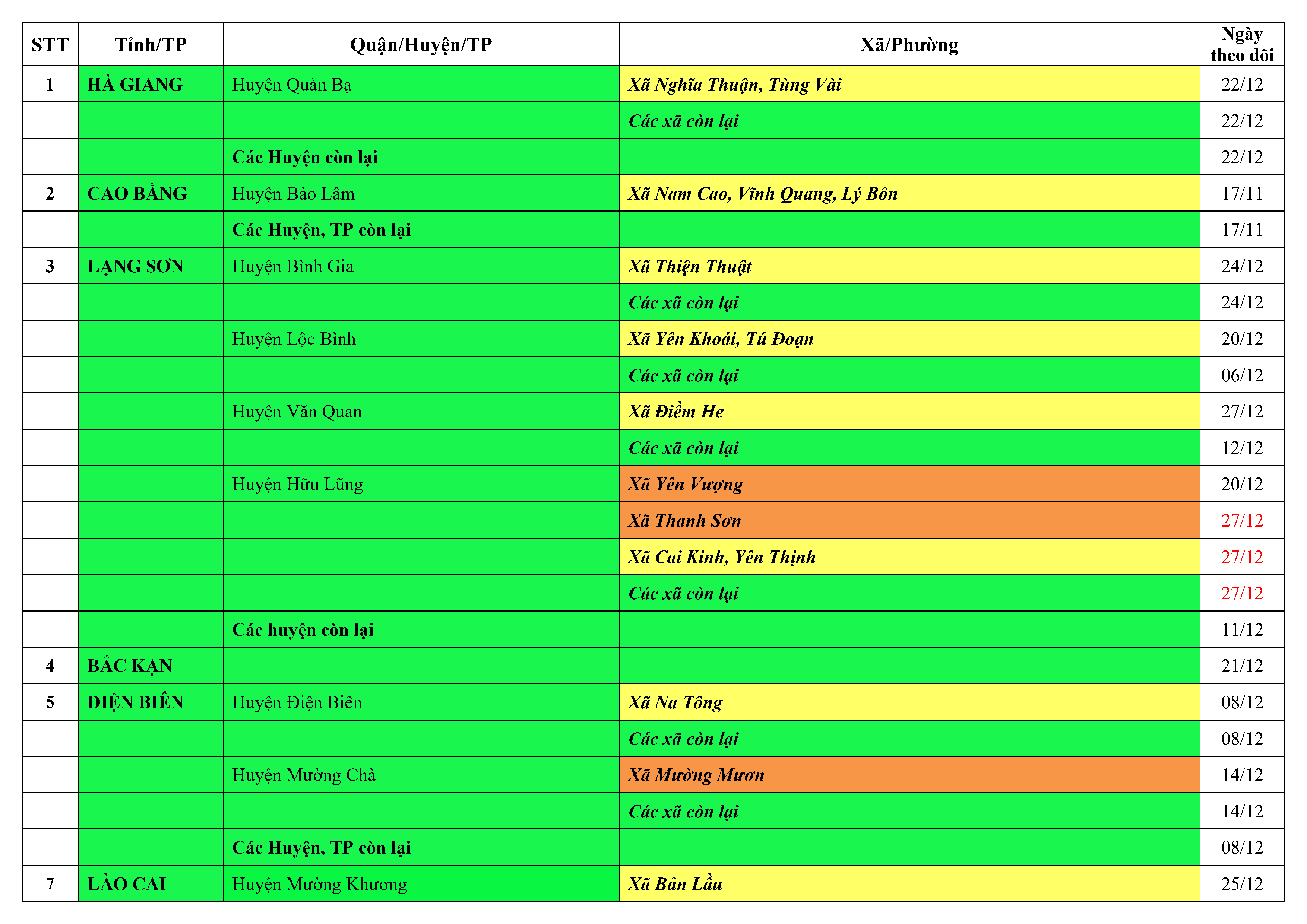 Lưu ý: Các tỉnh, thành phố không có tên trong bảng màu, đi lại bình thường, tuân thủ các biện pháp phòng chống dịch theo chỉ đạo của Bộ Y tế; khai báo y tế, thực hiện nghiêm 5K.