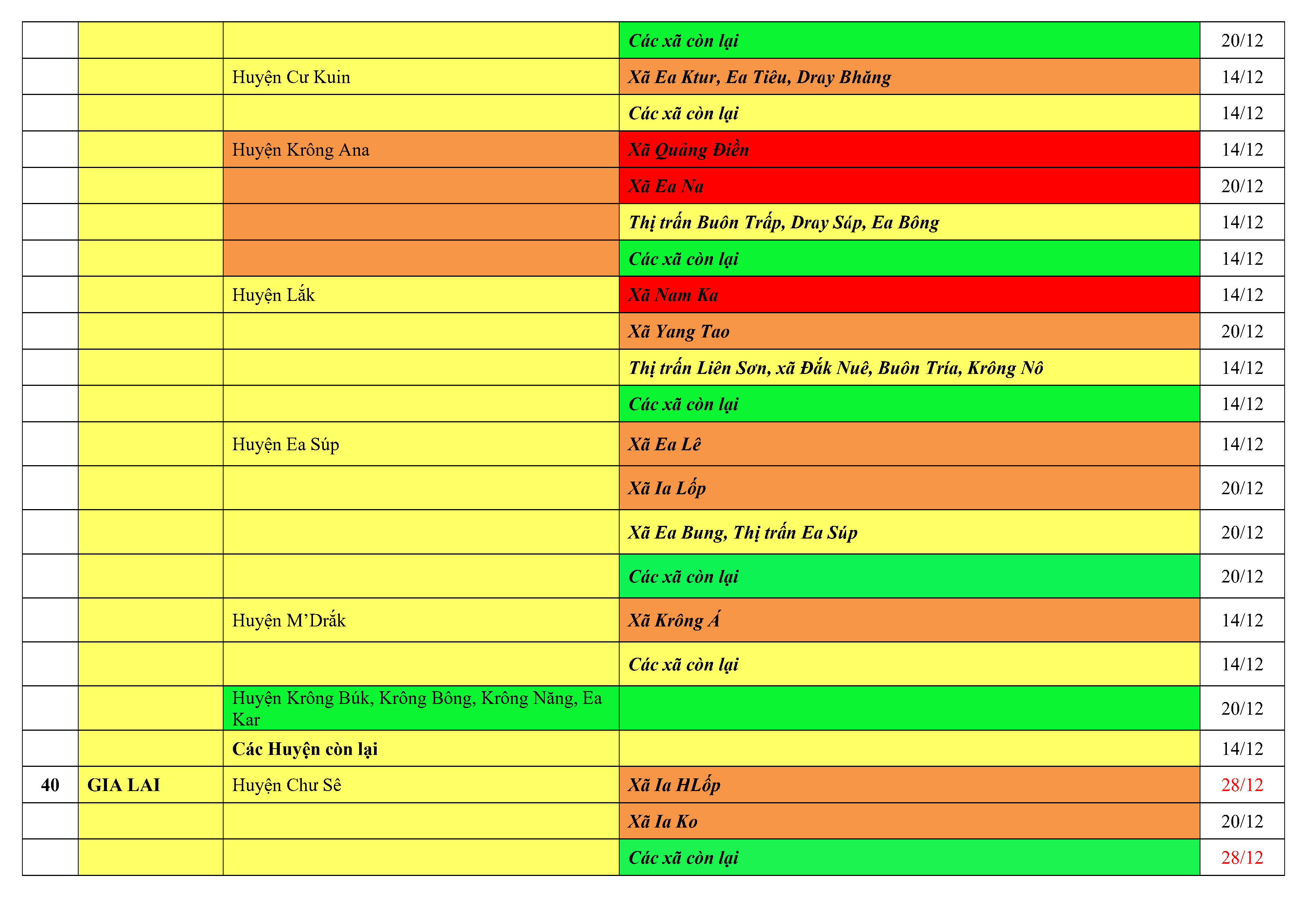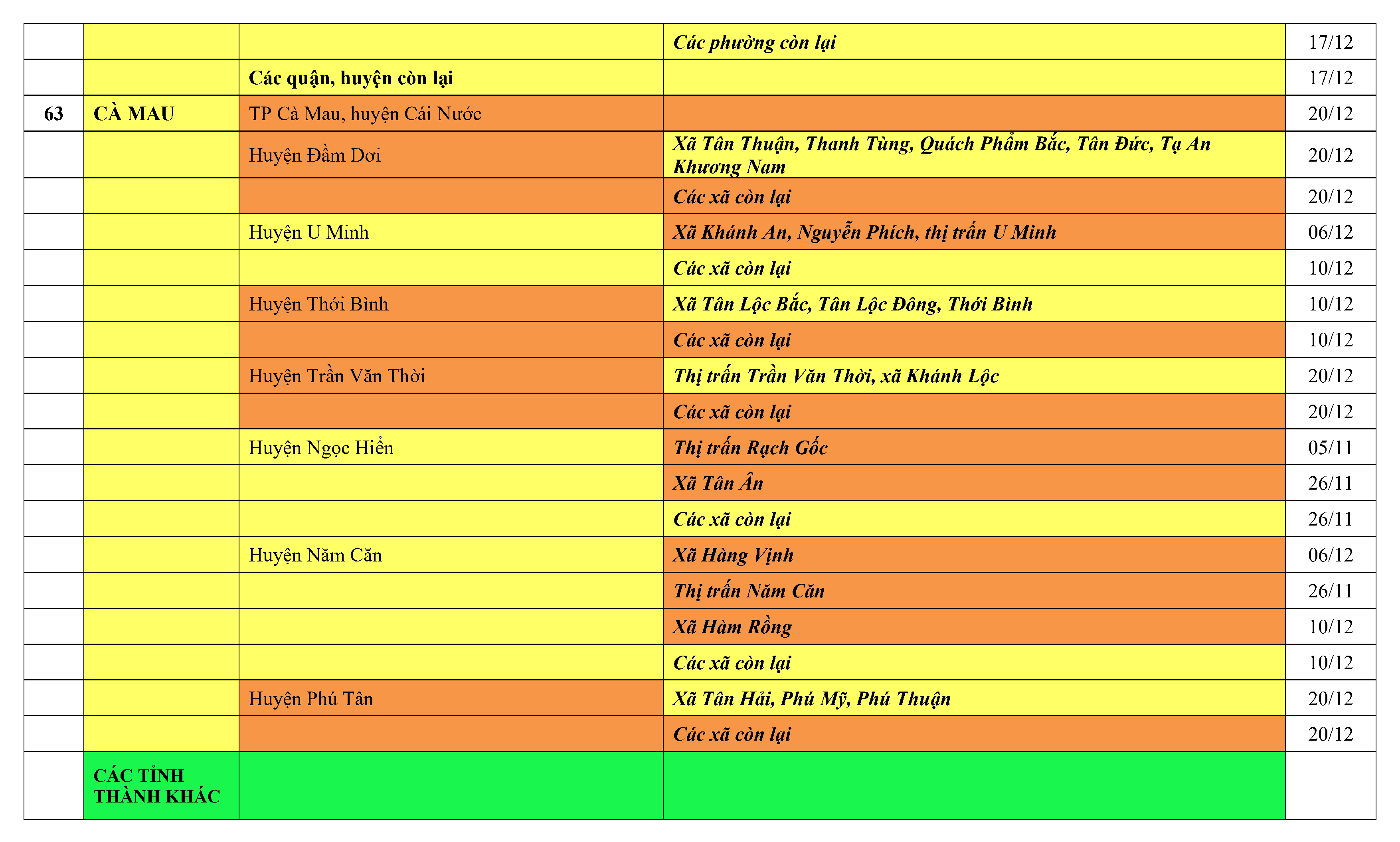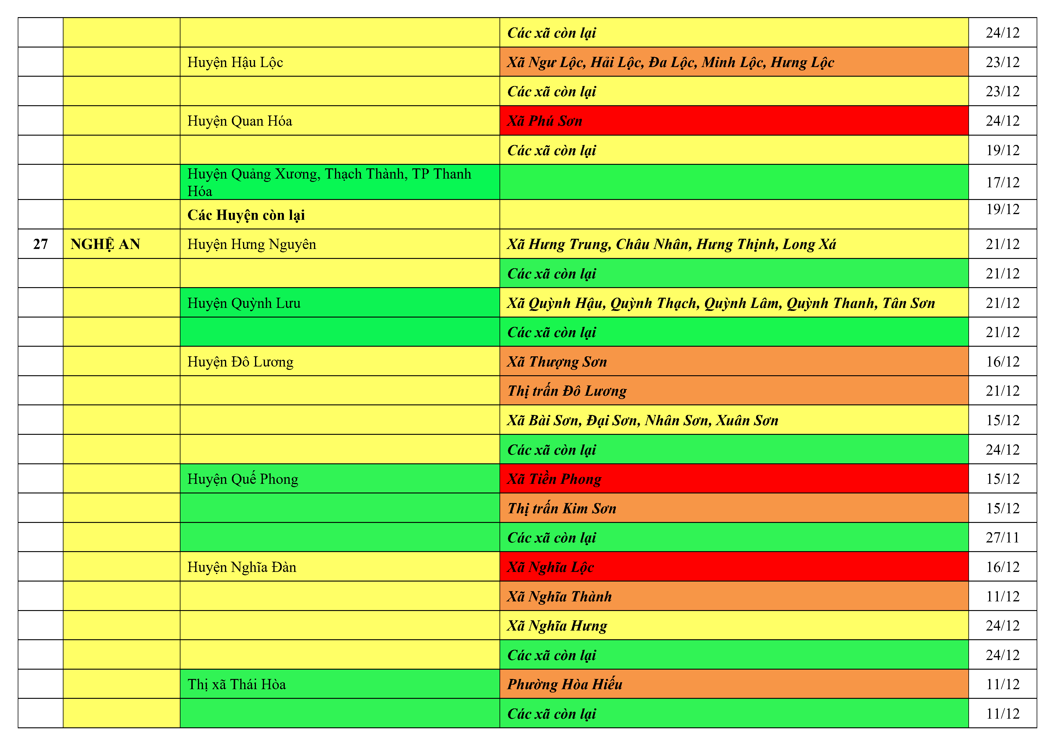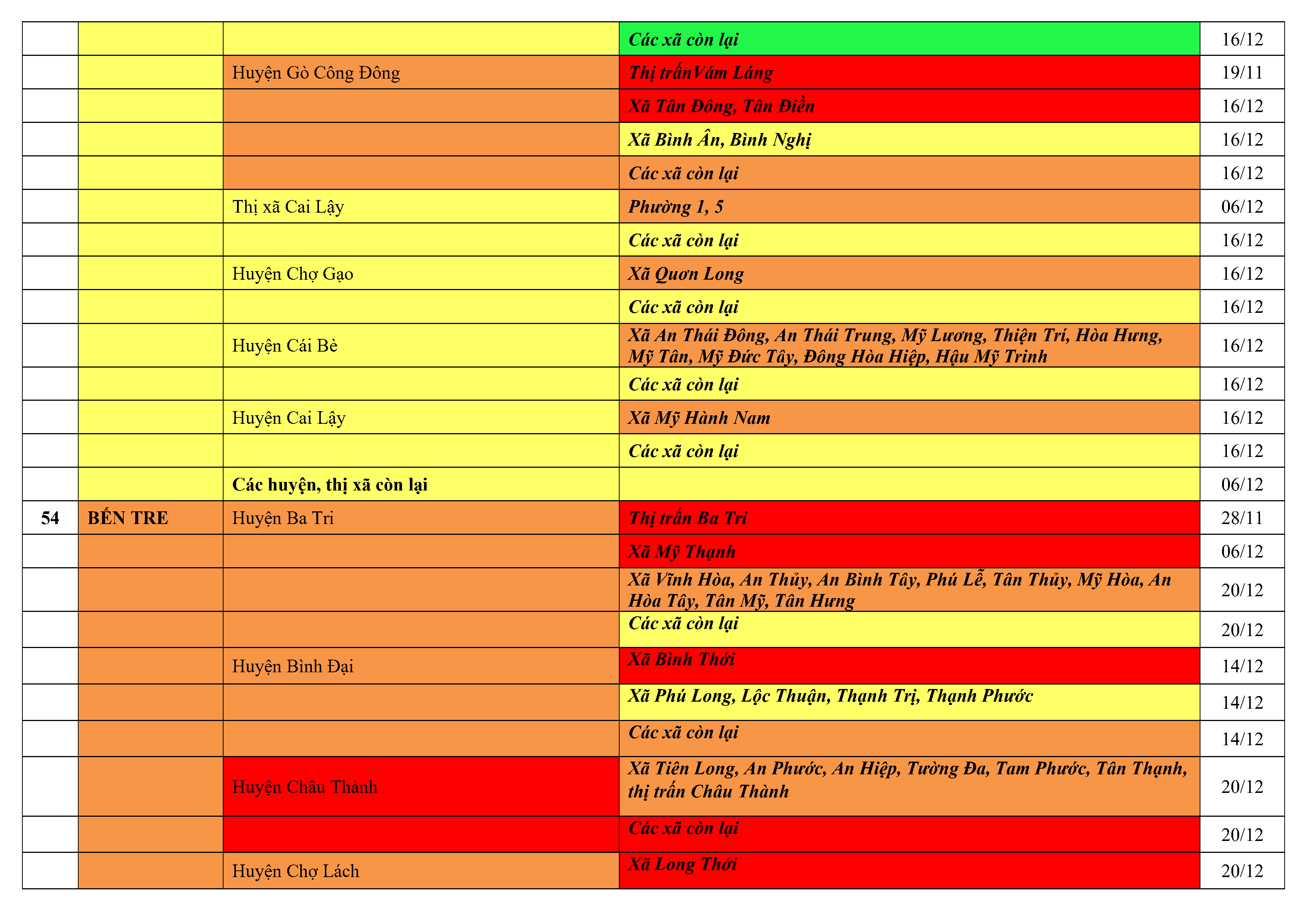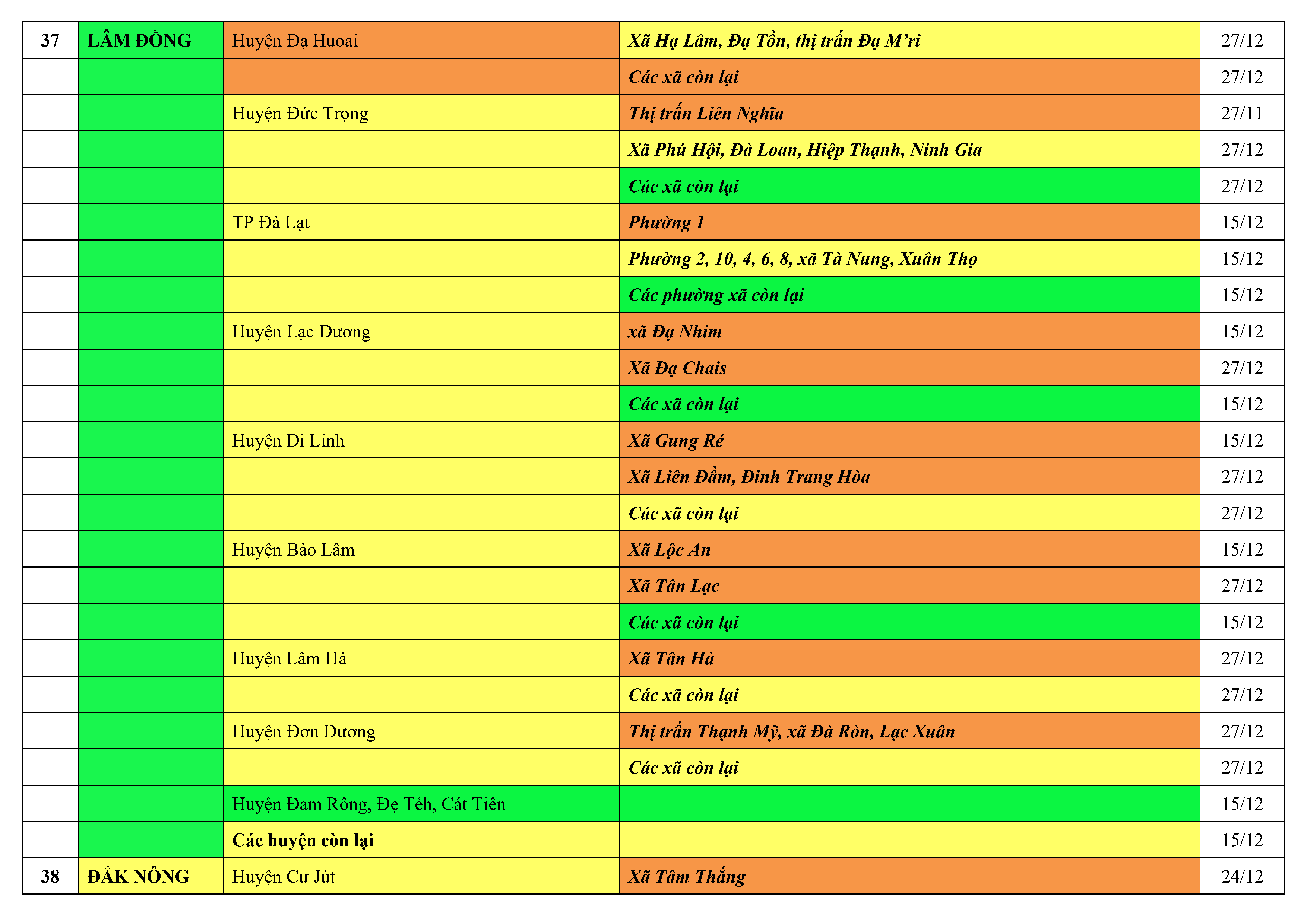 Lưu ý: Các tỉnh, thành phố không có tên trong bảng màu, đi lại bình thường, tuân thủ các biện pháp phòng chống dịch theo chỉ đạo của Bộ Y tế; khai báo y tế, thực hiện nghiêm 5K.