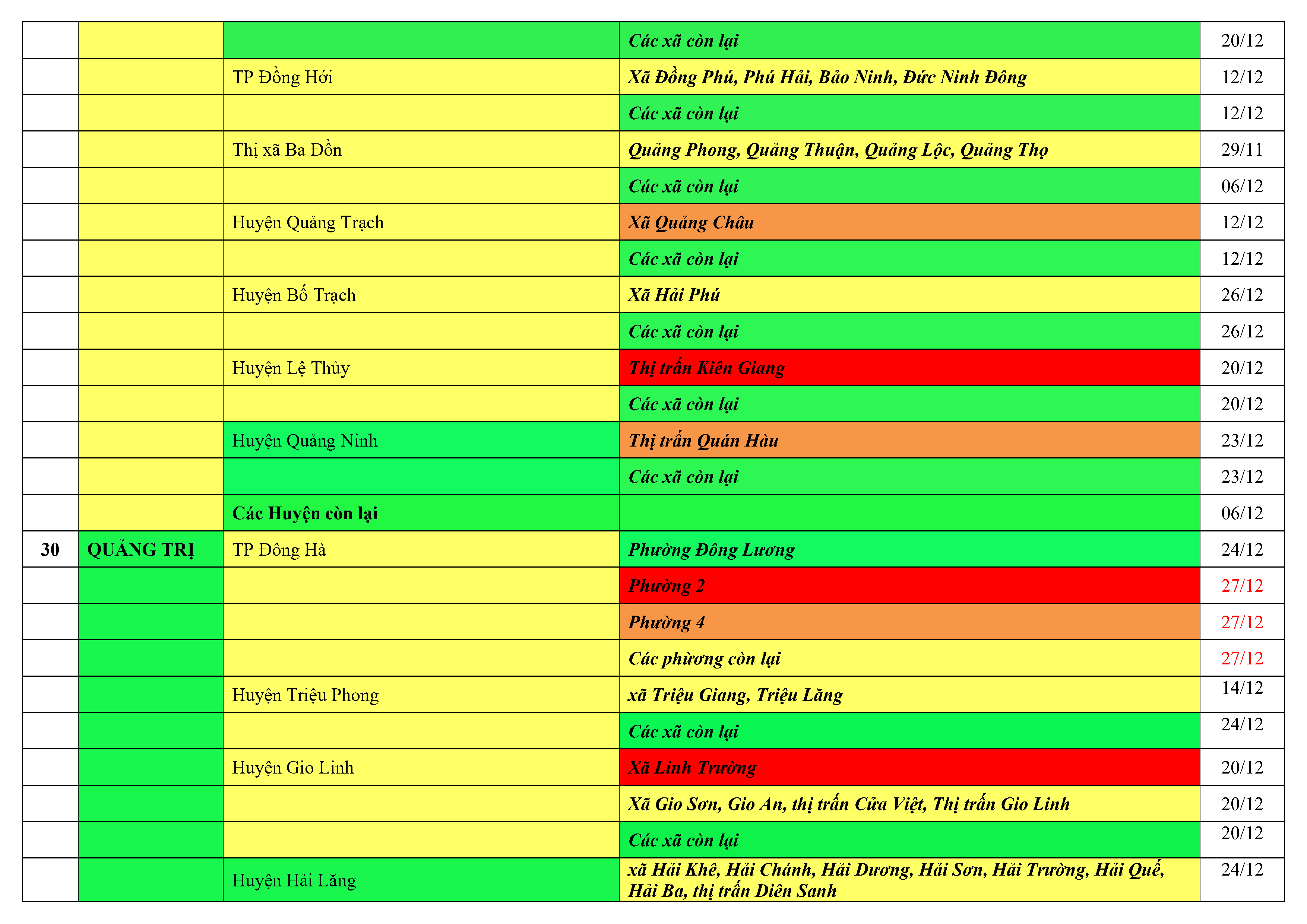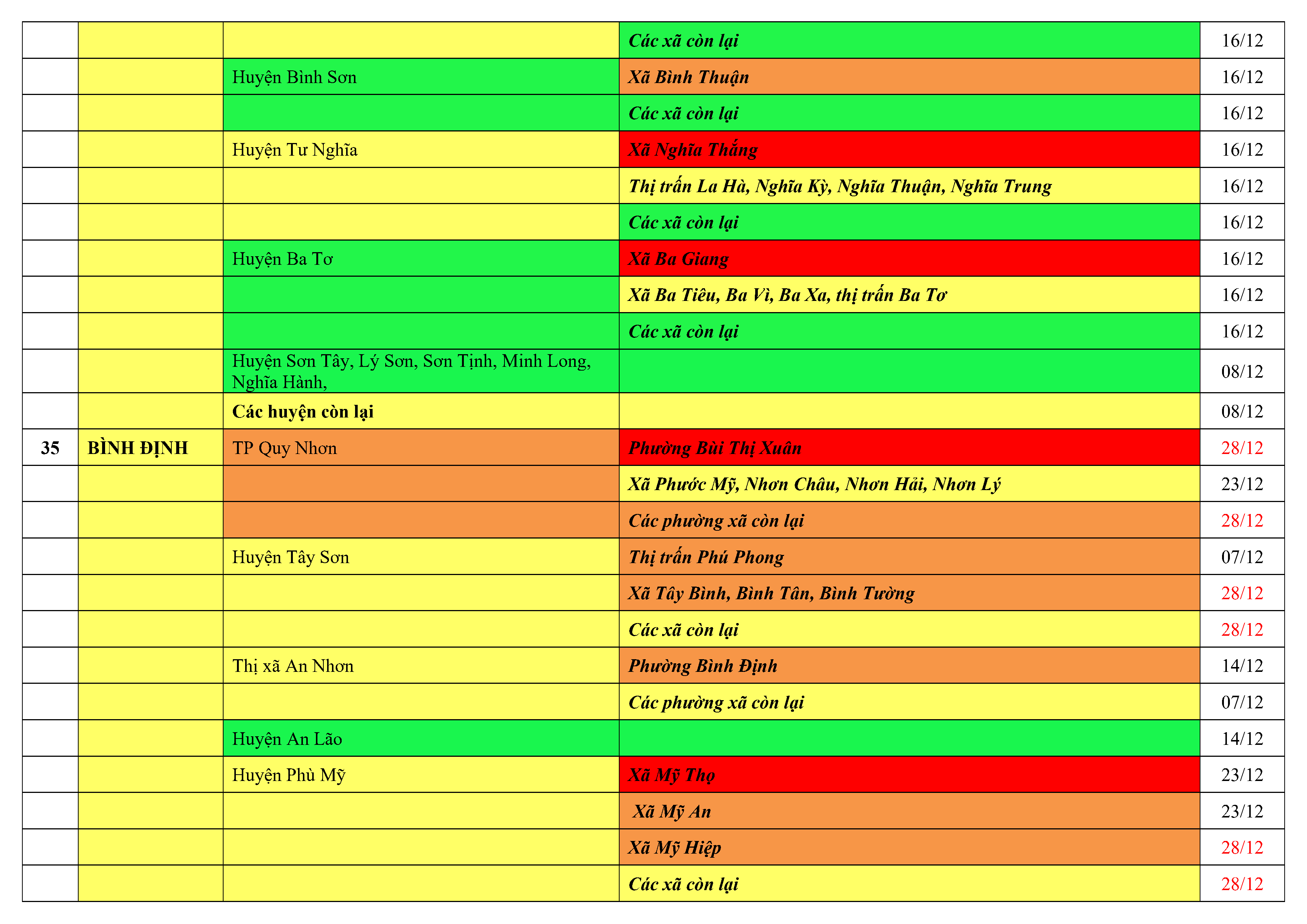Áp dụng biện pháp tương ứng màu sắc ô cột theo thôn xóm; xã phường; quận huyện; tỉnh thành phố. Cách ly y tế dựa vào việc tiếp xúc, đi đến địa điểm và nơi cư trú có ca bệnh, theo Thông báo của Bộ Y tế, các tỉnh thành phố.