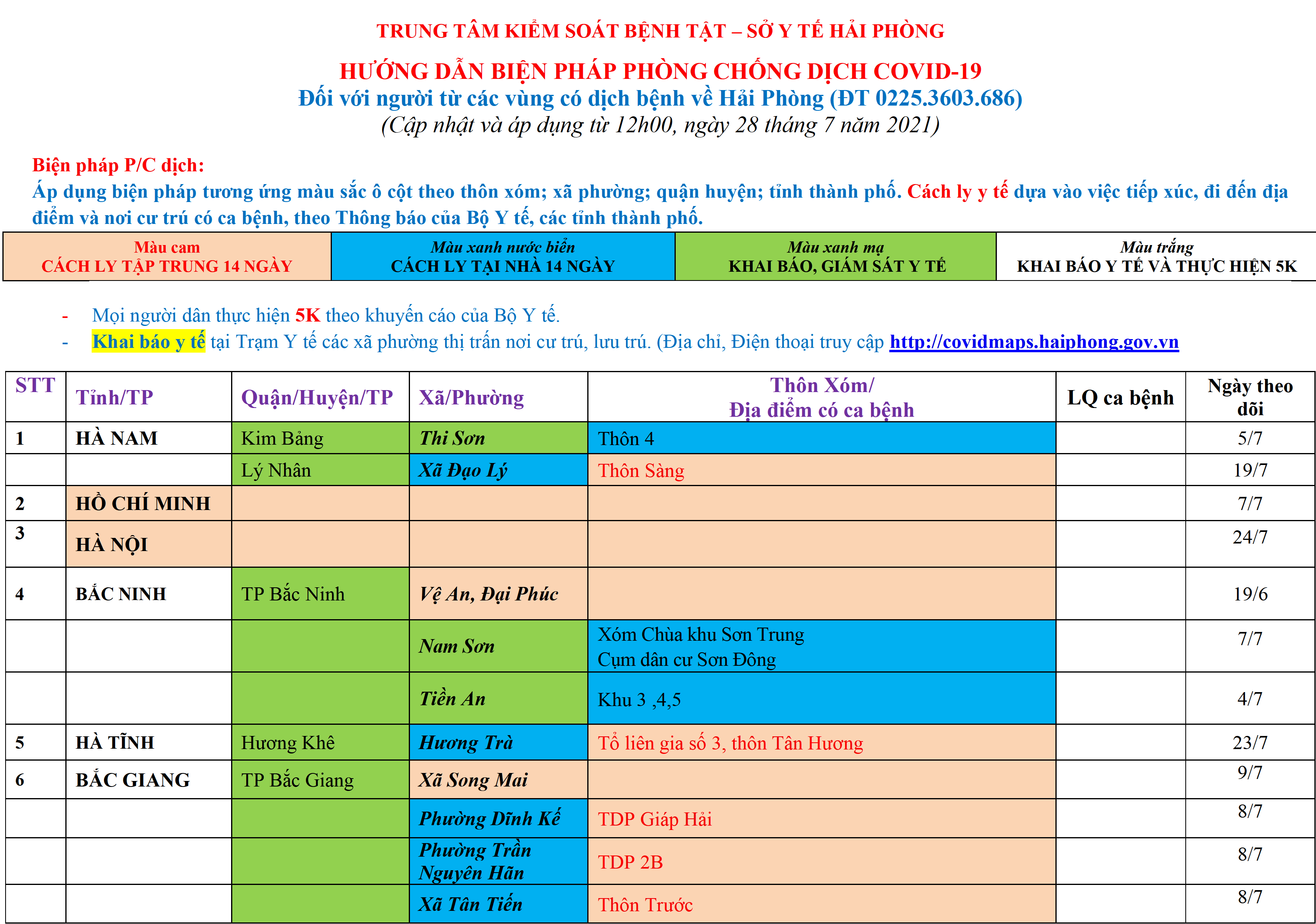CDC Hải Phòng ban hành hướng dẫn tạm thời biện pháp phòng chống dịch COVID-19 đối với người từ các tỉnh, thành khác về thành phố như sau (thông tin cập nhật vào 12h00’ ngày 28/7/2021):