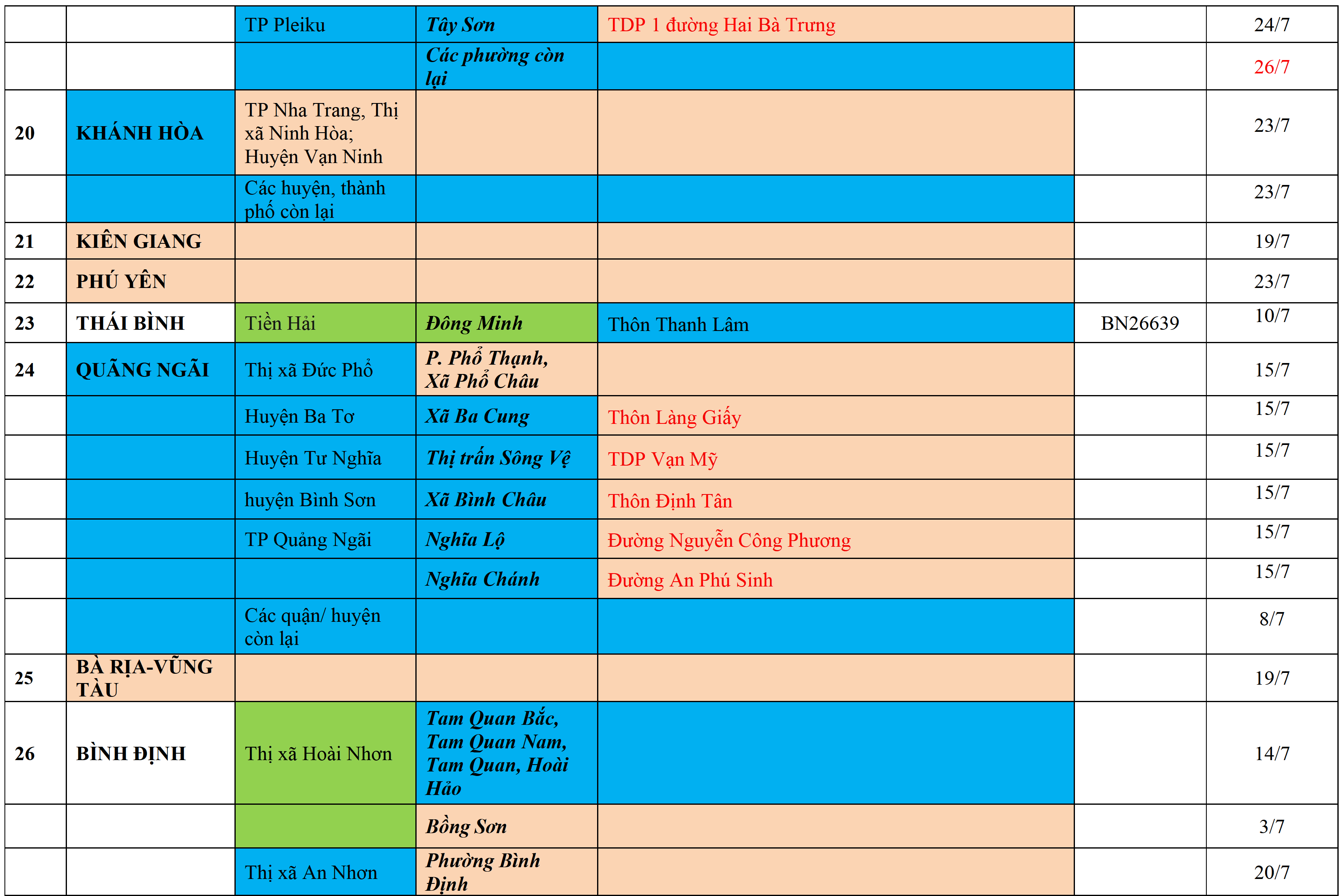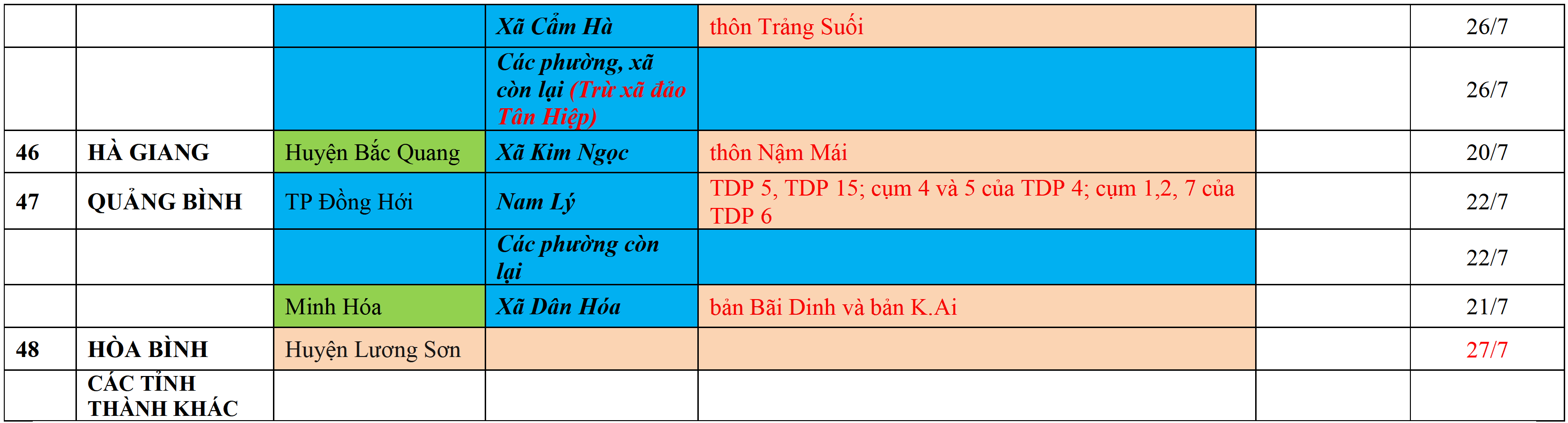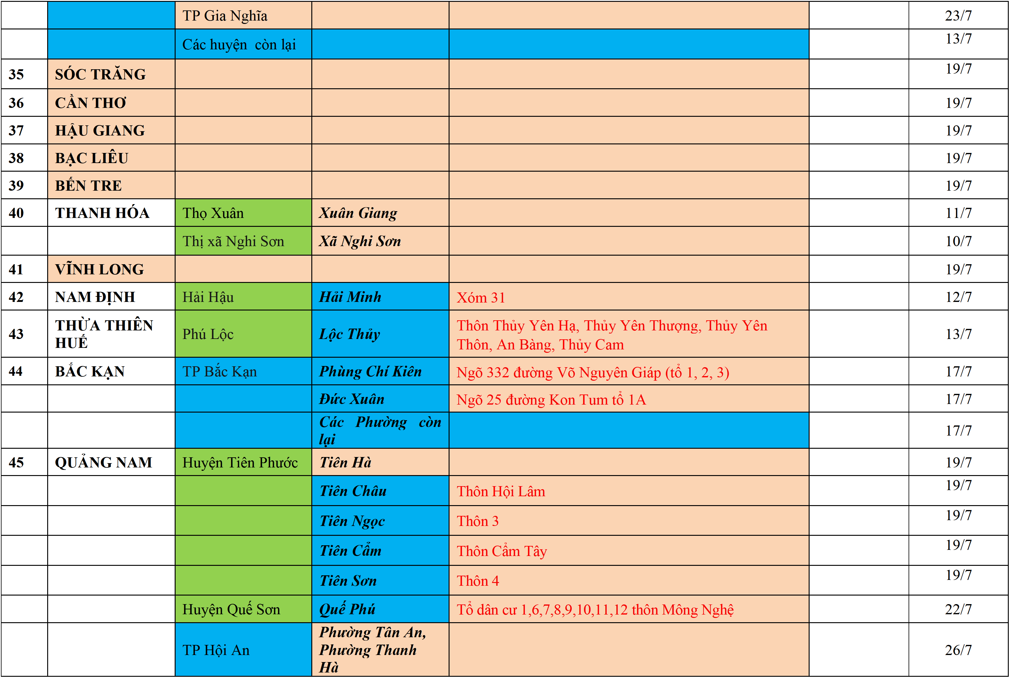 Màu cam: CÁCH LY TẬP TRUNG; Màu xanh nước biển: CÁCH LY TẠI NHÀ 14 NGÀY; Màu xanh mạ: KHAI BÁO, GIÁM SÁT Y TẾ; Màu trắng: KHAI BÁO Y TẾ VÀ THỰC HIỆN 5K.