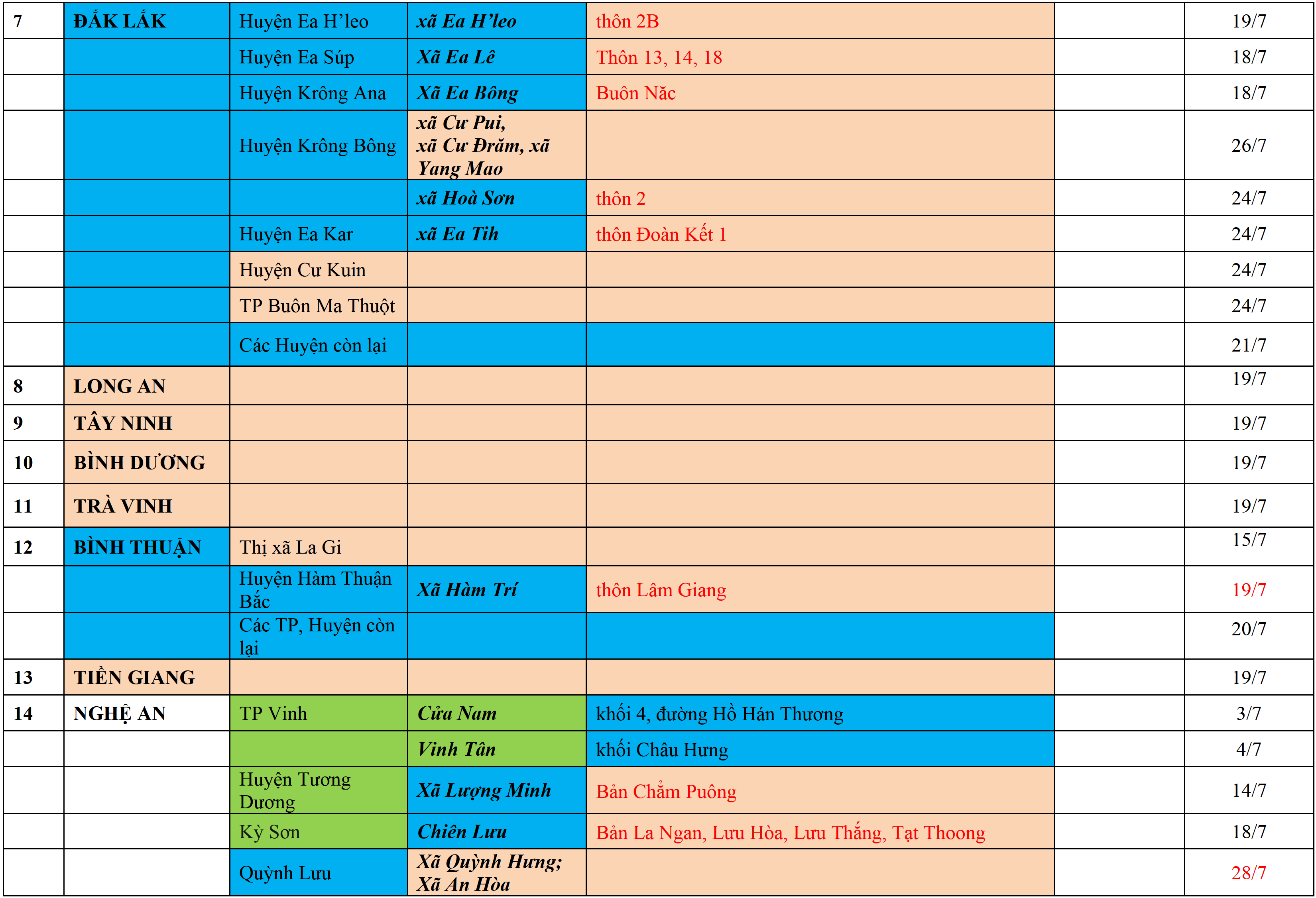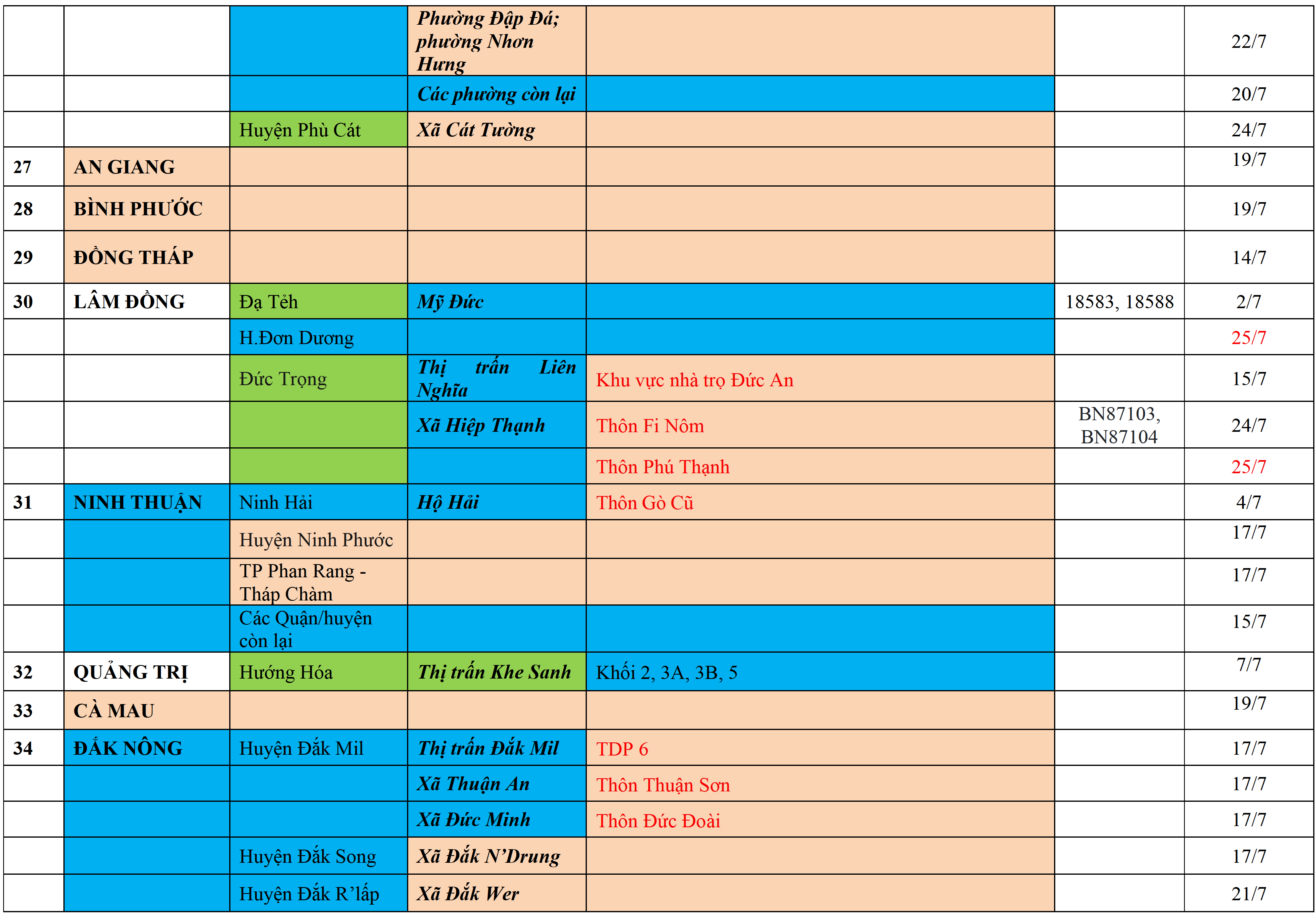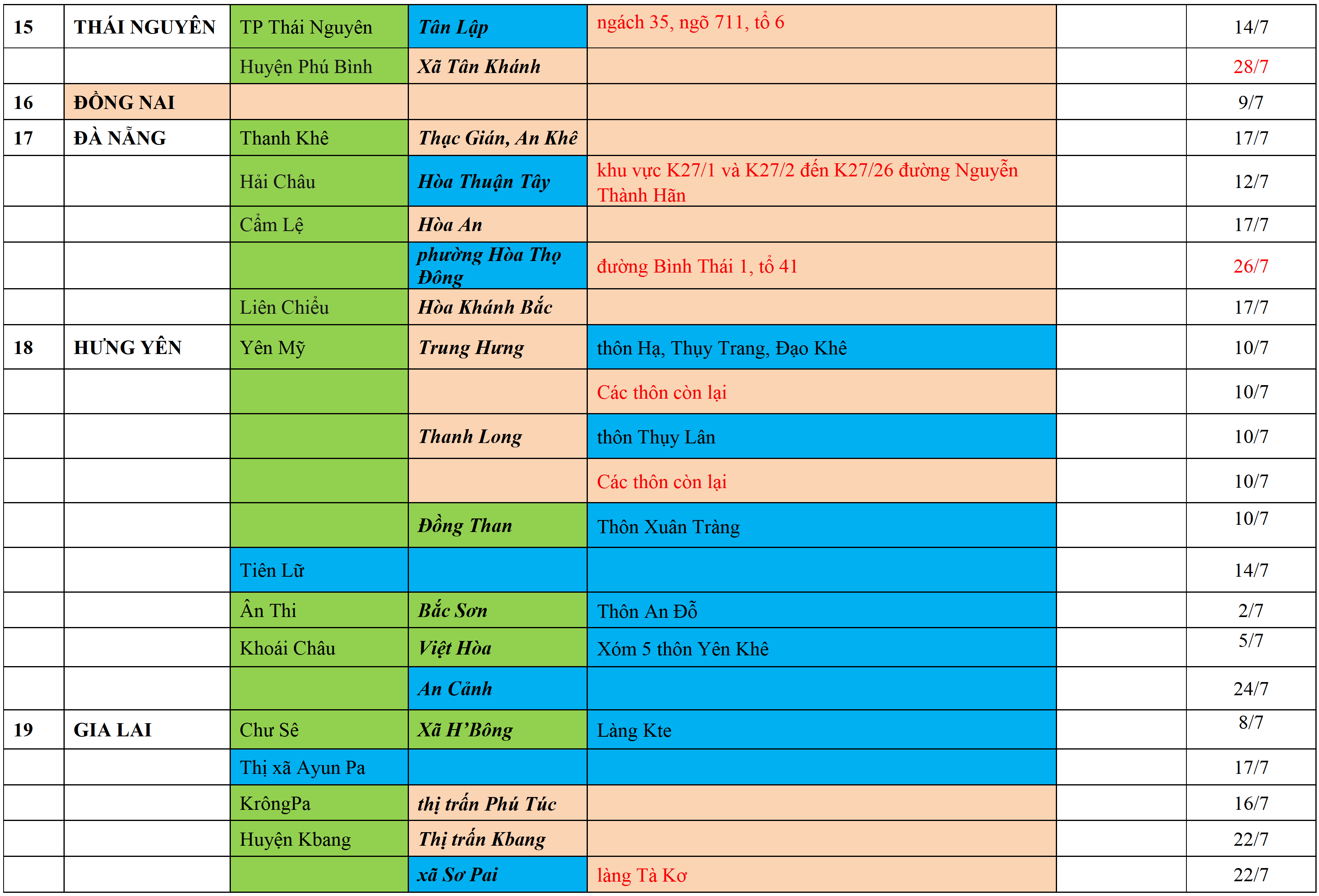 Màu cam: CÁCH LY TẬP TRUNG; Màu xanh nước biển: CÁCH LY TẠI NHÀ 14 NGÀY; Màu xanh mạ: KHAI BÁO, GIÁM SÁT Y TẾ; Màu trắng: KHAI BÁO Y TẾ VÀ THỰC HIỆN 5K.