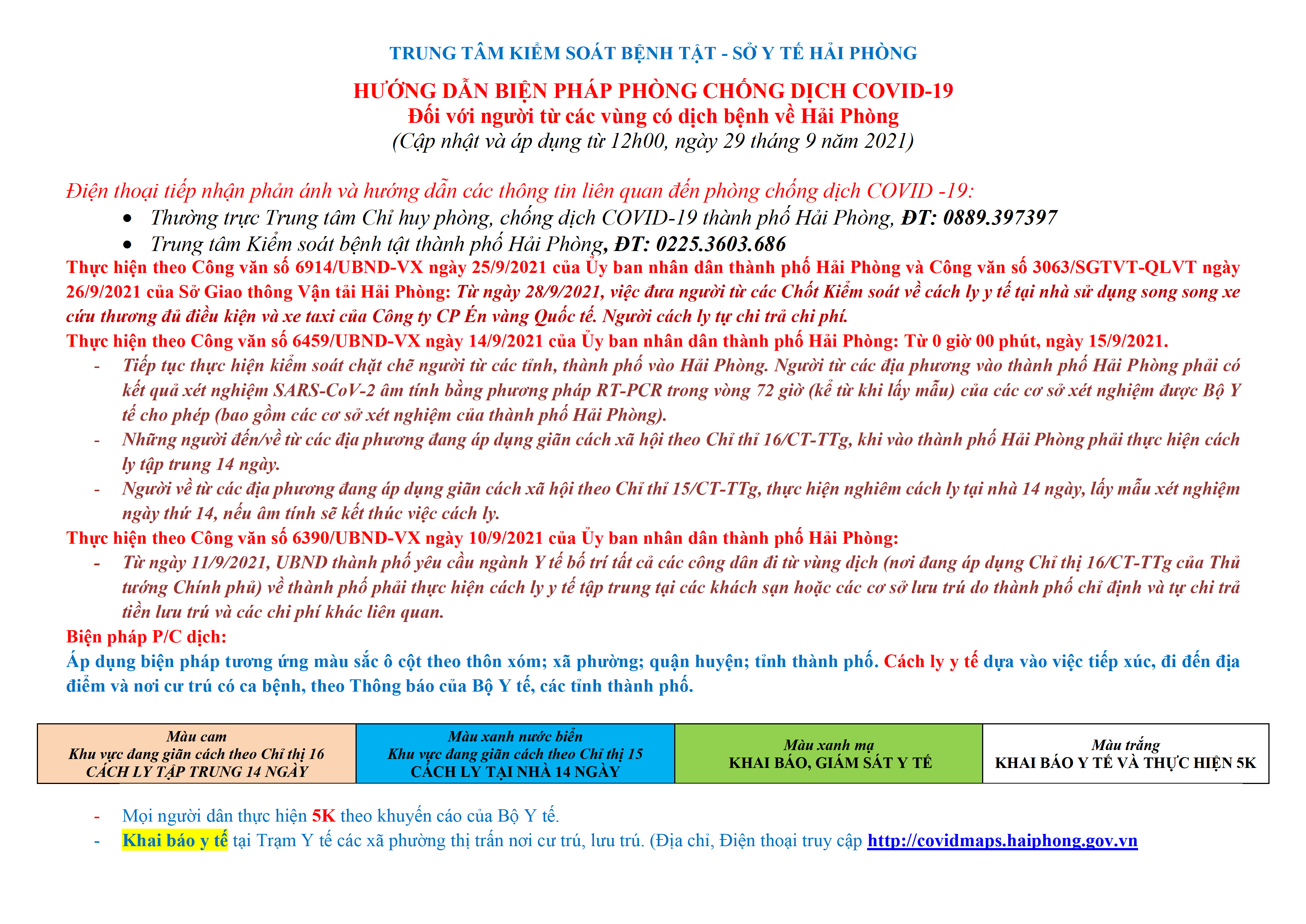CDC Hải Phòng ban hành hướng dẫn tạm thời biện pháp phòng chống dịch COVID-19 đối với người từ các tỉnh, thành khác về thành phố như sau (thông tin cập nhật vào 12h00’ ngày 29/9/2021):