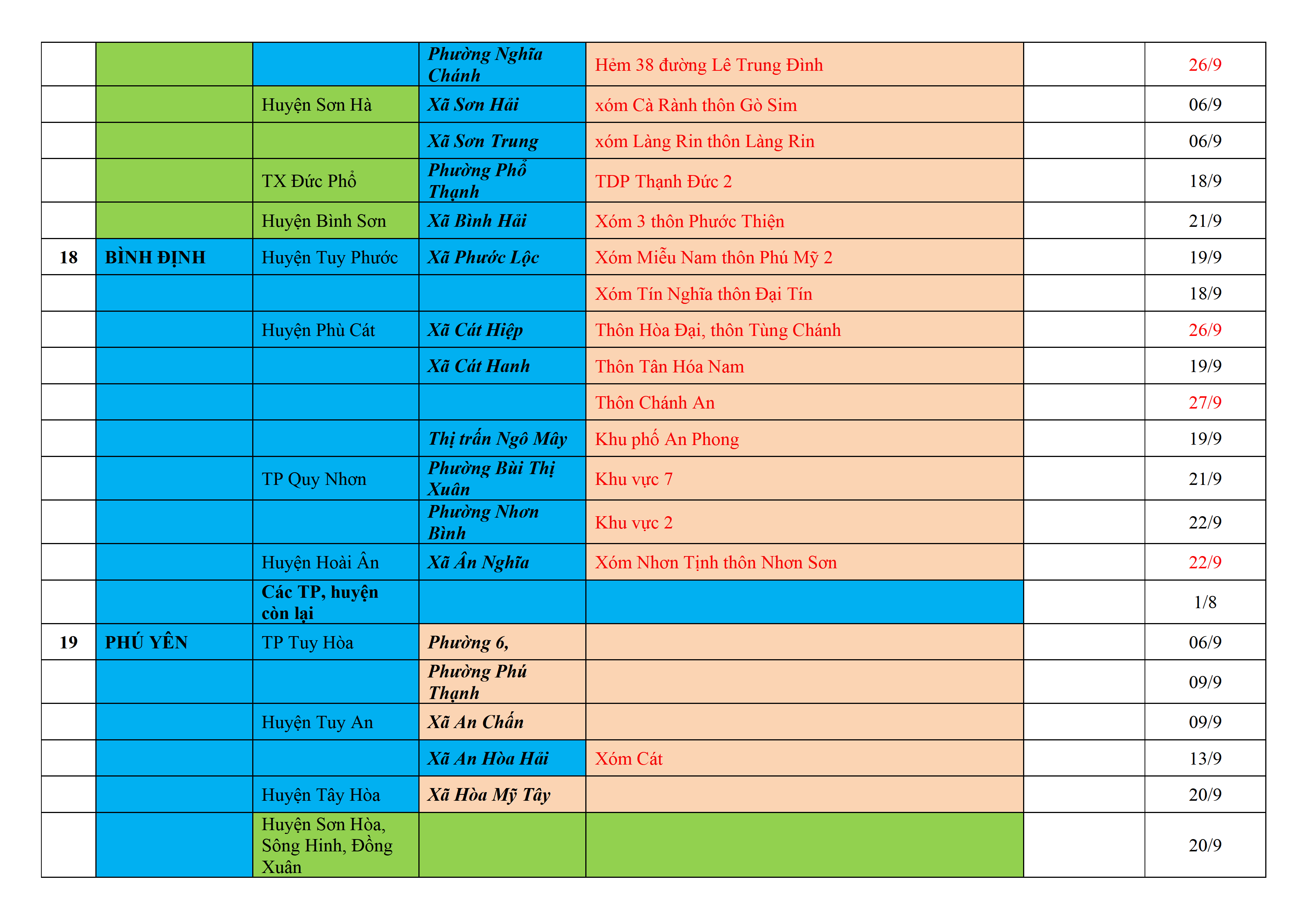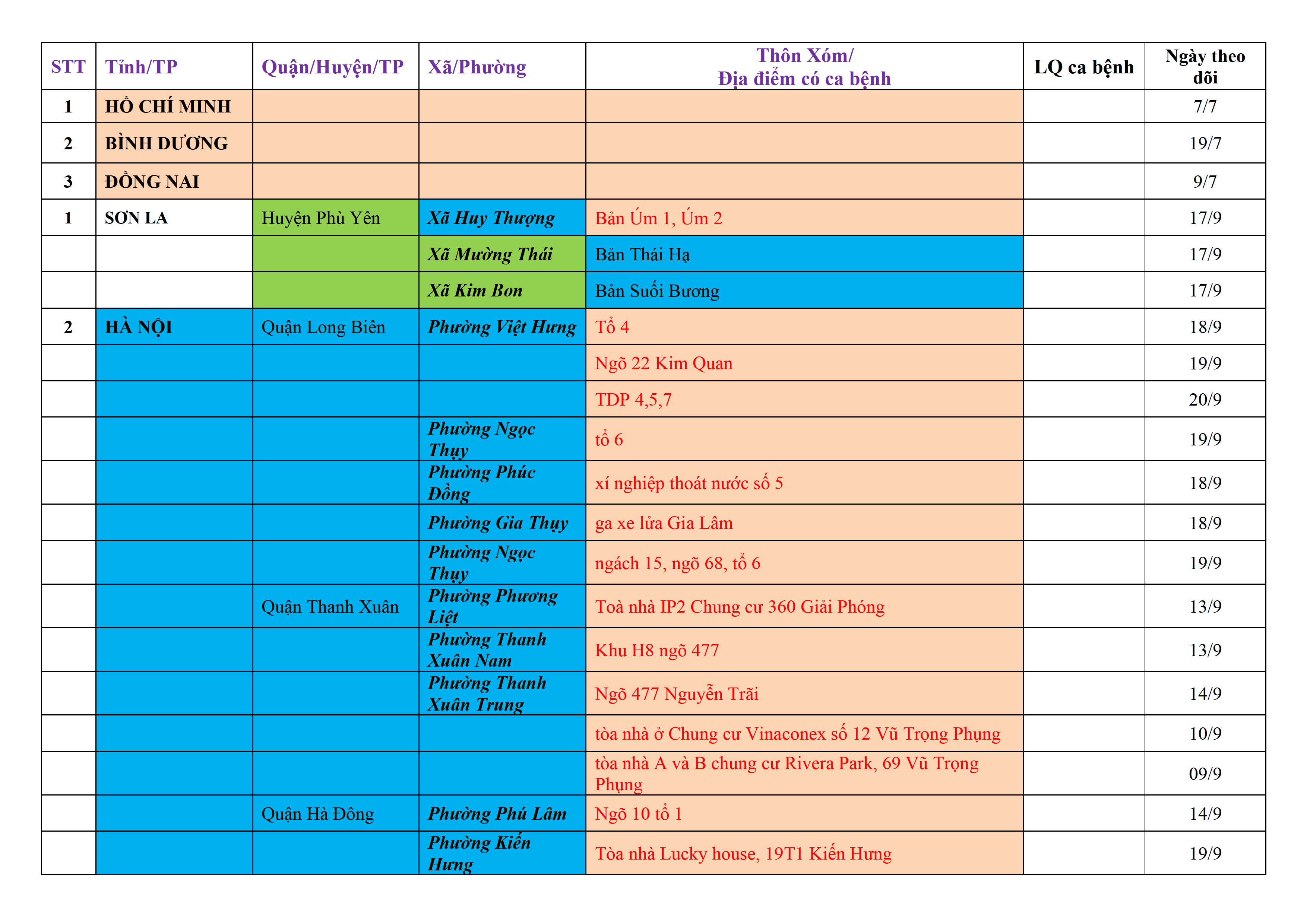 Biện pháp phòng chống dịch: Áp dụng biện pháp tương ứng màu sắc ô cột theo thôn xóm; xã phường; quận huyện; tỉnh thành phố. Cách ly y tế dựa vào việc tiếp xúc, đi đến địa điểm và nơi cư trú có ca bệnh, theo Thông báo của Bộ Y tế, các tỉnh thành phố.