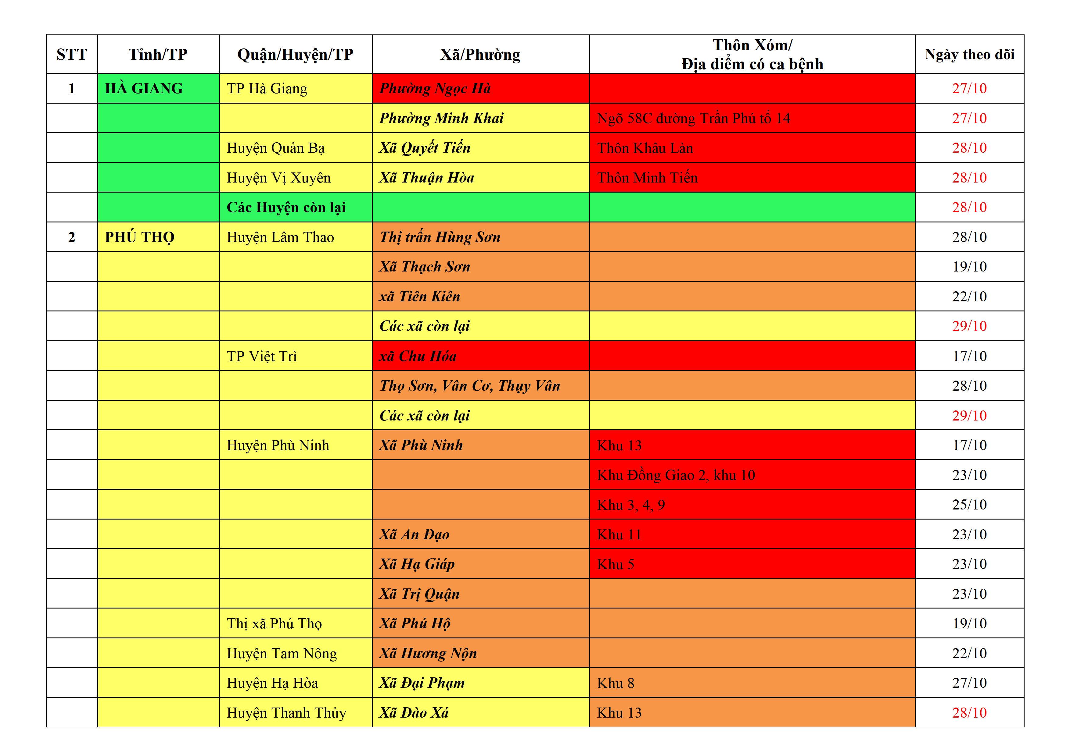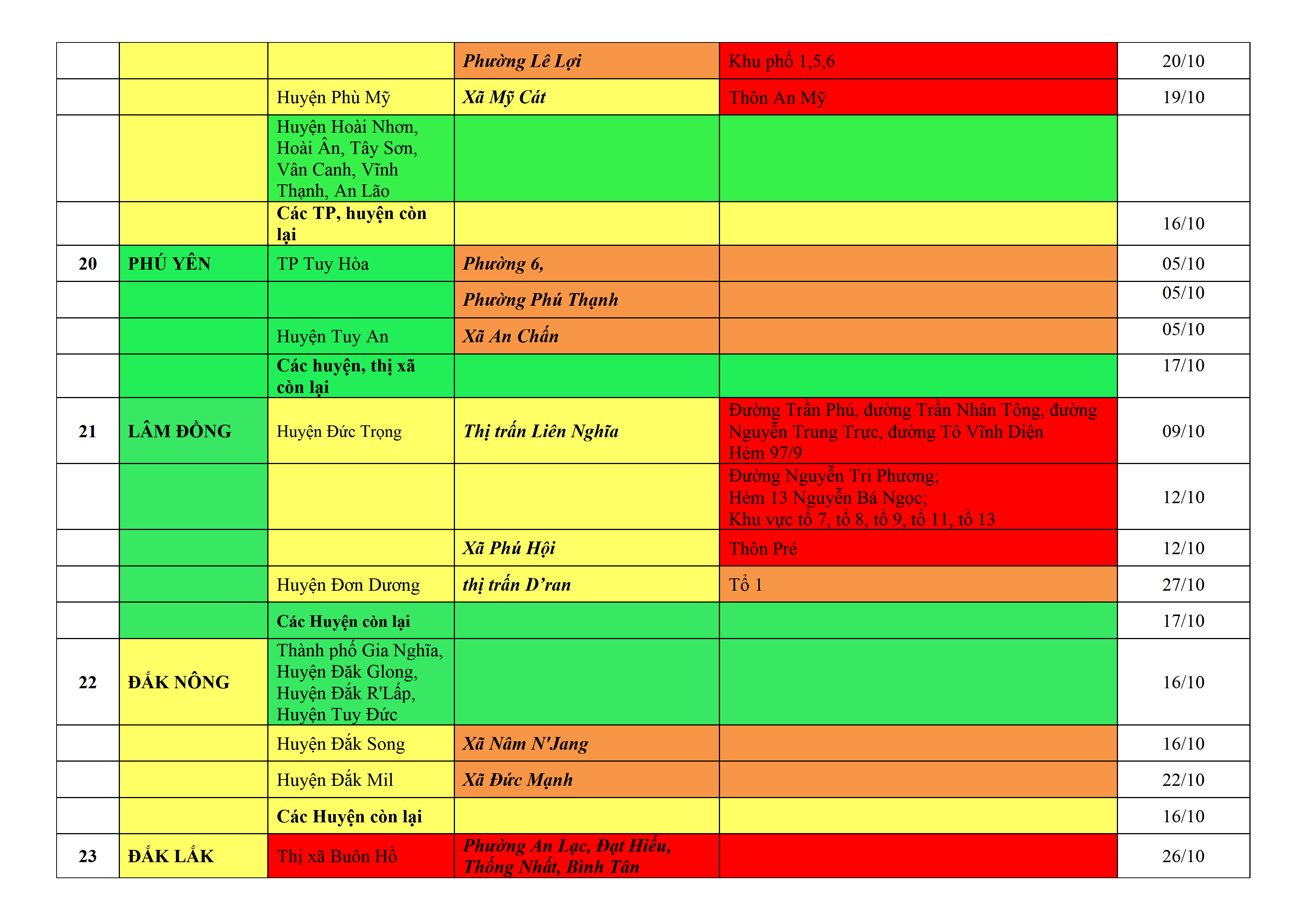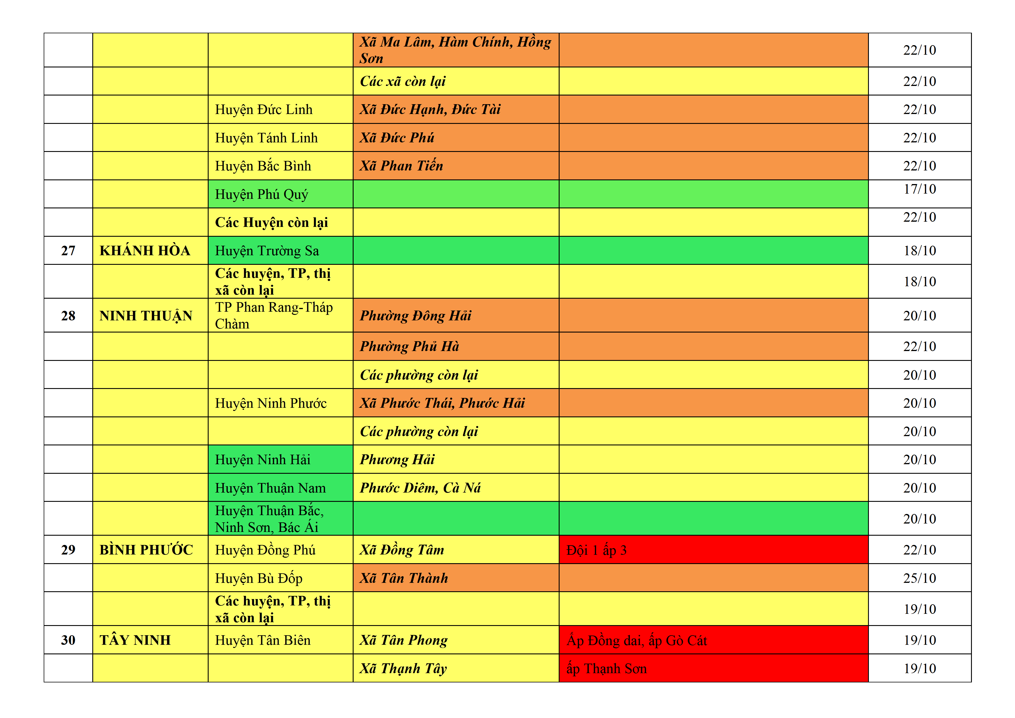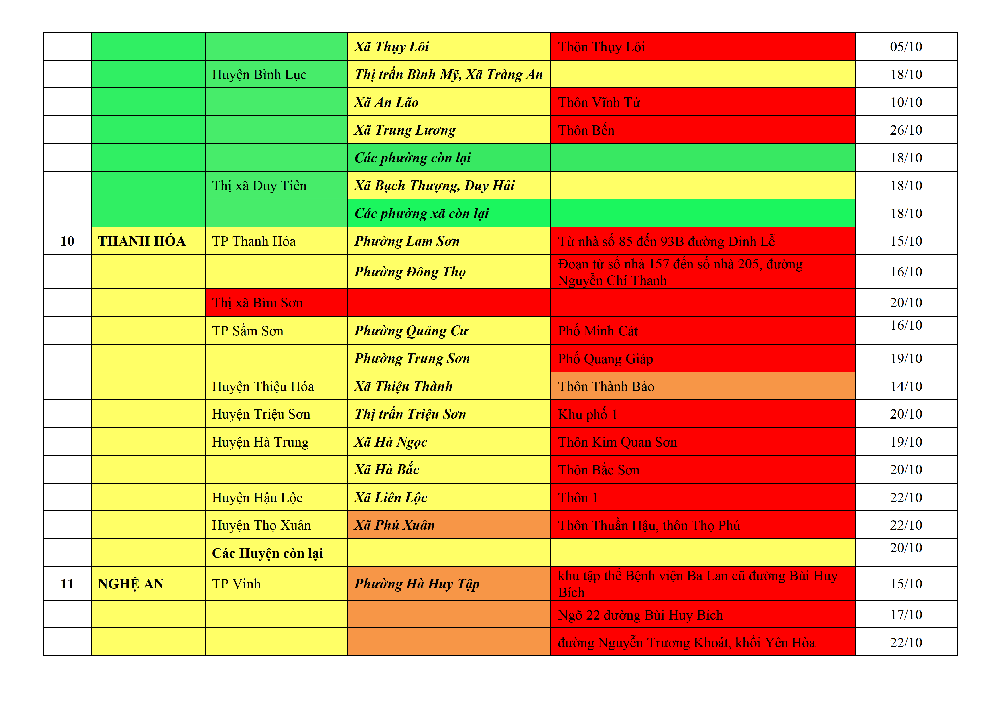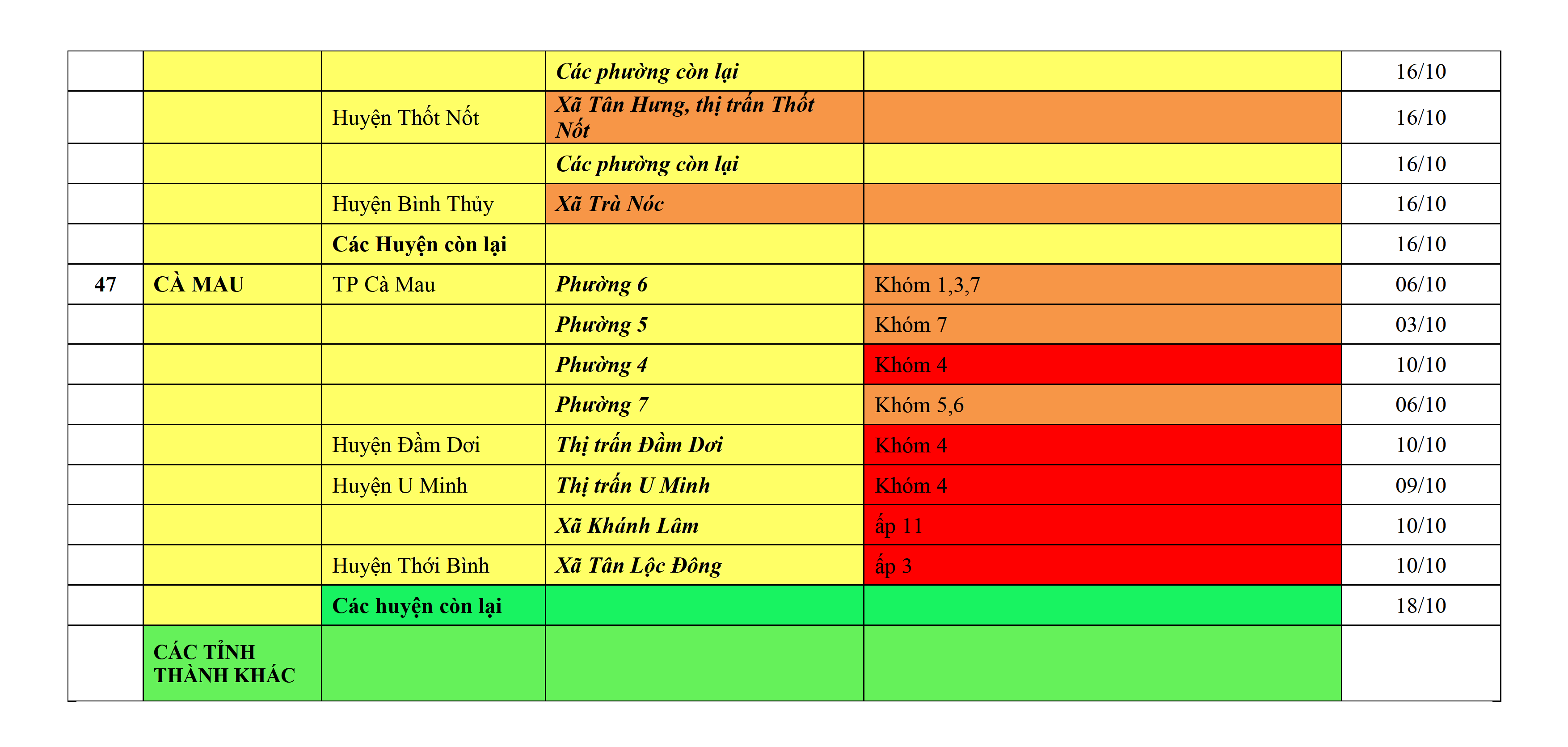 Lưu ý: Các tỉnh, thành phố không có tên trong bảng màu, đi lại bình thường, tuân thủ các biện pháp phòng chống dịch theo chỉ đạo của Bộ Y tế; khai báo y tế, thực hiện nghiêm 5K.