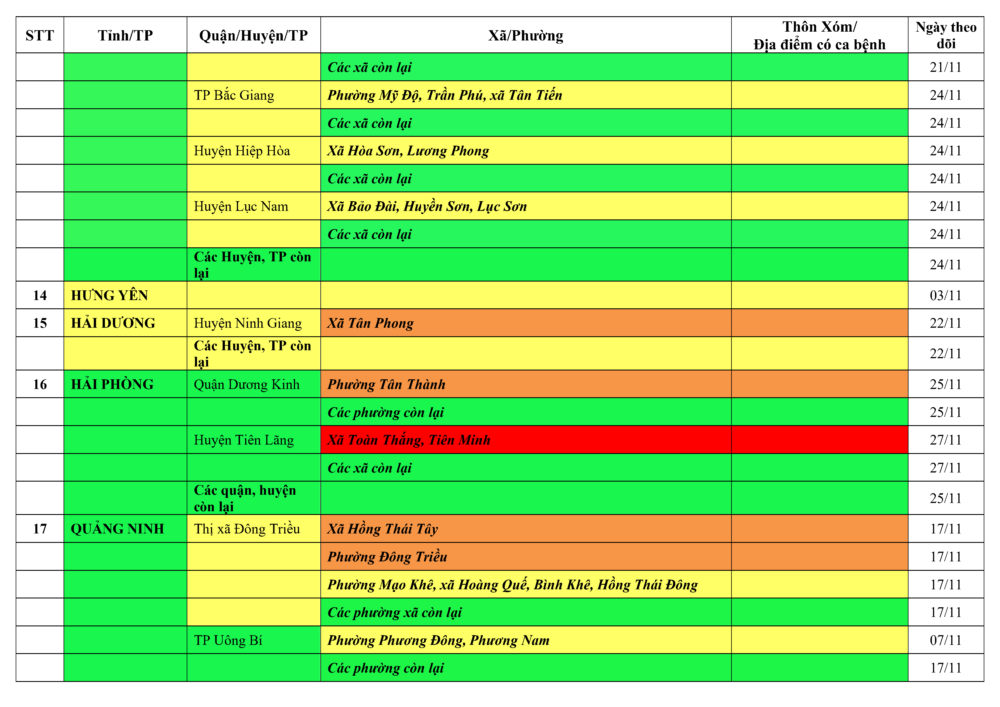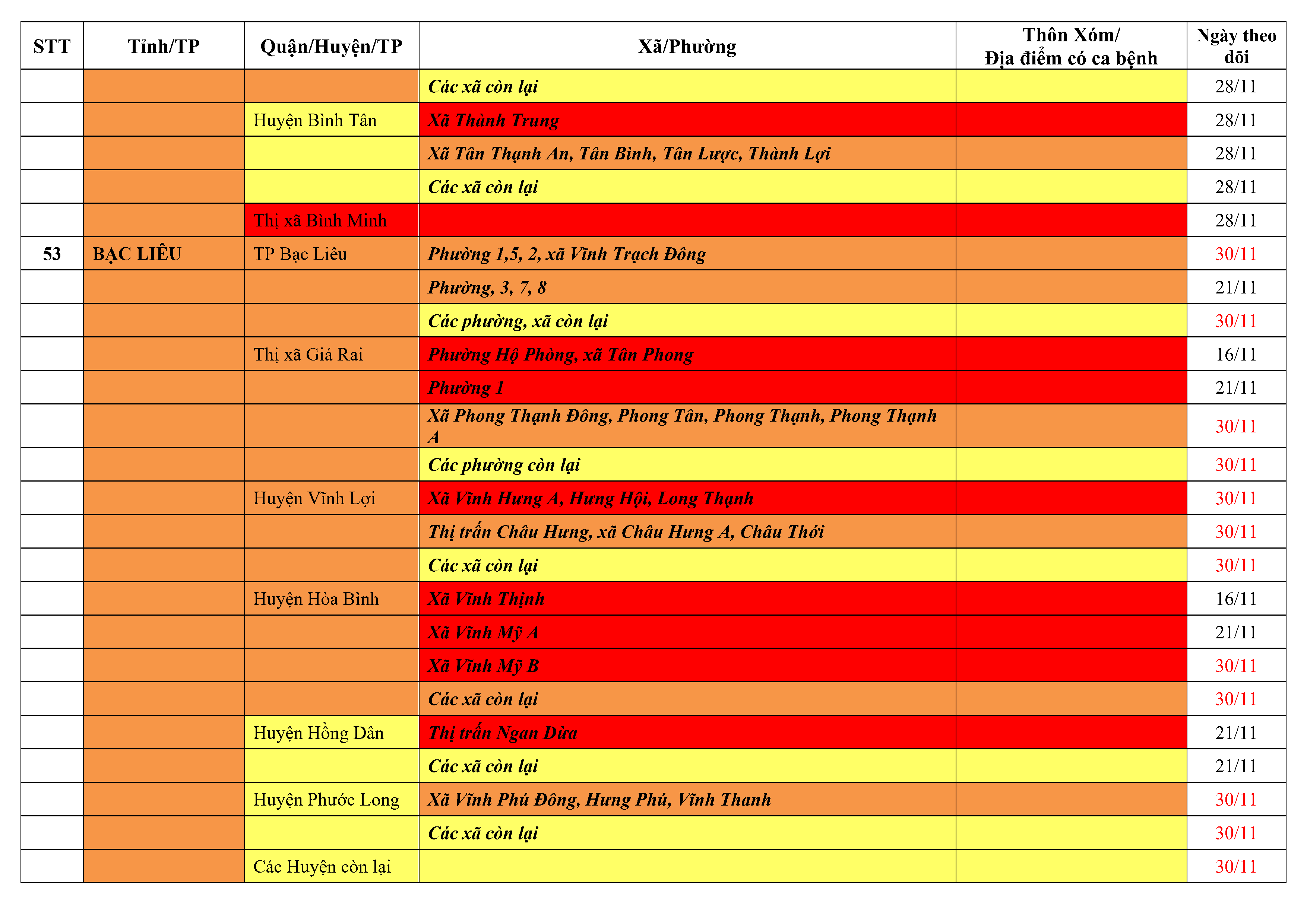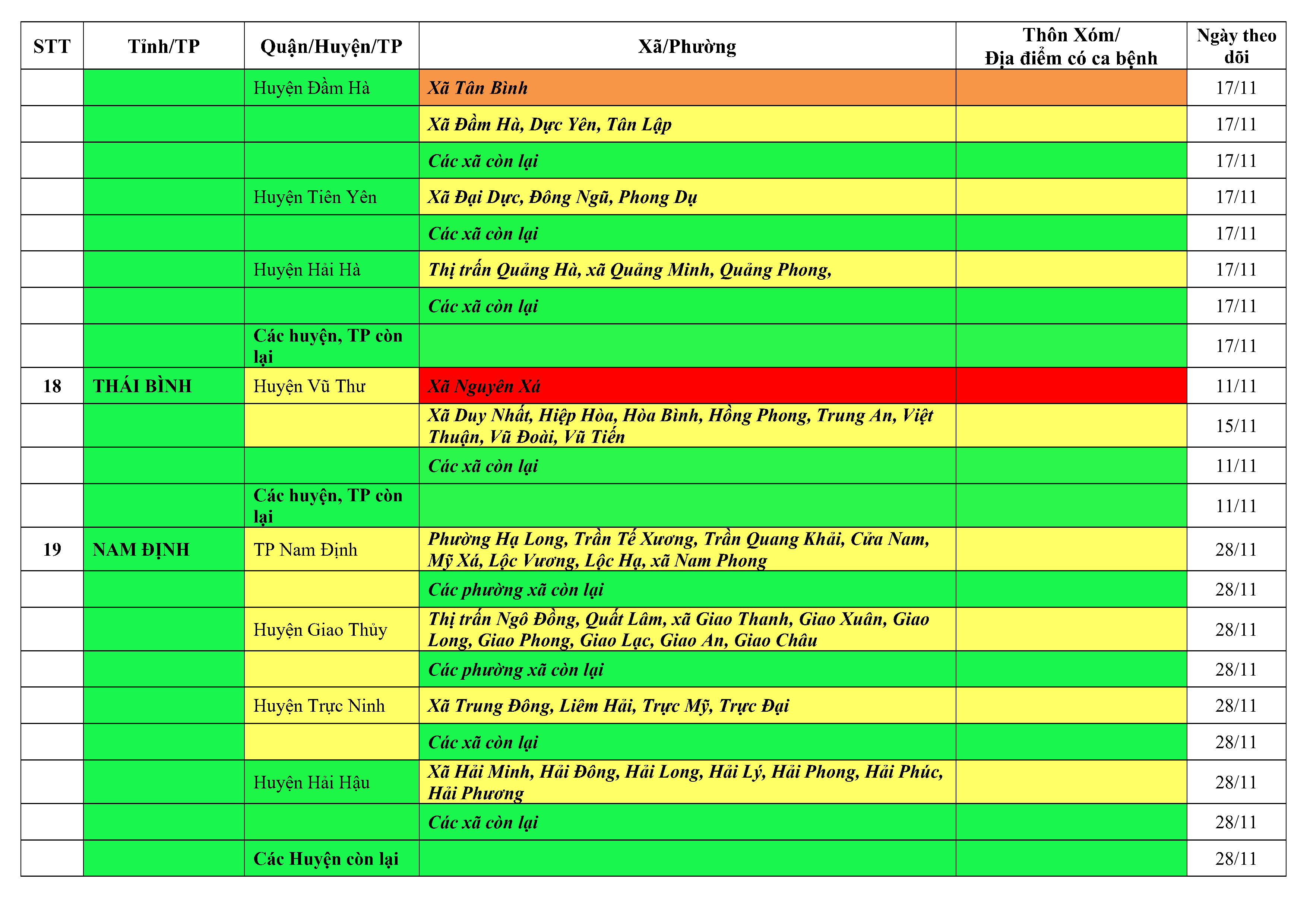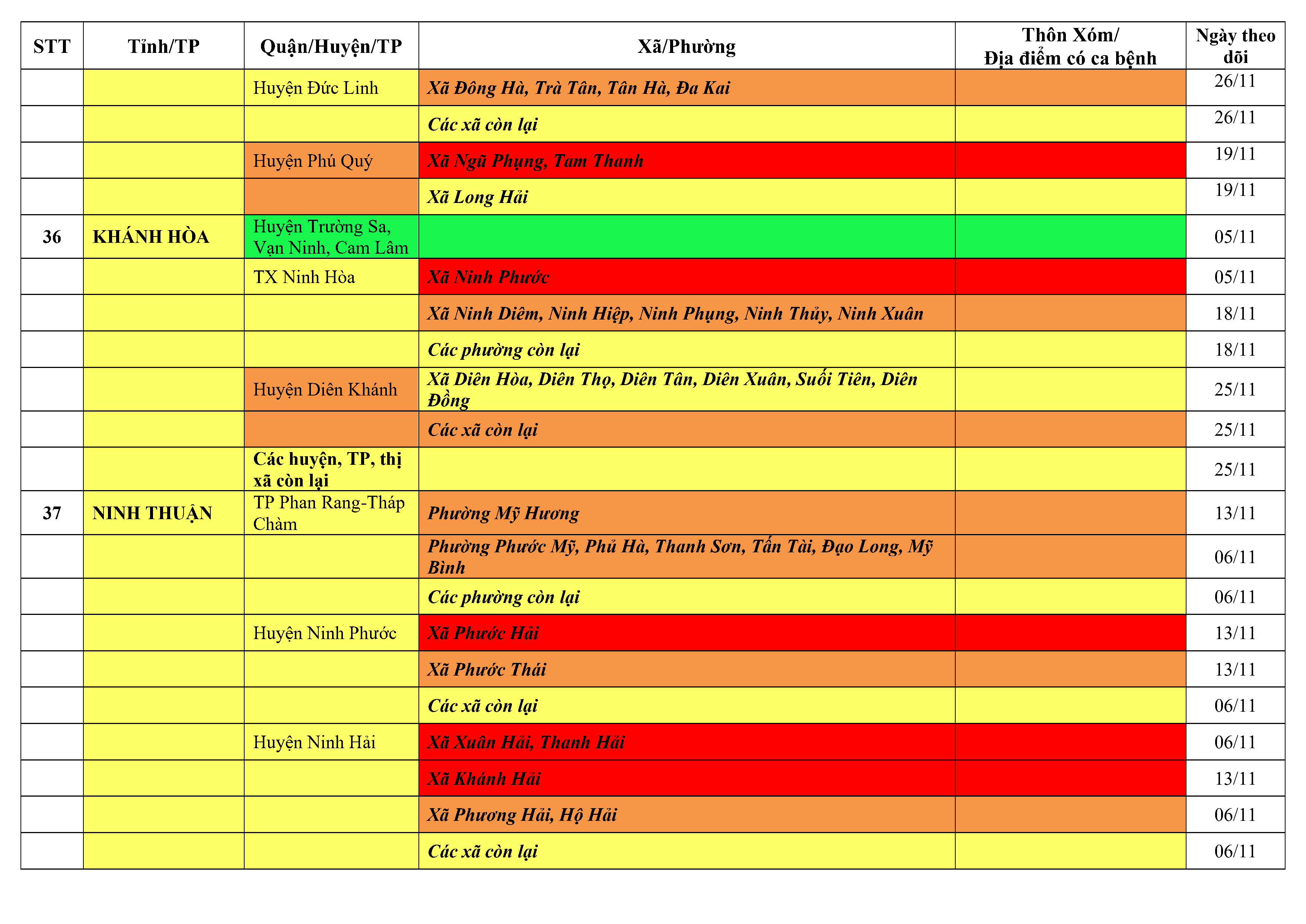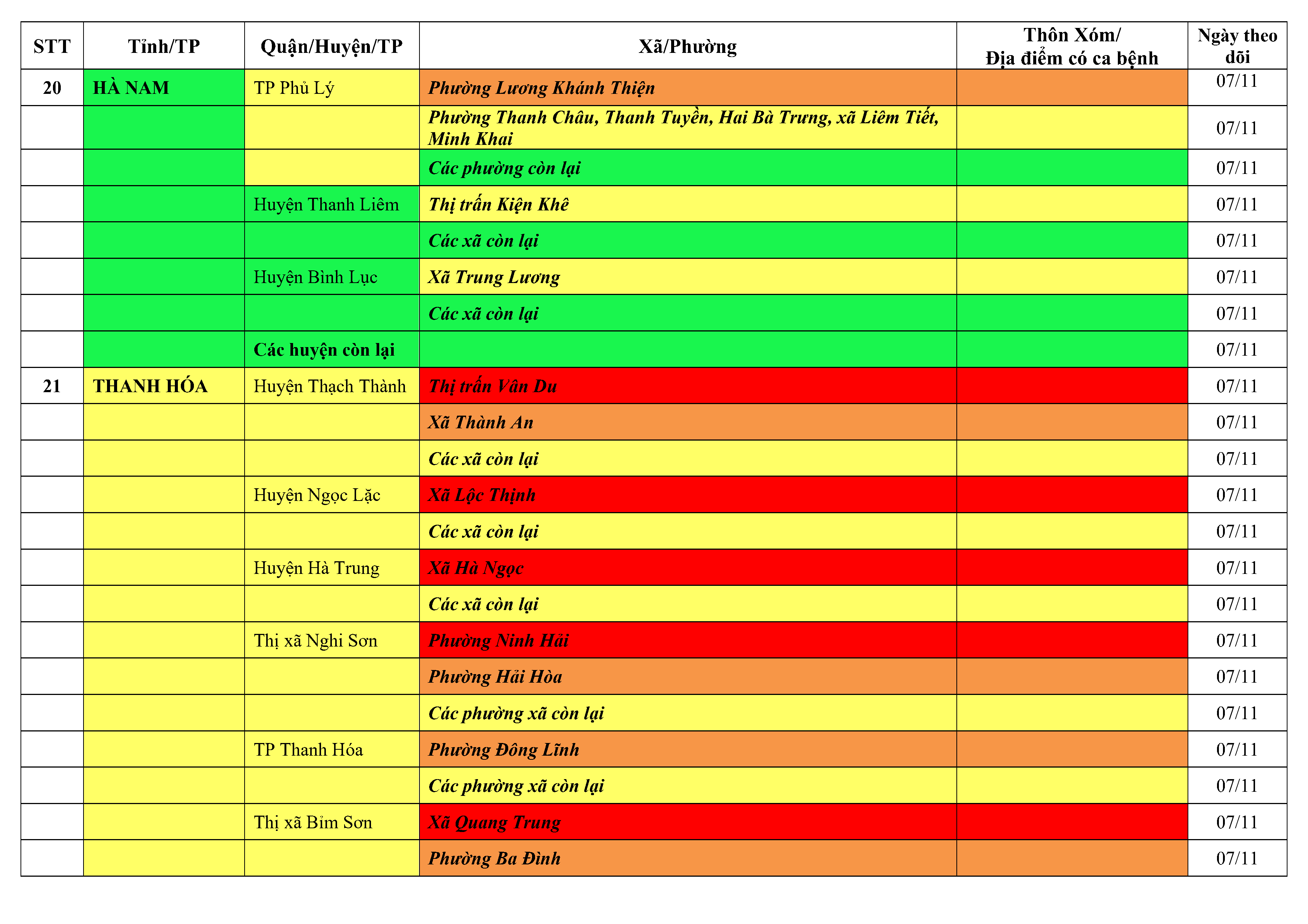 Lưu ý: Các tỉnh, thành phố không có tên trong bảng màu, đi lại bình thường, tuân thủ các biện pháp phòng chống dịch theo chỉ đạo của Bộ Y tế; khai báo y tế, thực hiện nghiêm 5K.
