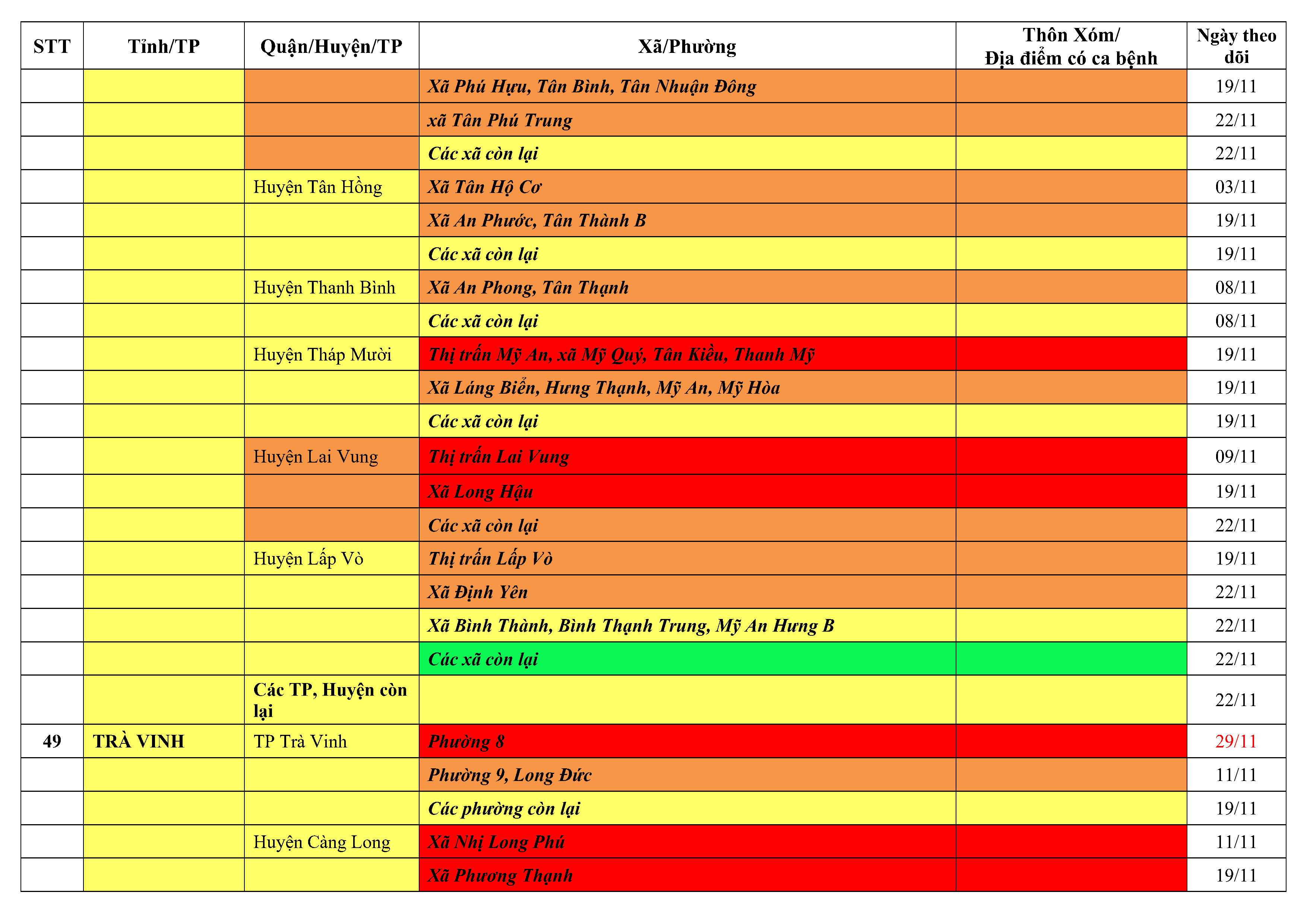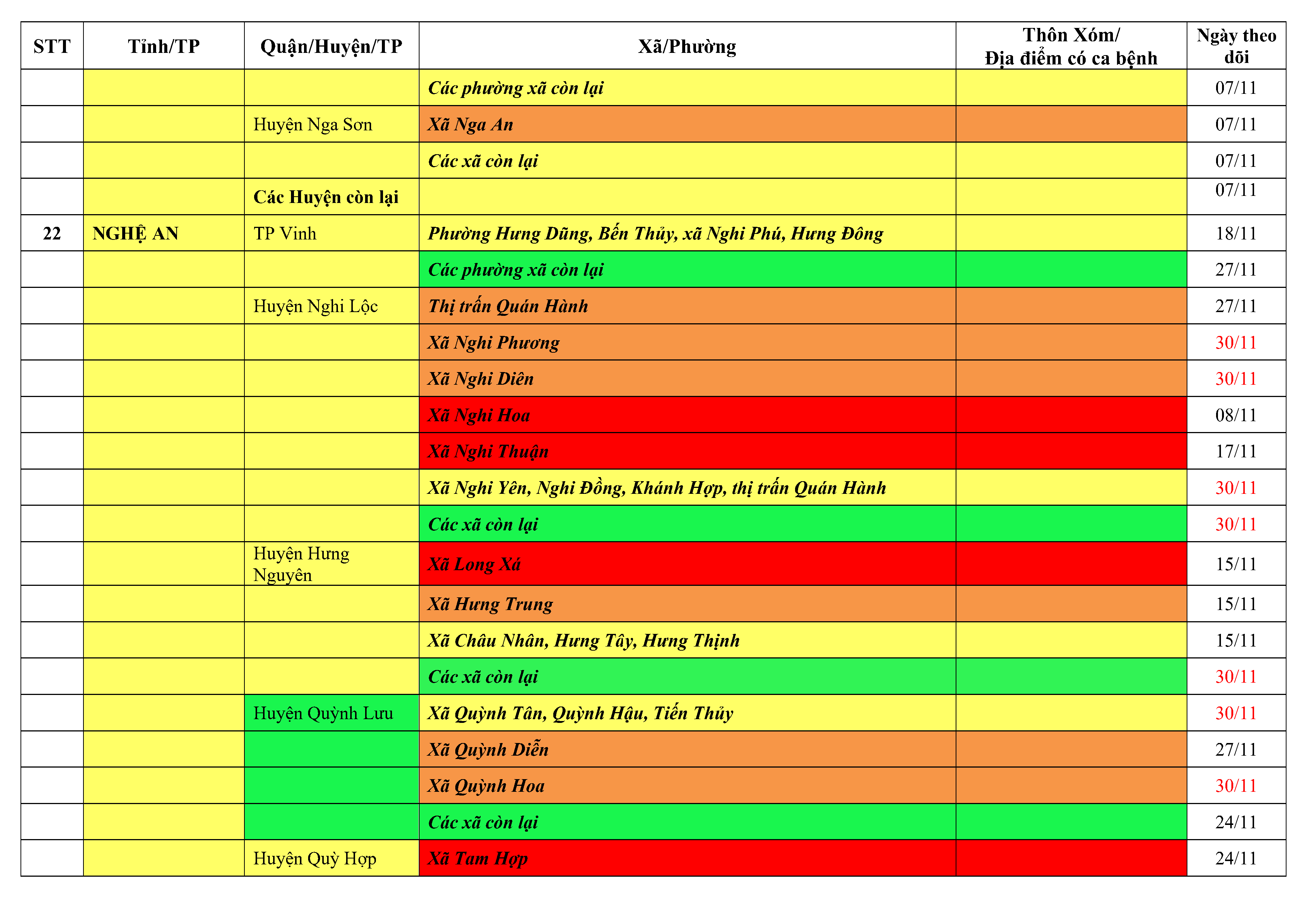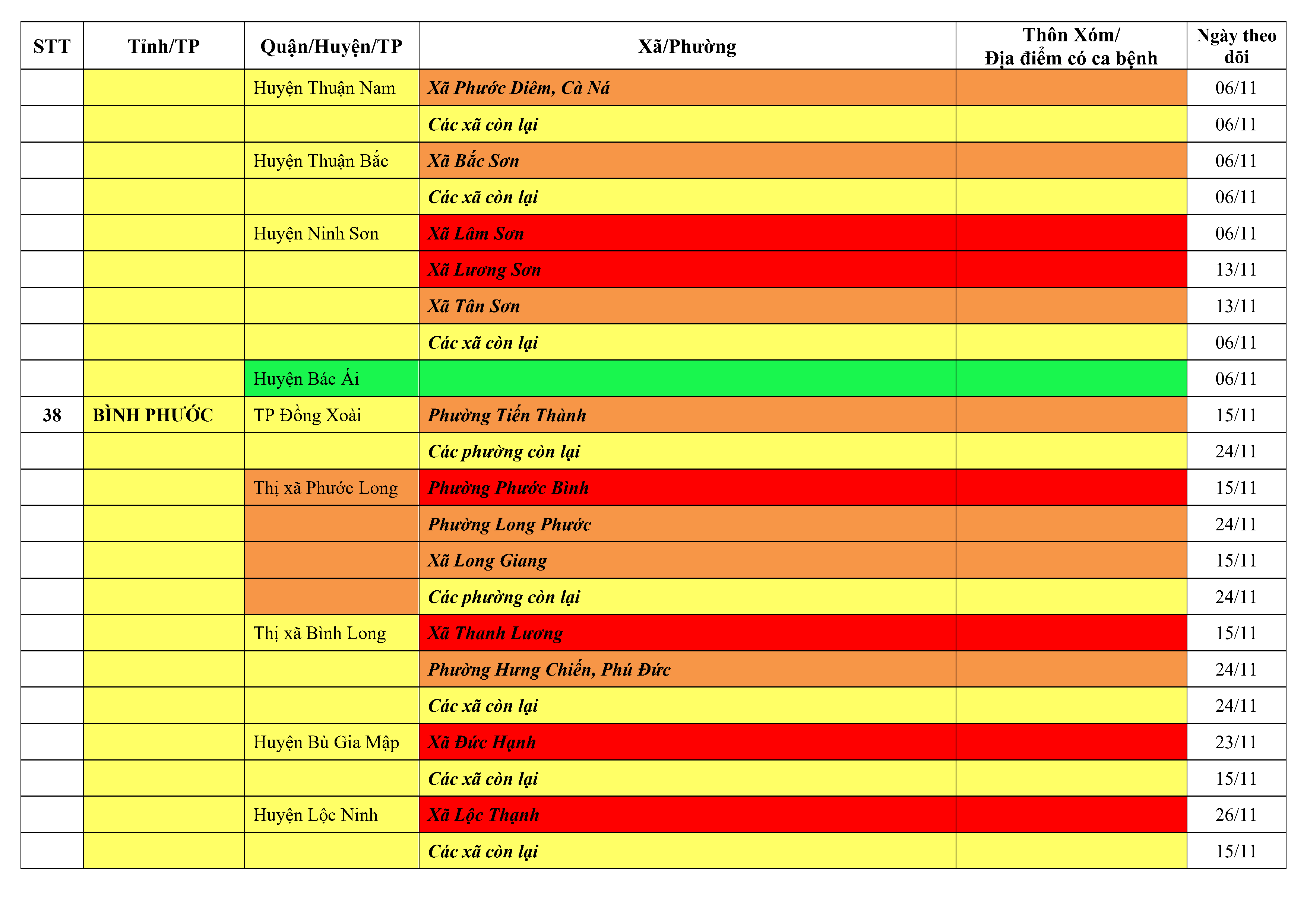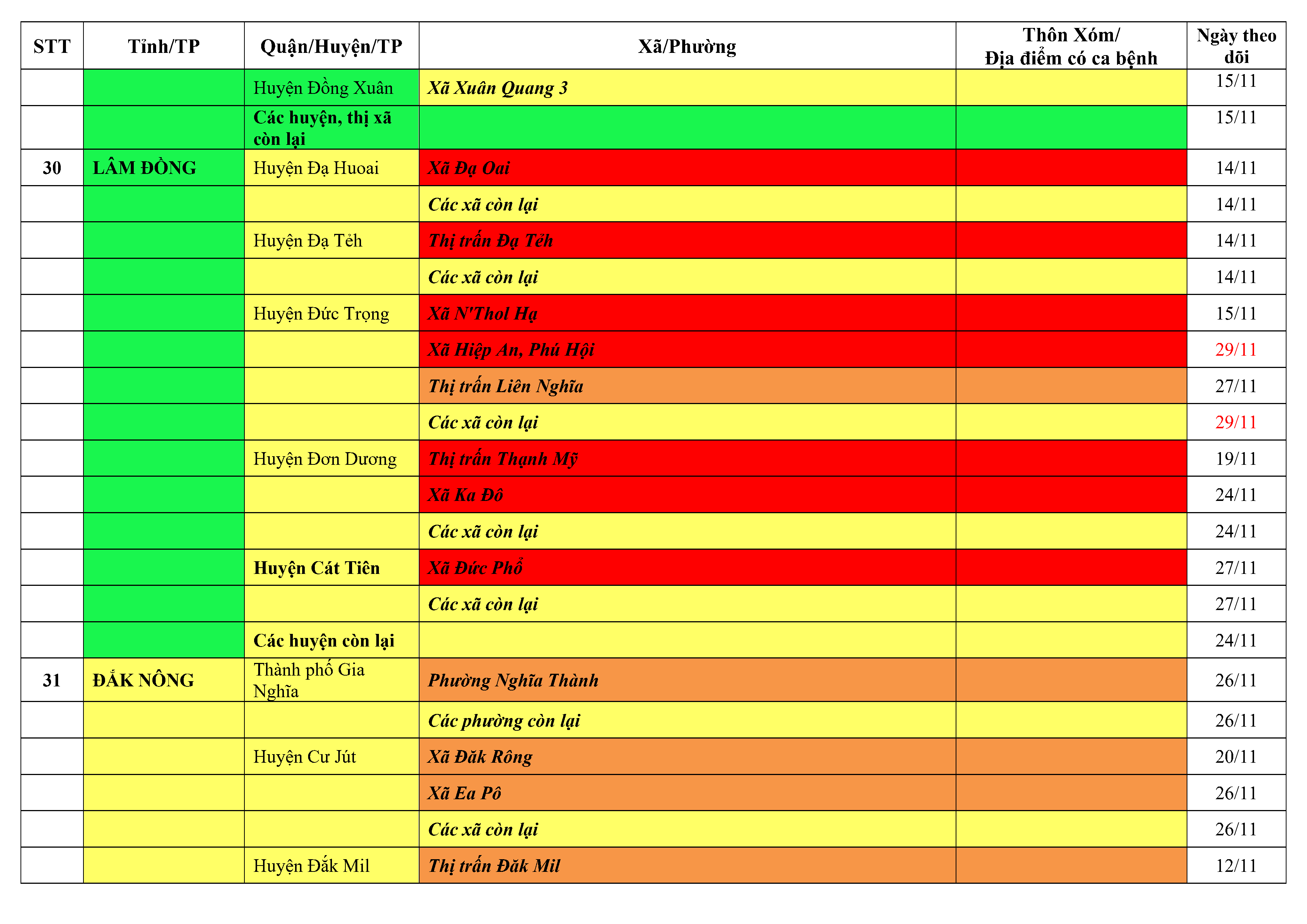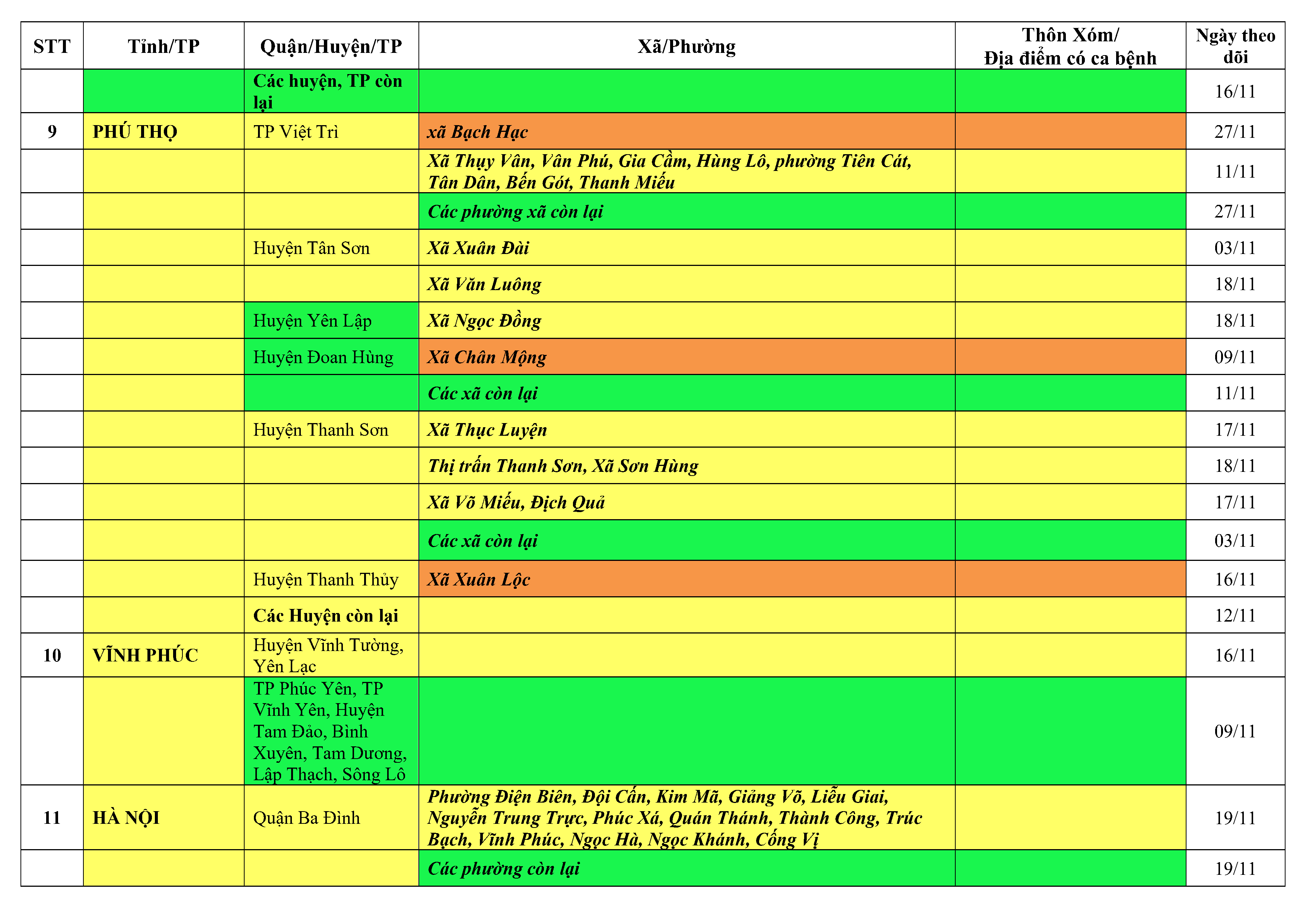 Lưu ý: Các tỉnh, thành phố không có tên trong bảng màu, đi lại bình thường, tuân thủ các biện pháp phòng chống dịch theo chỉ đạo của Bộ Y tế; khai báo y tế, thực hiện nghiêm 5K.