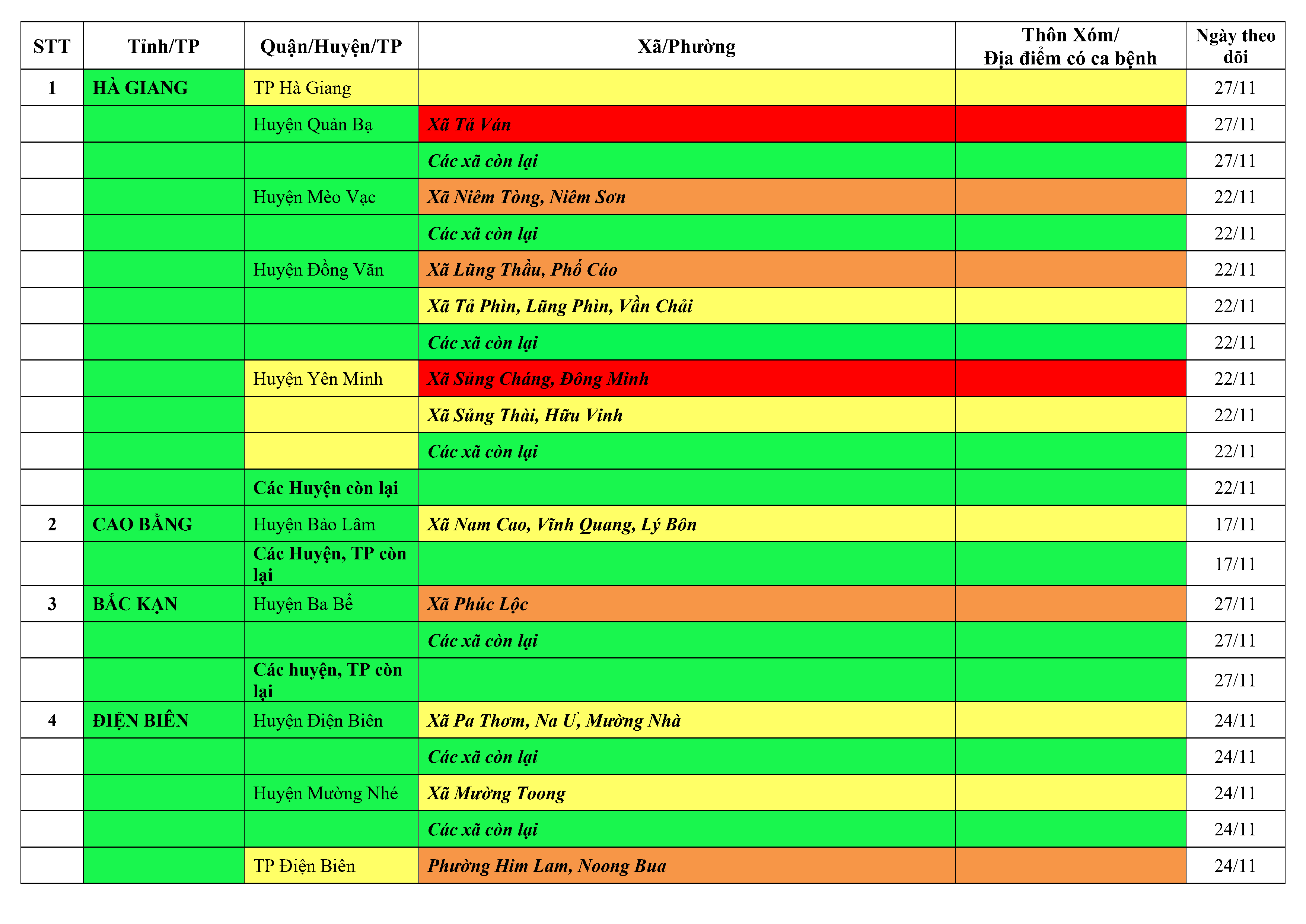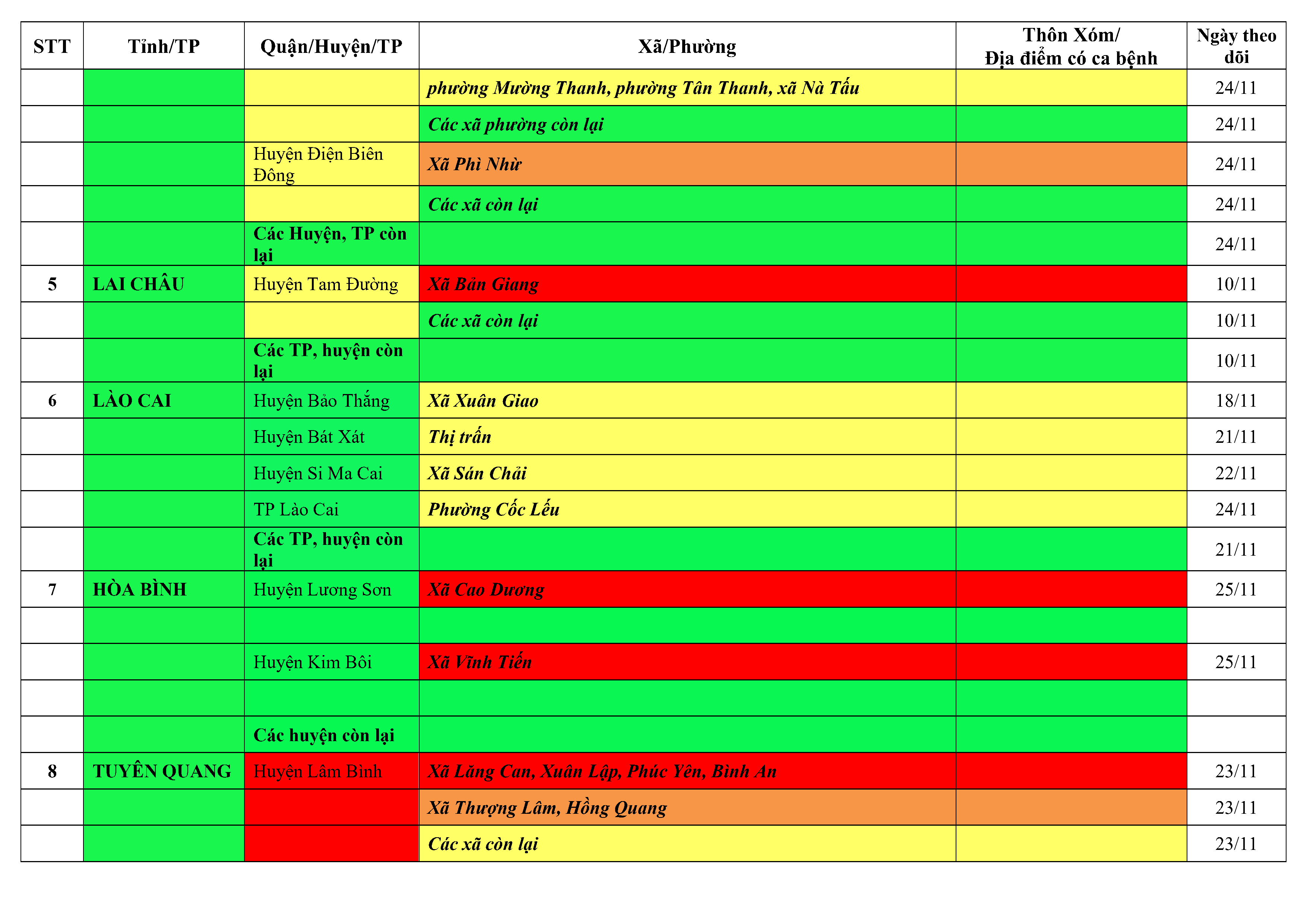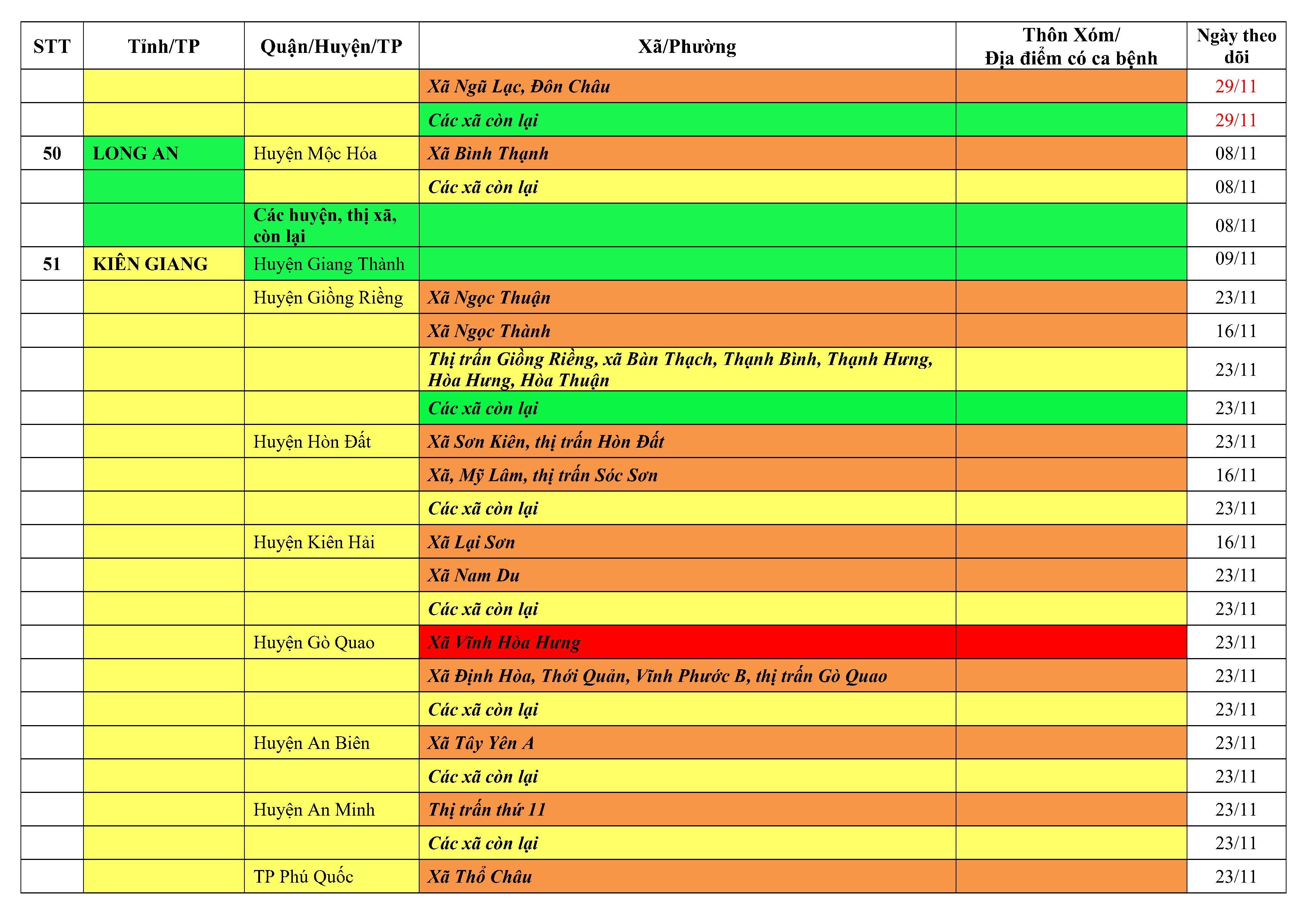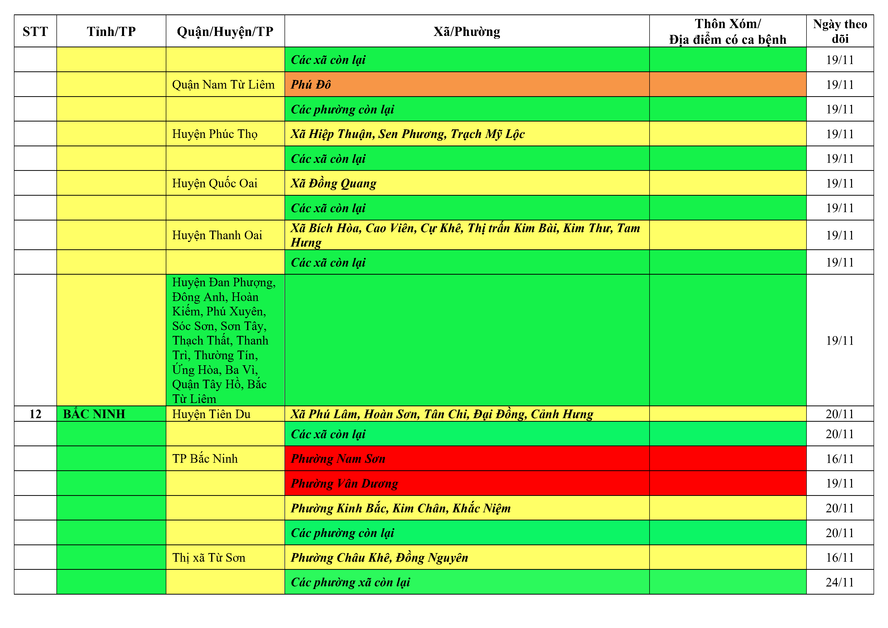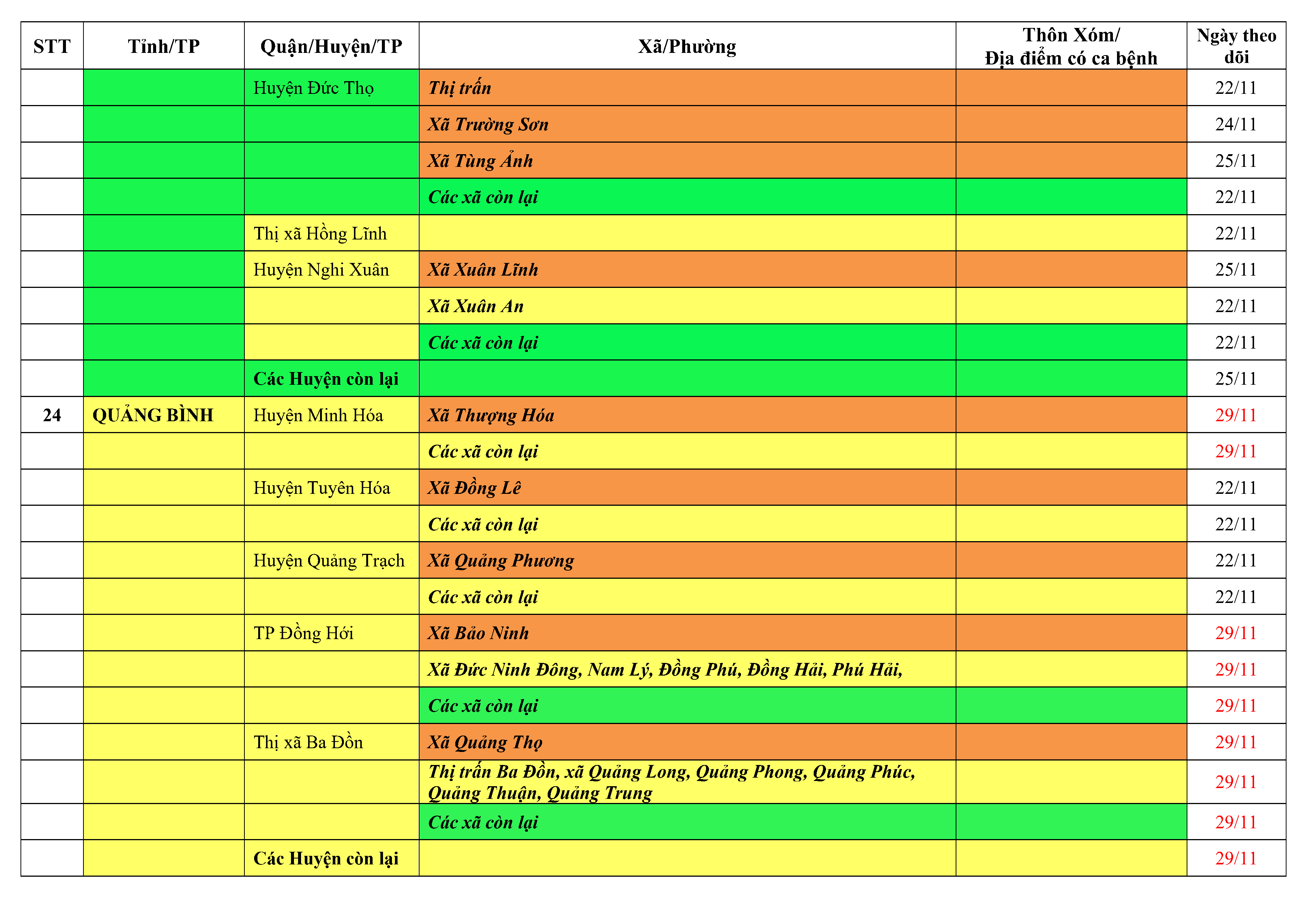 Lưu ý: Các tỉnh, thành phố không có tên trong bảng màu, đi lại bình thường, tuân thủ các biện pháp phòng chống dịch theo chỉ đạo của Bộ Y tế; khai báo y tế, thực hiện nghiêm 5K.