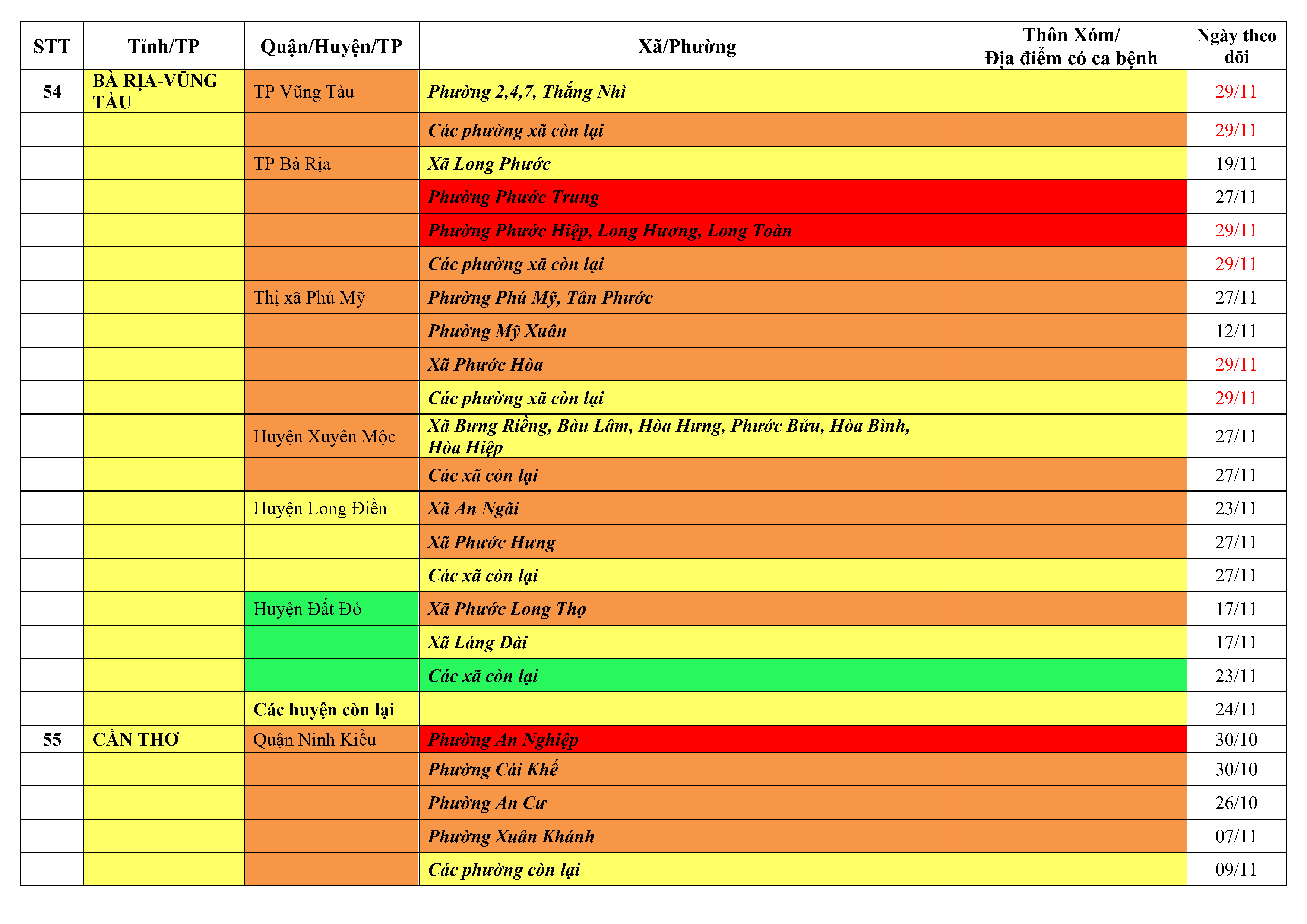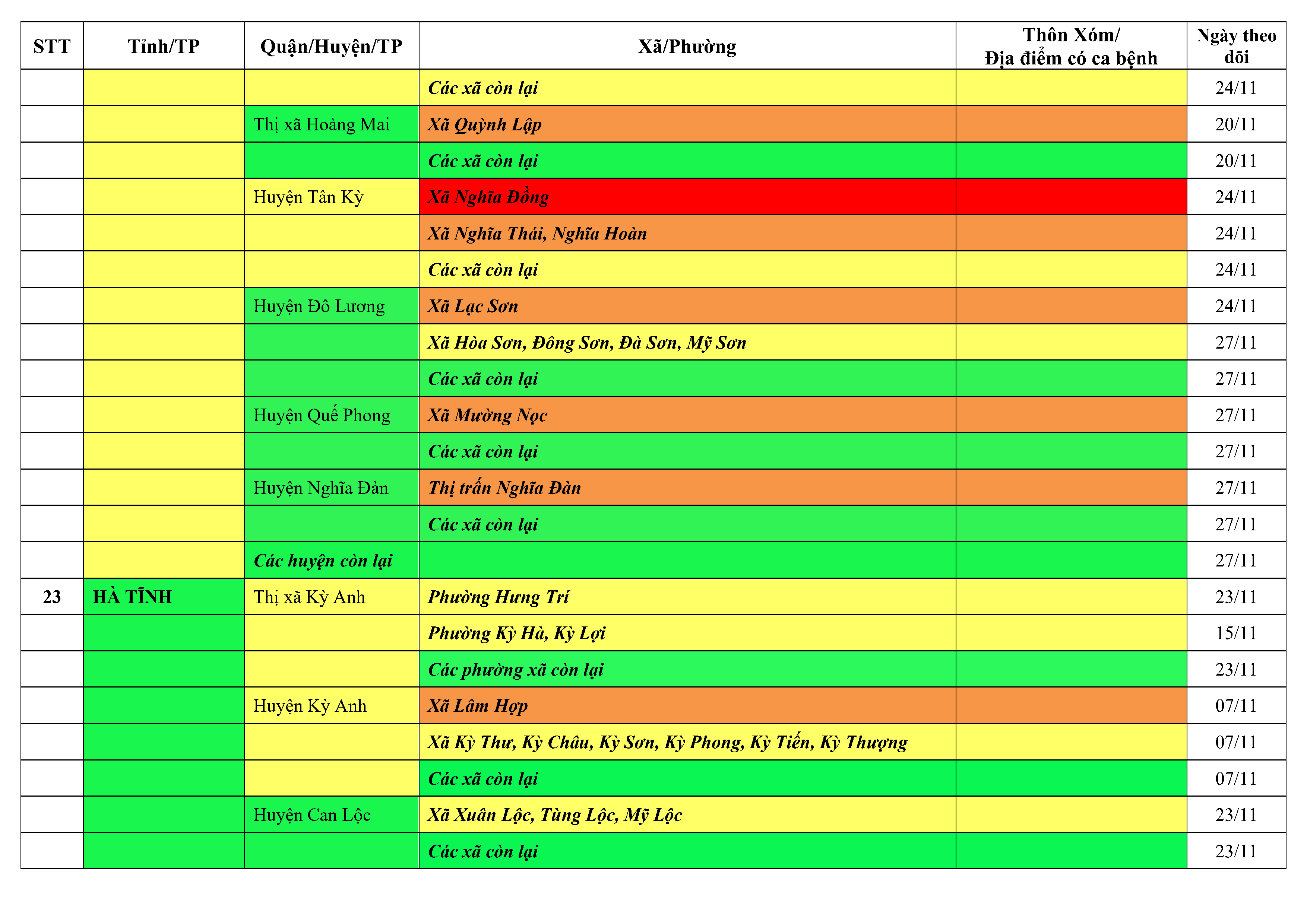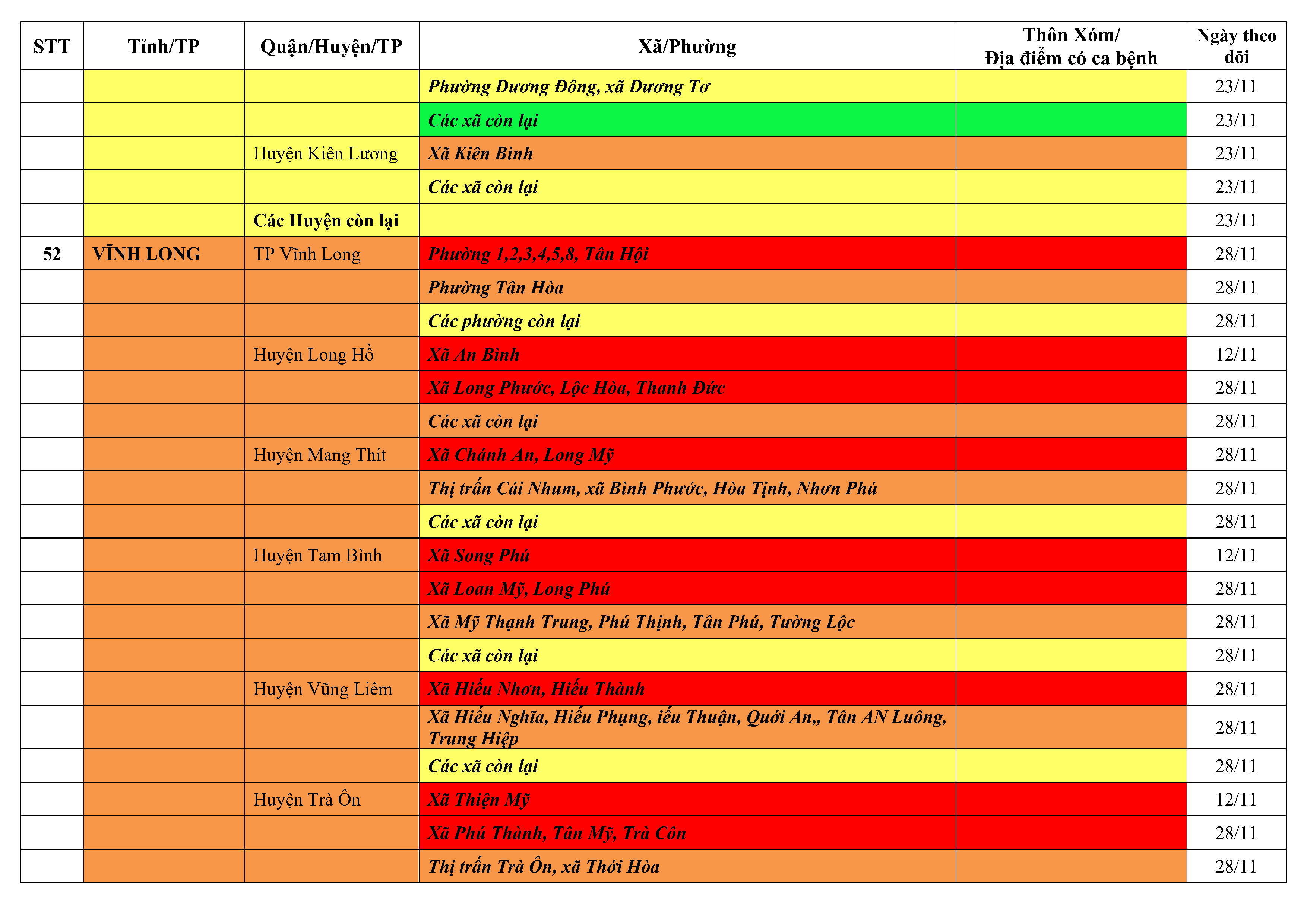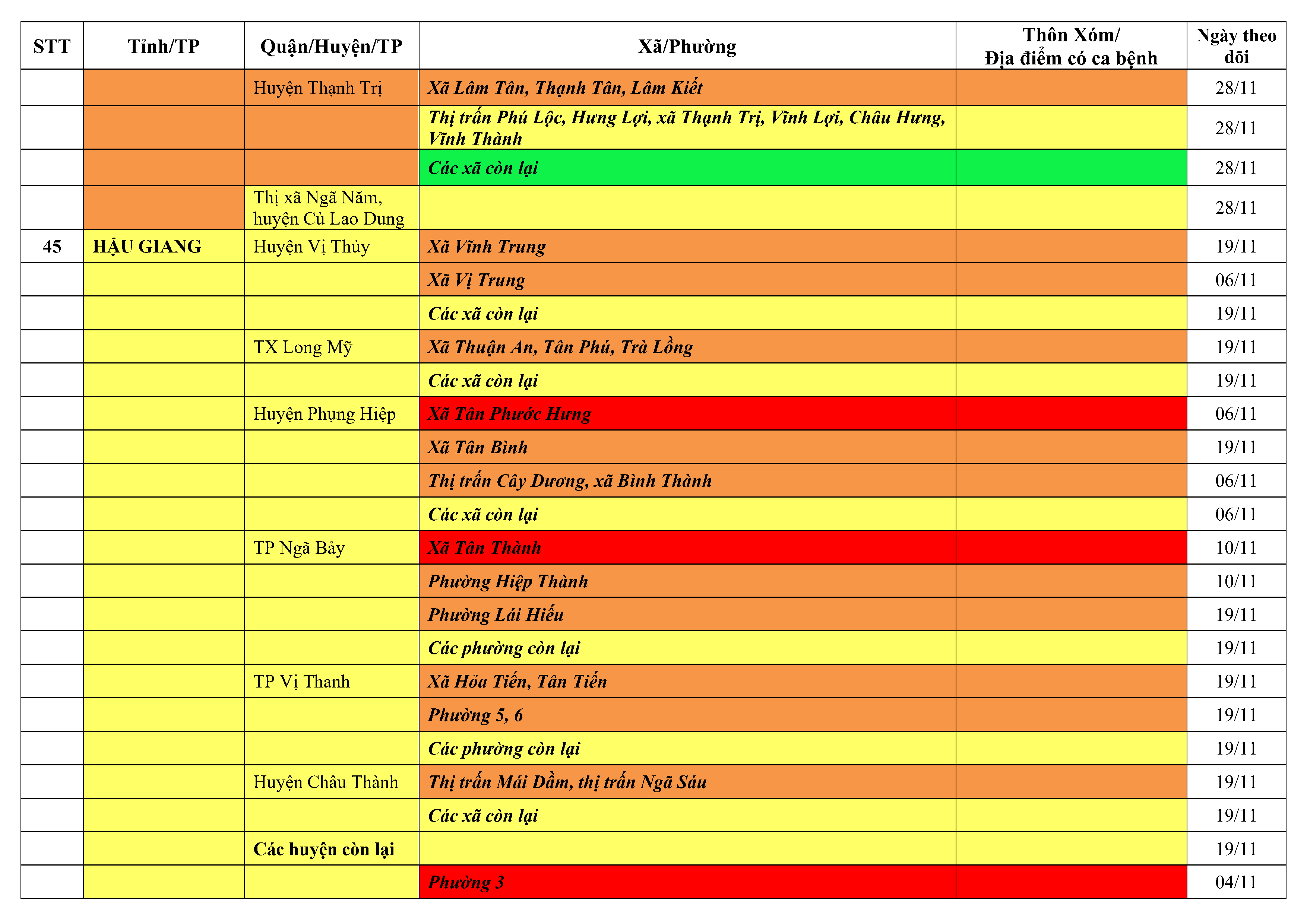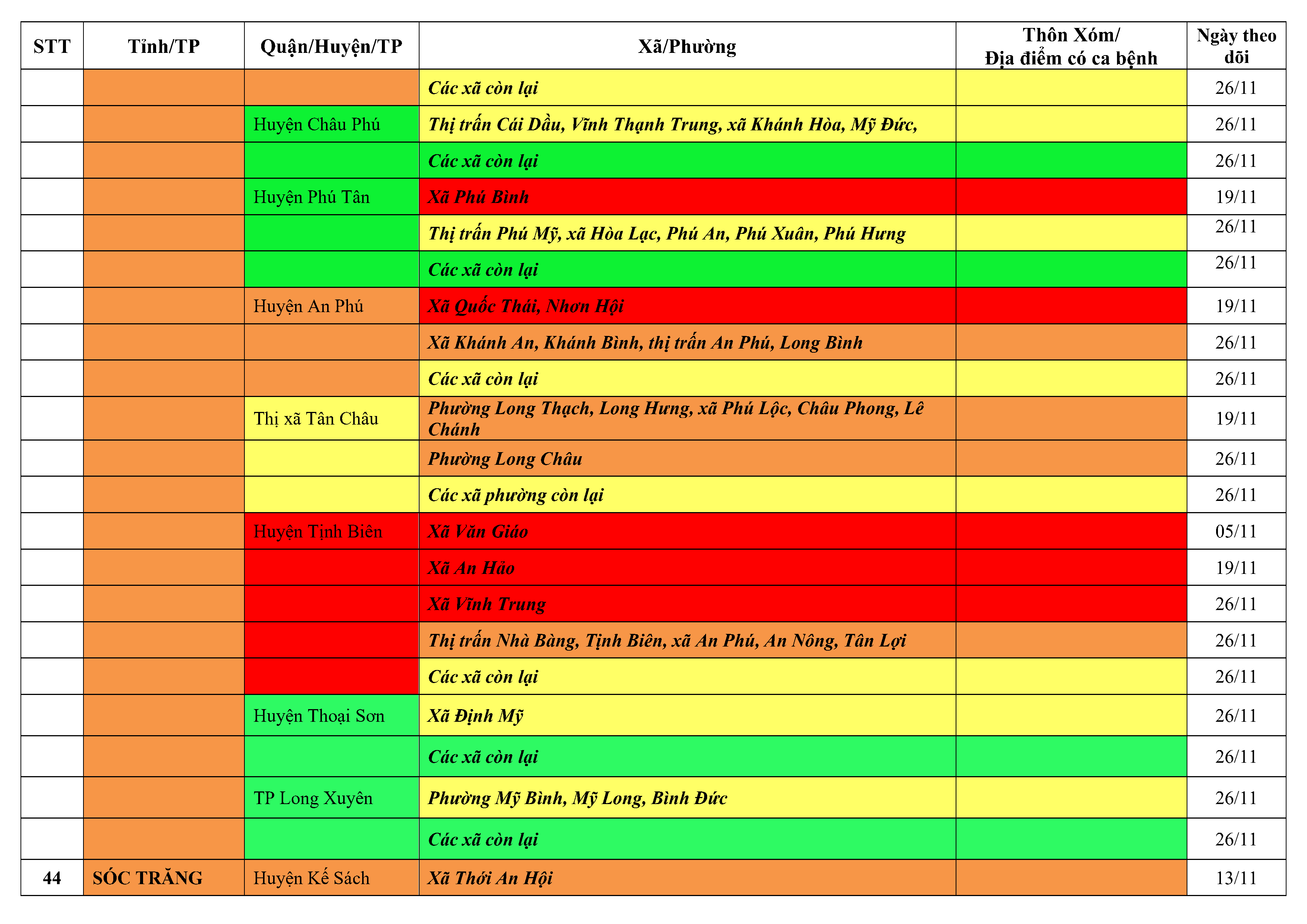Lưu ý: Các tỉnh, thành phố không có tên trong bảng màu, đi lại bình thường, tuân thủ các biện pháp phòng chống dịch theo chỉ đạo của Bộ Y tế; khai báo y tế, thực hiện nghiêm 5K.