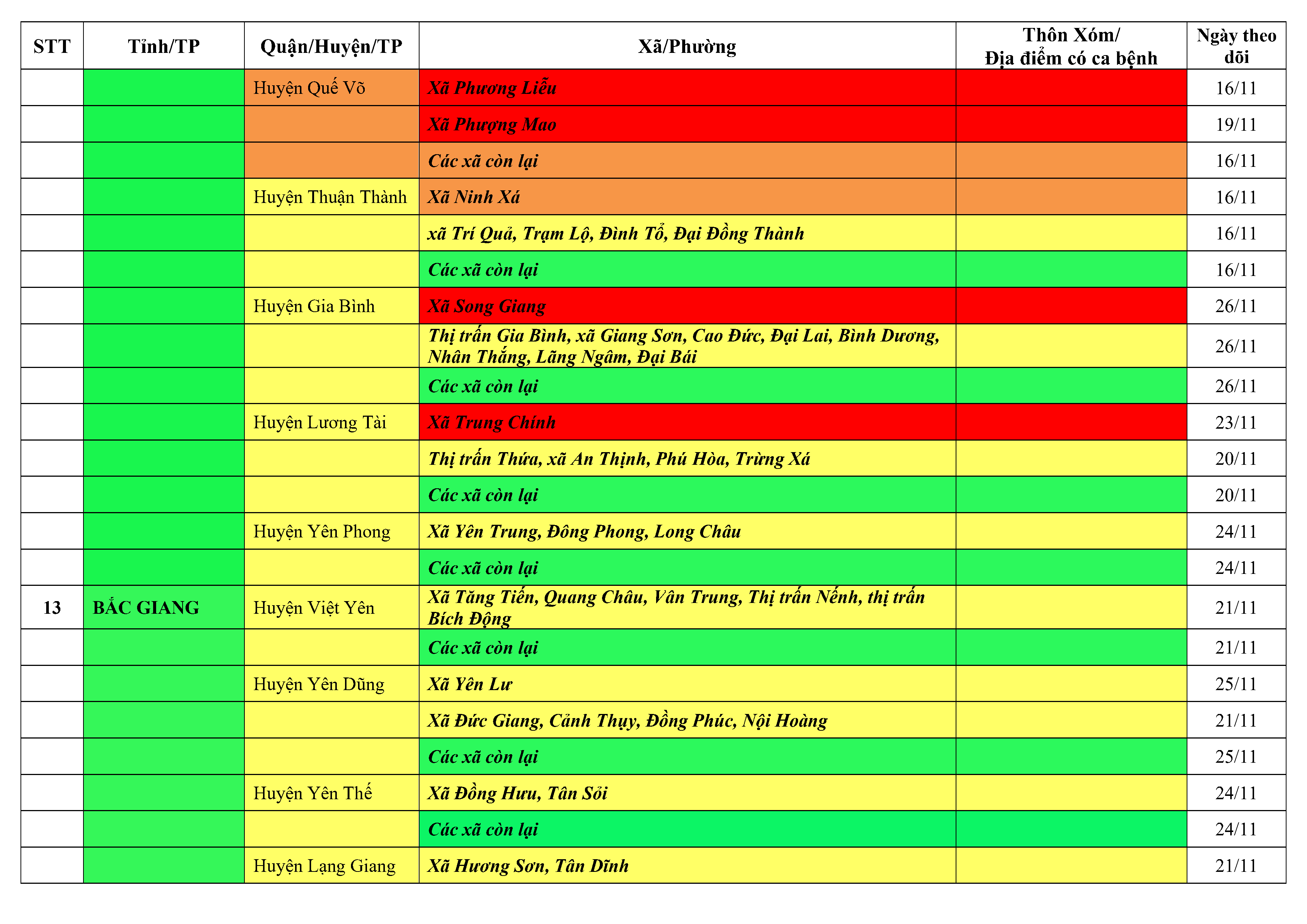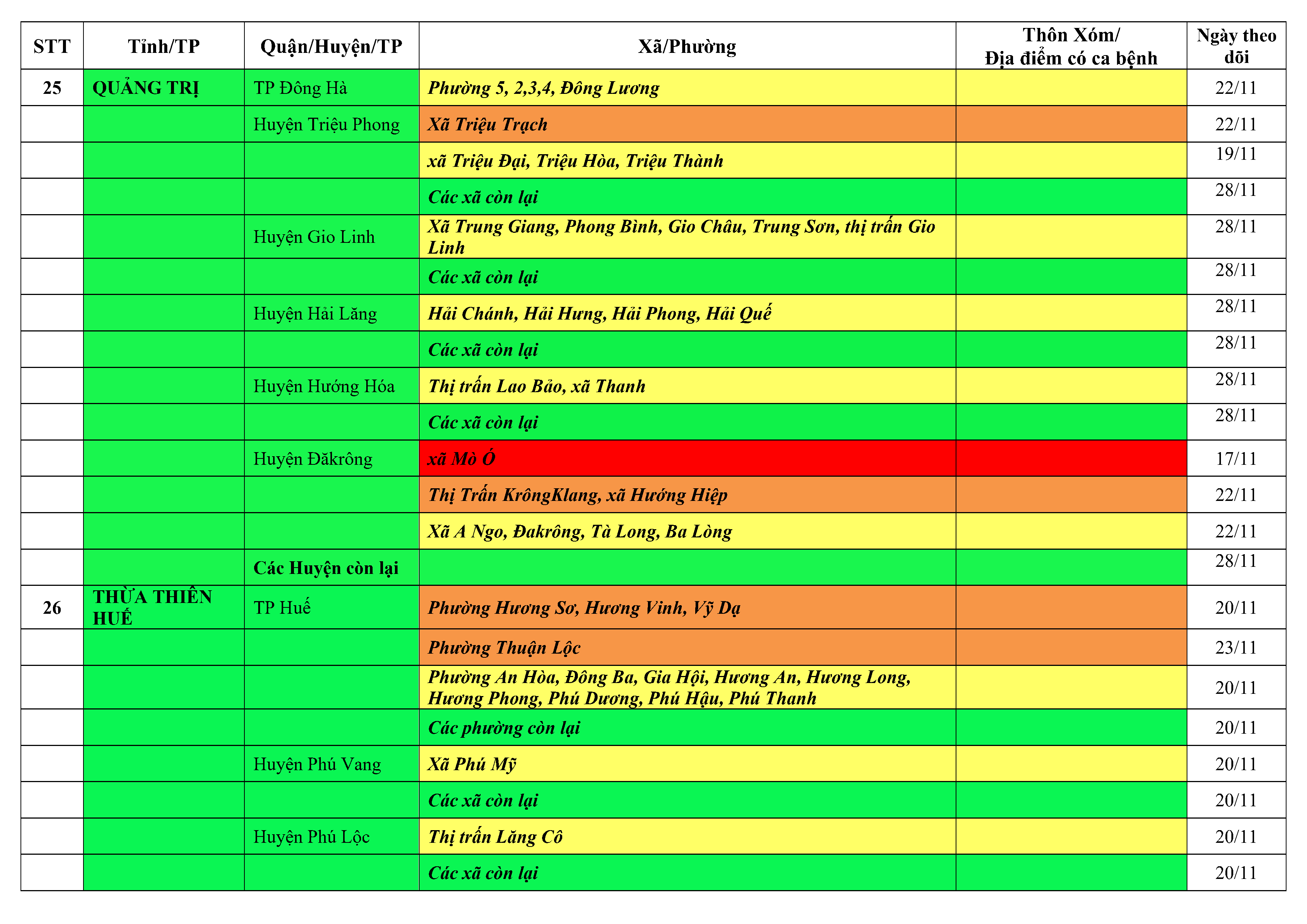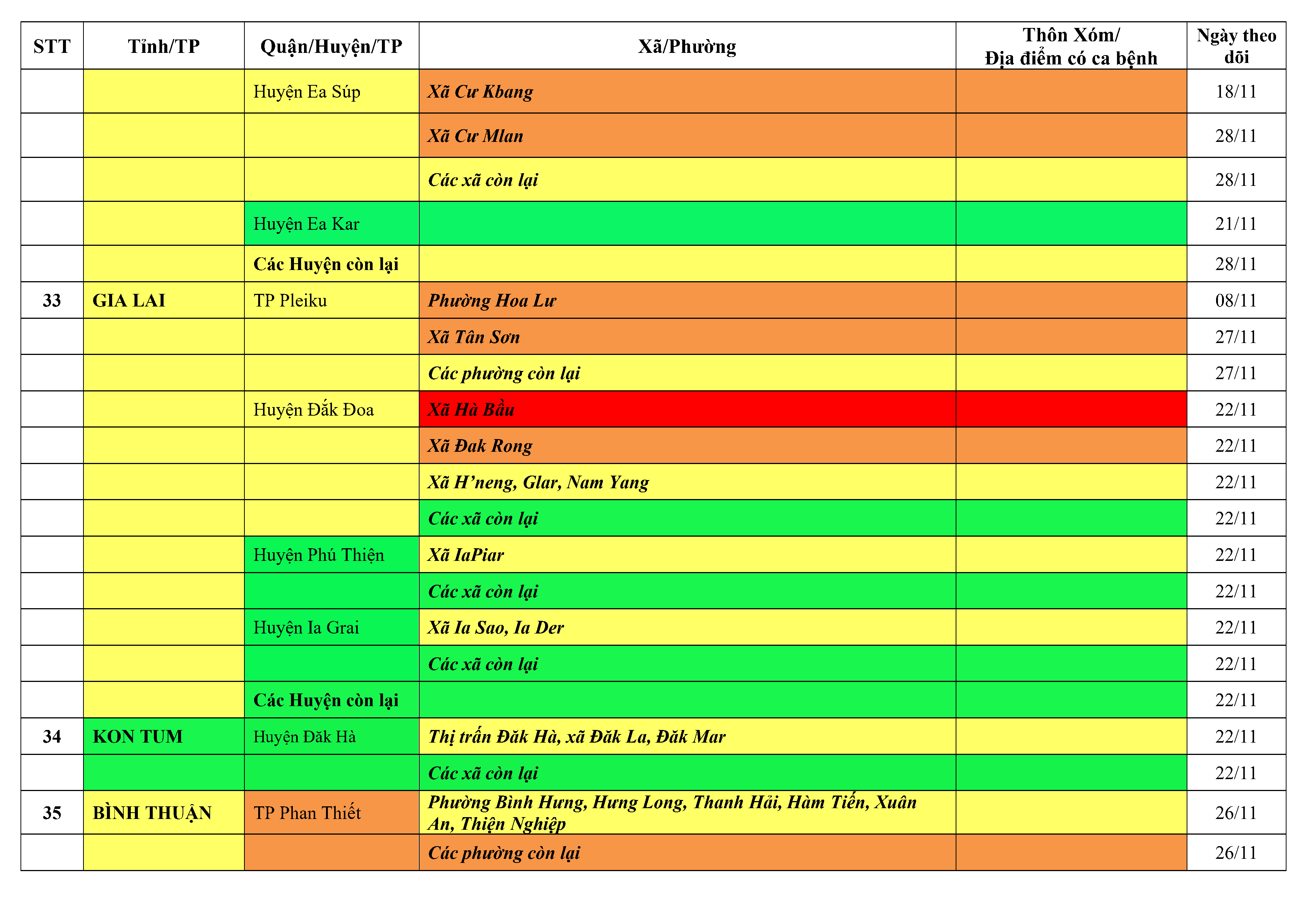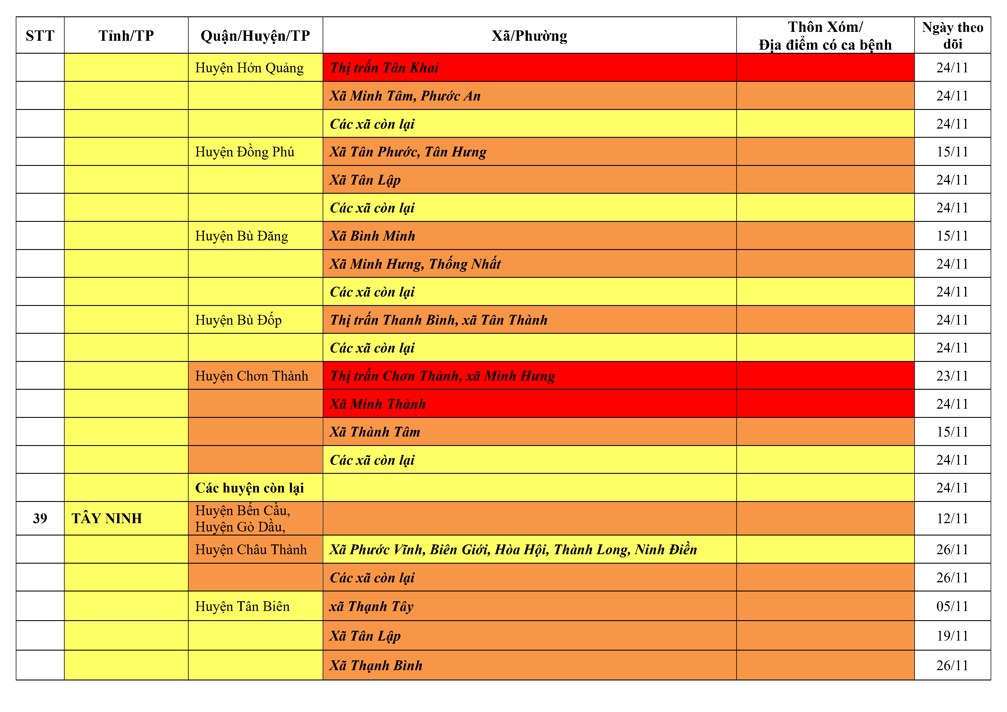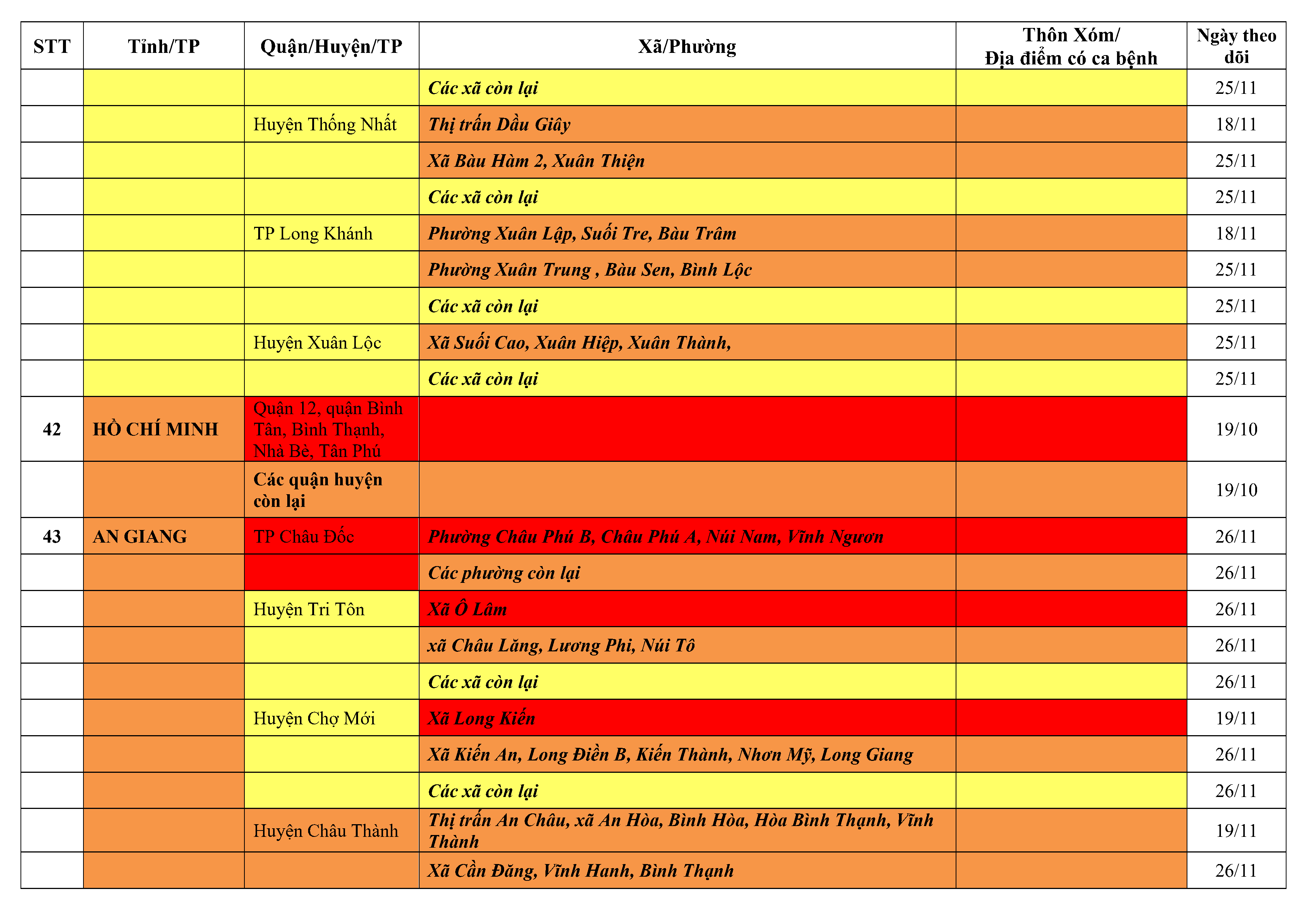 Lưu ý: Các tỉnh, thành phố không có tên trong bảng màu, đi lại bình thường, tuân thủ các biện pháp phòng chống dịch theo chỉ đạo của Bộ Y tế; khai báo y tế, thực hiện nghiêm 5K.