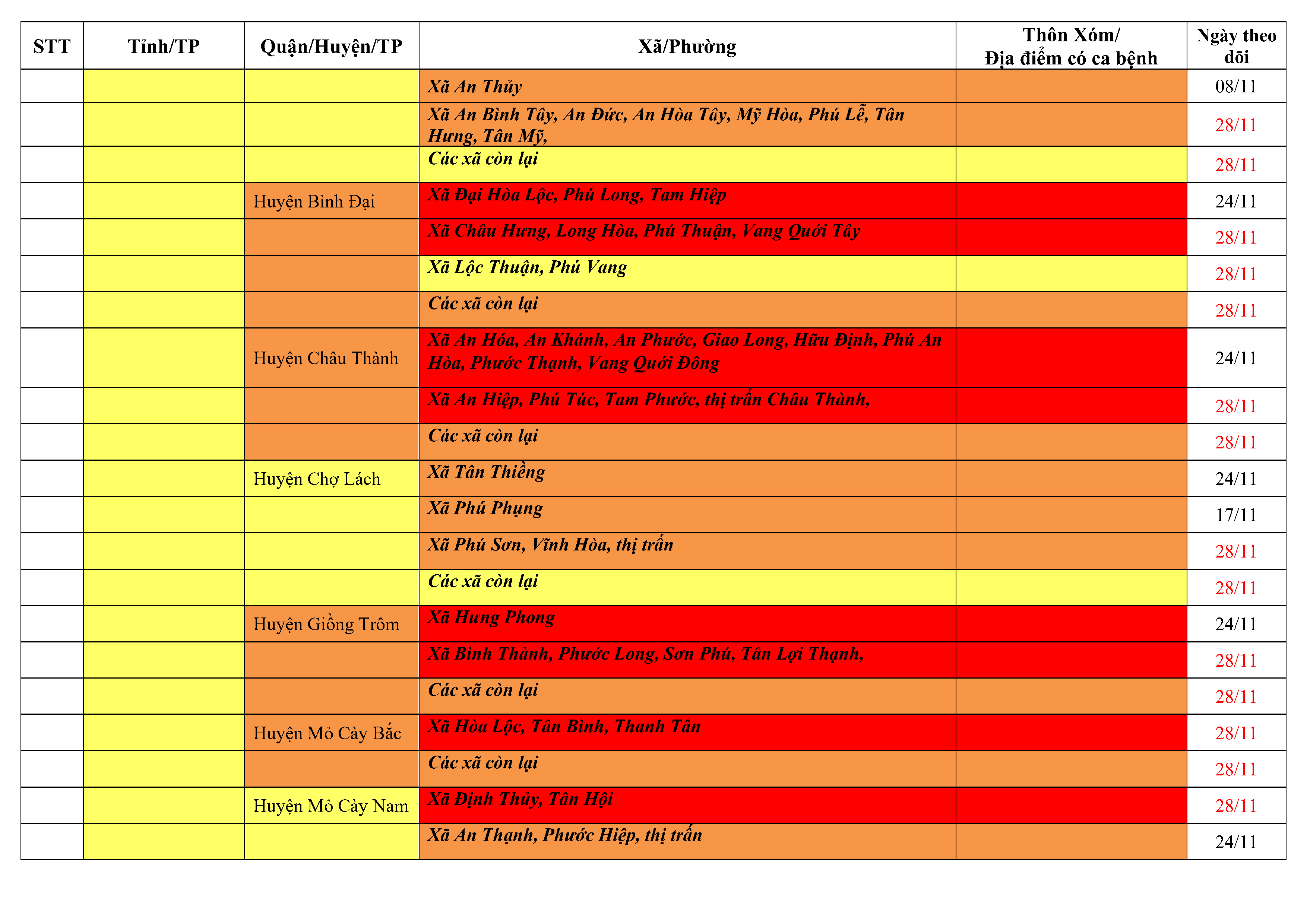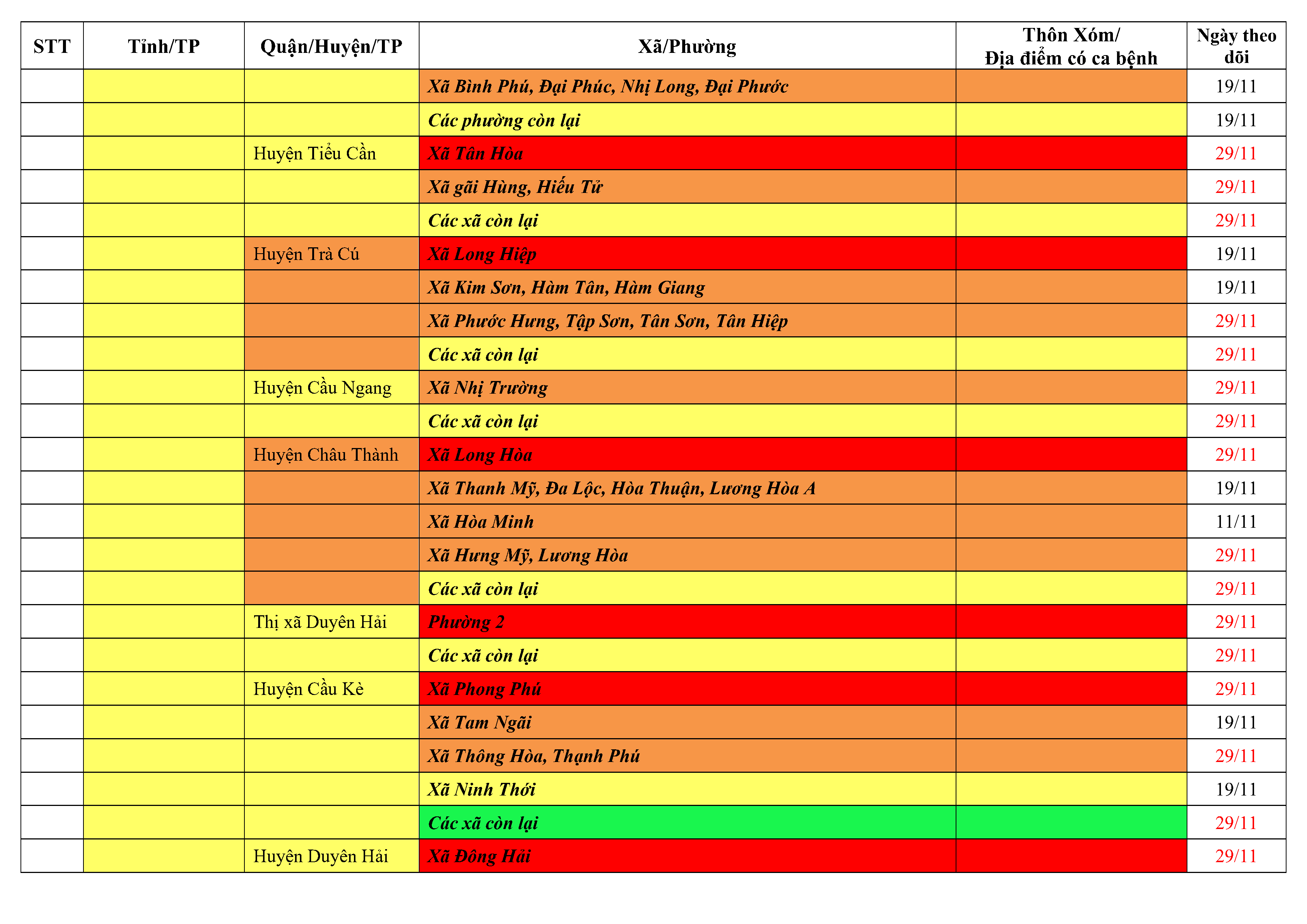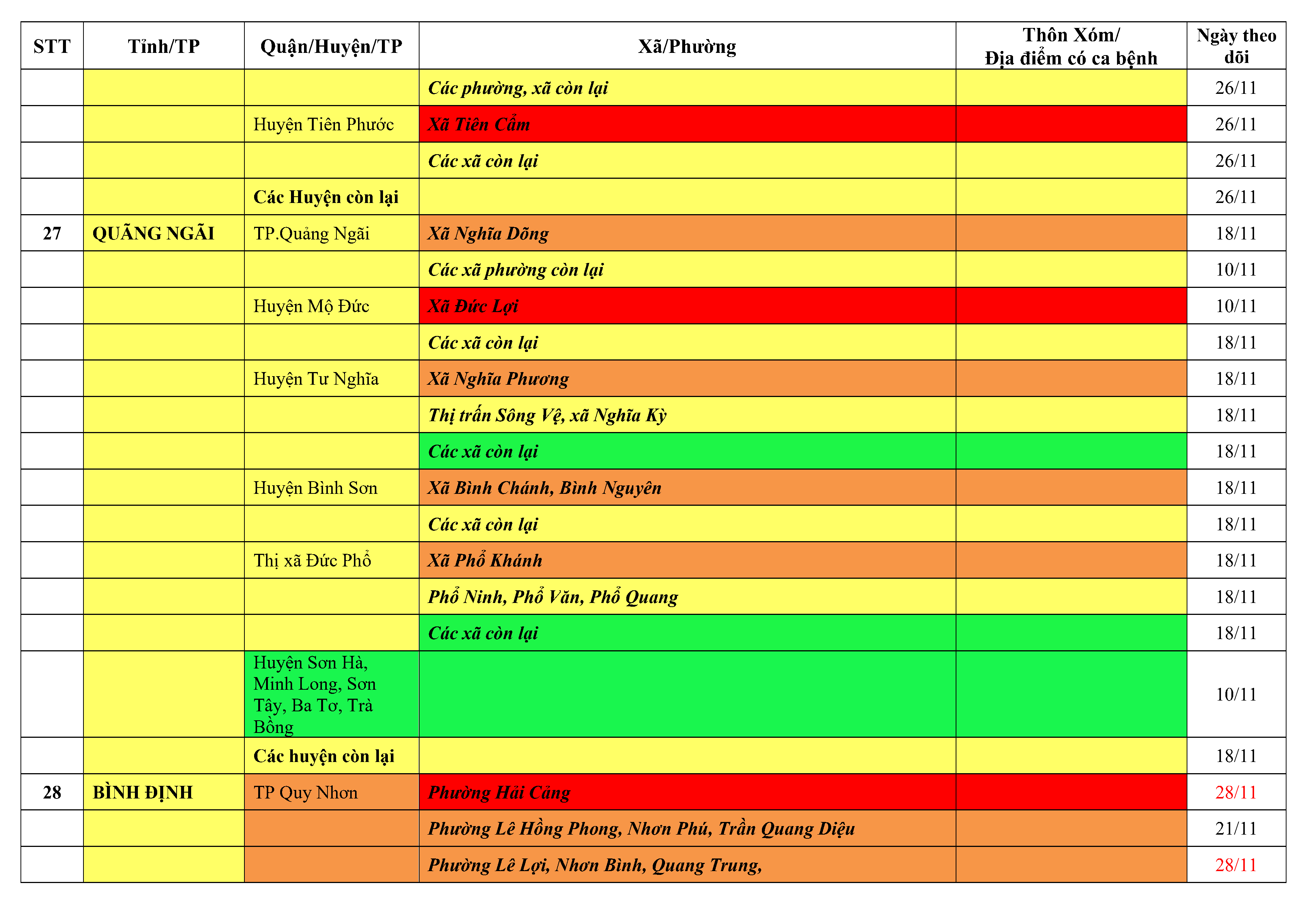 Áp dụng biện pháp tương ứng màu sắc ô cột theo thôn xóm; xã phường; quận huyện; tỉnh thành phố. Cách ly y tế dựa vào việc tiếp xúc, đi đến địa điểm và nơi cư trú có ca bệnh, theo Thông báo của Bộ Y tế, các tỉnh thành phố.