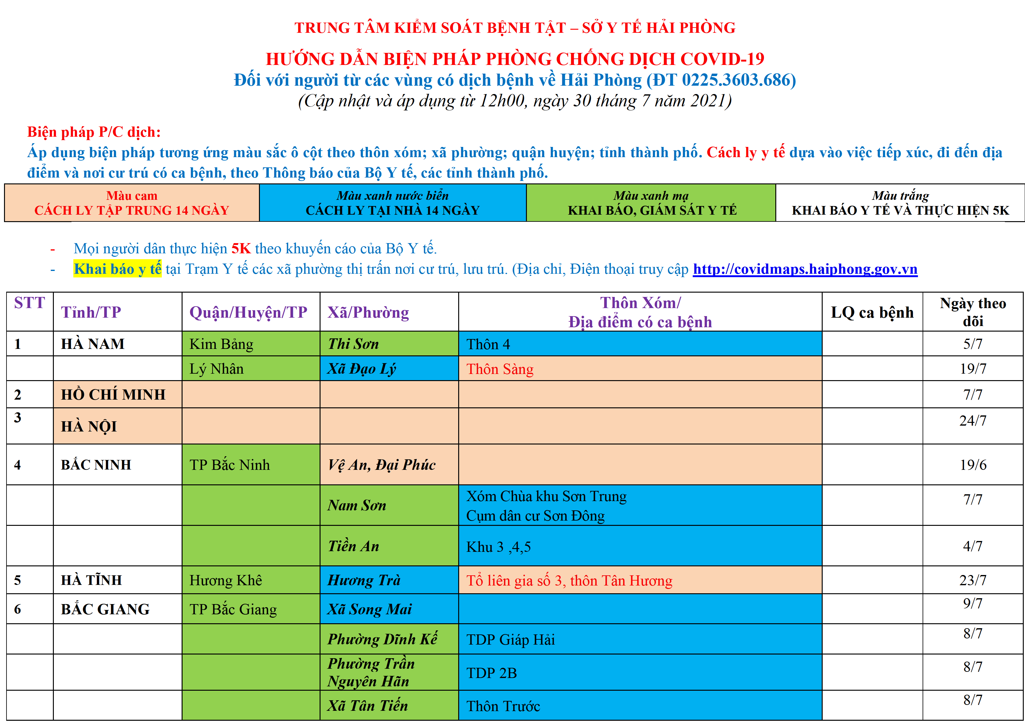 CDC Hải Phòng ban hành hướng dẫn tạm thời biện pháp phòng chống dịch COVID-19 đối với người từ các tỉnh, thành khác về thành phố như sau (thông tin cập nhật vào 12h00’ ngày 30/7/2021):