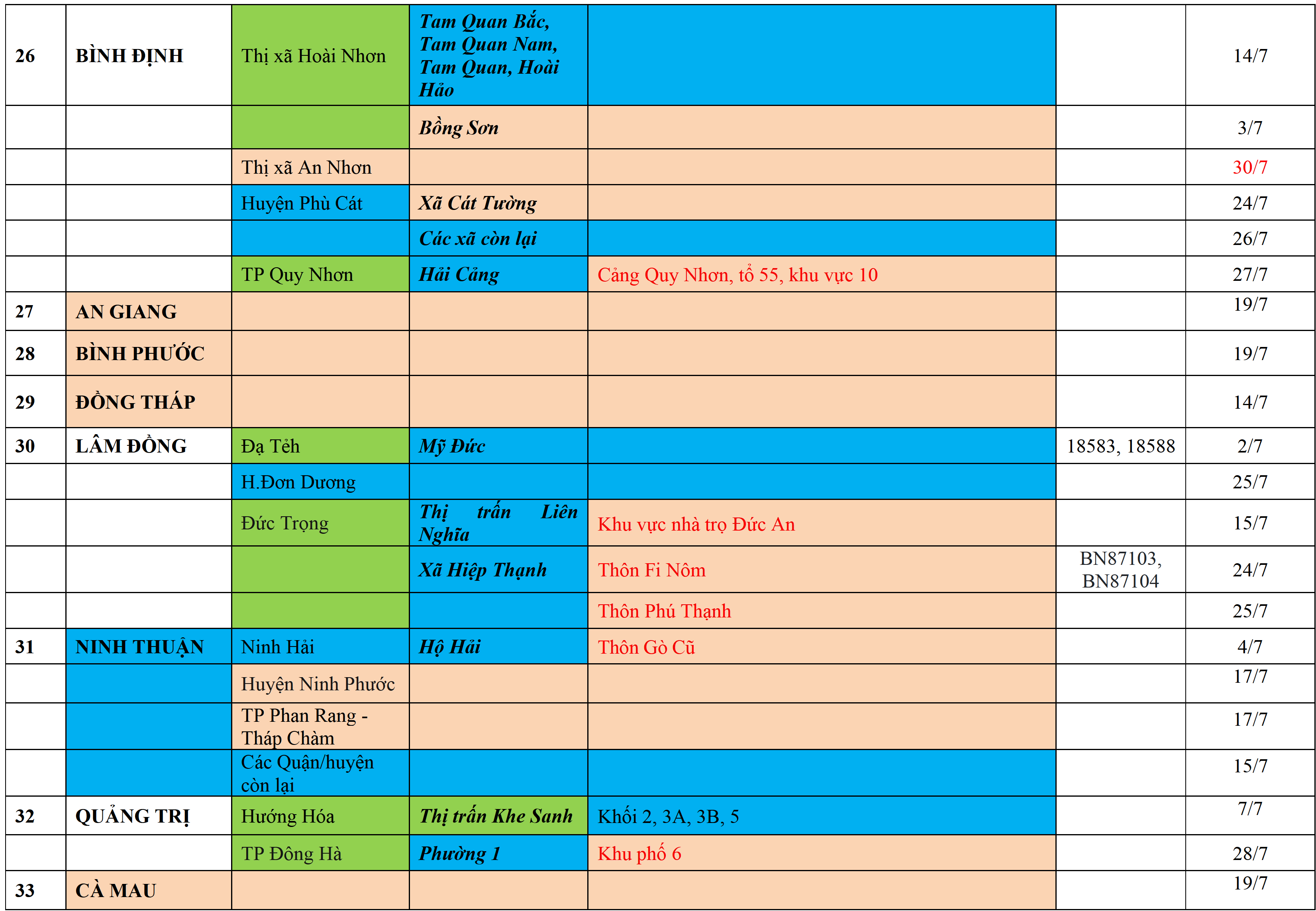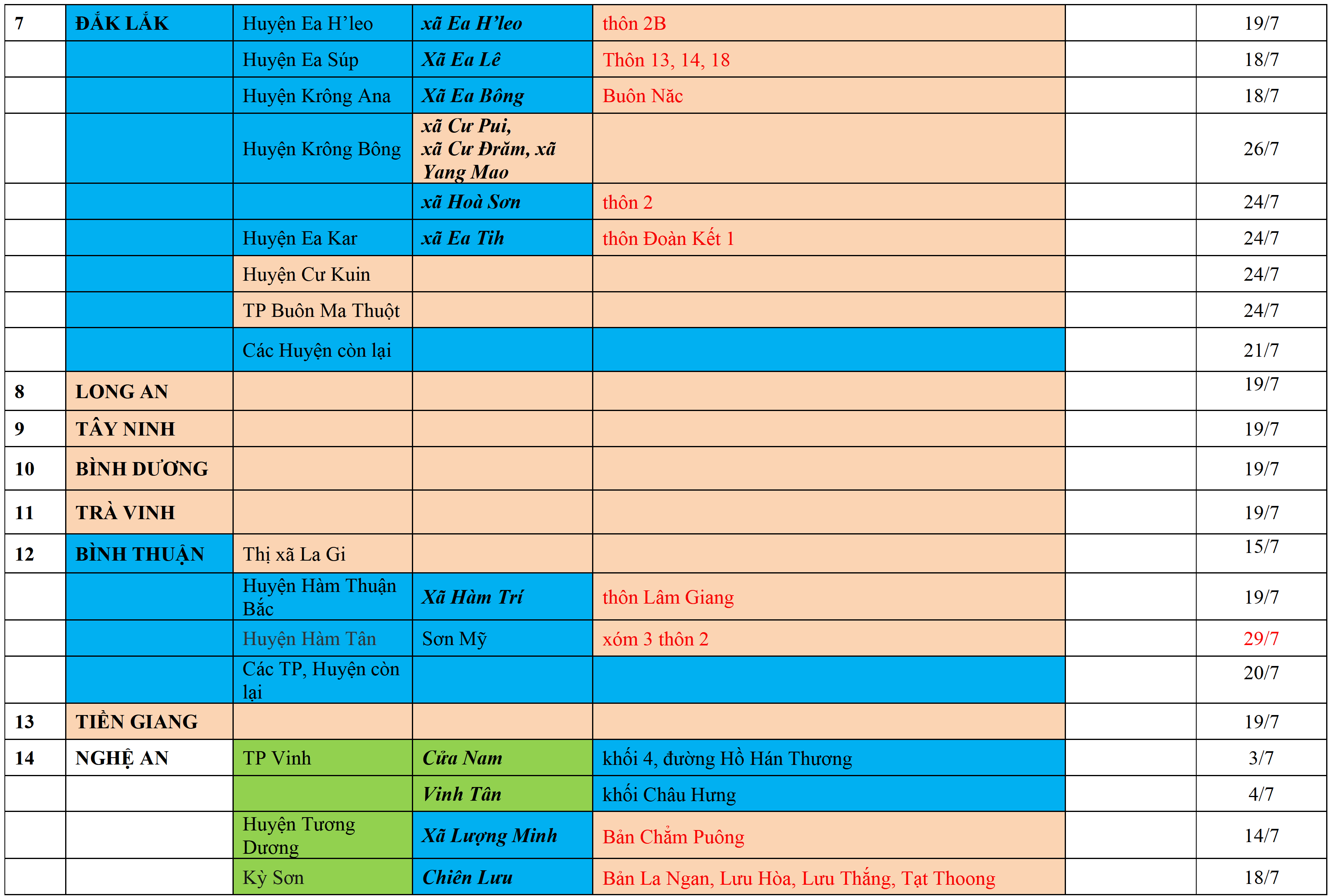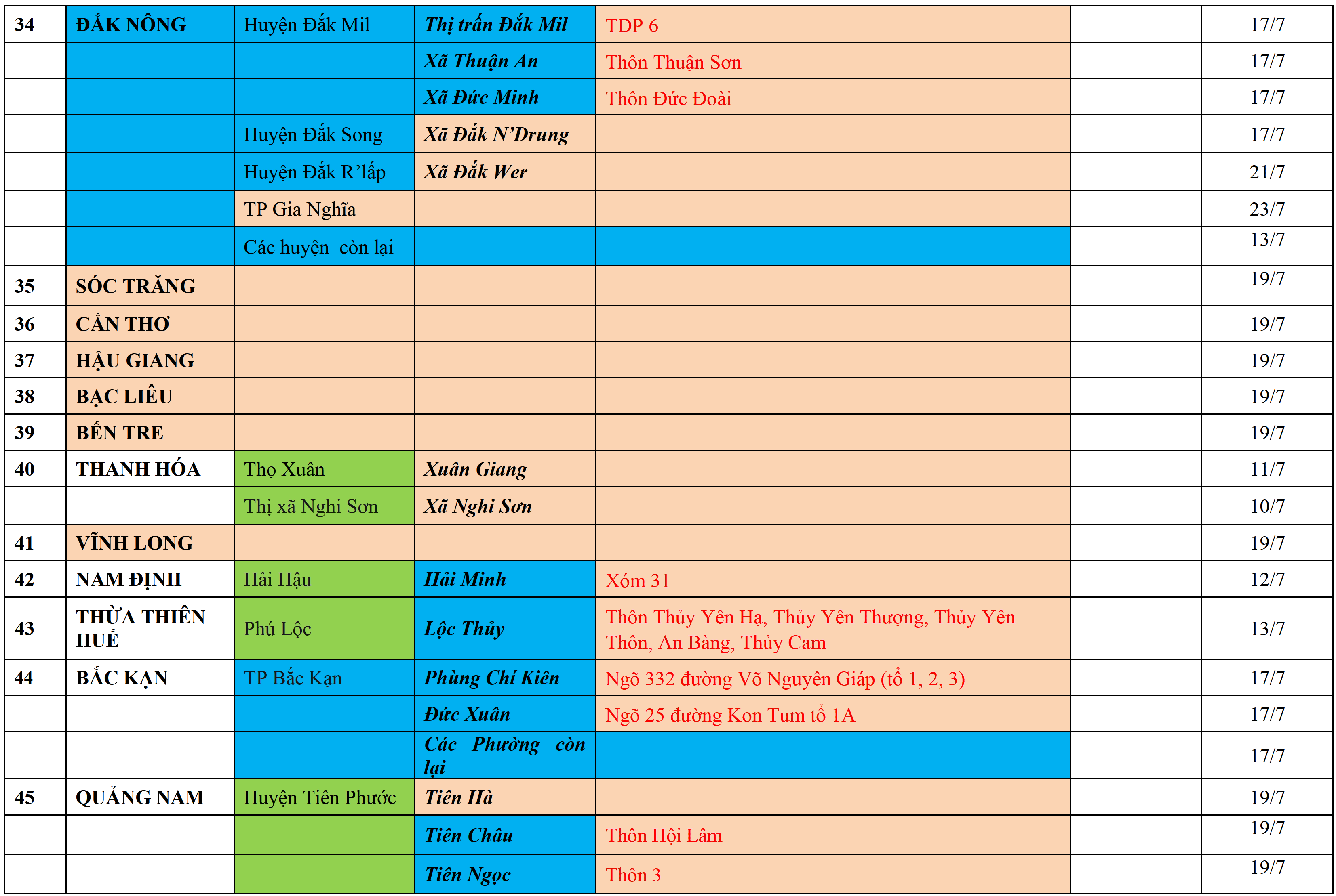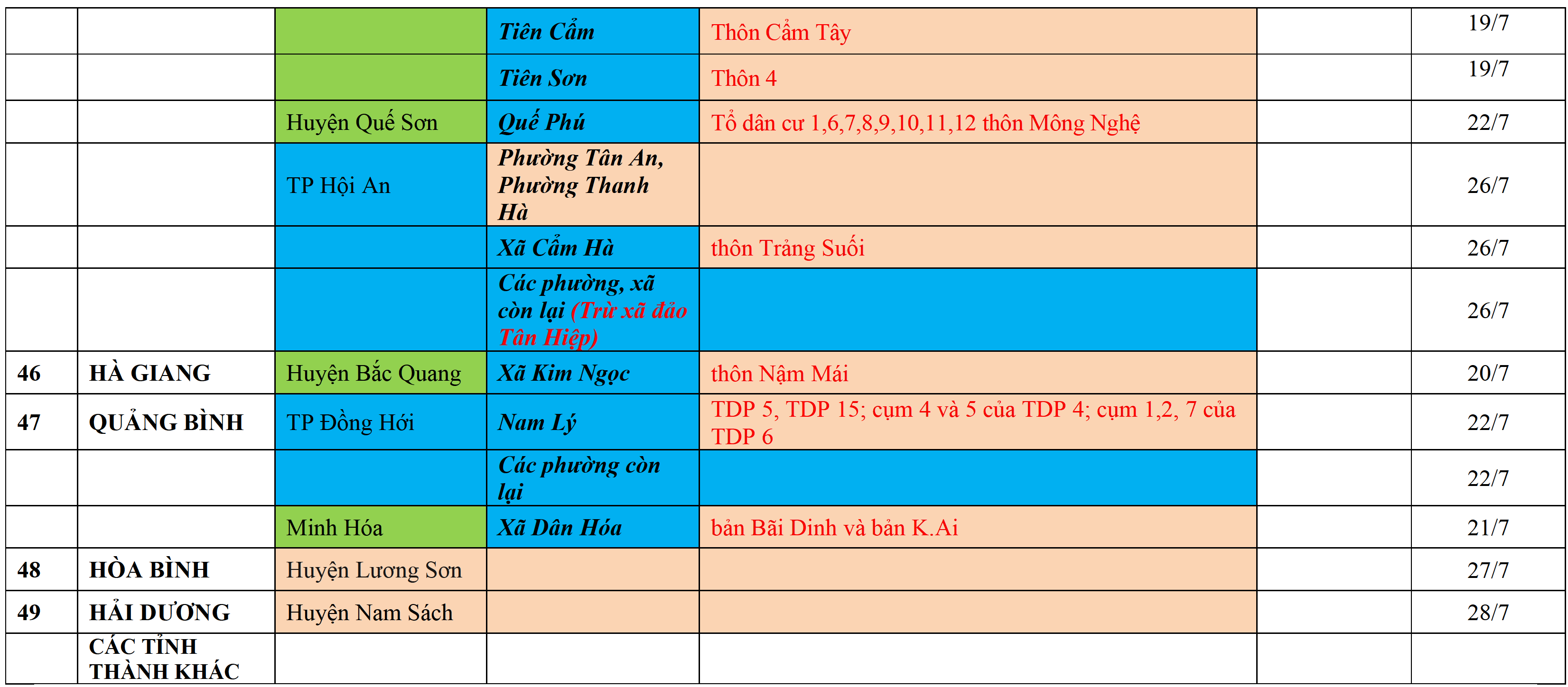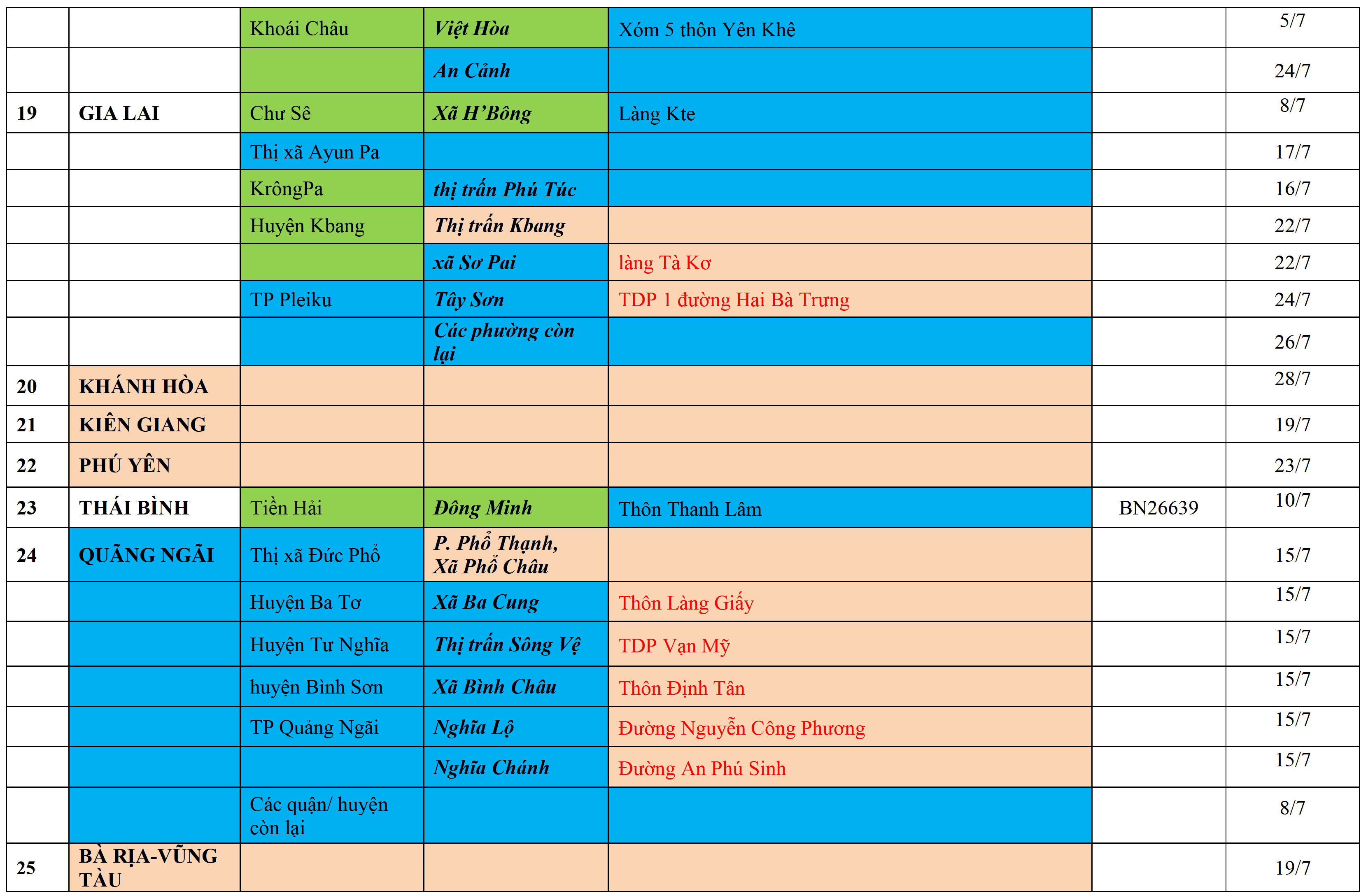 Màu cam: CÁCH LY TẬP TRUNG; Màu xanh nước biển: CÁCH LY TẠI NHÀ 14 NGÀY; Màu xanh mạ: KHAI BÁO, GIÁM SÁT Y TẾ; Màu trắng: KHAI BÁO Y TẾ VÀ THỰC HIỆN 5K.