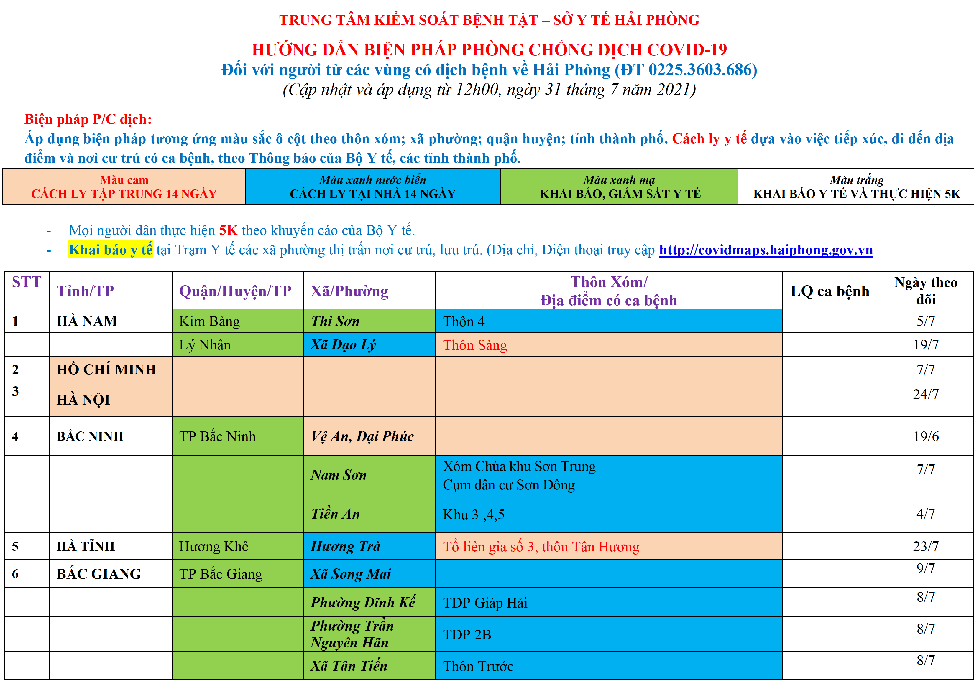 CDC Hải Phòng ban hành hướng dẫn tạm thời biện pháp phòng chống dịch COVID-19 đối với người từ các tỉnh, thành khác về thành phố như sau (thông tin cập nhật vào 12h00’ ngày 31/7/2021):