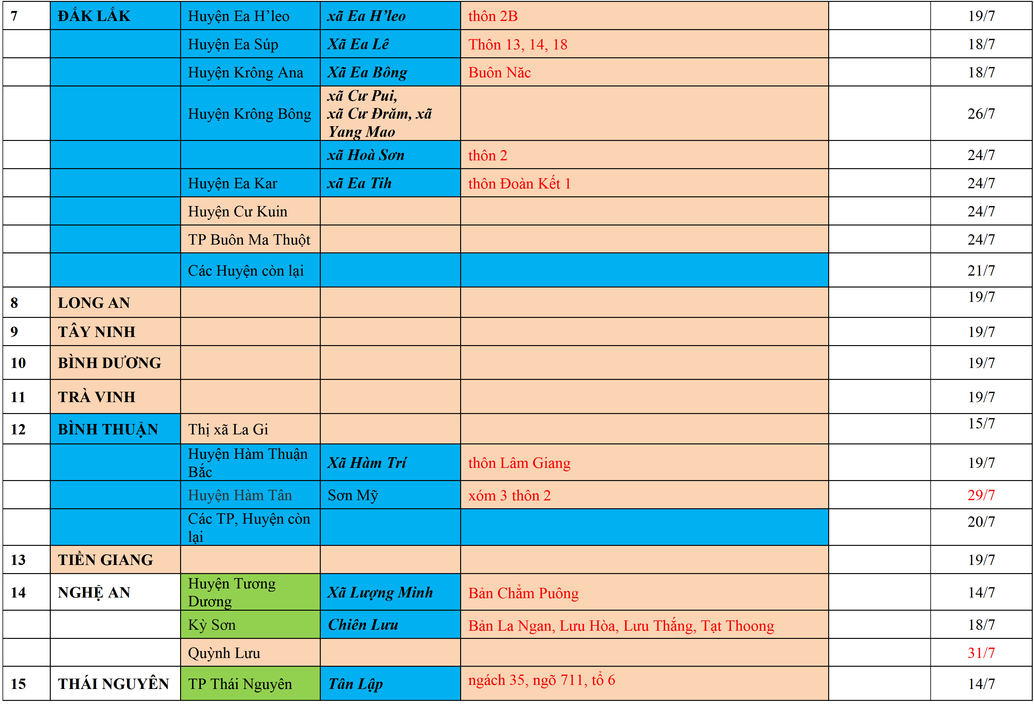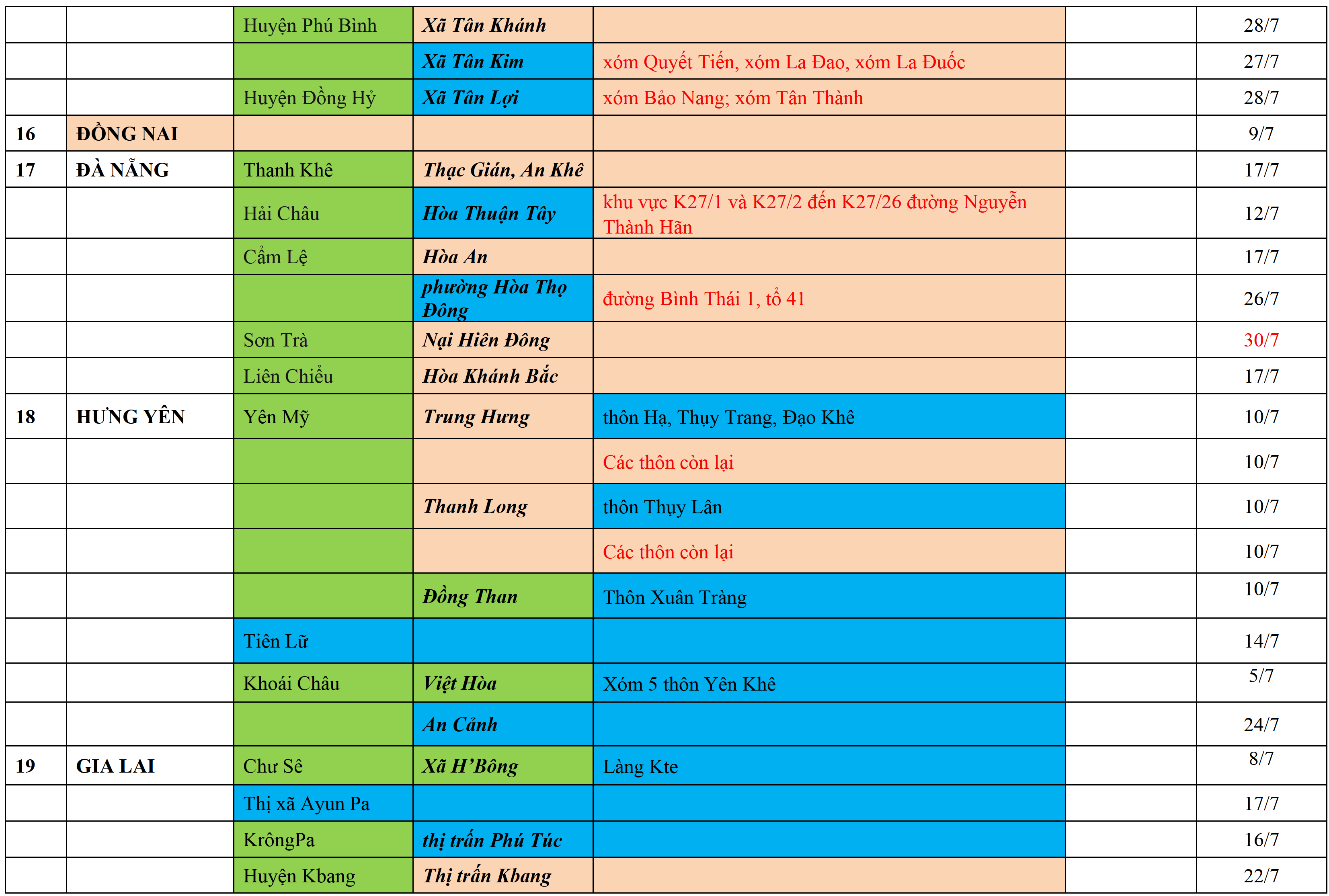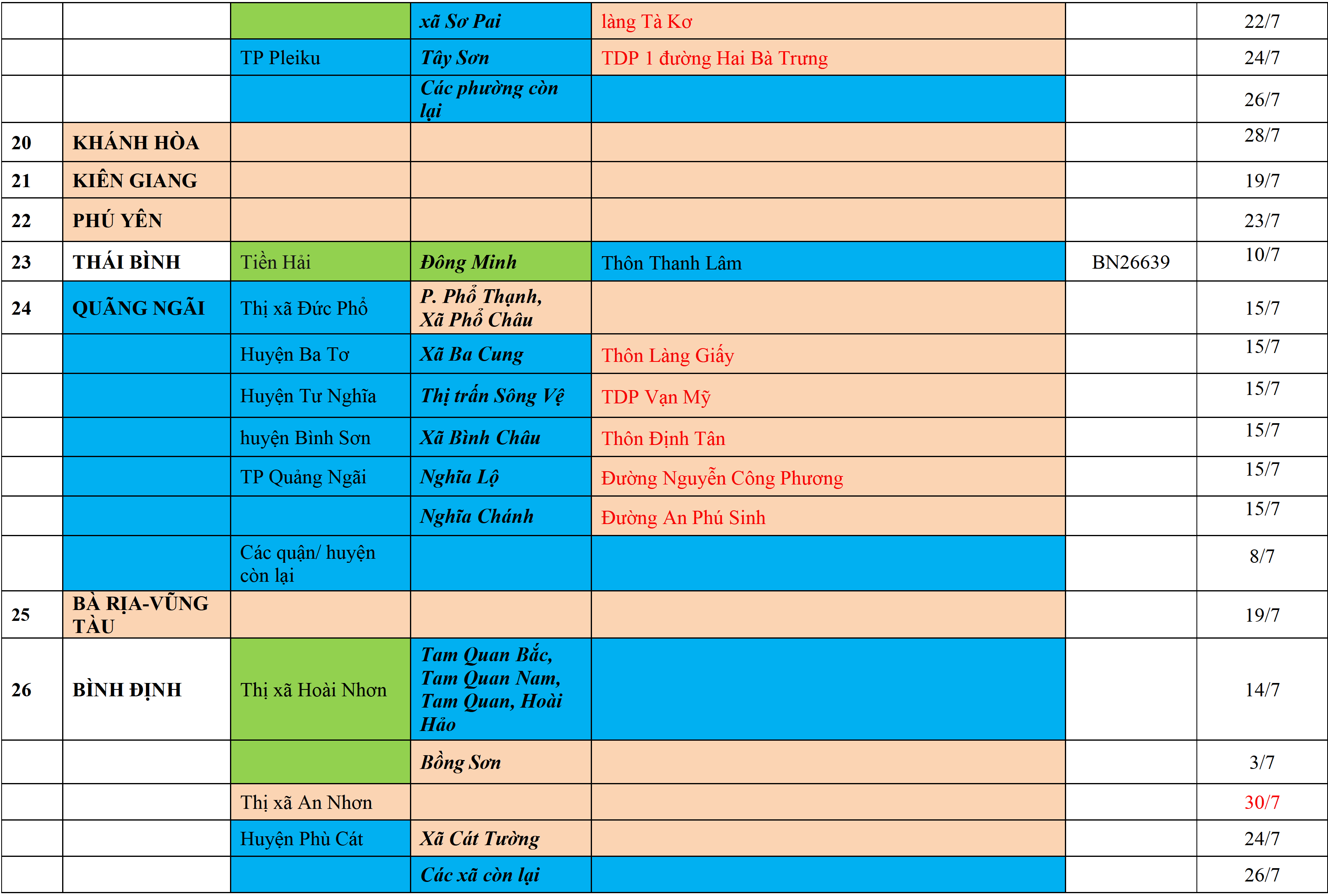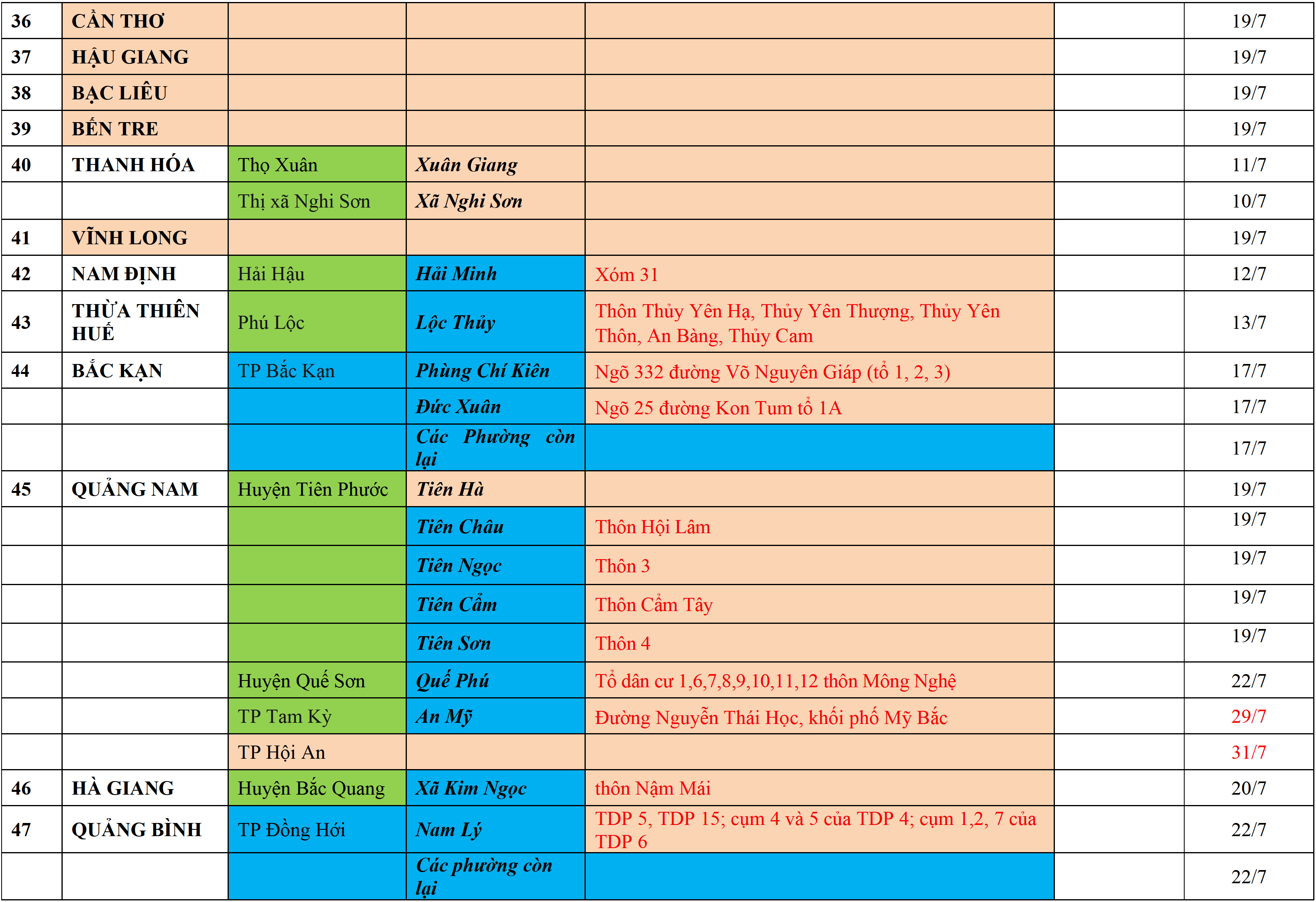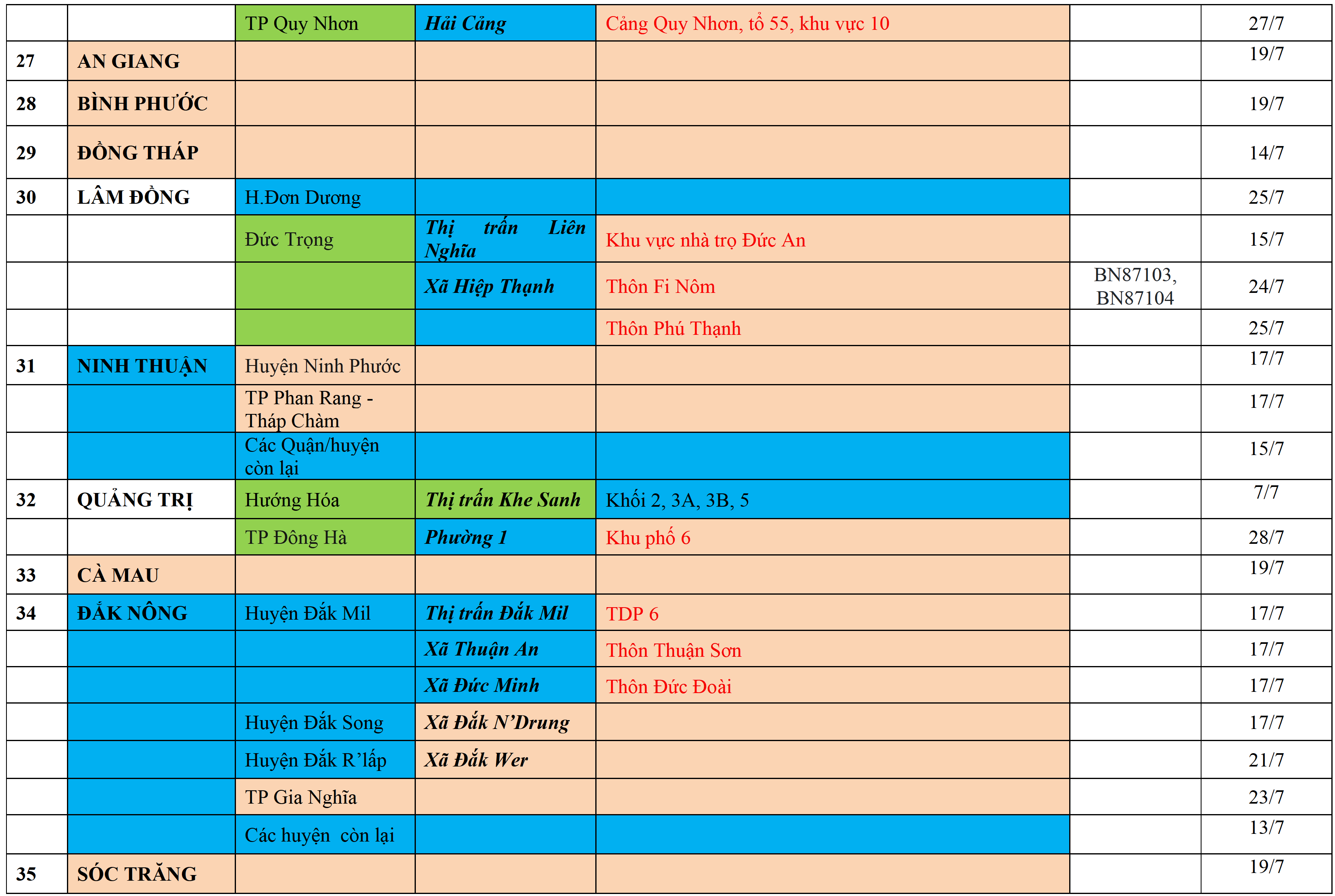 Màu cam: CÁCH LY TẬP TRUNG; Màu xanh nước biển: CÁCH LY TẠI NHÀ 14 NGÀY; Màu xanh mạ: KHAI BÁO, GIÁM SÁT Y TẾ; Màu trắng: KHAI BÁO Y TẾ VÀ THỰC HIỆN 5K.