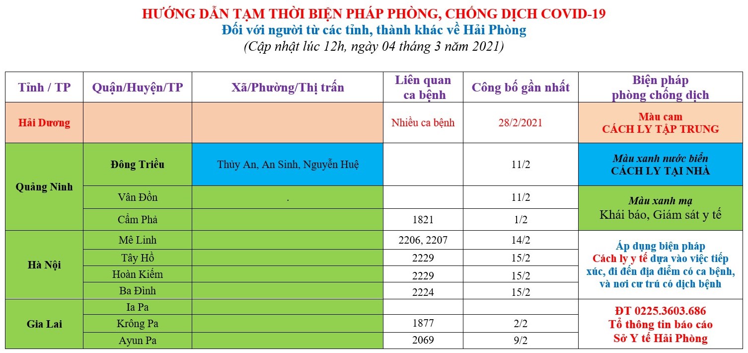 Sở Y tế Hải Phòng ban hành hướng dẫn tạm thời biện pháp phòng chống dịch COVID-19 đối với người từ các tỉnh, thành khác về thành phố như sau (thông tin cập nhật vào 12h00’ ngày 4/3/2021):