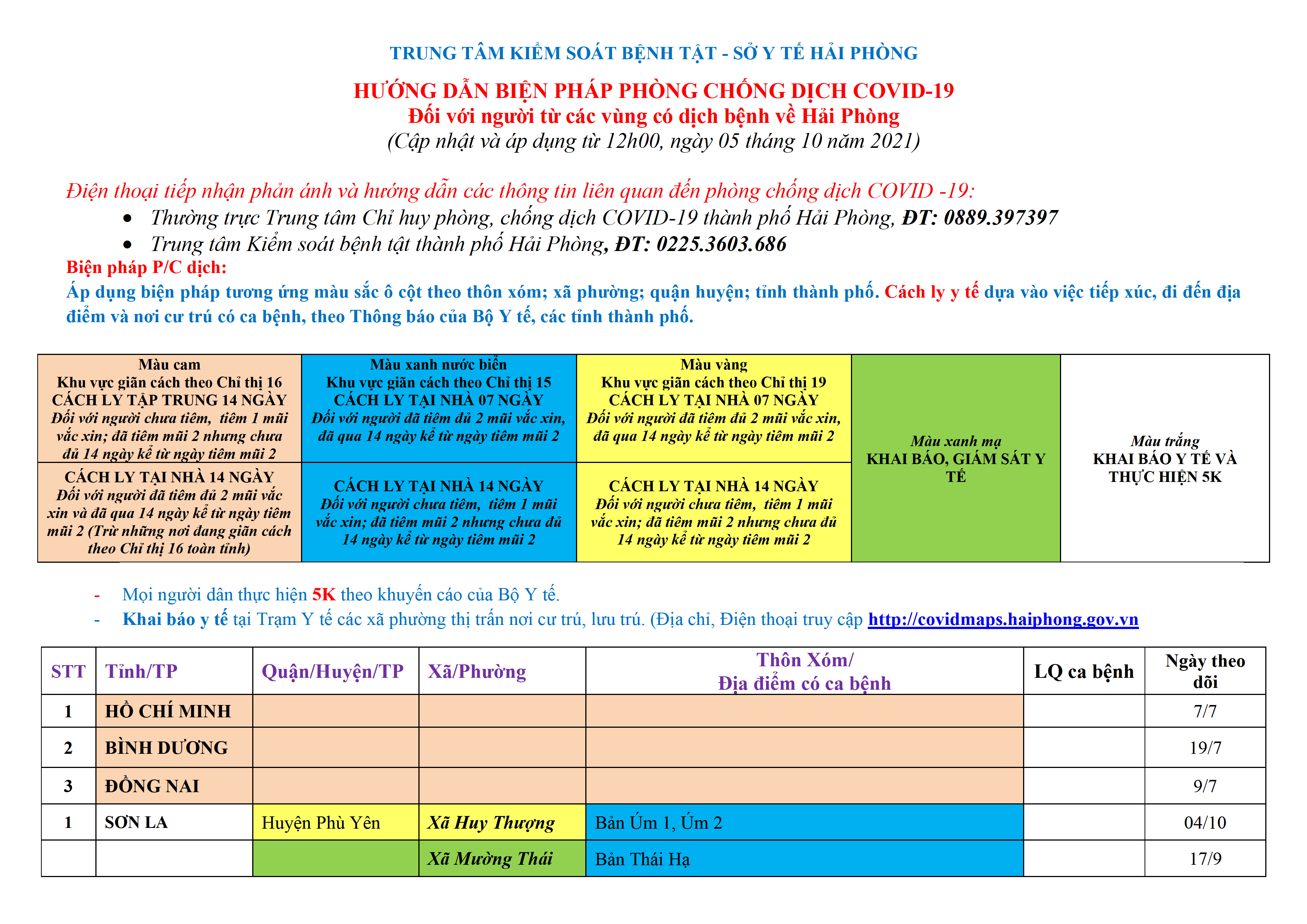 . Mọi người dân thực hiện 5K theo khuyến cáo của Bộ Y tế. Khai báo y tế tại Trạm Y tế các xã phường thị trấn nơi cư trú, lưu trú. (Địa chỉ, Điện thoại truy cập http://covidmaps.haiphong.gov.vn).