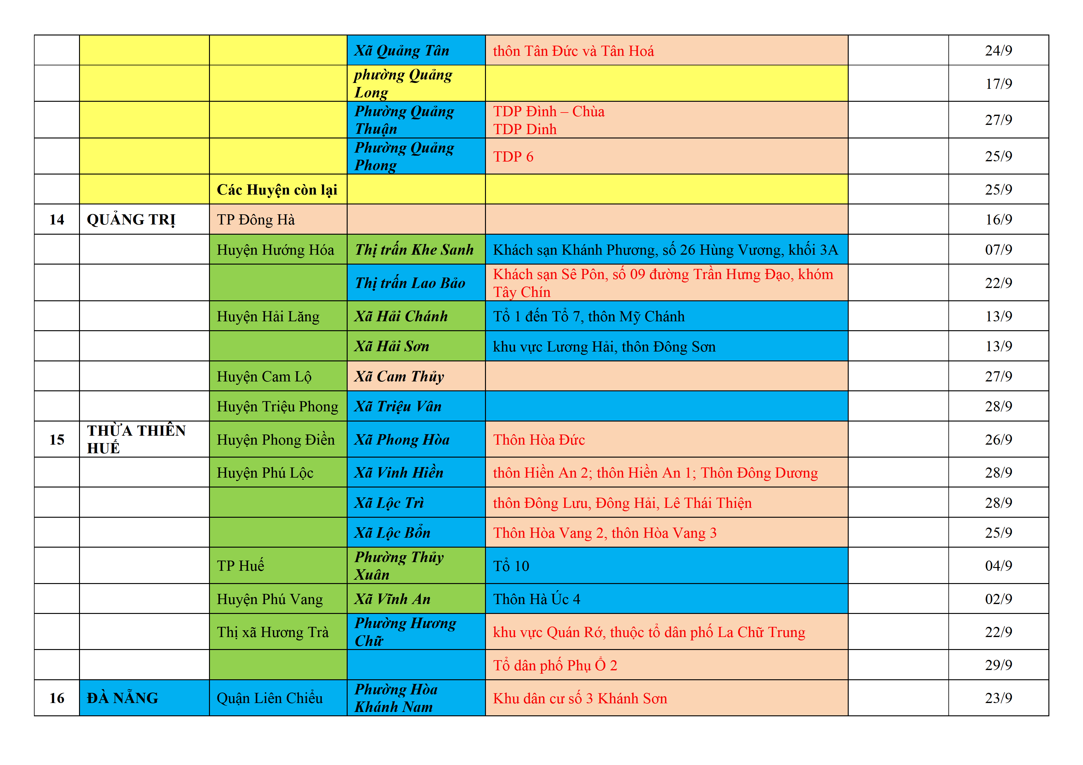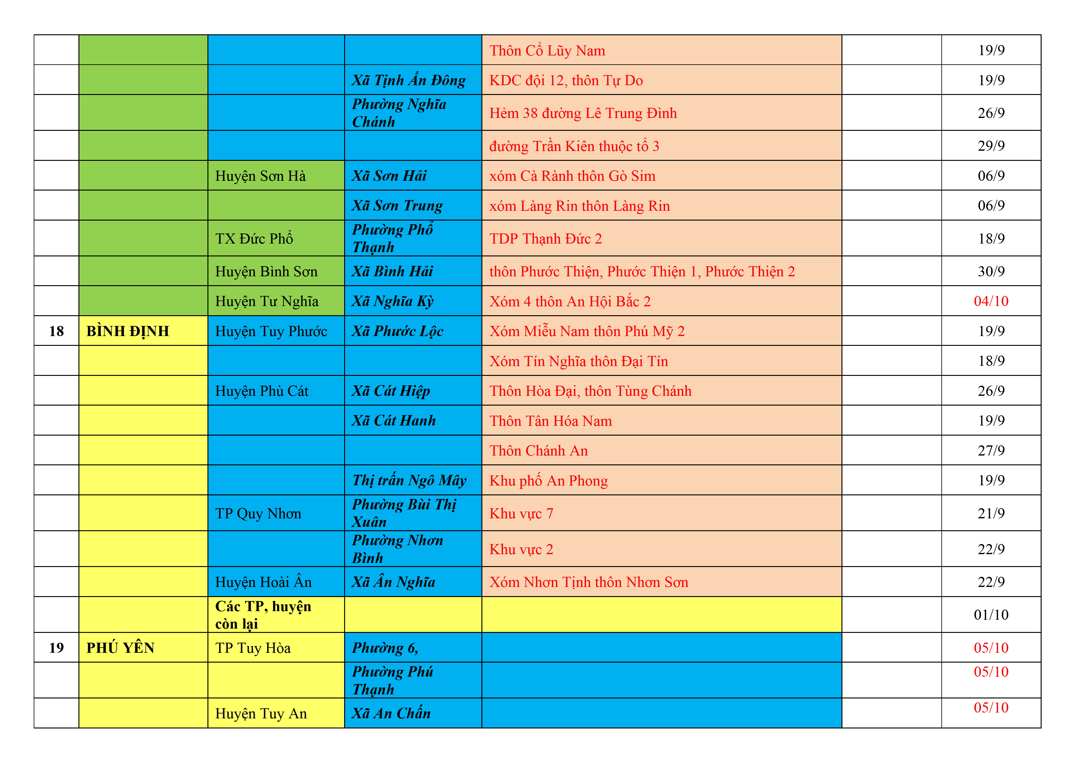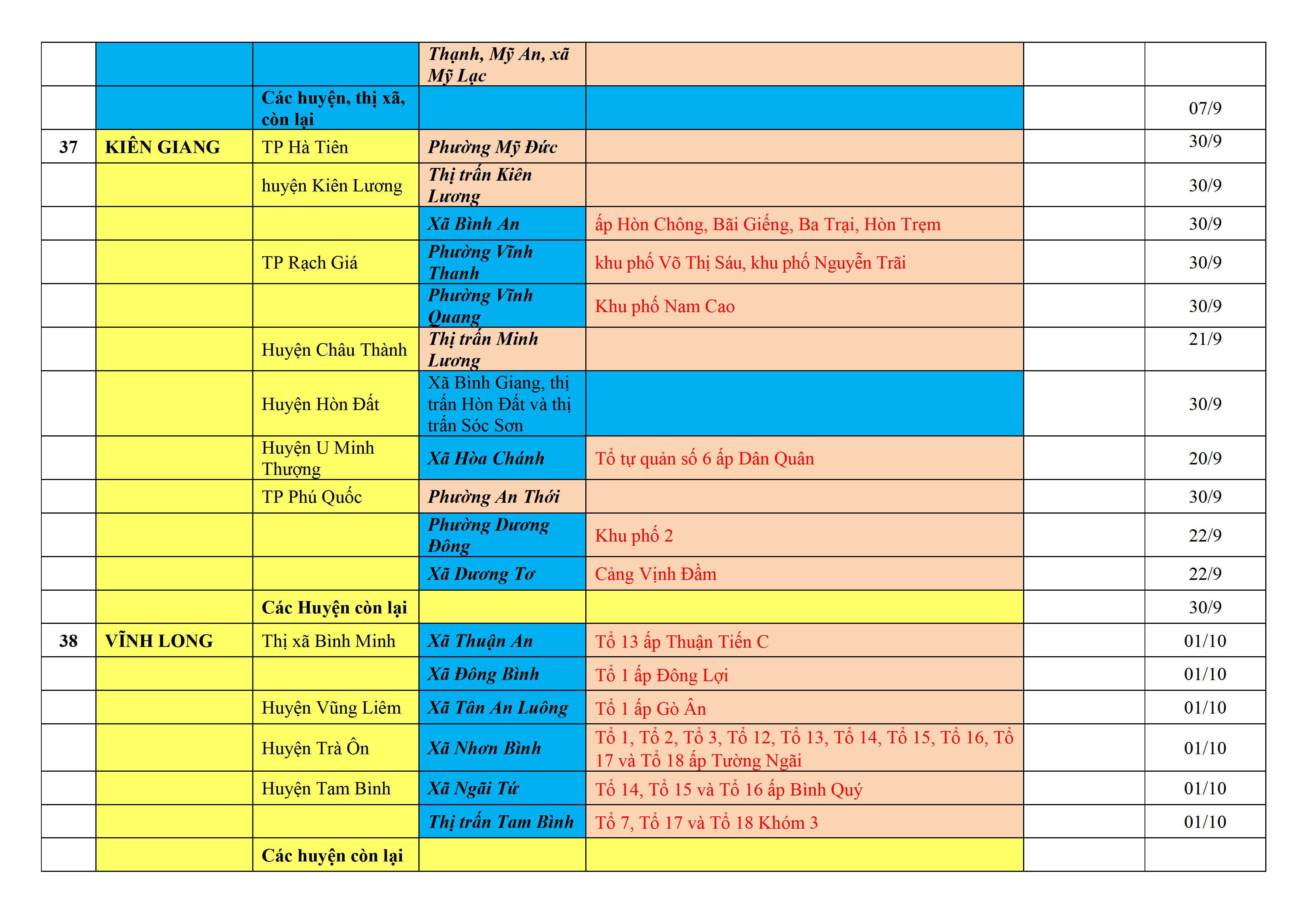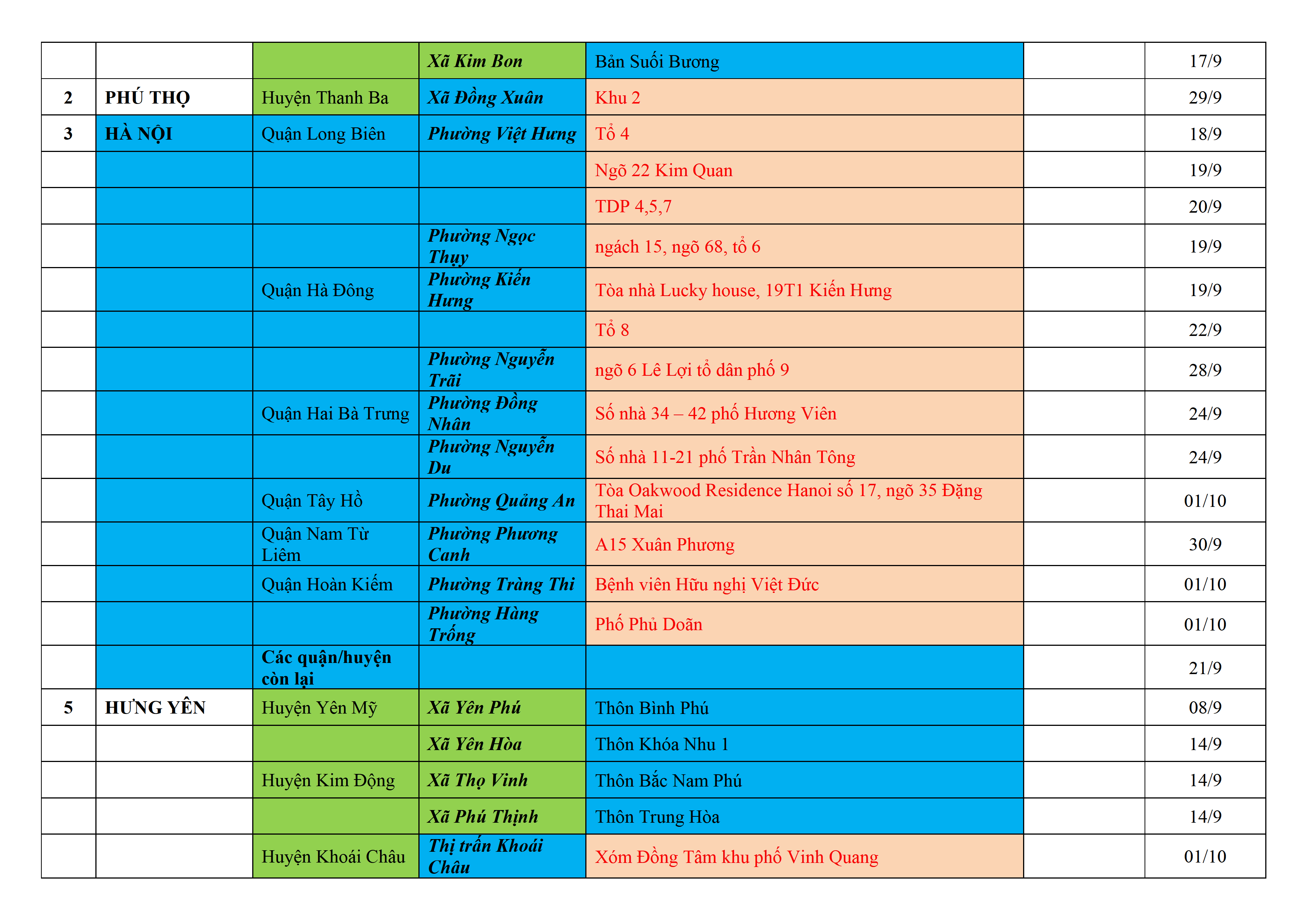 Biện pháp phòng, chống dịch COVID-19: Áp dụng biện pháp tương ứng màu sắc ô cột theo thôn xóm; xã phường; quận huyện; tỉnh thành phố. Cách ly y tế dựa vào việc tiếp xúc, đi đến địa điểm và nơi cư trú có ca bệnh, theo Thông báo của Bộ Y tế, các tỉnh thành phố.