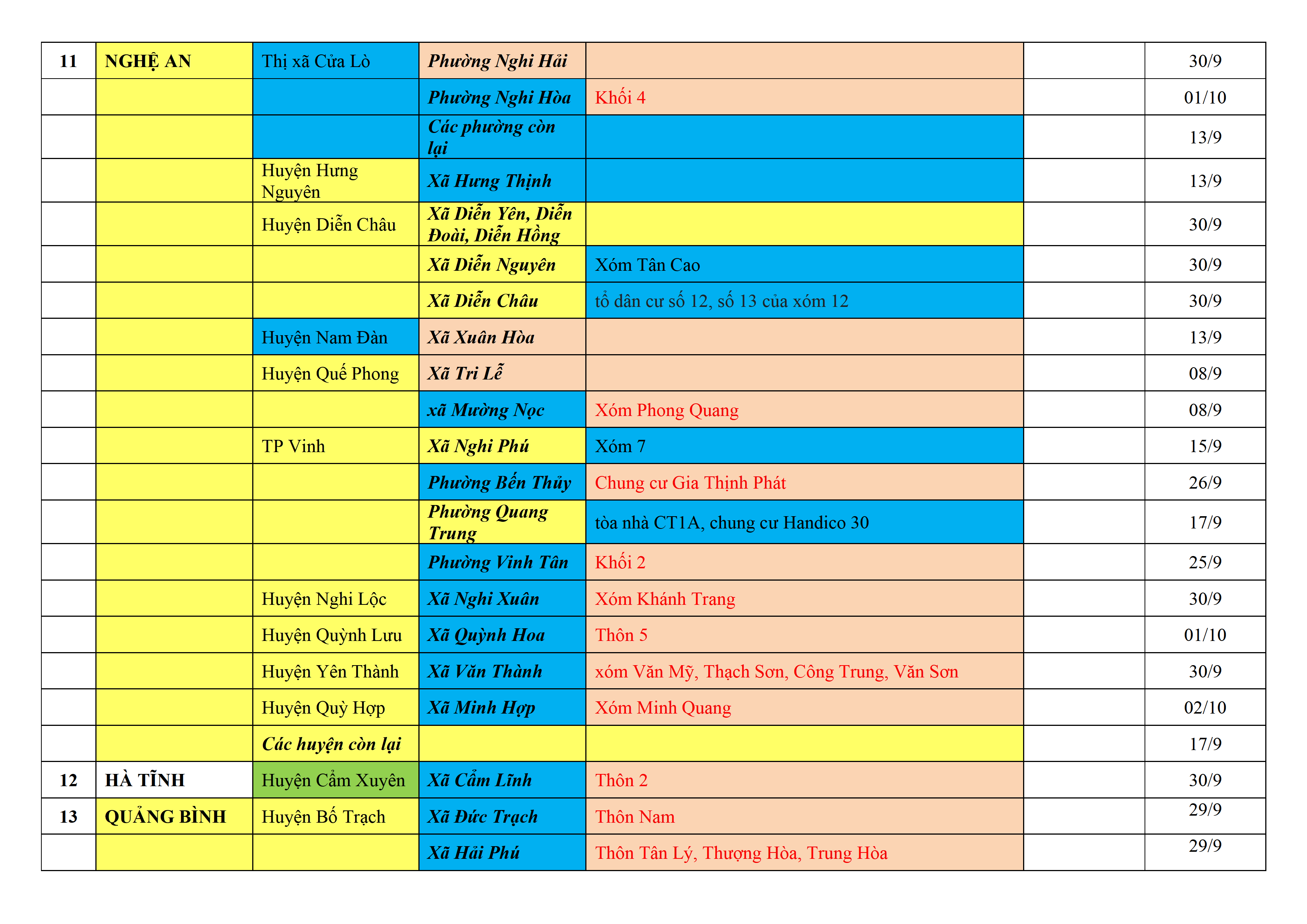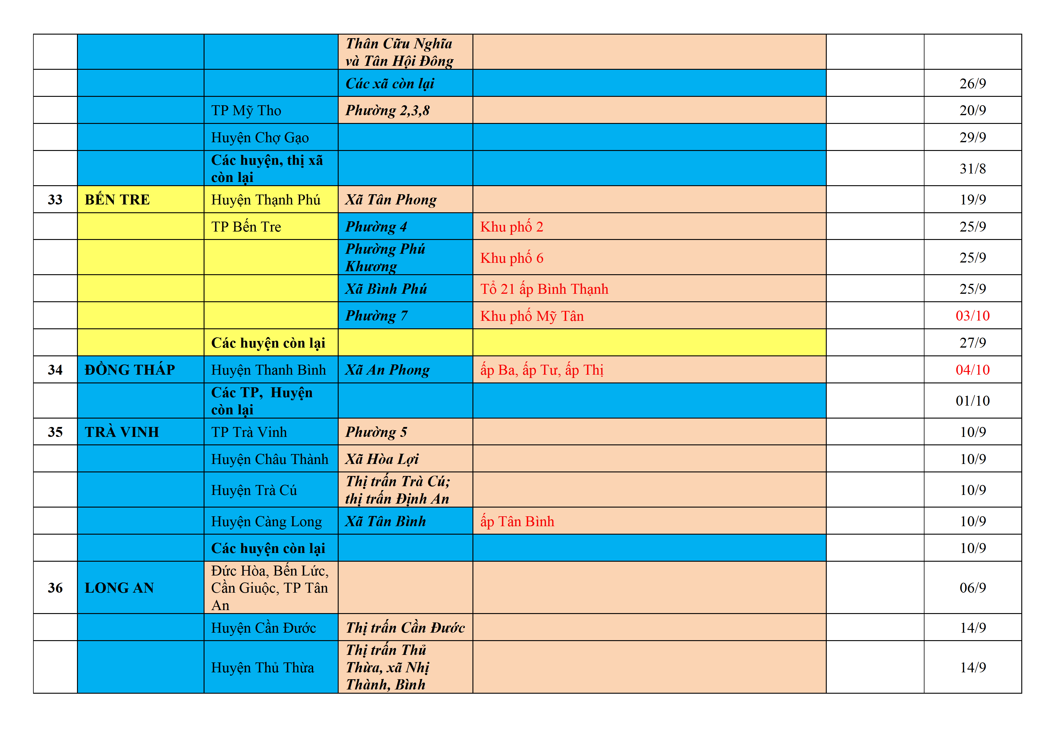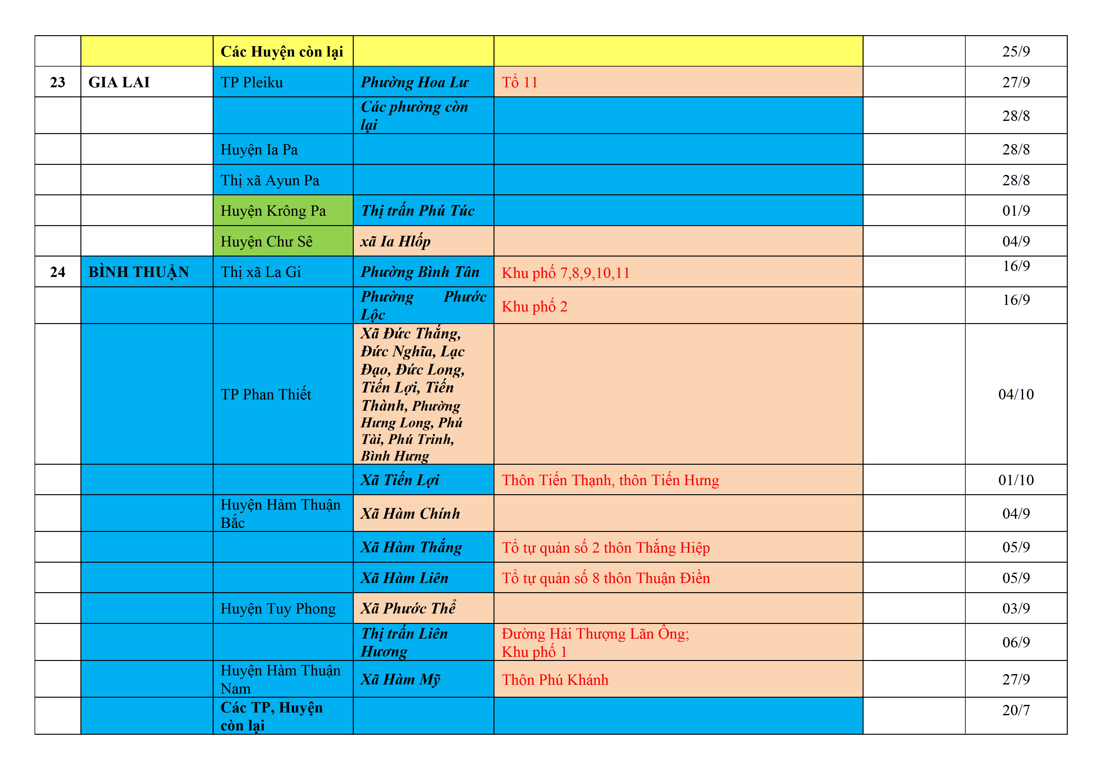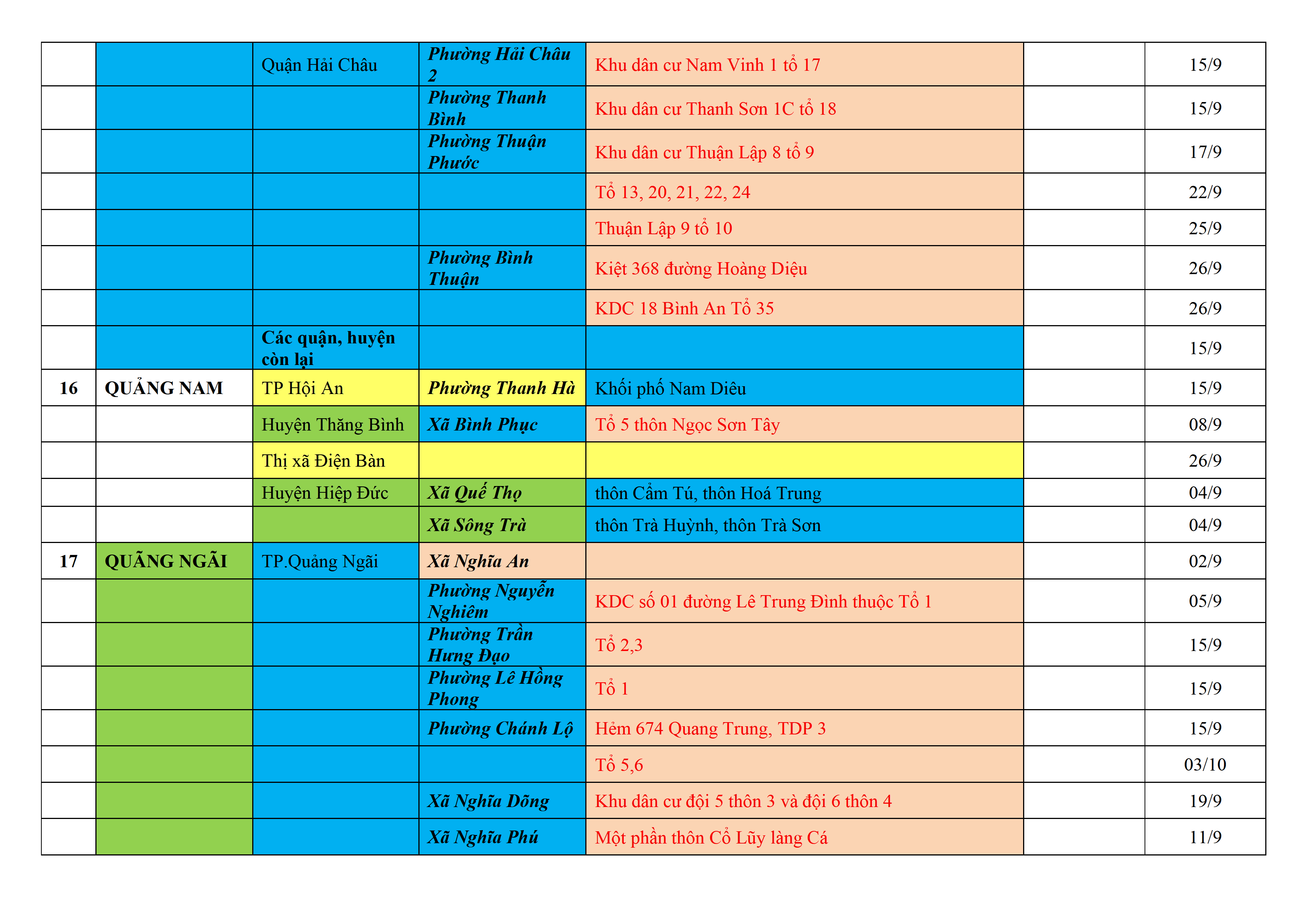 Biện pháp phòng, chống dịch COVID-19: Áp dụng biện pháp tương ứng màu sắc ô cột theo thôn xóm; xã phường; quận huyện; tỉnh thành phố. Cách ly y tế dựa vào việc tiếp xúc, đi đến địa điểm và nơi cư trú có ca bệnh, theo Thông báo của Bộ Y tế, các tỉnh thành phố.