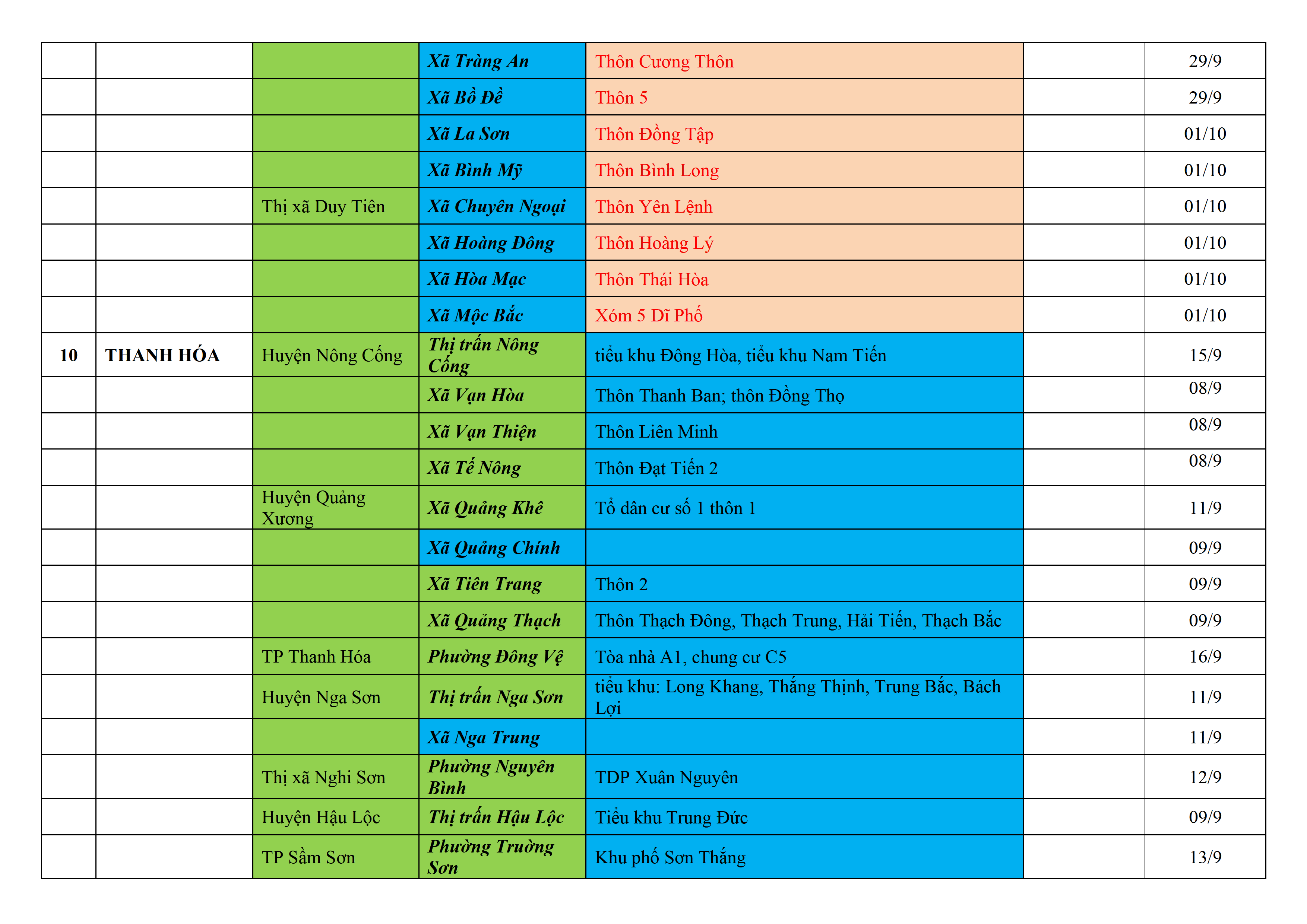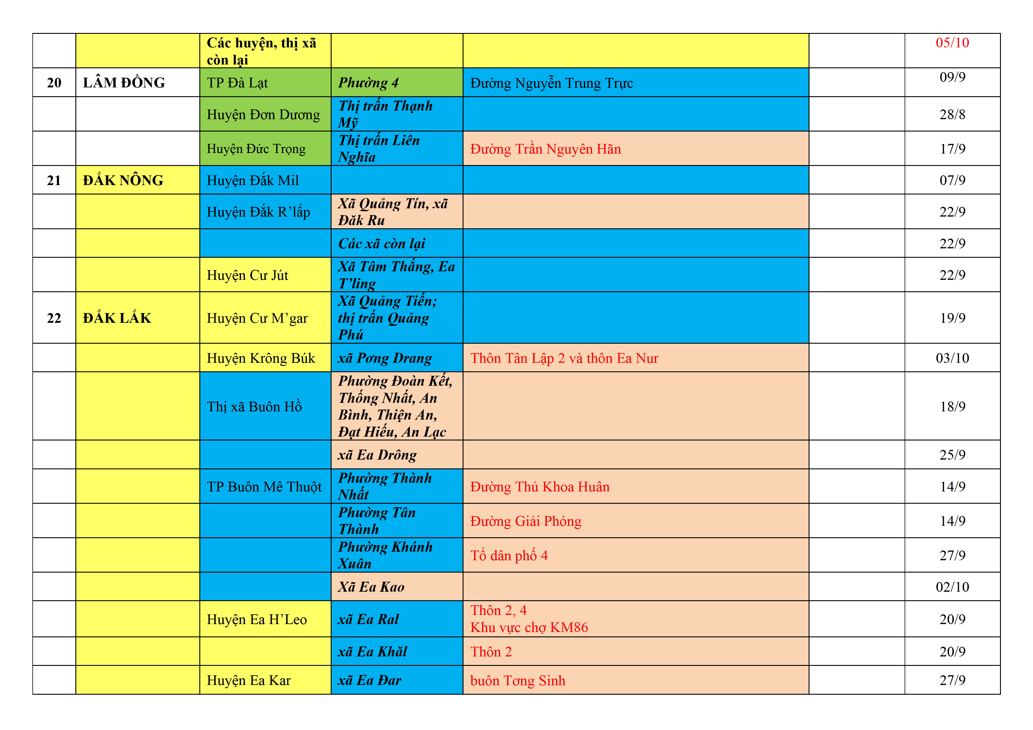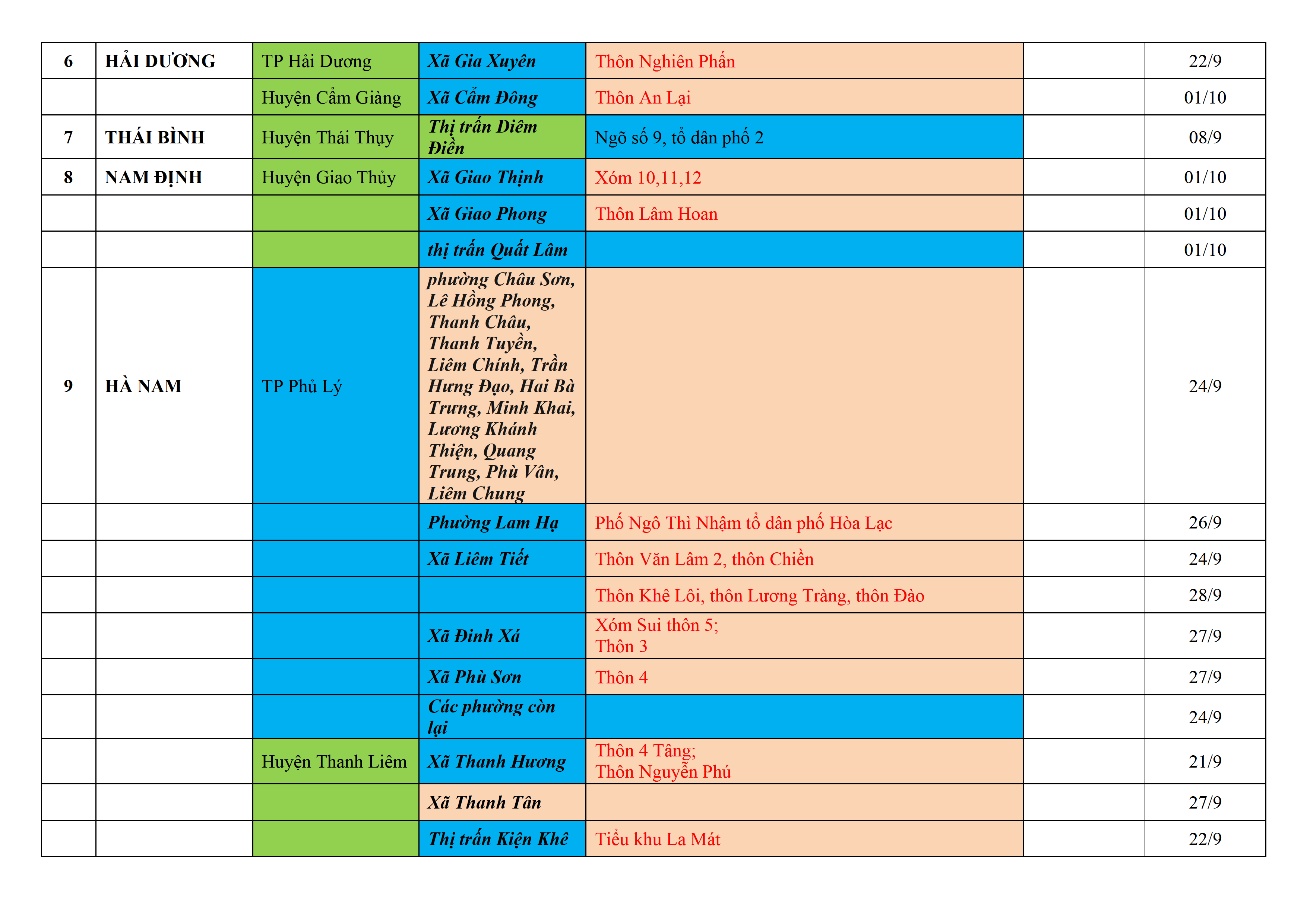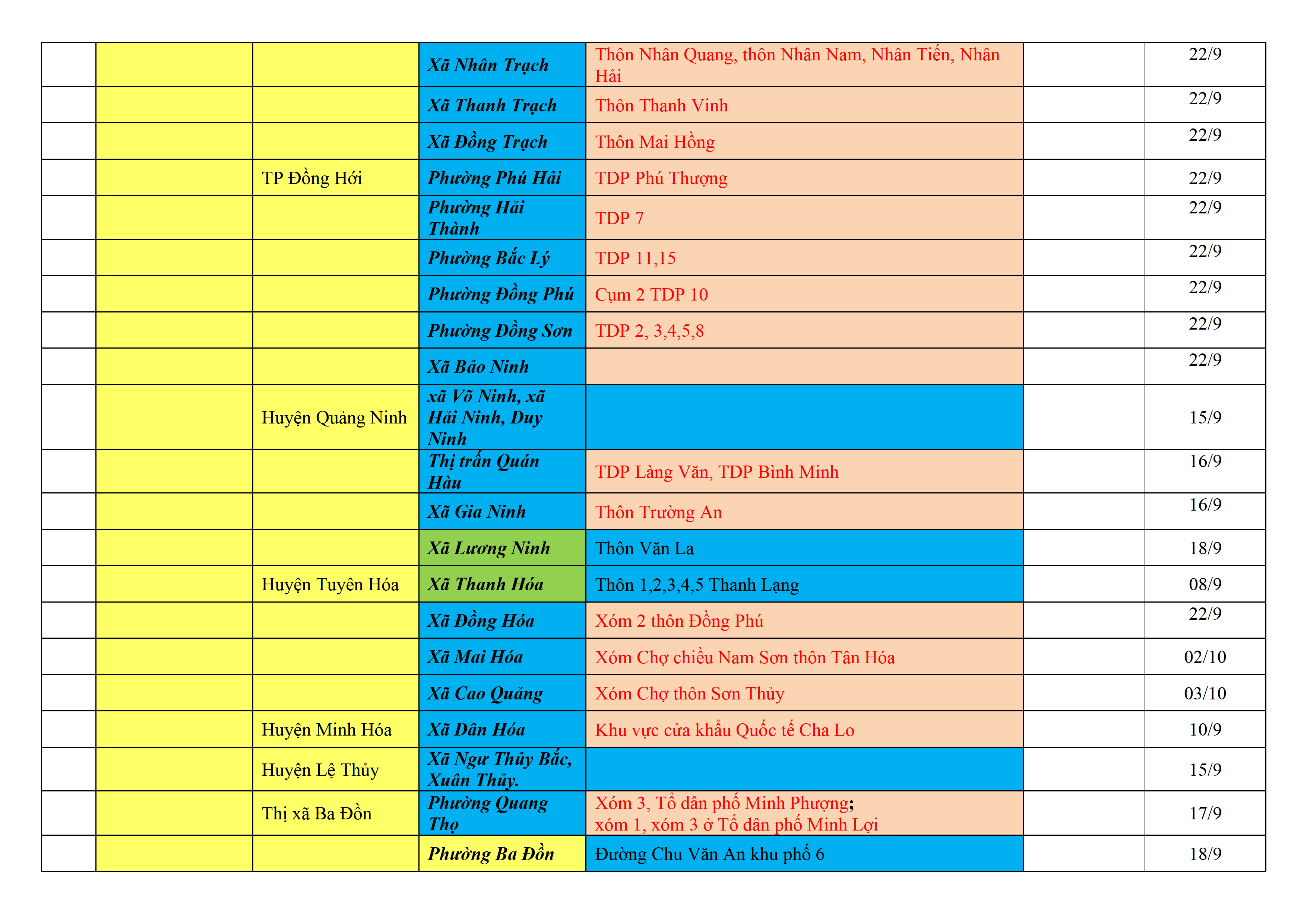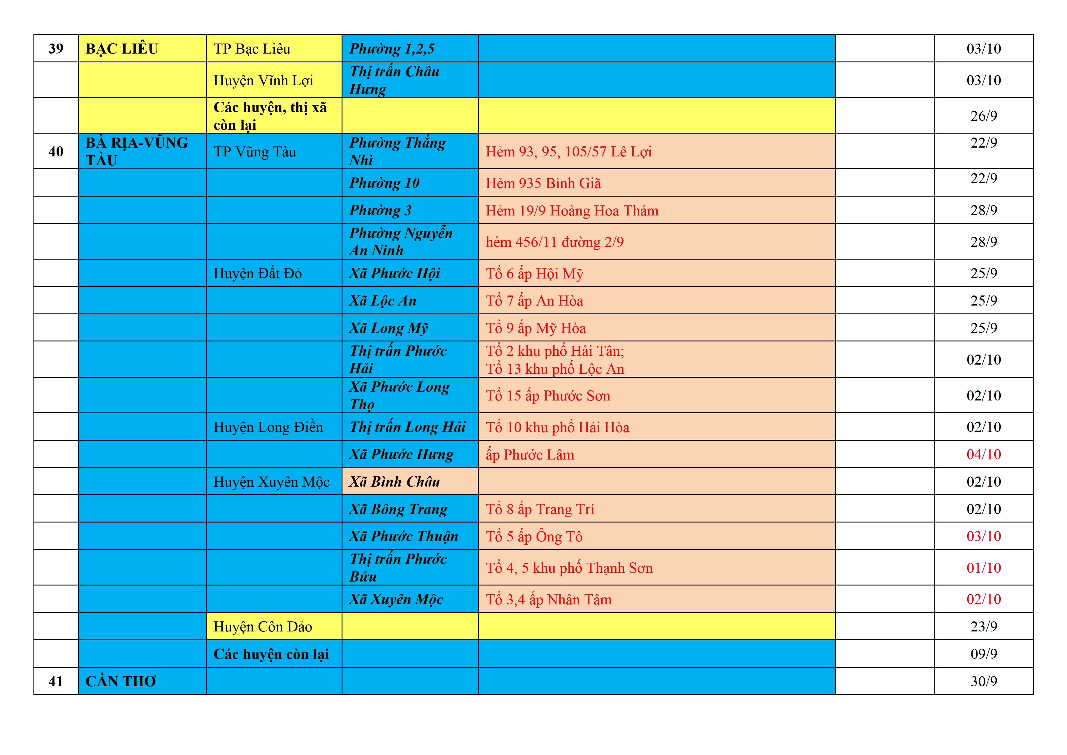 Biện pháp phòng, chống dịch COVID-19: Áp dụng biện pháp tương ứng màu sắc ô cột theo thôn xóm; xã phường; quận huyện; tỉnh thành phố. Cách ly y tế dựa vào việc tiếp xúc, đi đến địa điểm và nơi cư trú có ca bệnh, theo Thông báo của Bộ Y tế, các tỉnh thành phố.
