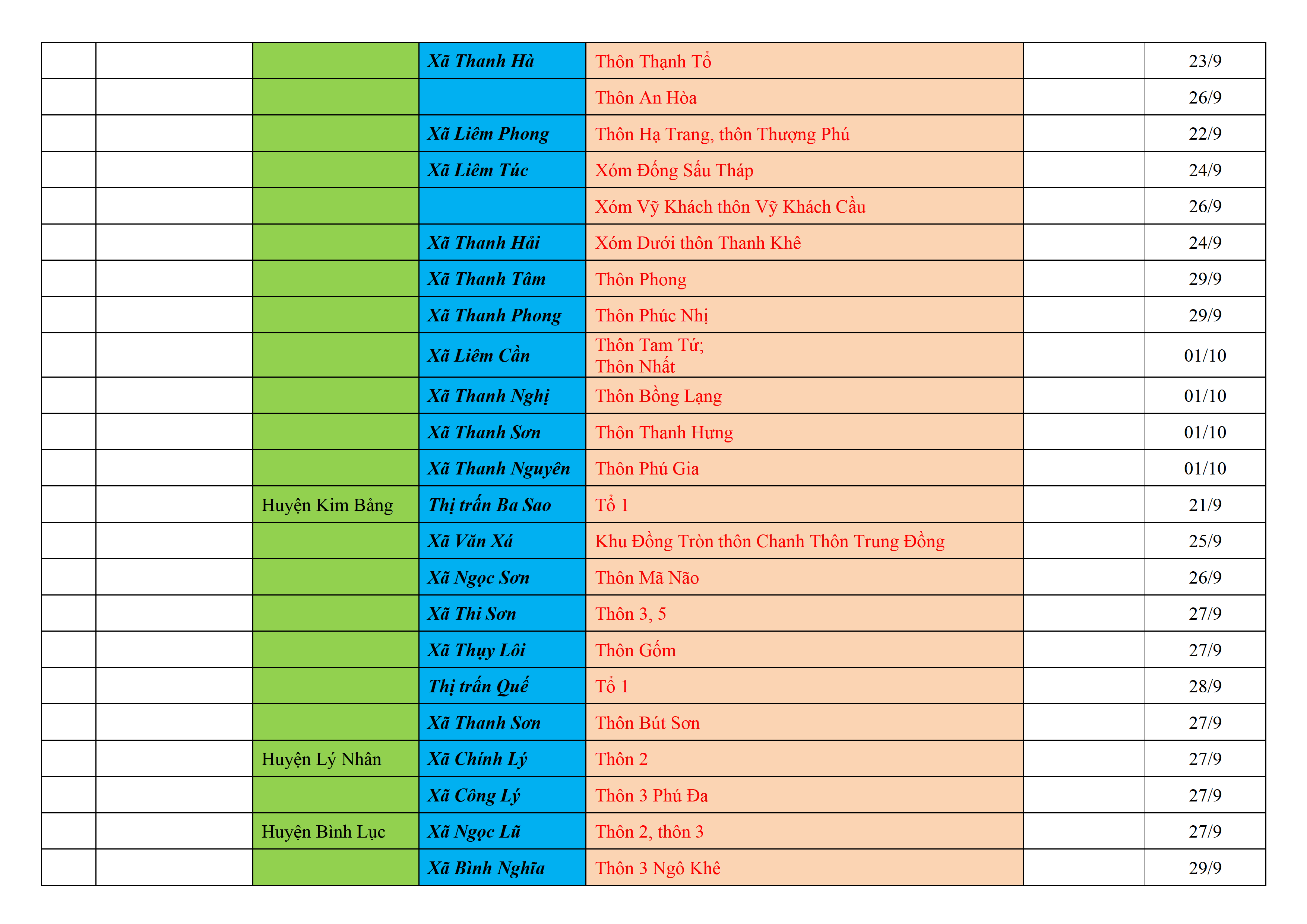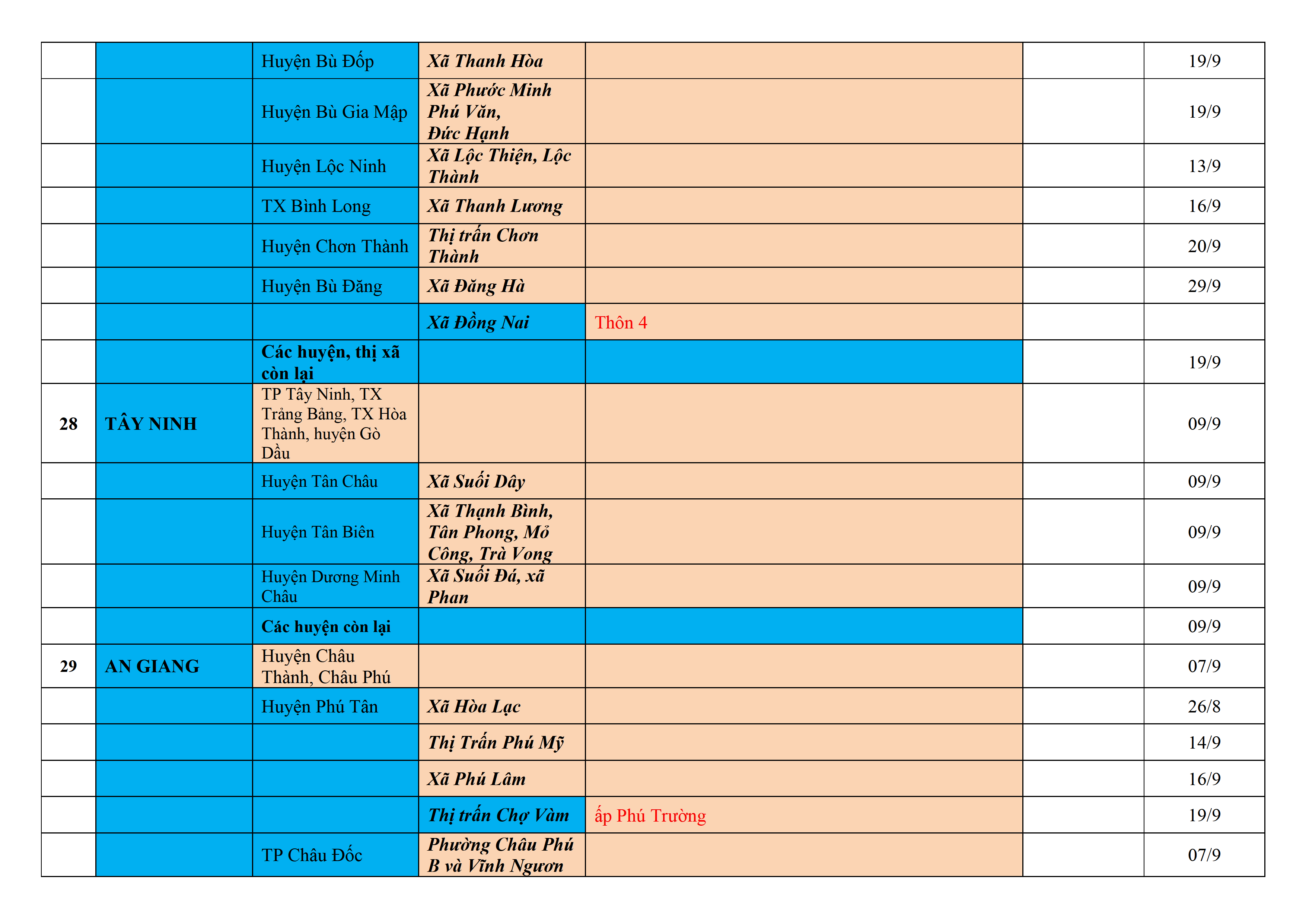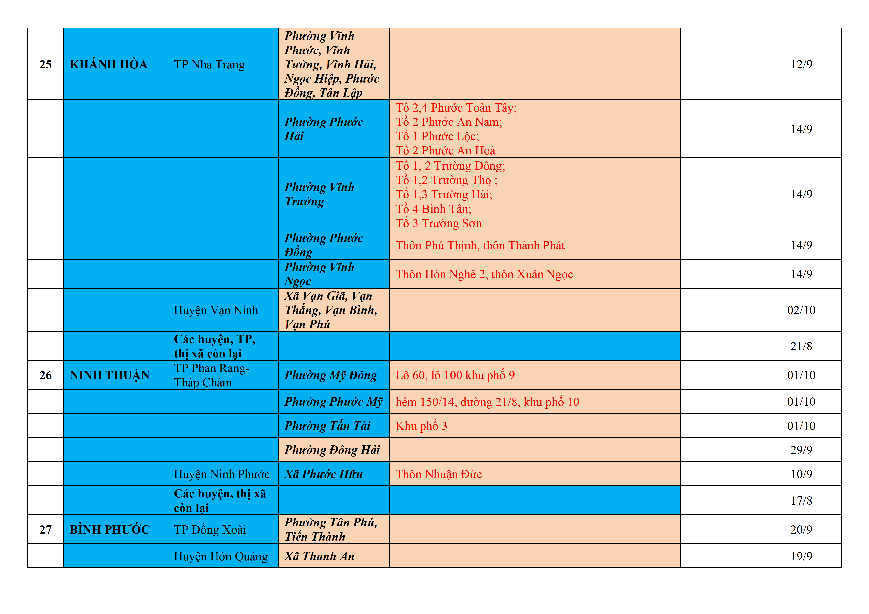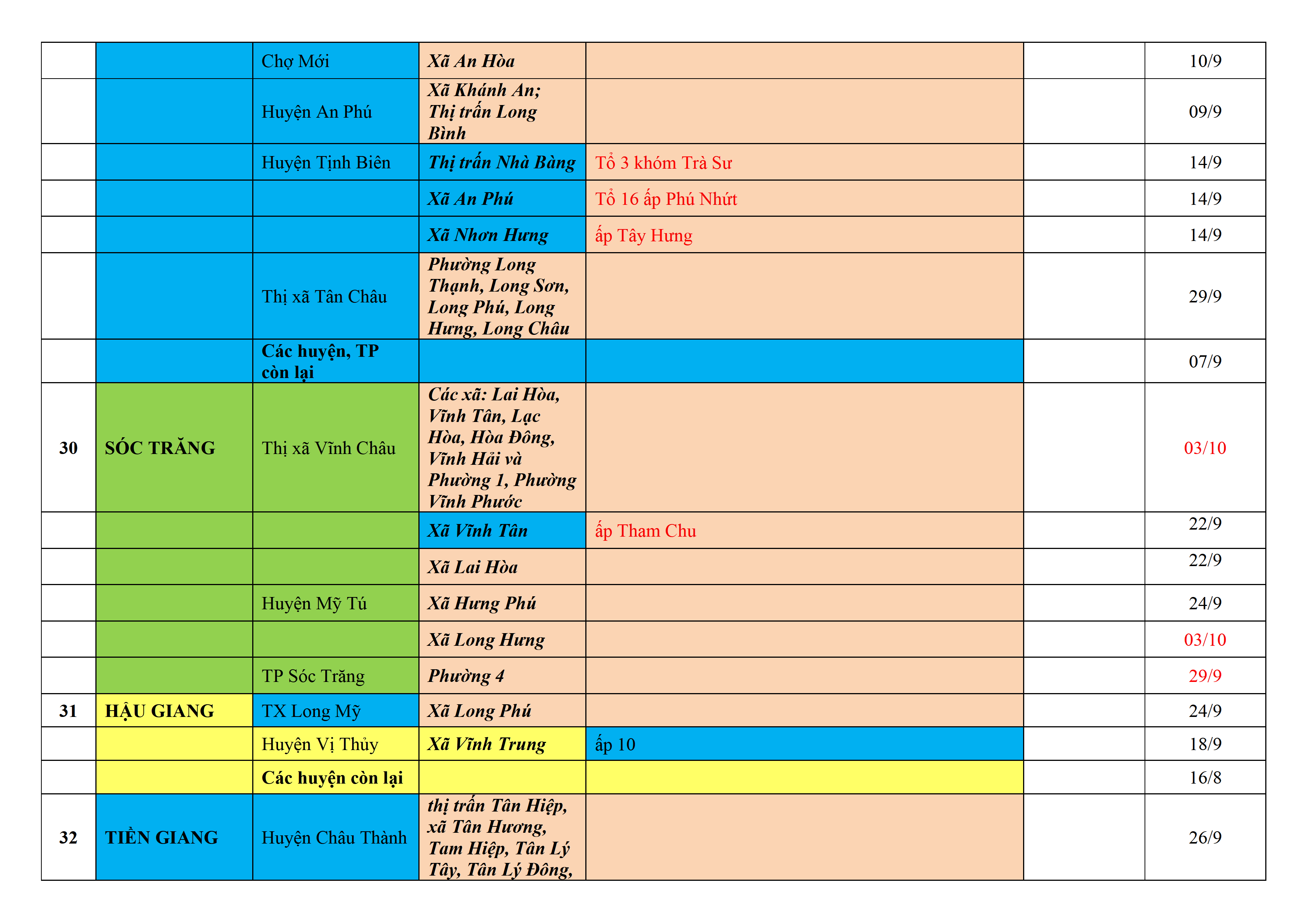 Biện pháp phòng, chống dịch COVID-19: Áp dụng biện pháp tương ứng màu sắc ô cột theo thôn xóm; xã phường; quận huyện; tỉnh thành phố. Cách ly y tế dựa vào việc tiếp xúc, đi đến địa điểm và nơi cư trú có ca bệnh, theo Thông báo của Bộ Y tế, các tỉnh thành phố.