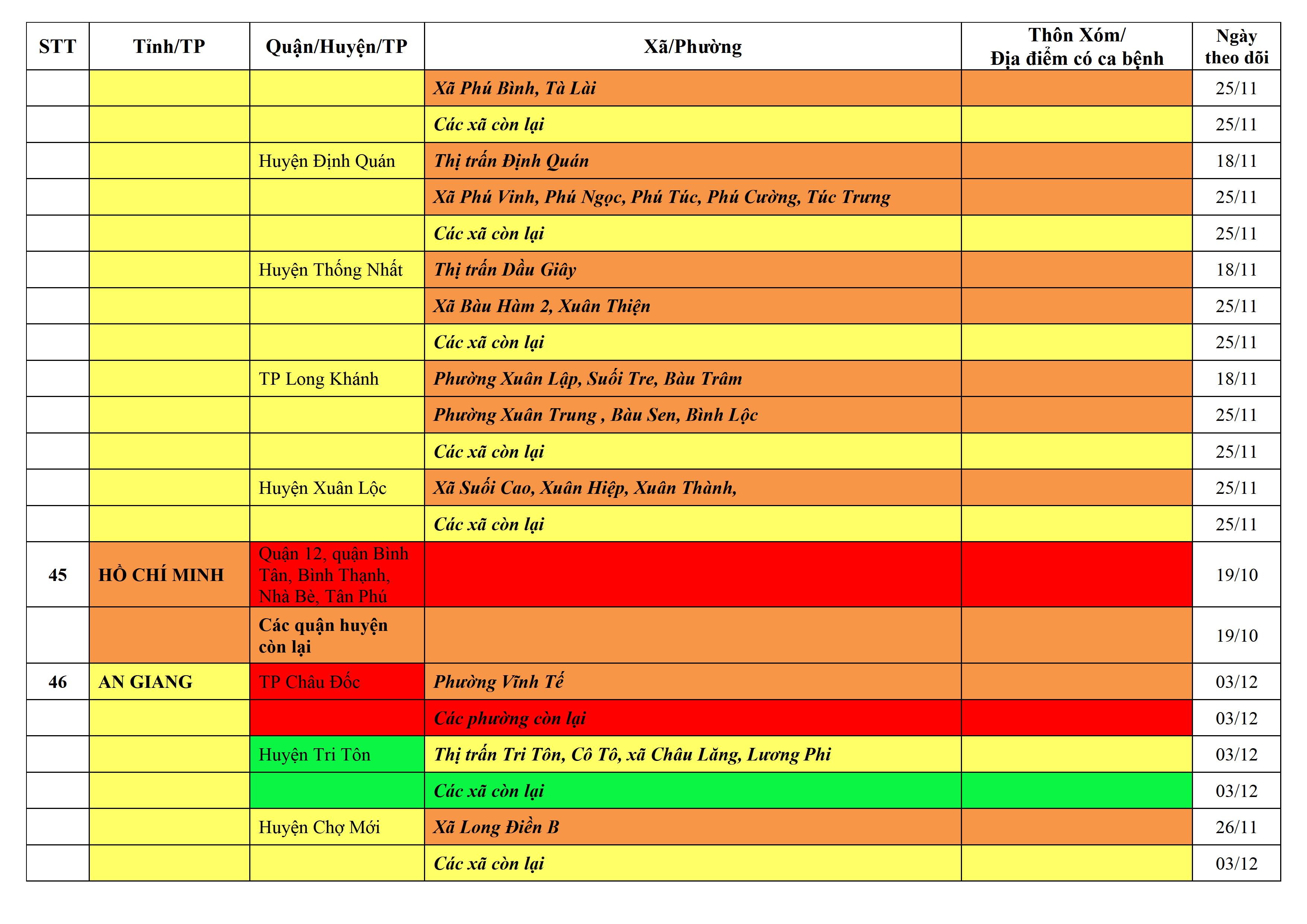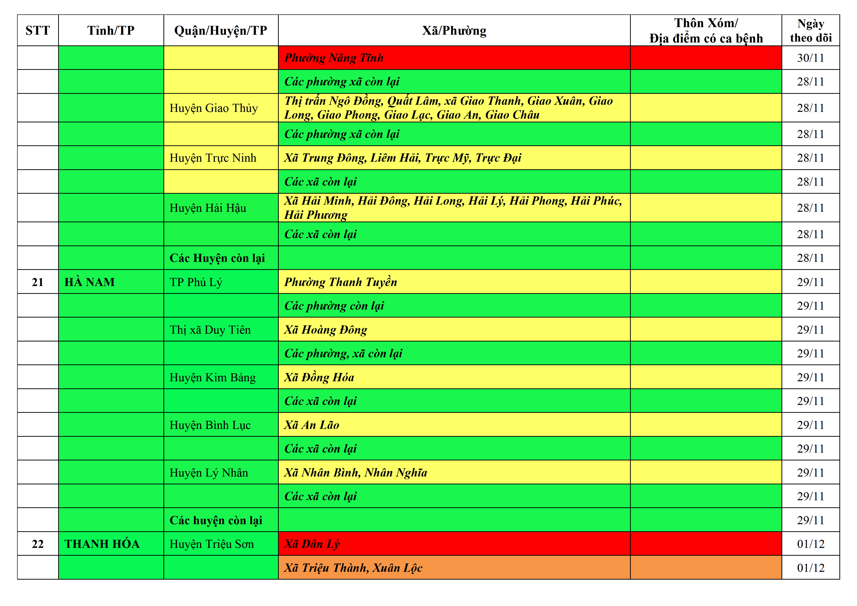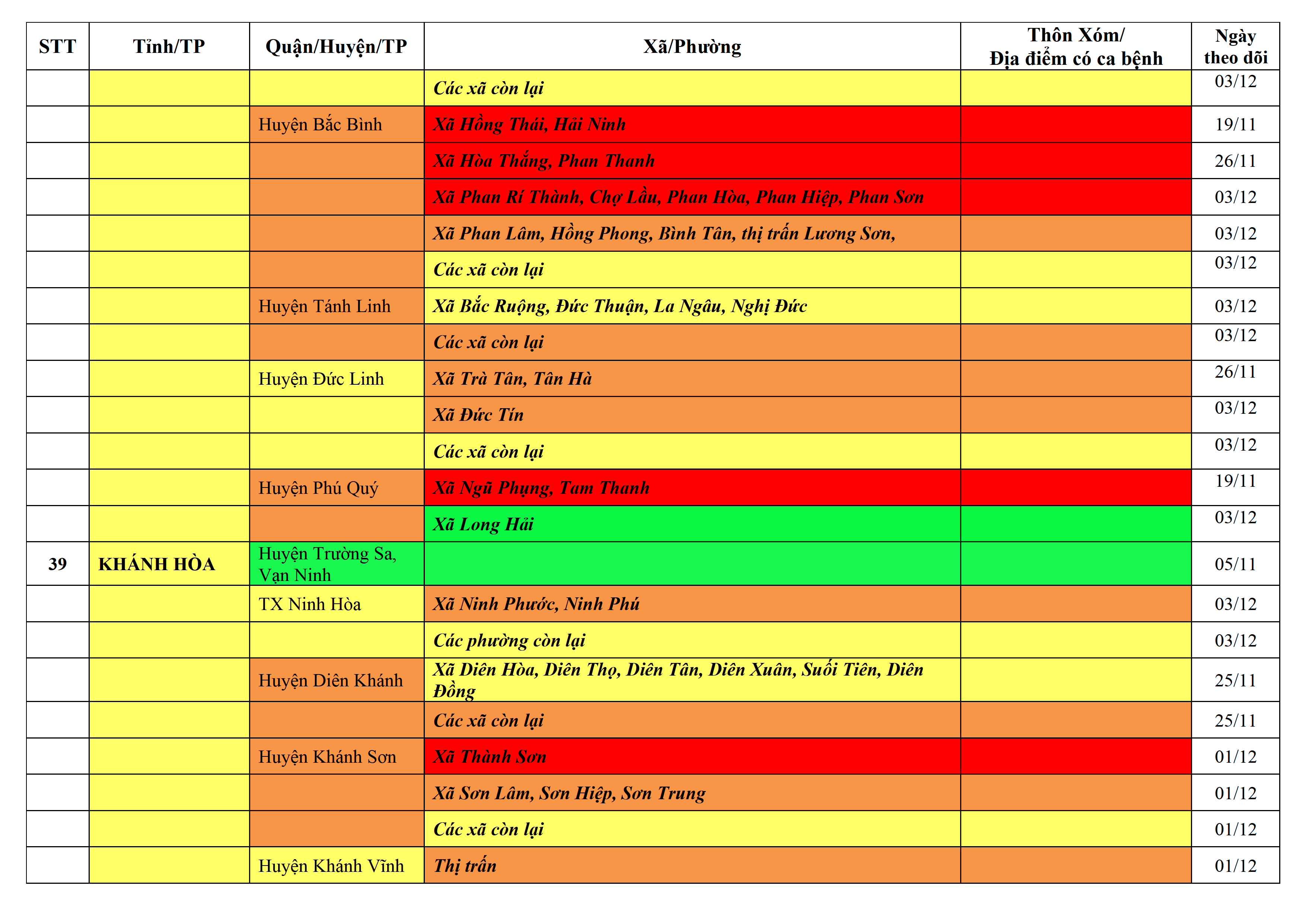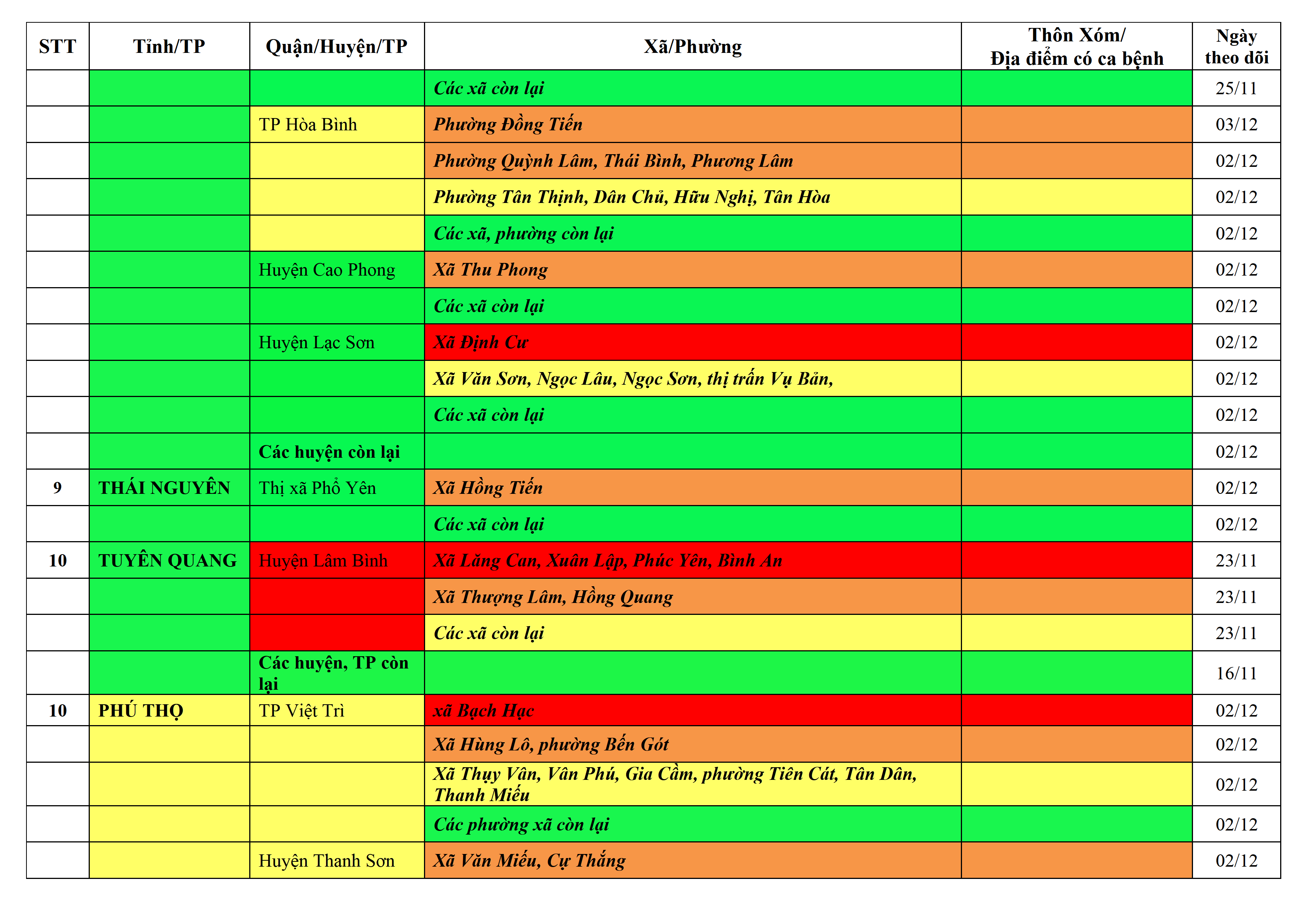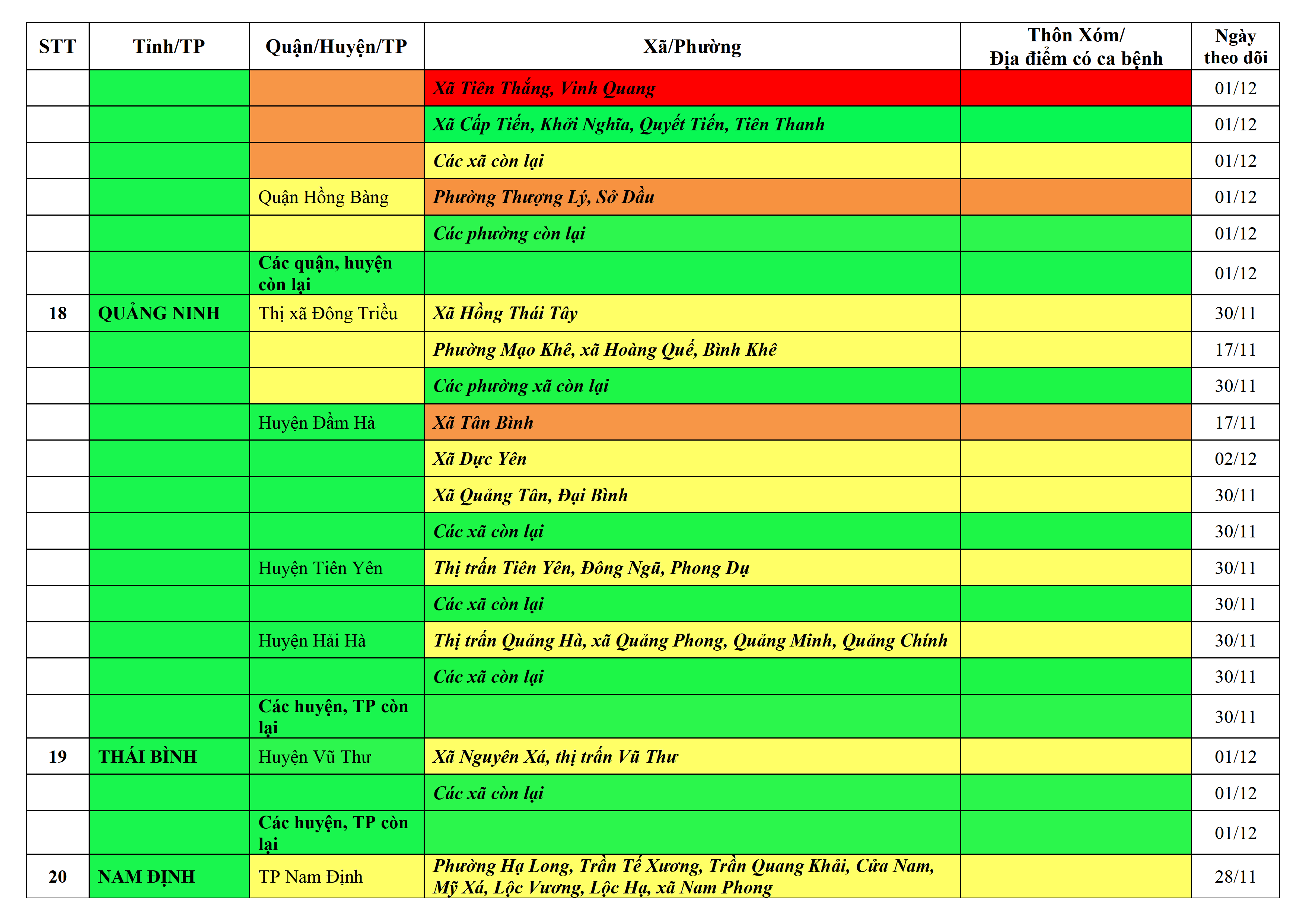 Lưu ý: Các tỉnh, thành phố không có tên trong bảng màu, đi lại bình thường, tuân thủ các biện pháp phòng chống dịch theo chỉ đạo của Bộ Y tế; khai báo y tế, thực hiện nghiêm 5K.