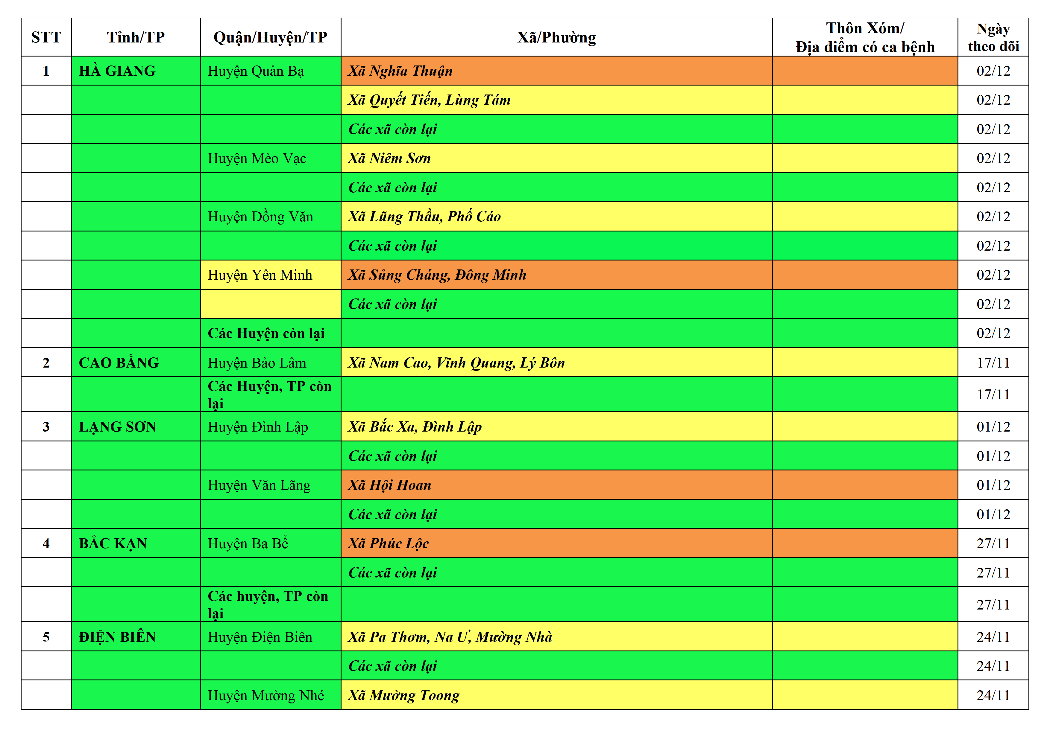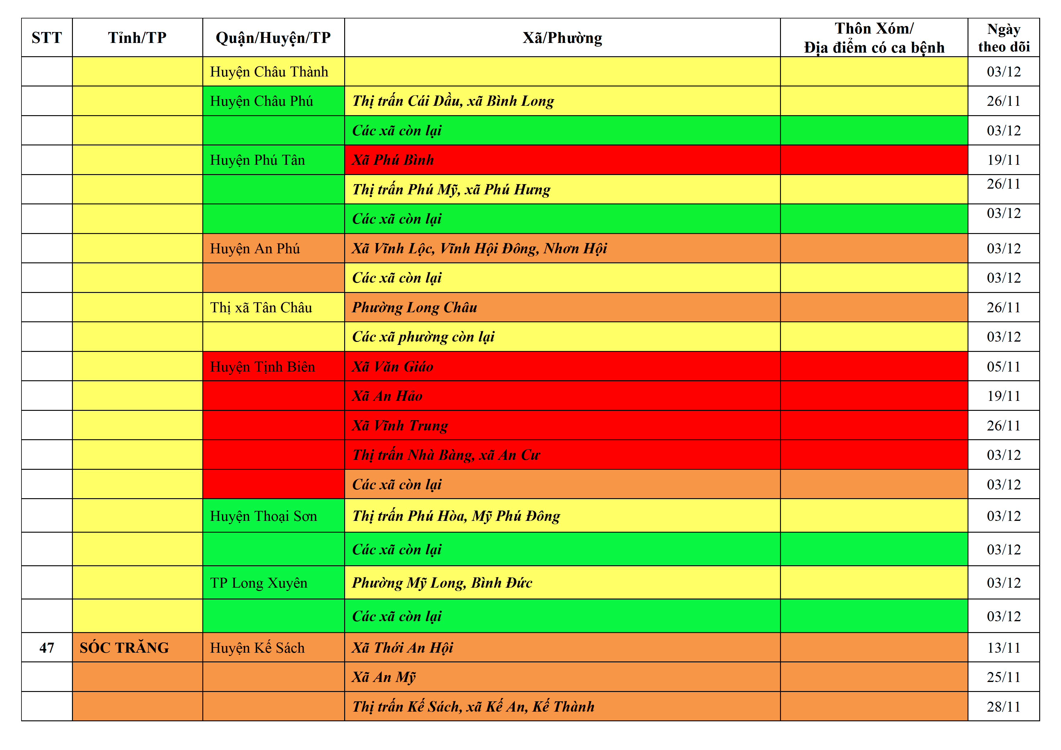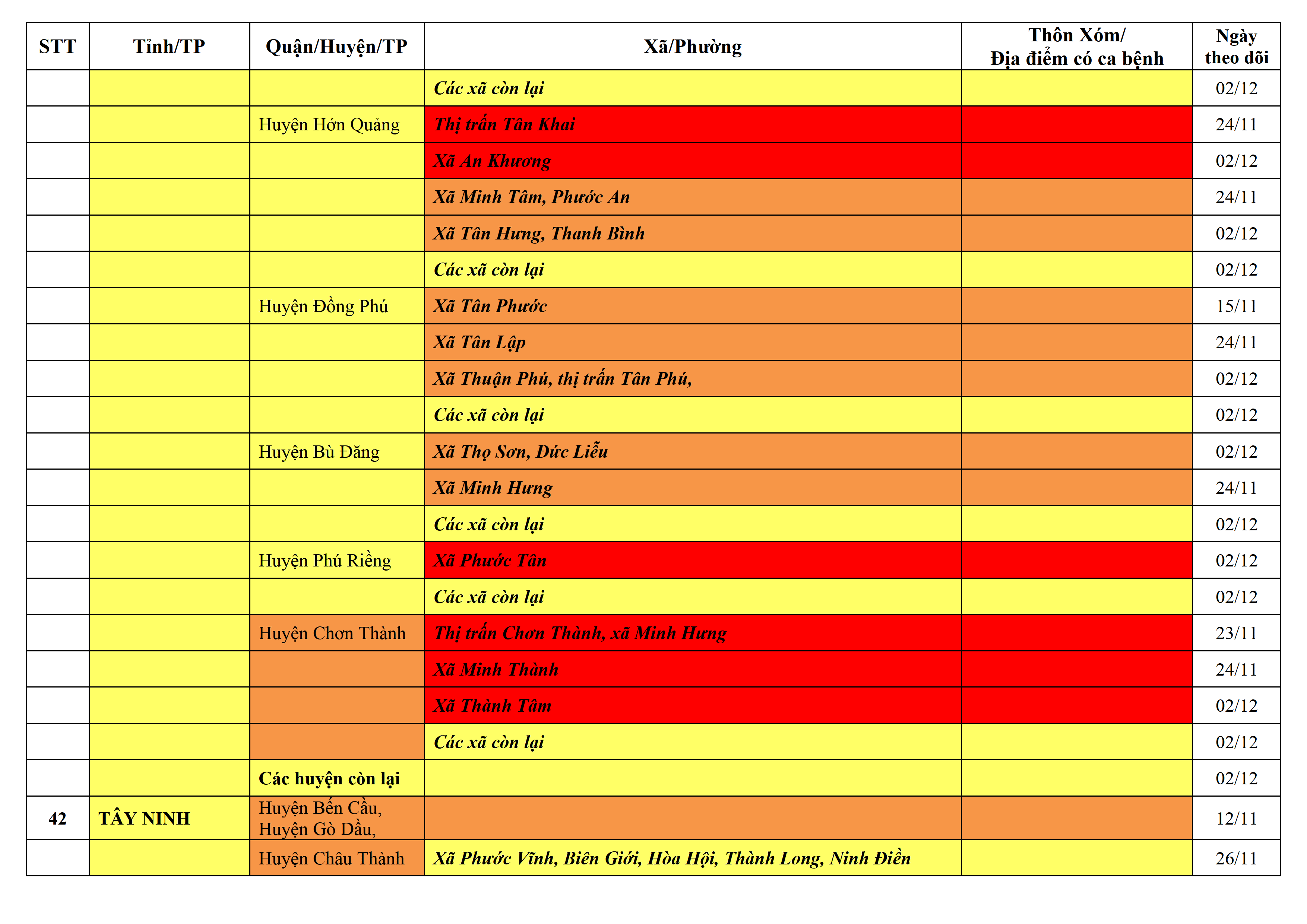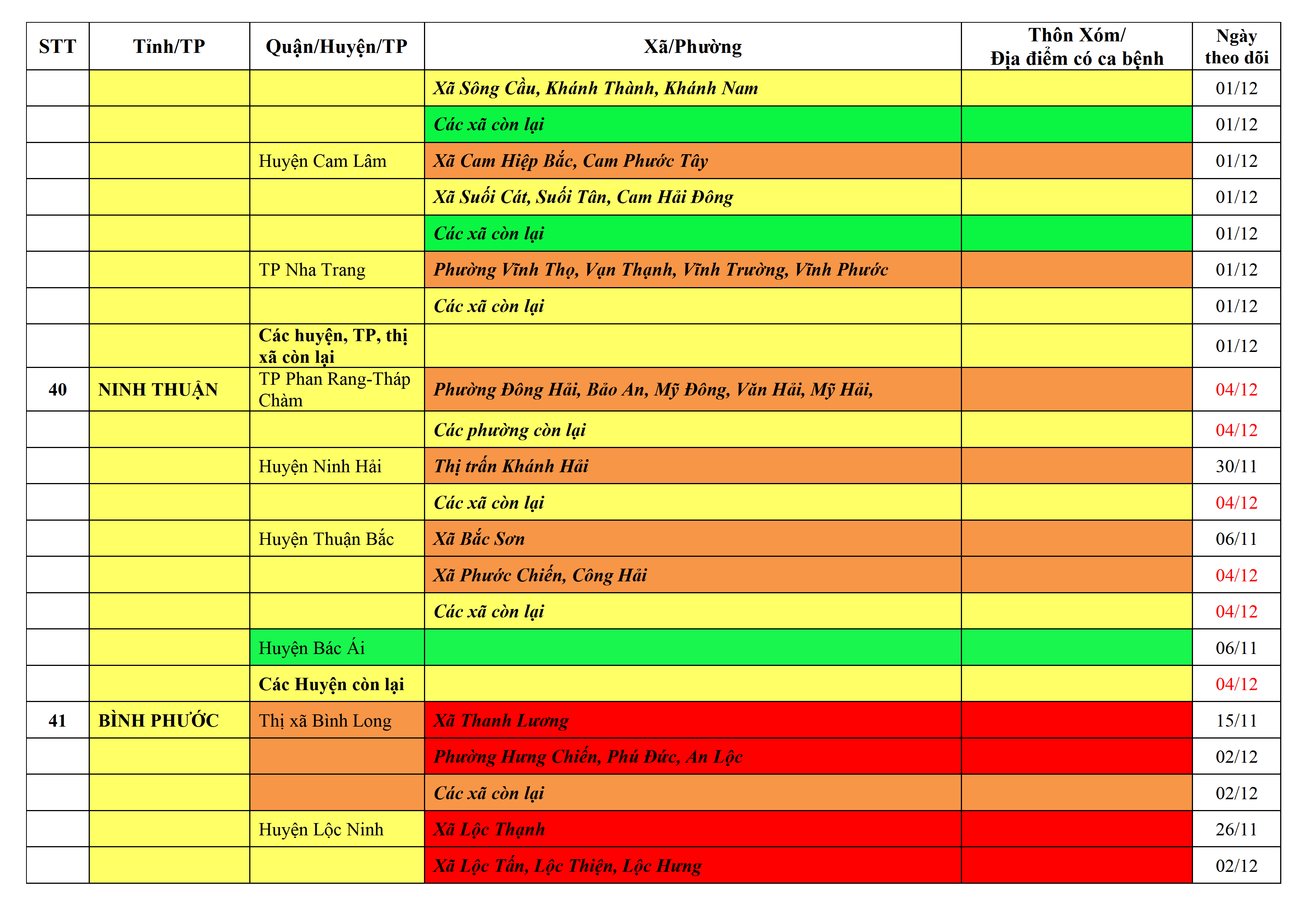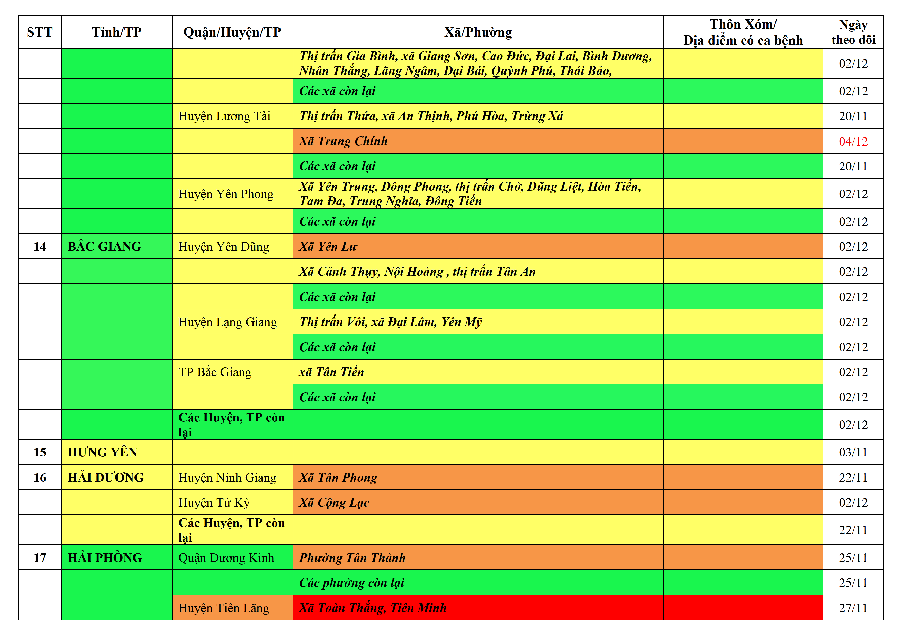 Lưu ý: Các tỉnh, thành phố không có tên trong bảng màu, đi lại bình thường, tuân thủ các biện pháp phòng chống dịch theo chỉ đạo của Bộ Y tế; khai báo y tế, thực hiện nghiêm 5K.