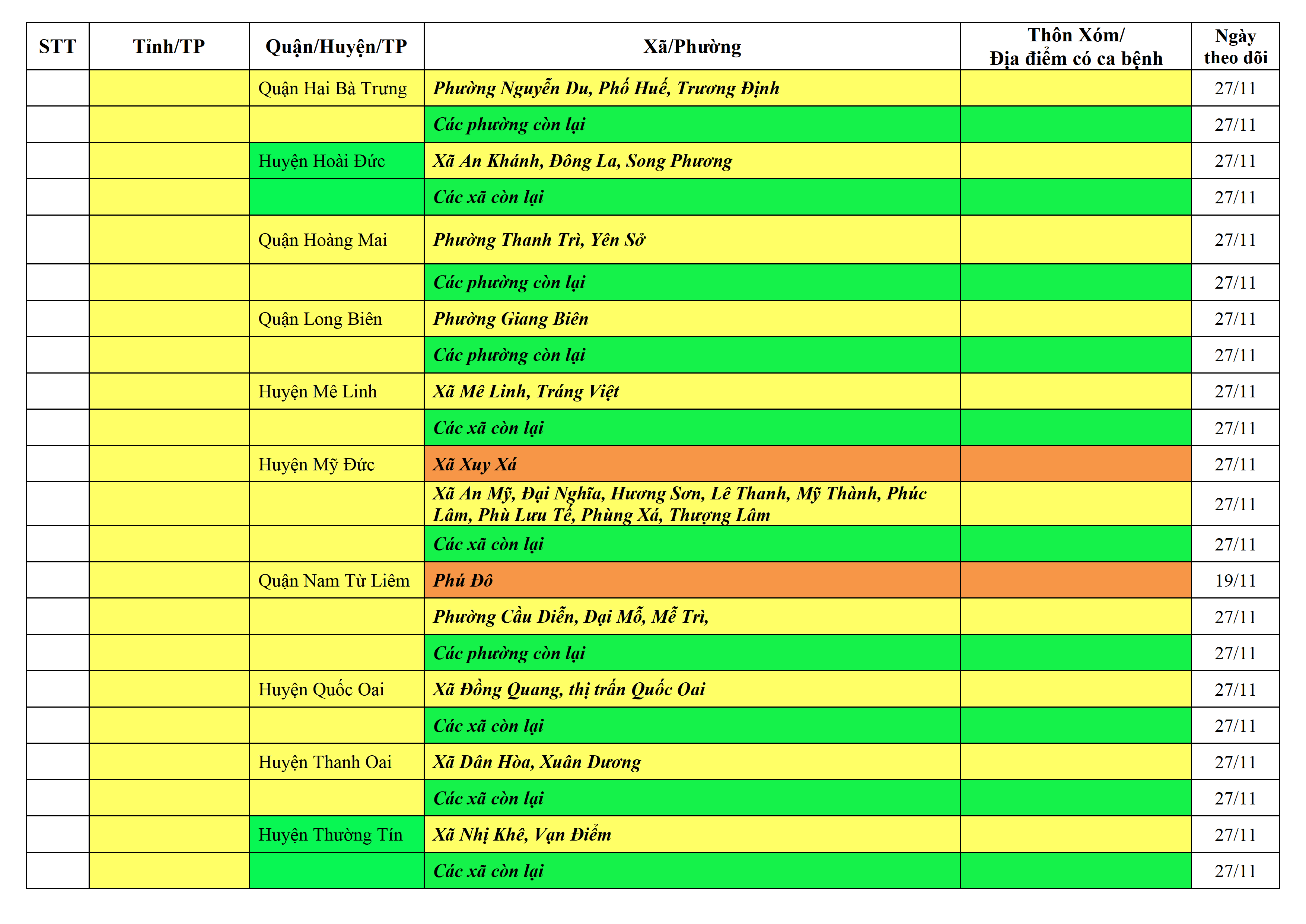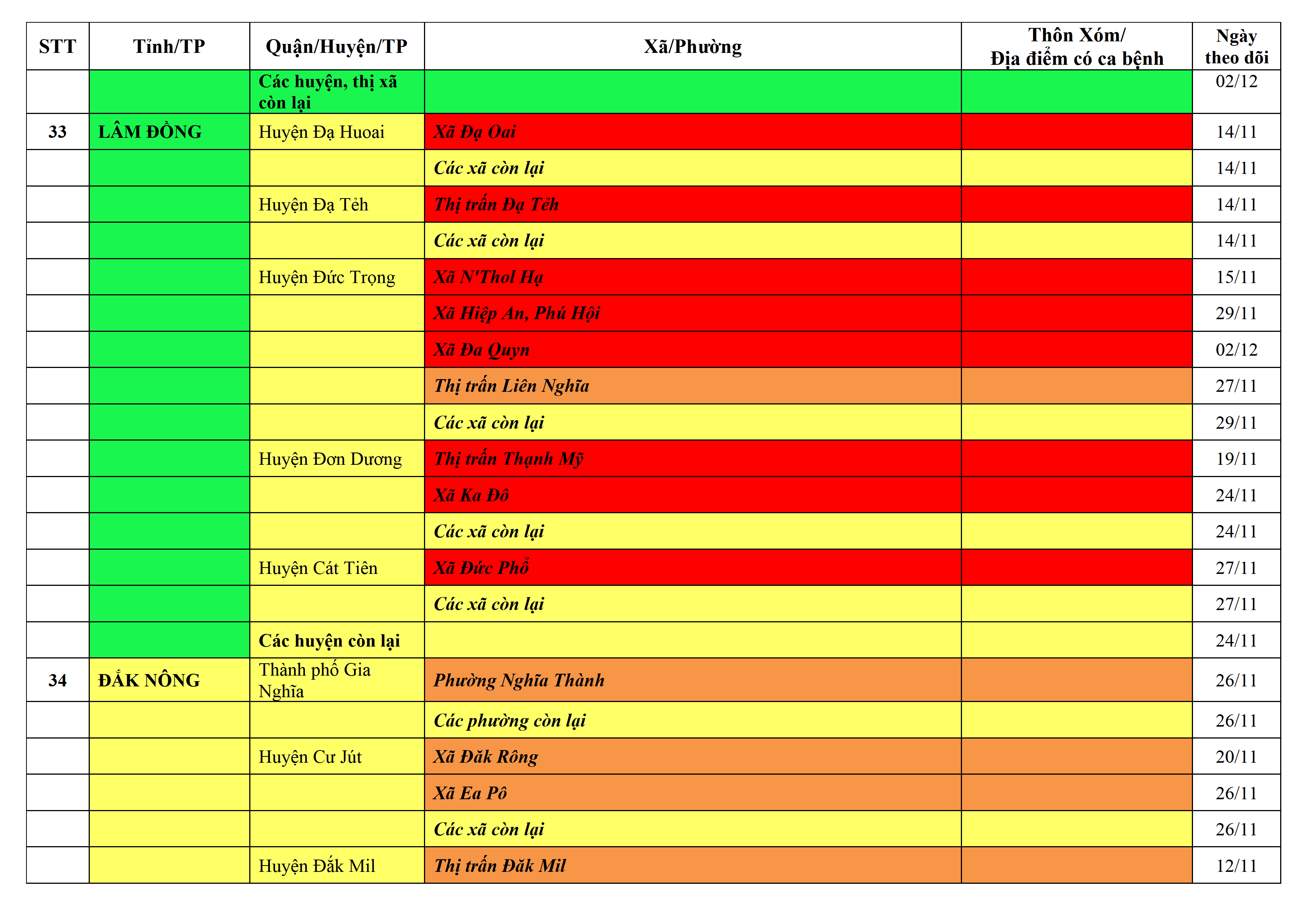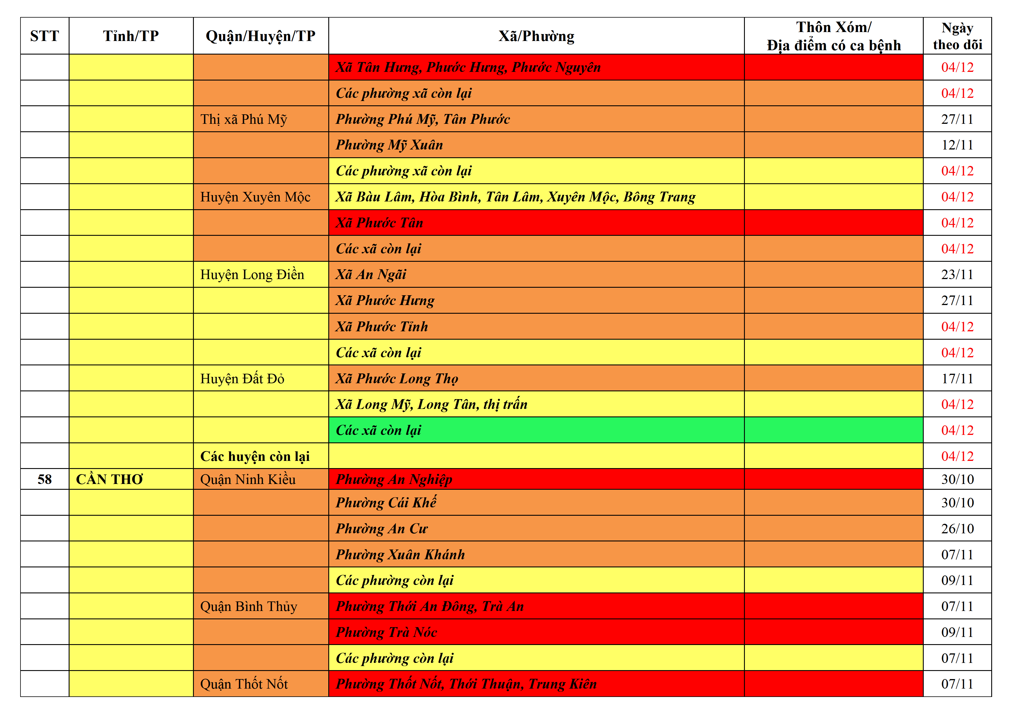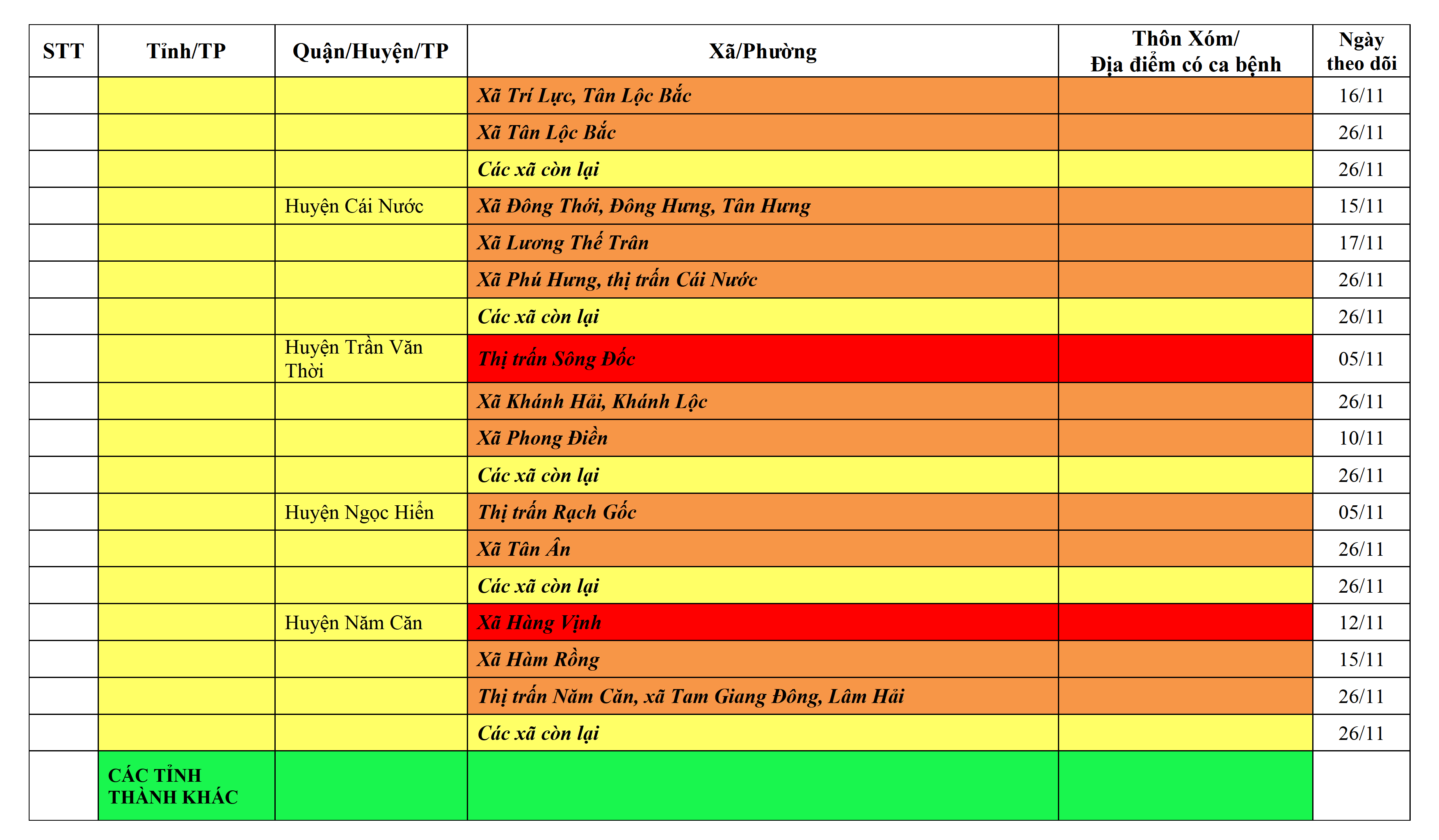 Lưu ý: Các tỉnh, thành phố không có tên trong bảng màu, đi lại bình thường, tuân thủ các biện pháp phòng chống dịch theo chỉ đạo của Bộ Y tế; khai báo y tế, thực hiện nghiêm 5K.