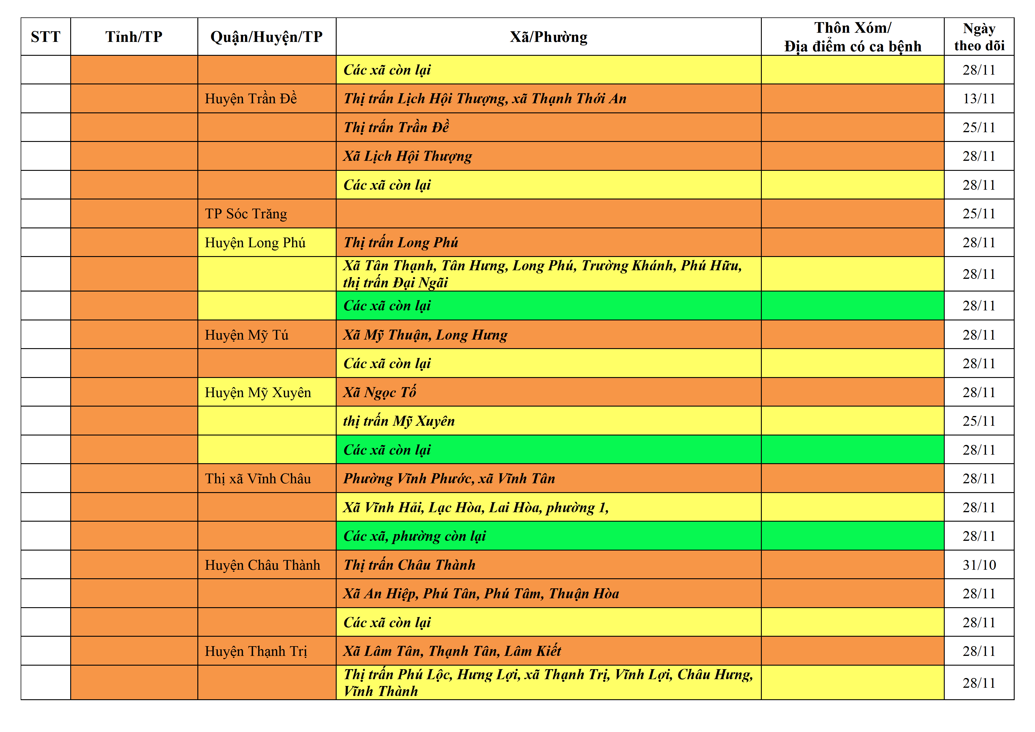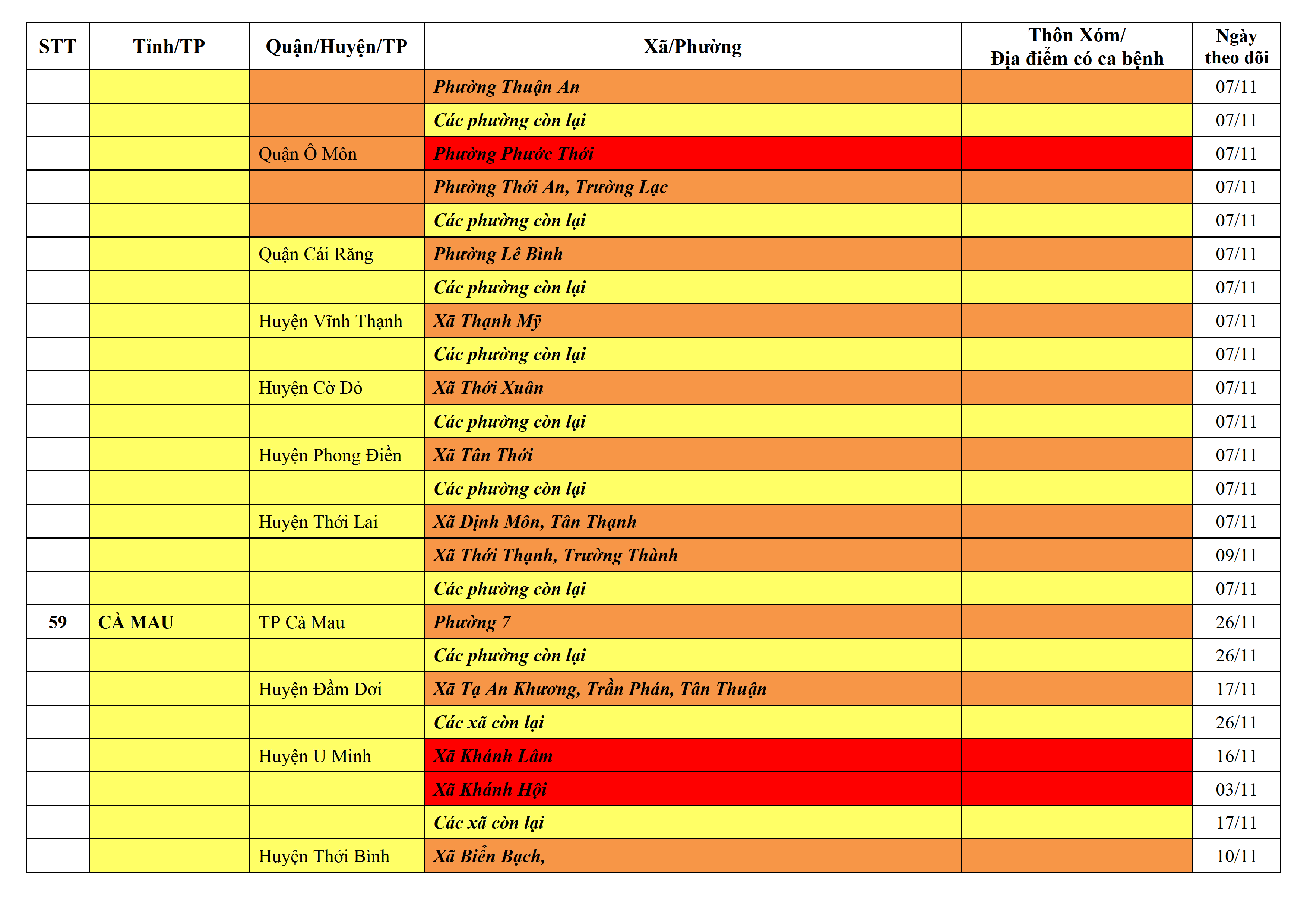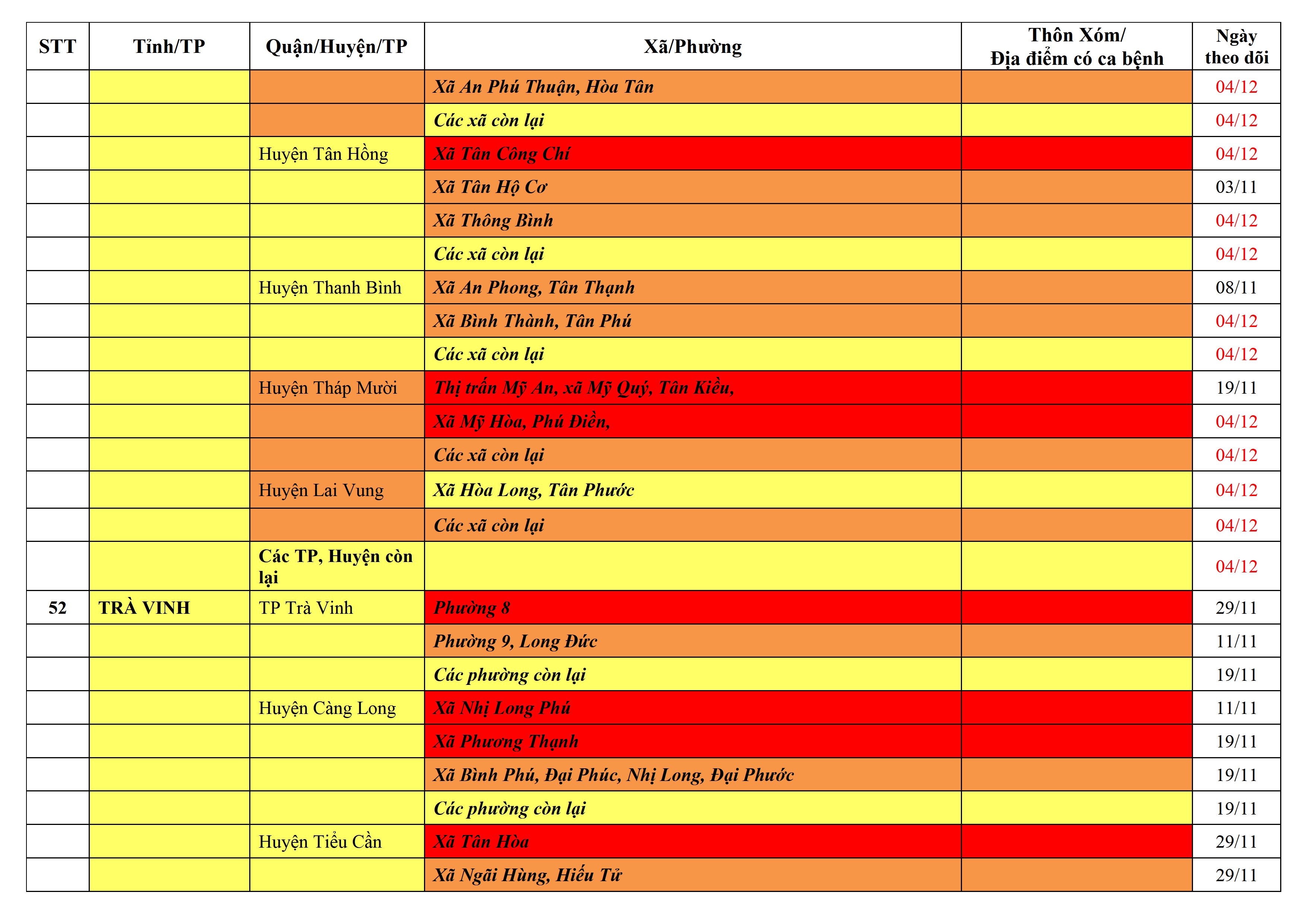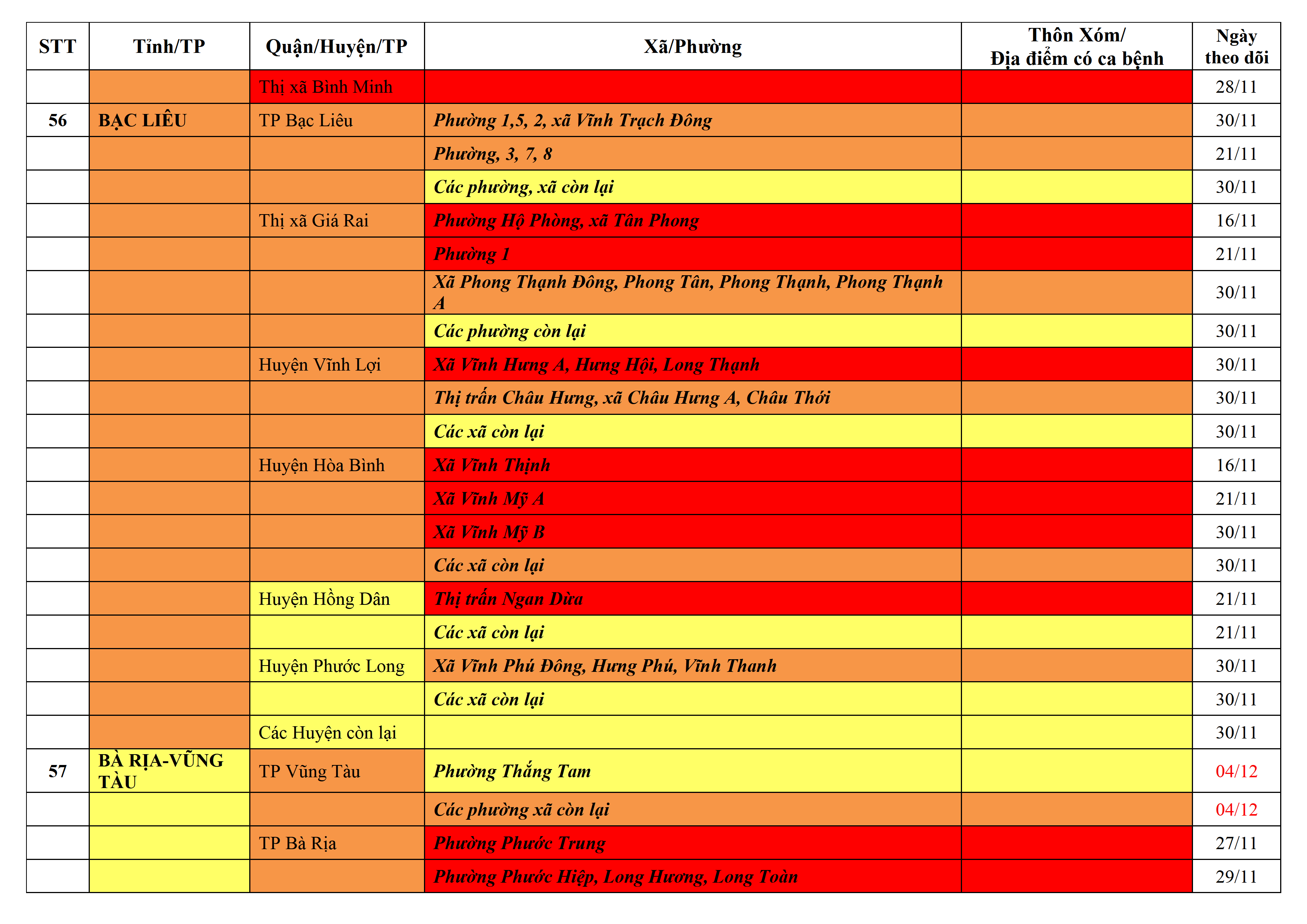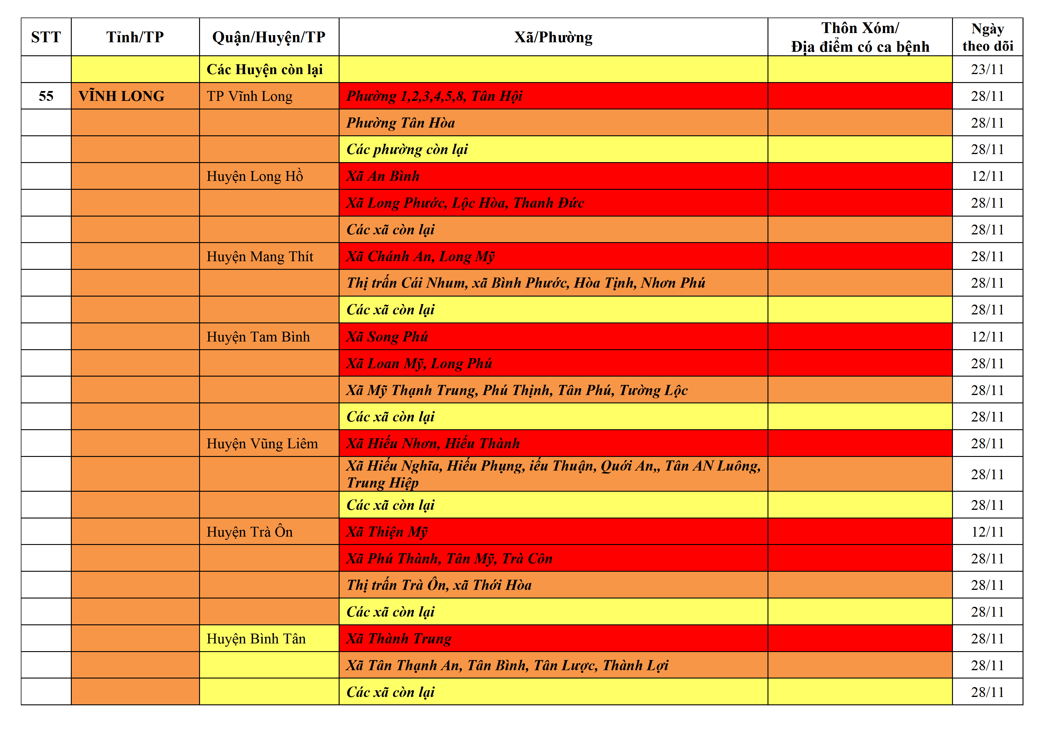 Lưu ý: Các tỉnh, thành phố không có tên trong bảng màu, đi lại bình thường, tuân thủ các biện pháp phòng chống dịch theo chỉ đạo của Bộ Y tế; khai báo y tế, thực hiện nghiêm 5K.