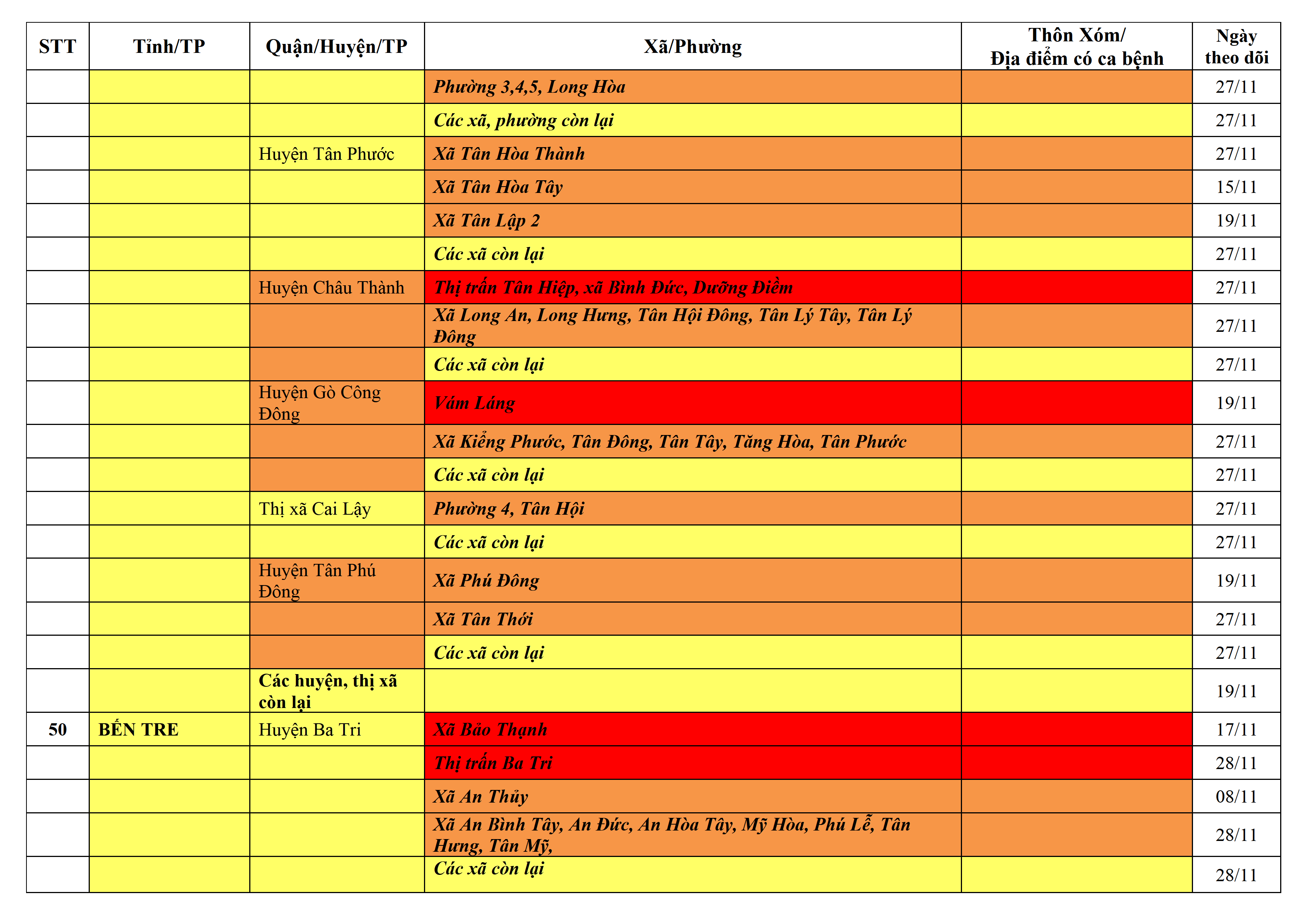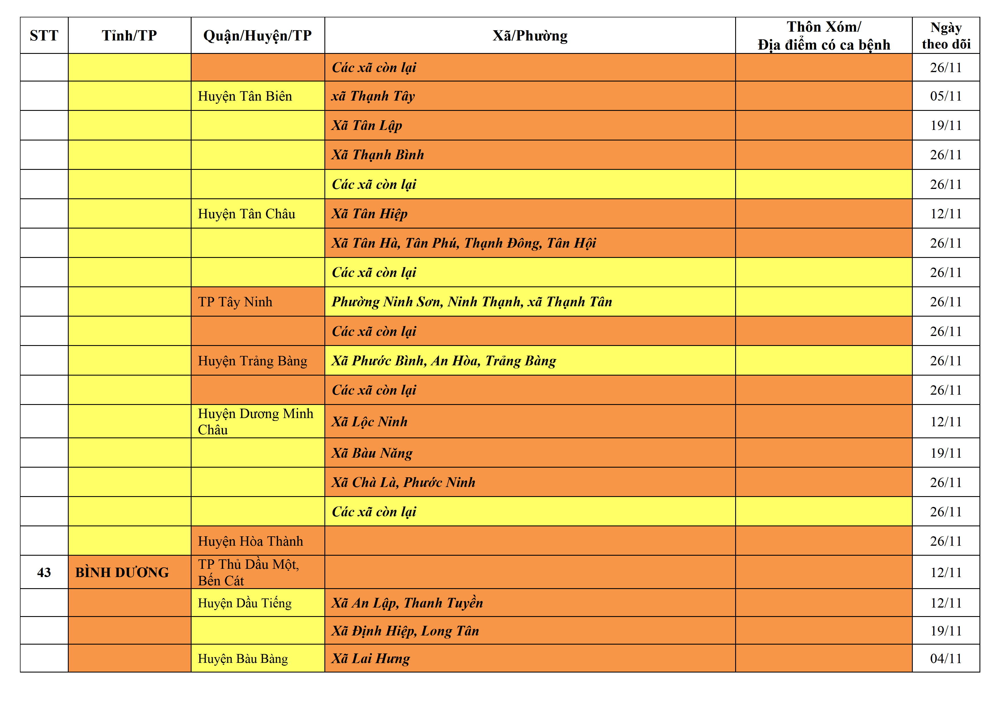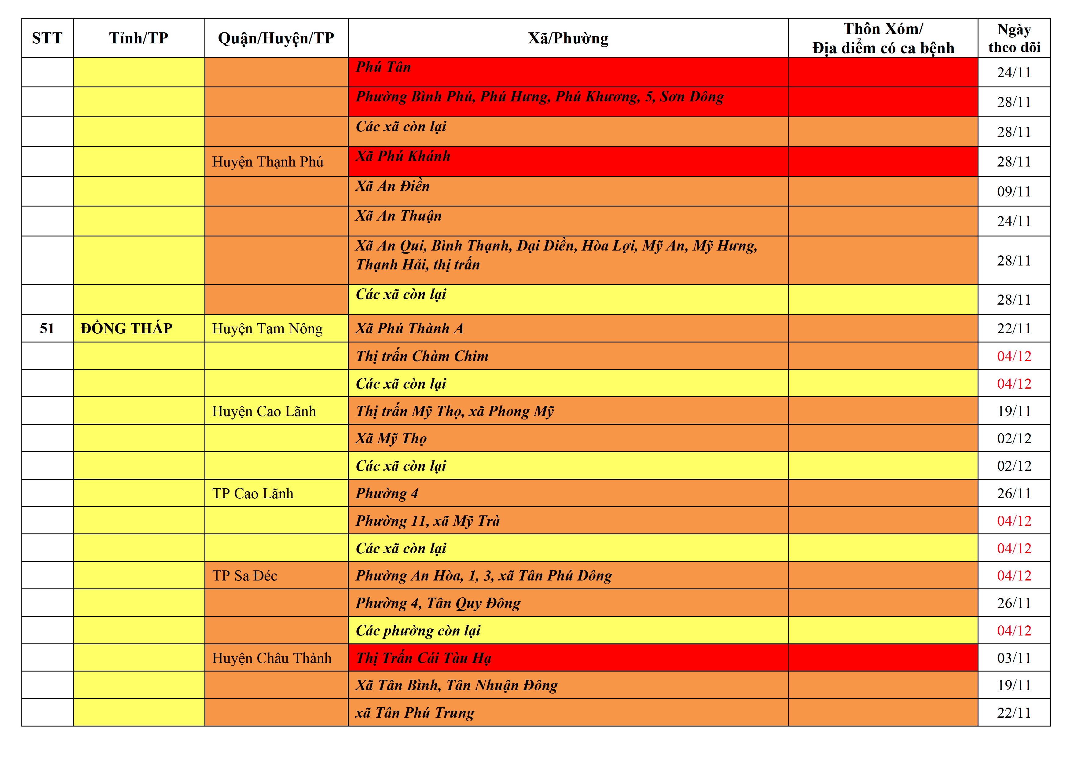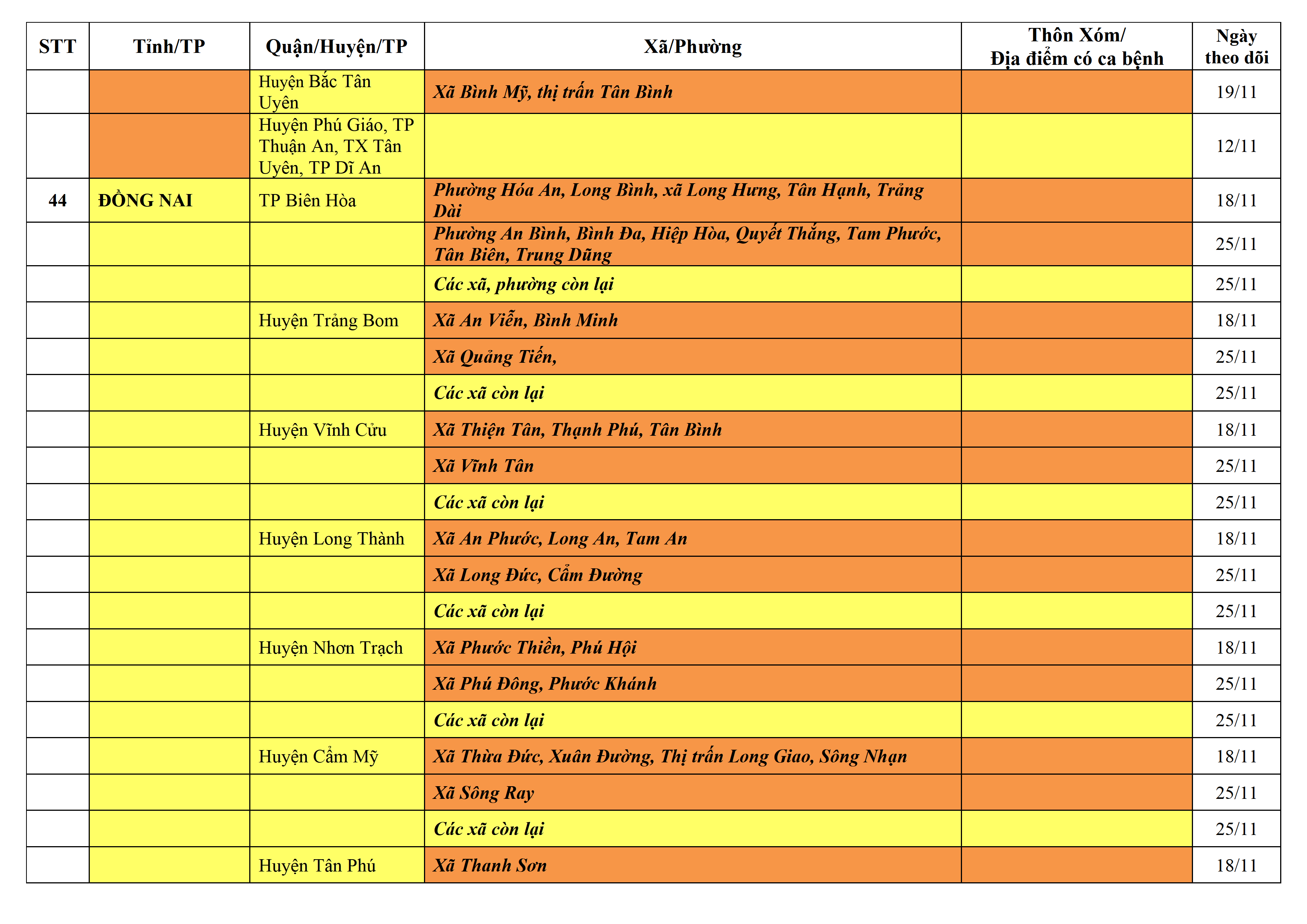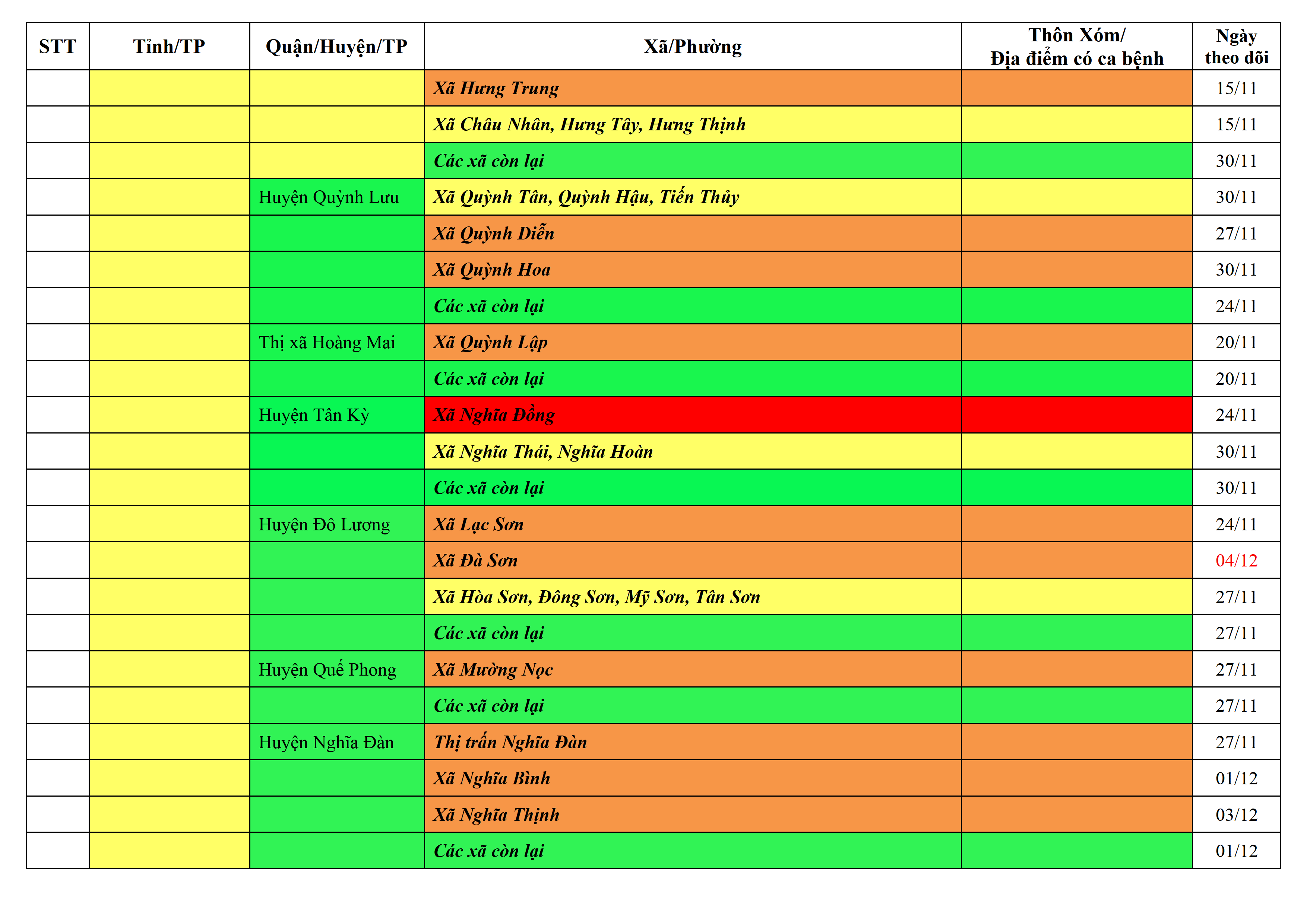 Lưu ý: Các tỉnh, thành phố không có tên trong bảng màu, đi lại bình thường, tuân thủ các biện pháp phòng chống dịch theo chỉ đạo của Bộ Y tế; khai báo y tế, thực hiện nghiêm 5K.