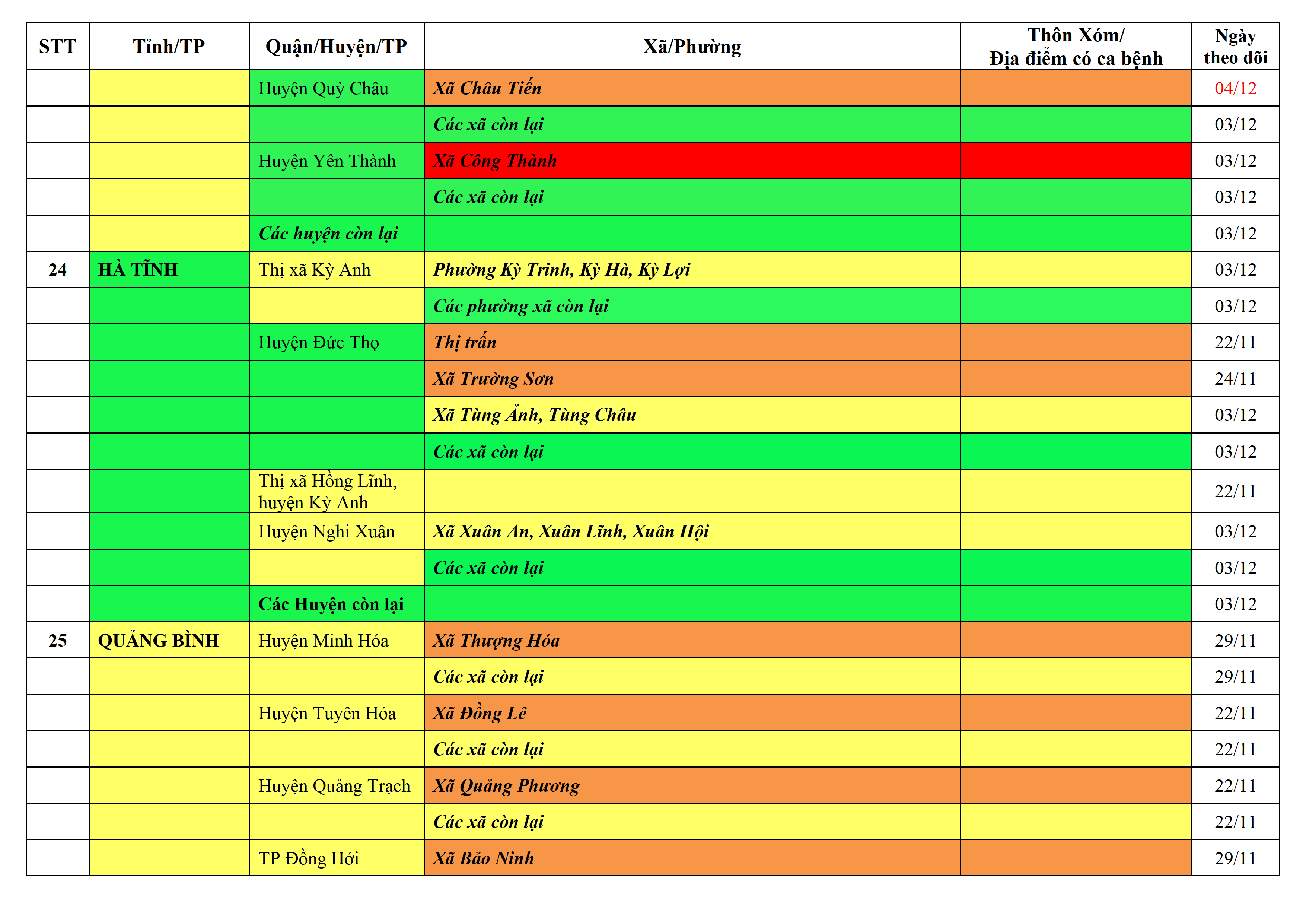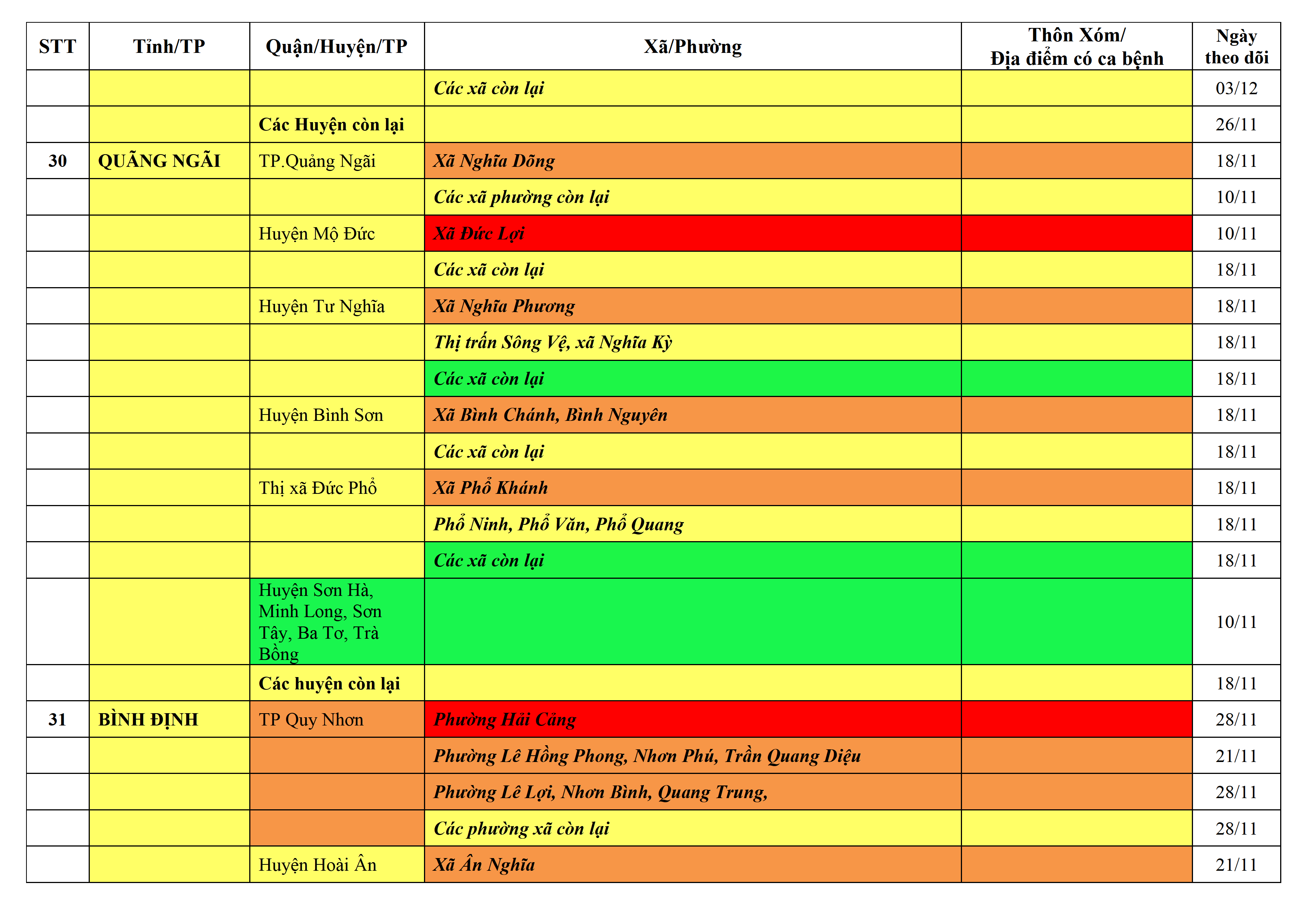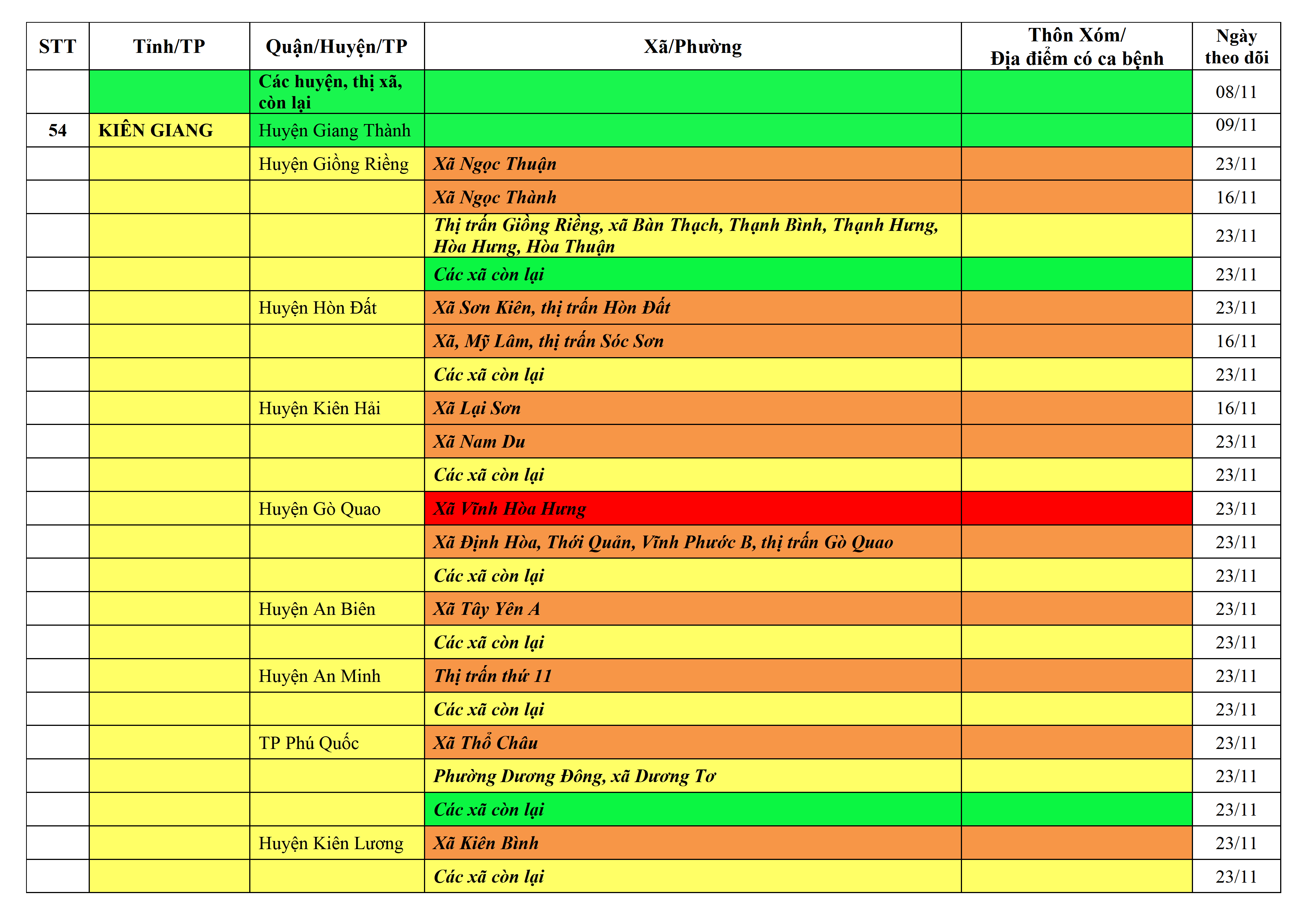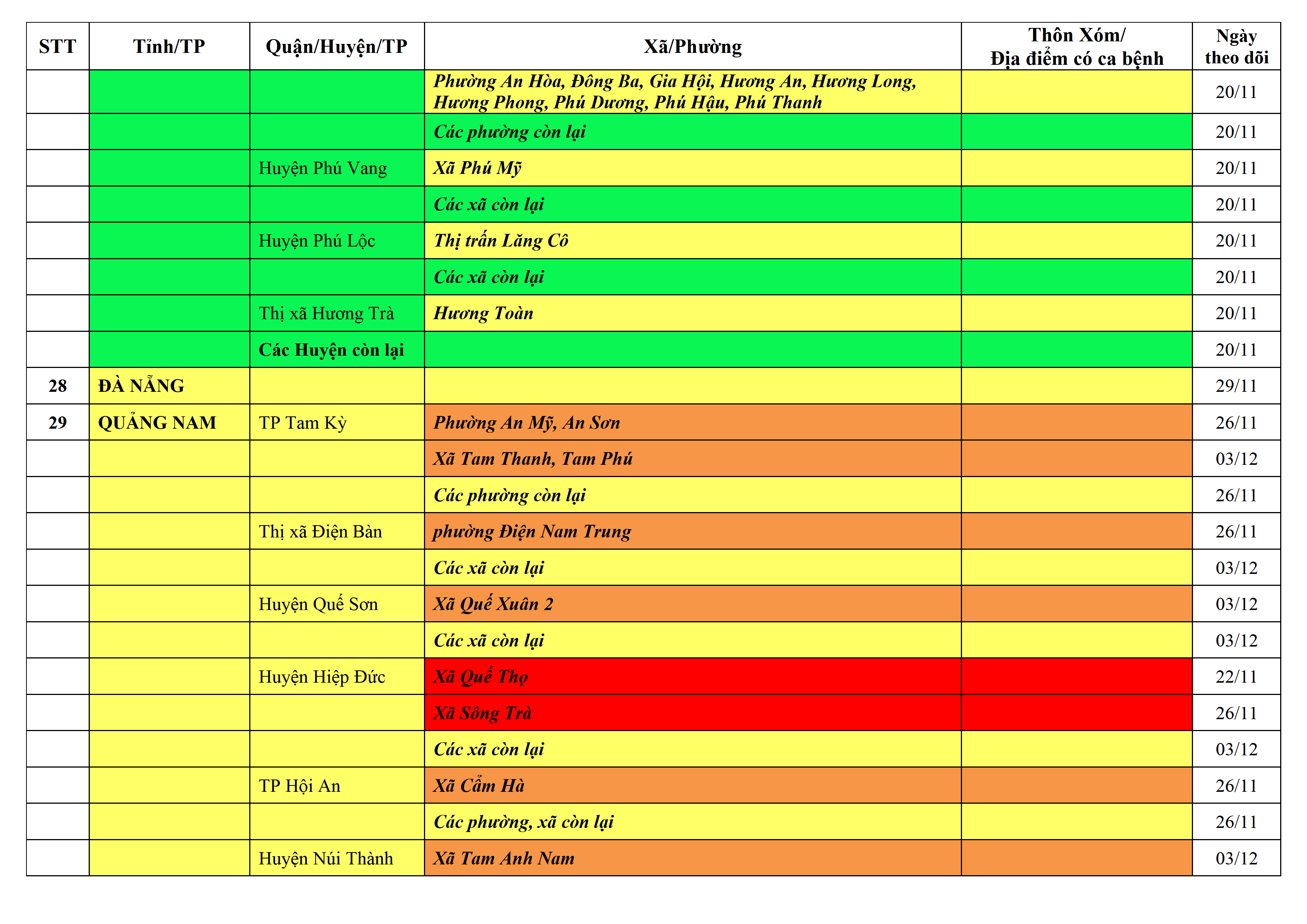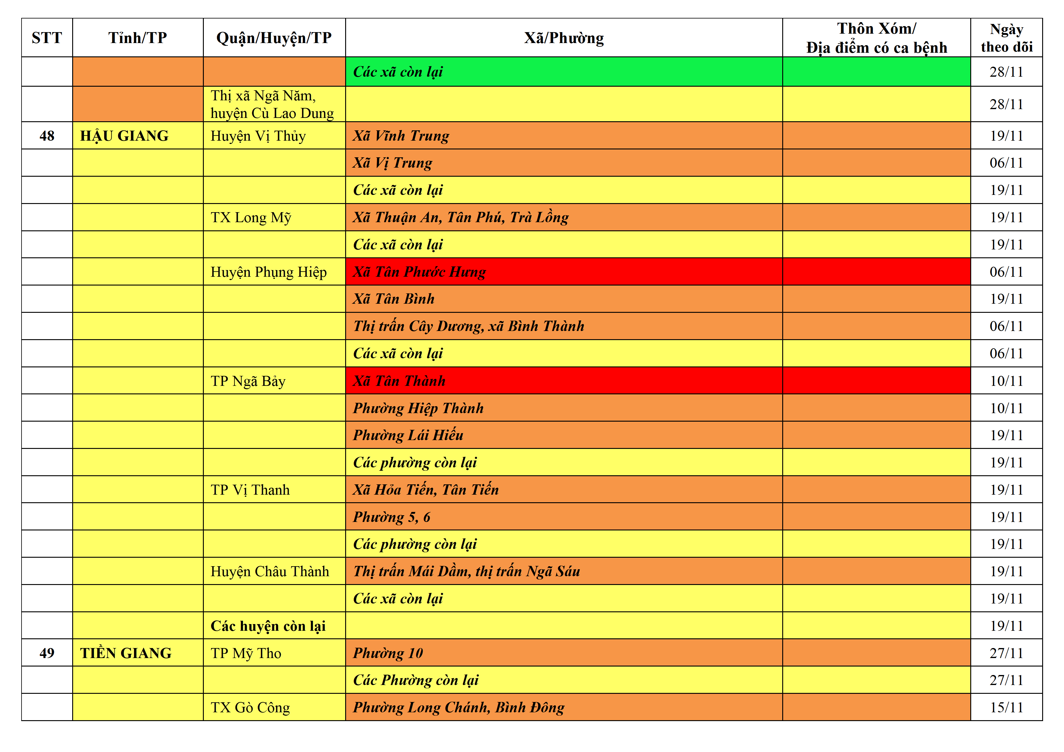 Áp dụng biện pháp tương ứng màu sắc ô cột theo thôn xóm; xã phường; quận huyện; tỉnh thành phố. Cách ly y tế dựa vào việc tiếp xúc, đi đến địa điểm và nơi cư trú có ca bệnh, theo Thông báo của Bộ Y tế, các tỉnh thành phố.