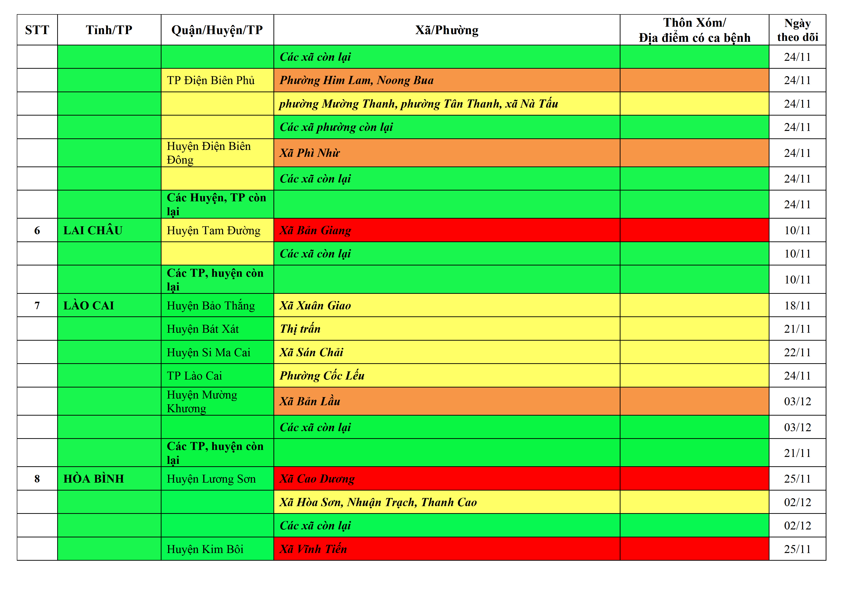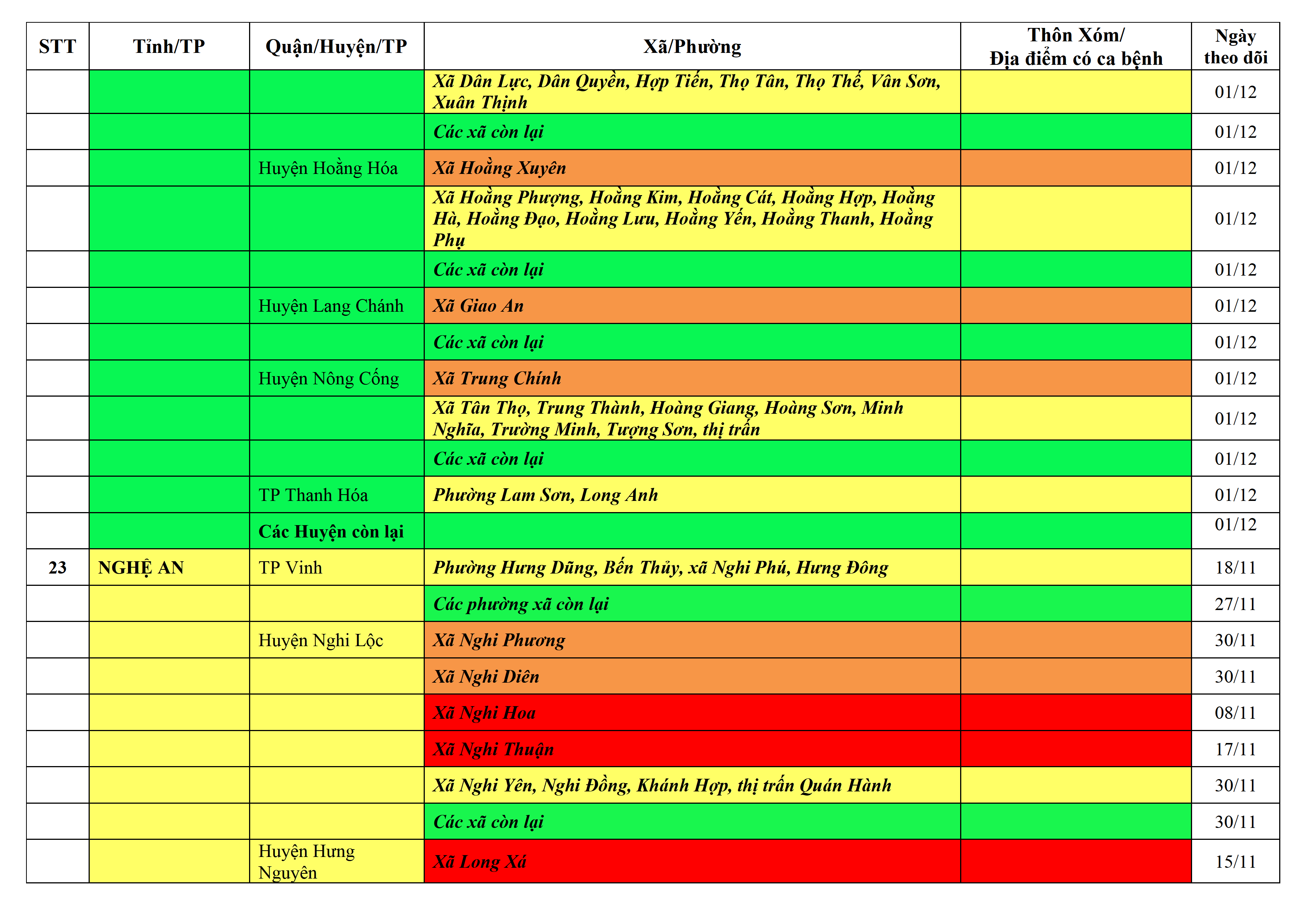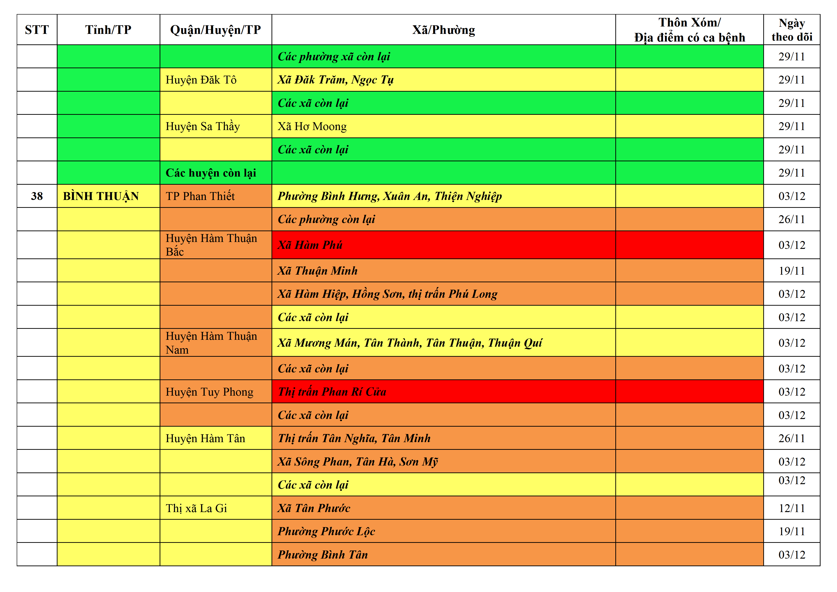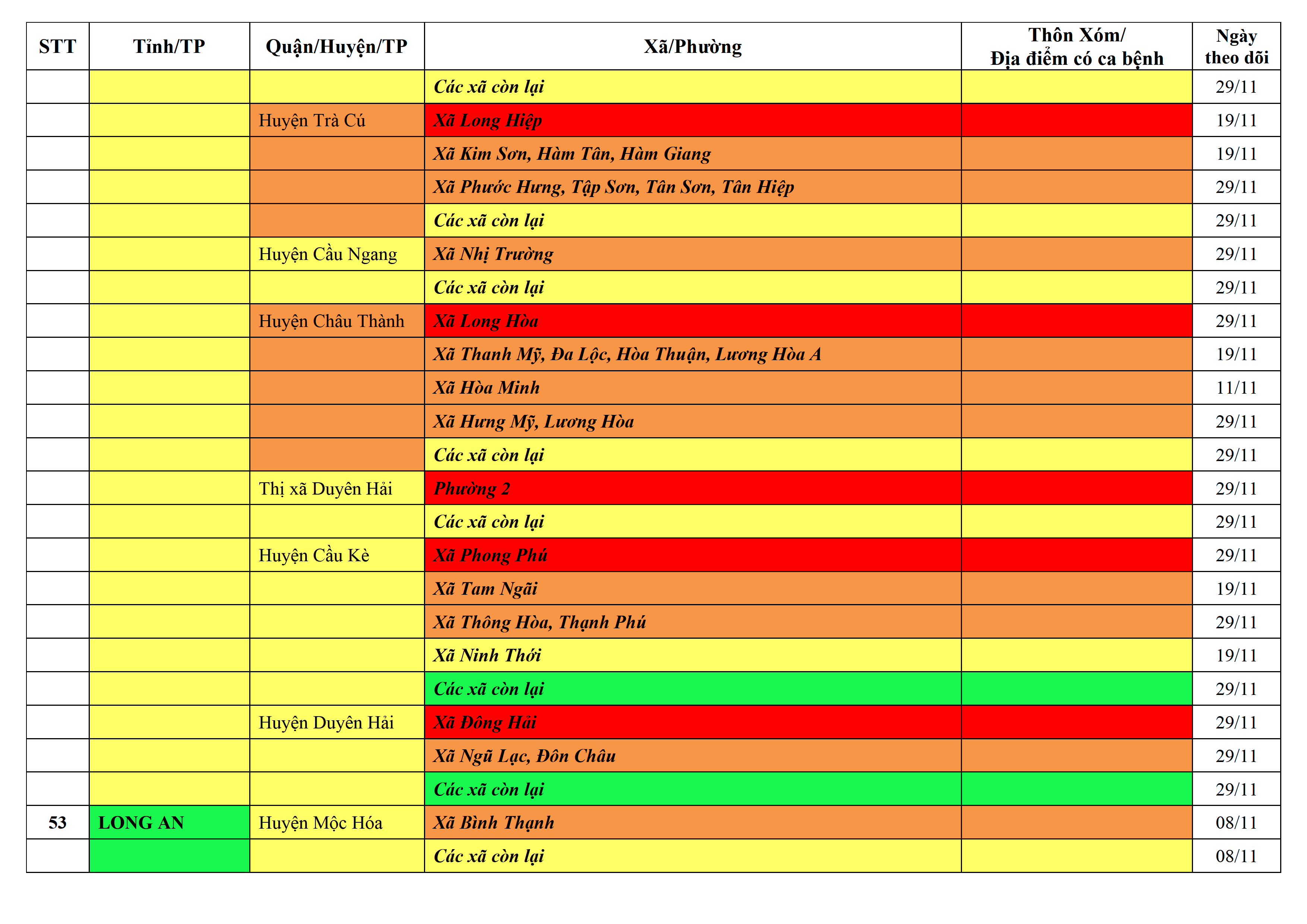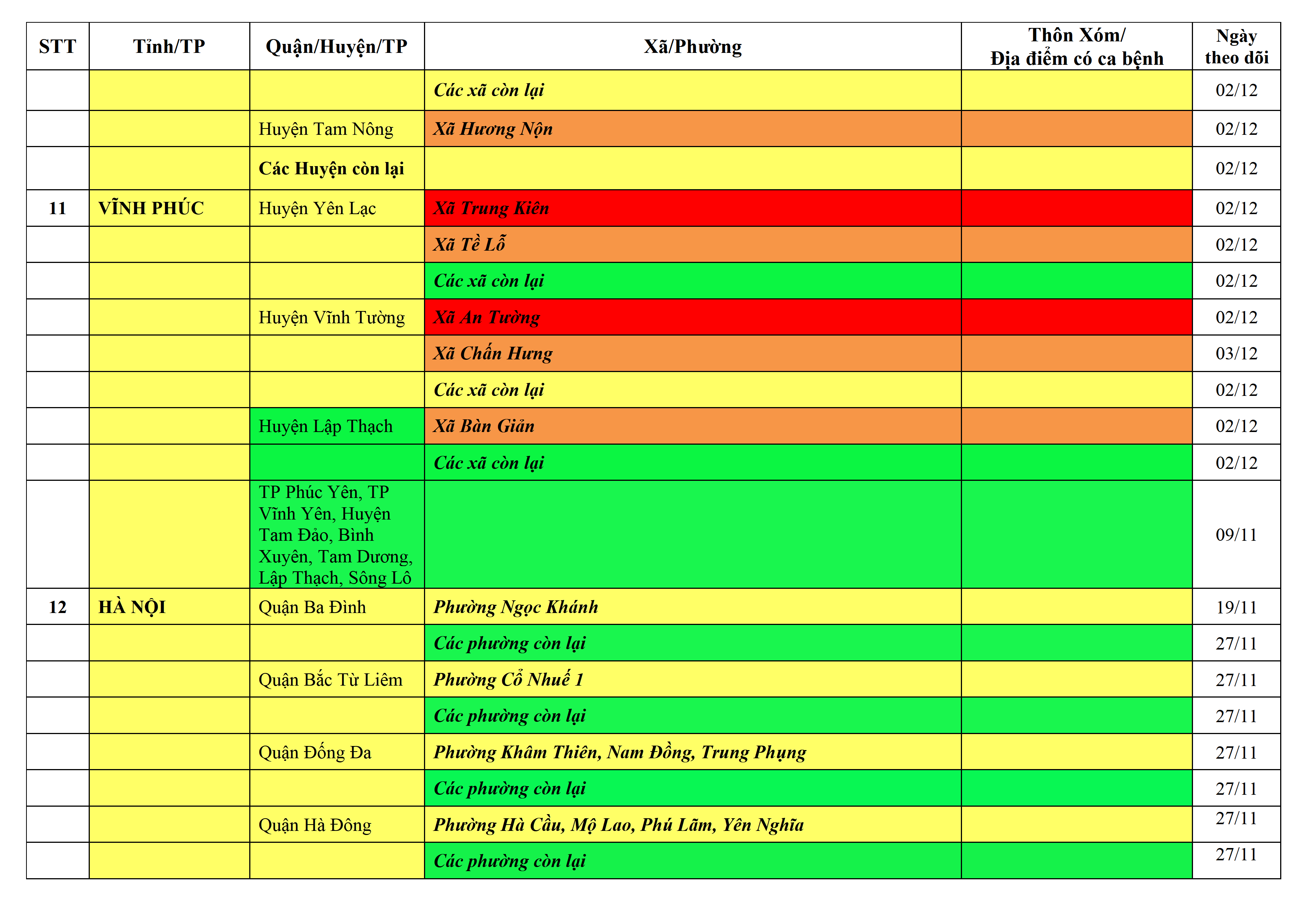 Áp dụng biện pháp tương ứng màu sắc ô cột theo thôn xóm; xã phường; quận huyện; tỉnh thành phố. Cách ly y tế dựa vào việc tiếp xúc, đi đến địa điểm và nơi cư trú có ca bệnh, theo Thông báo của Bộ Y tế, các tỉnh thành phố.