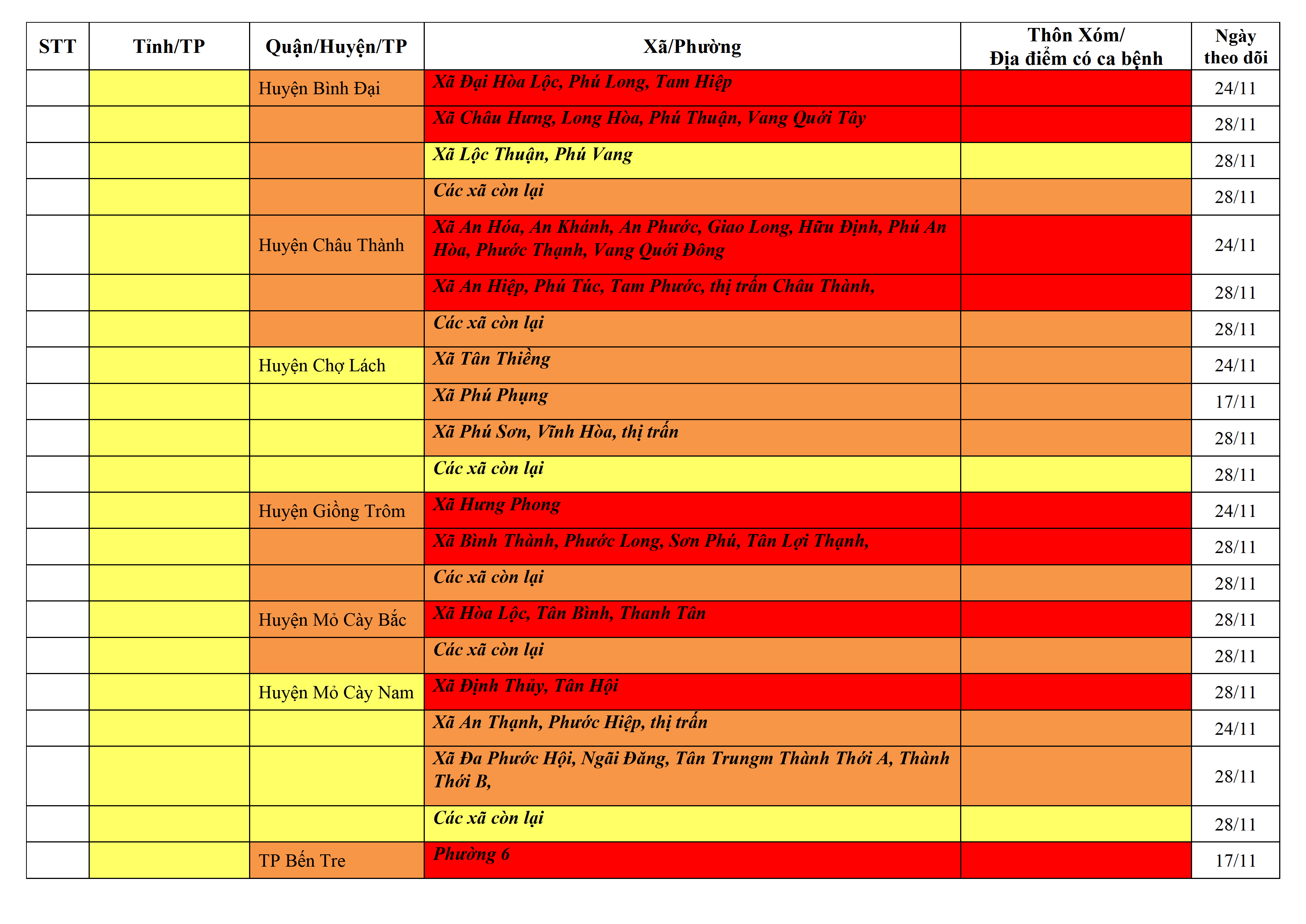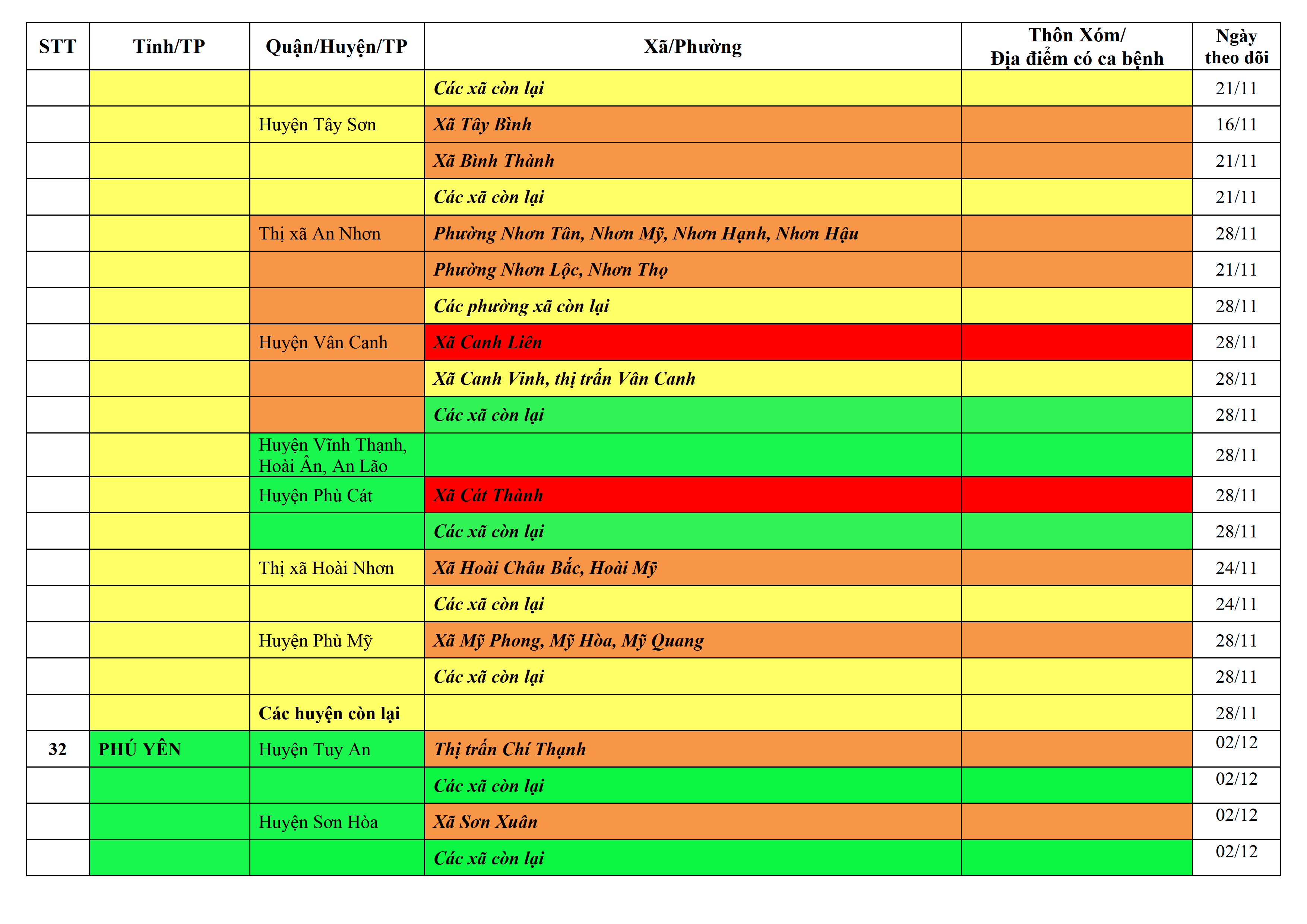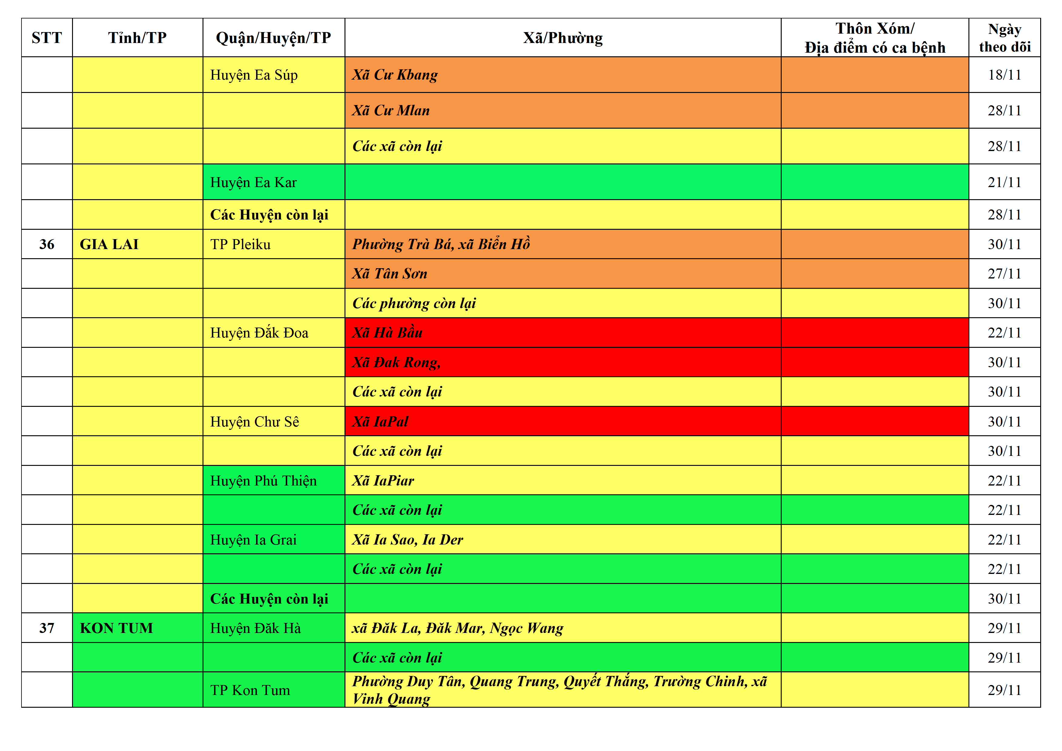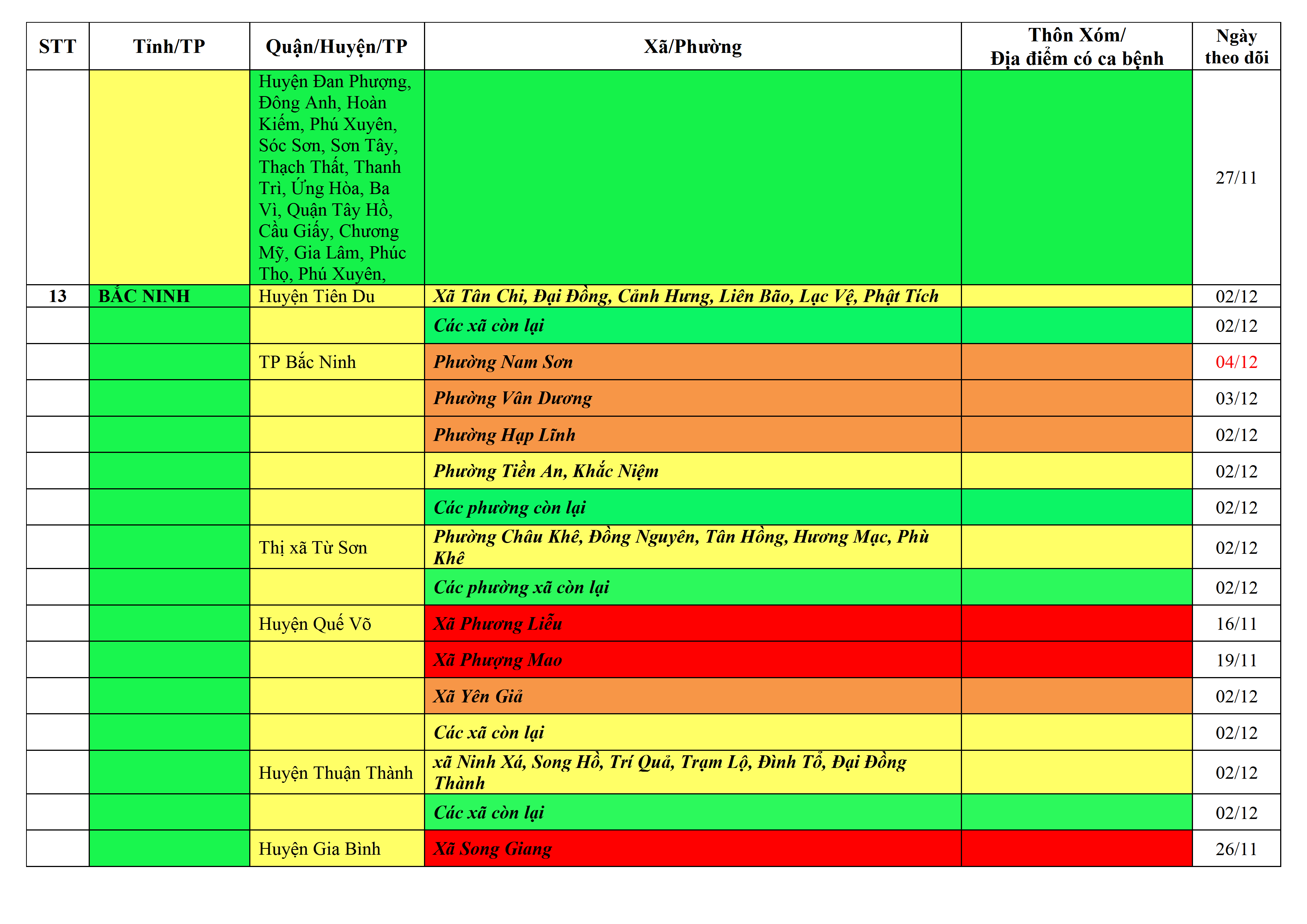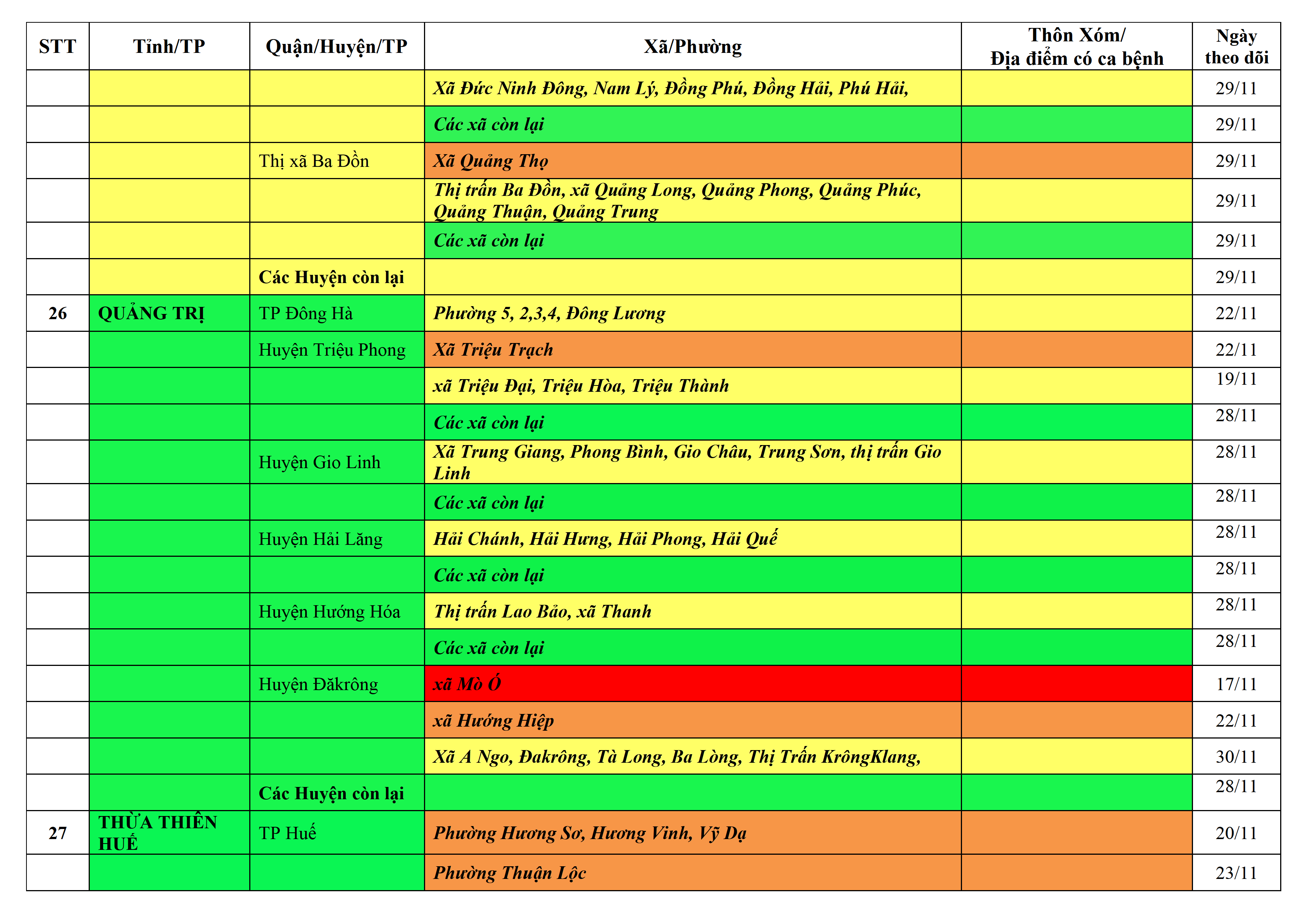 Áp dụng biện pháp tương ứng màu sắc ô cột theo thôn xóm; xã phường; quận huyện; tỉnh thành phố. Cách ly y tế dựa vào việc tiếp xúc, đi đến địa điểm và nơi cư trú có ca bệnh, theo Thông báo của Bộ Y tế, các tỉnh thành phố.