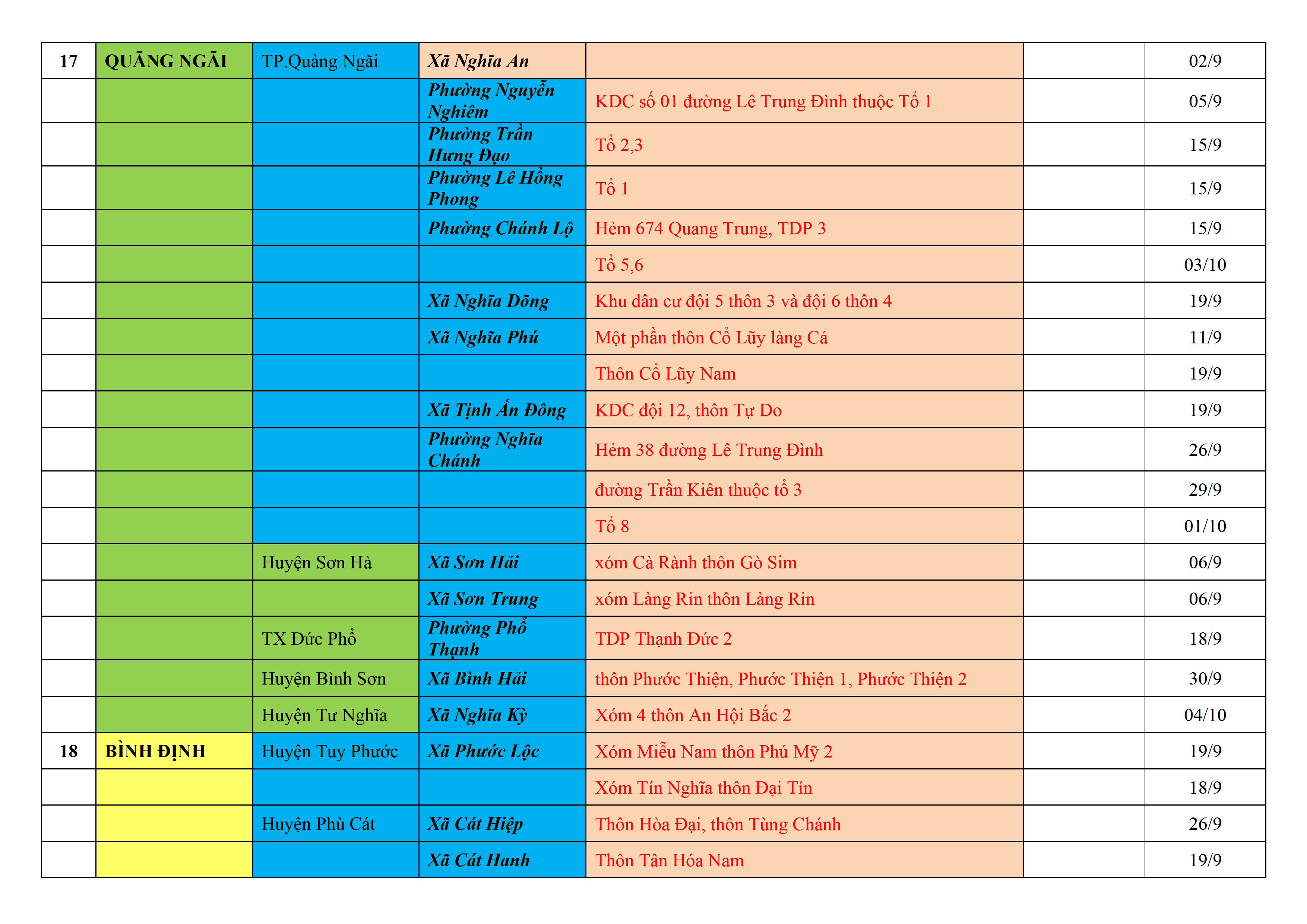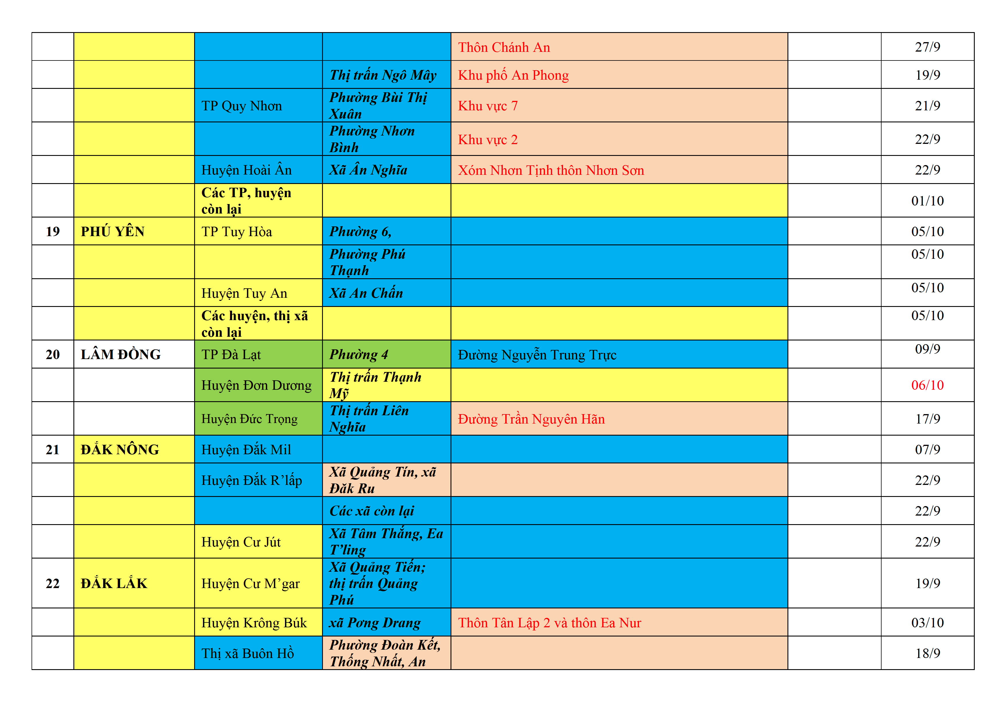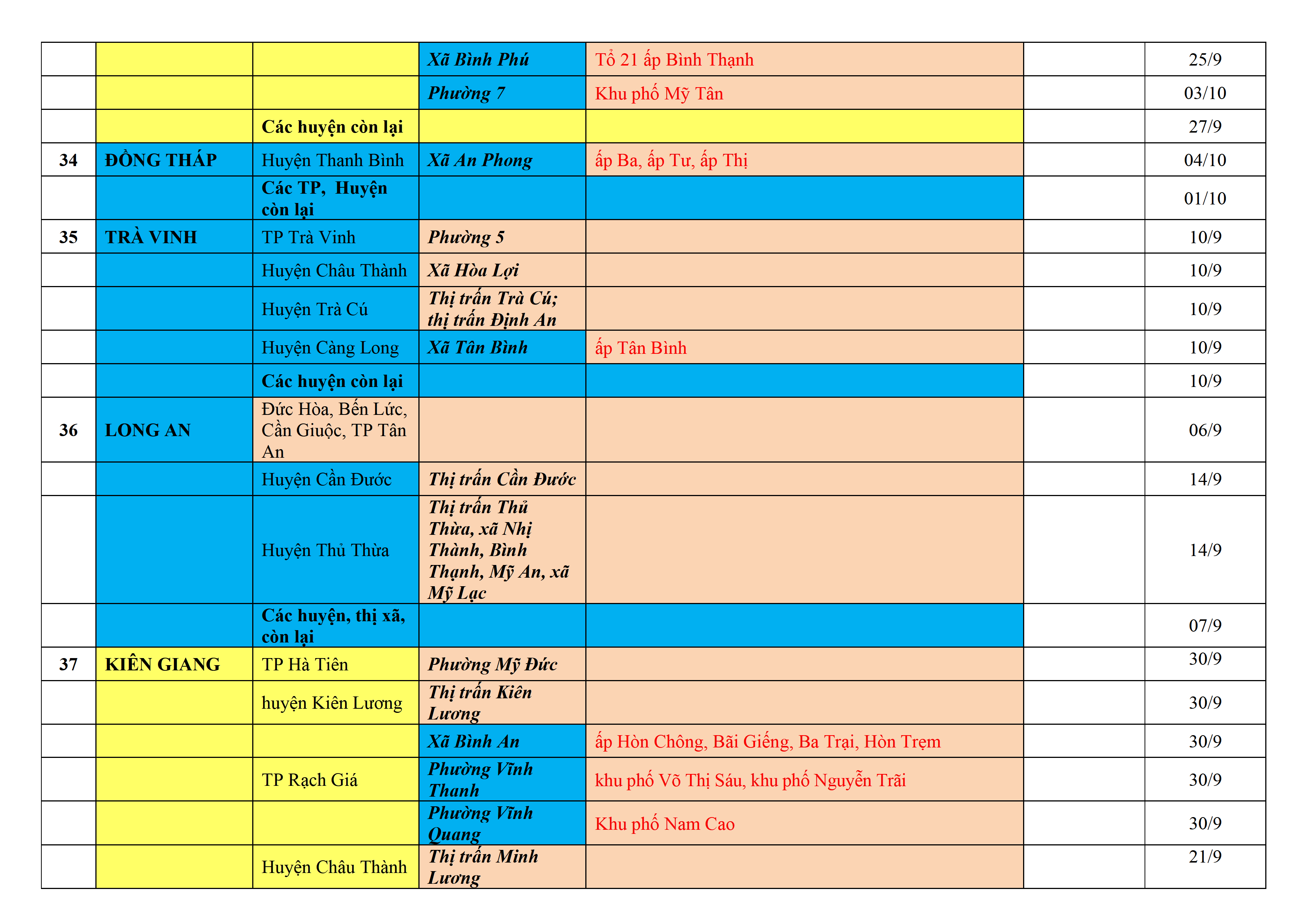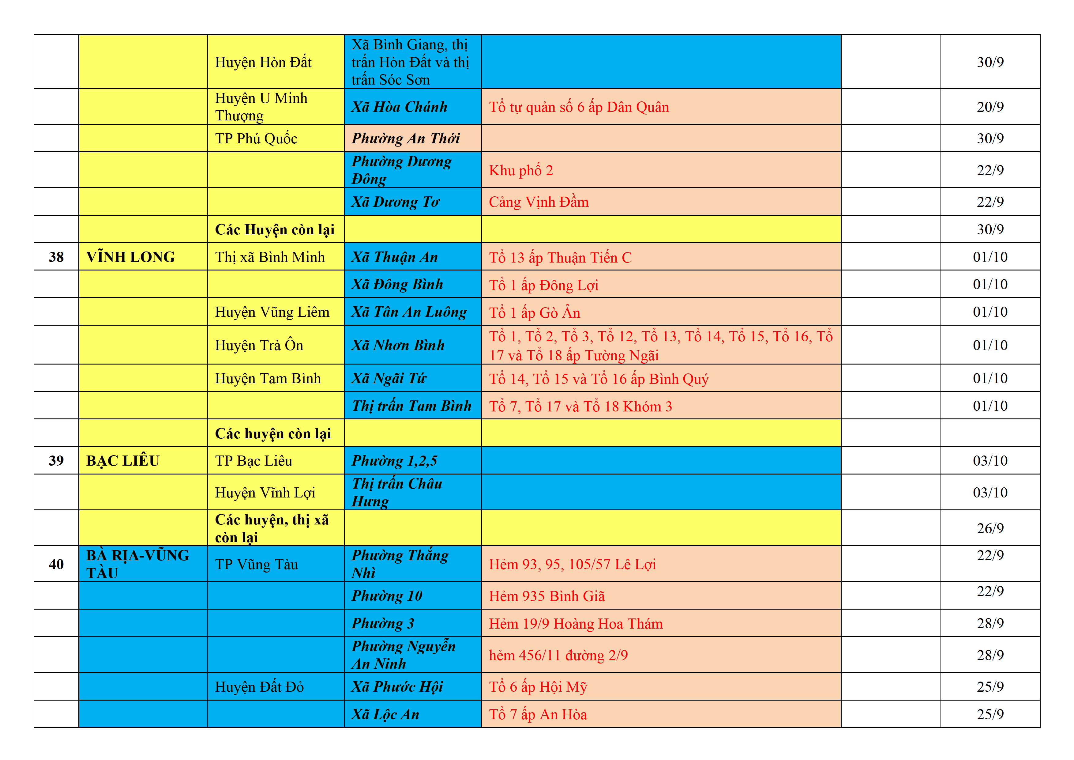 Biện pháp phòng, chống dịch COVID-19: Áp dụng biện pháp tương ứng màu sắc ô cột theo thôn xóm; xã phường; quận huyện; tỉnh thành phố. Cách ly y tế dựa vào việc tiếp xúc, đi đến địa điểm và nơi cư trú có ca bệnh, theo Thông báo của Bộ Y tế, các tỉnh thành phố.