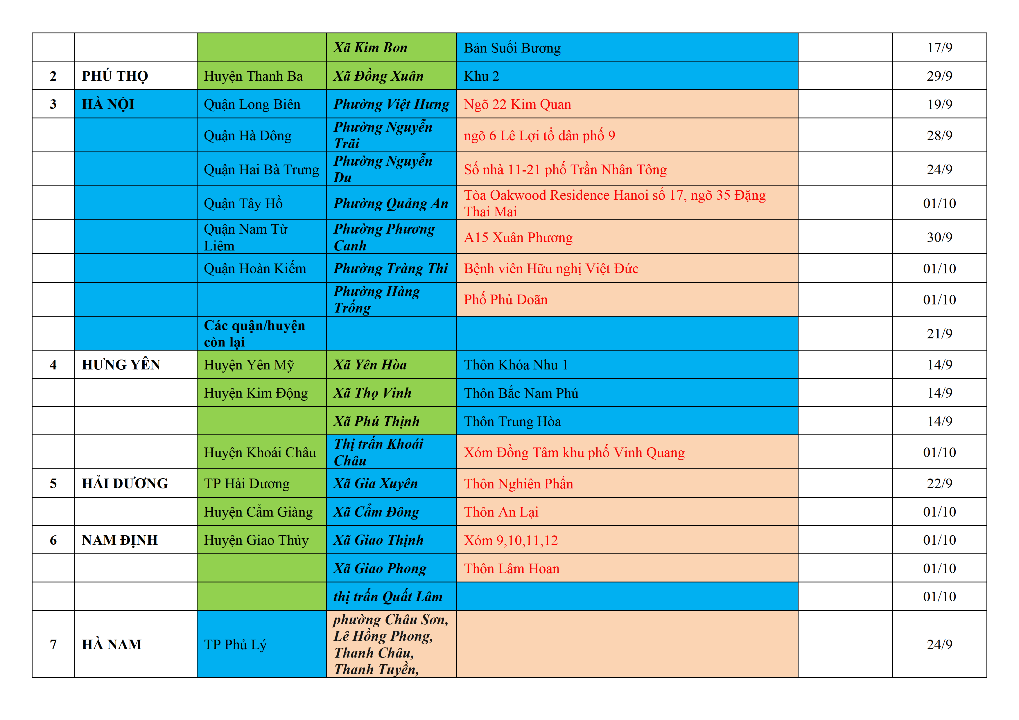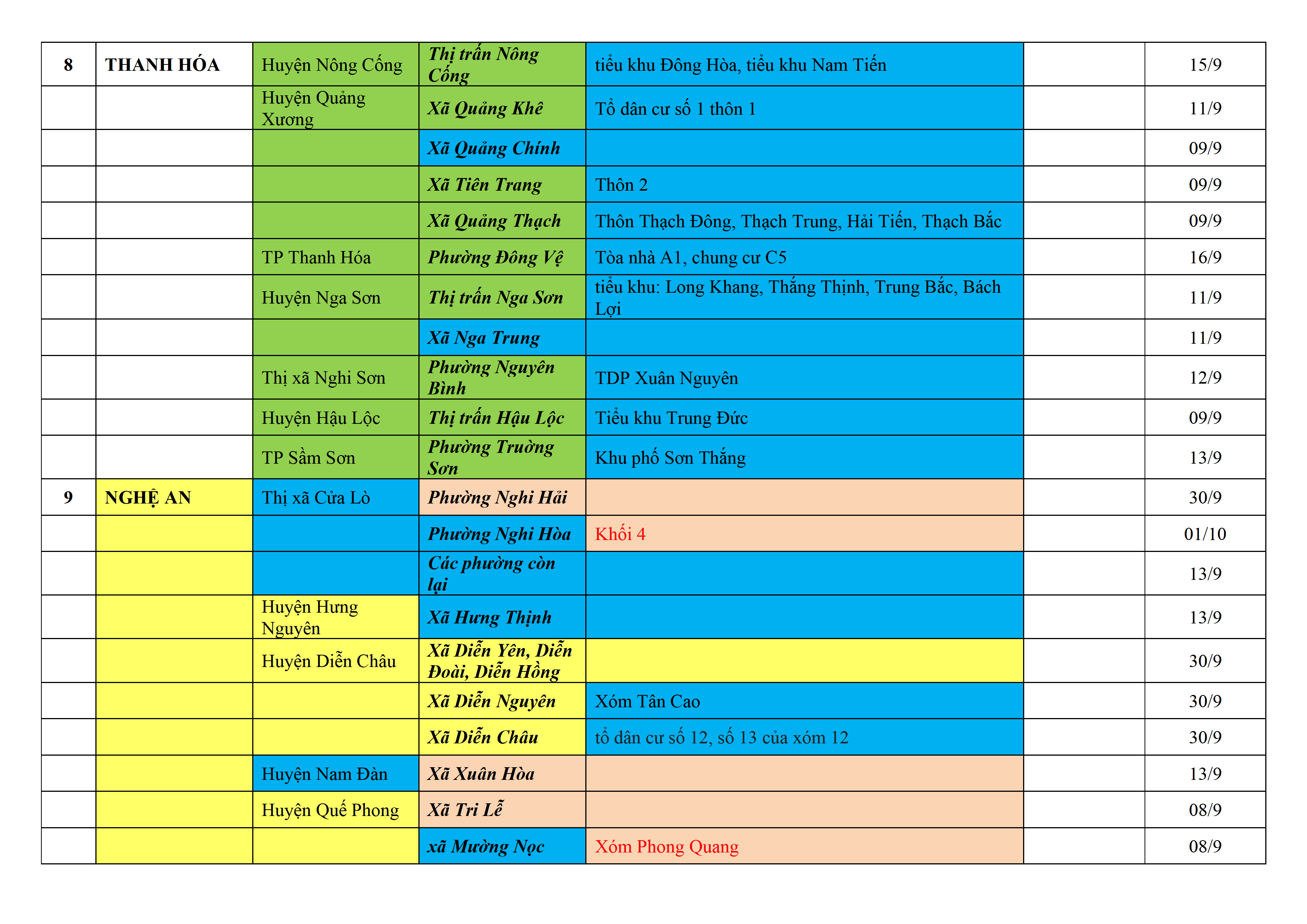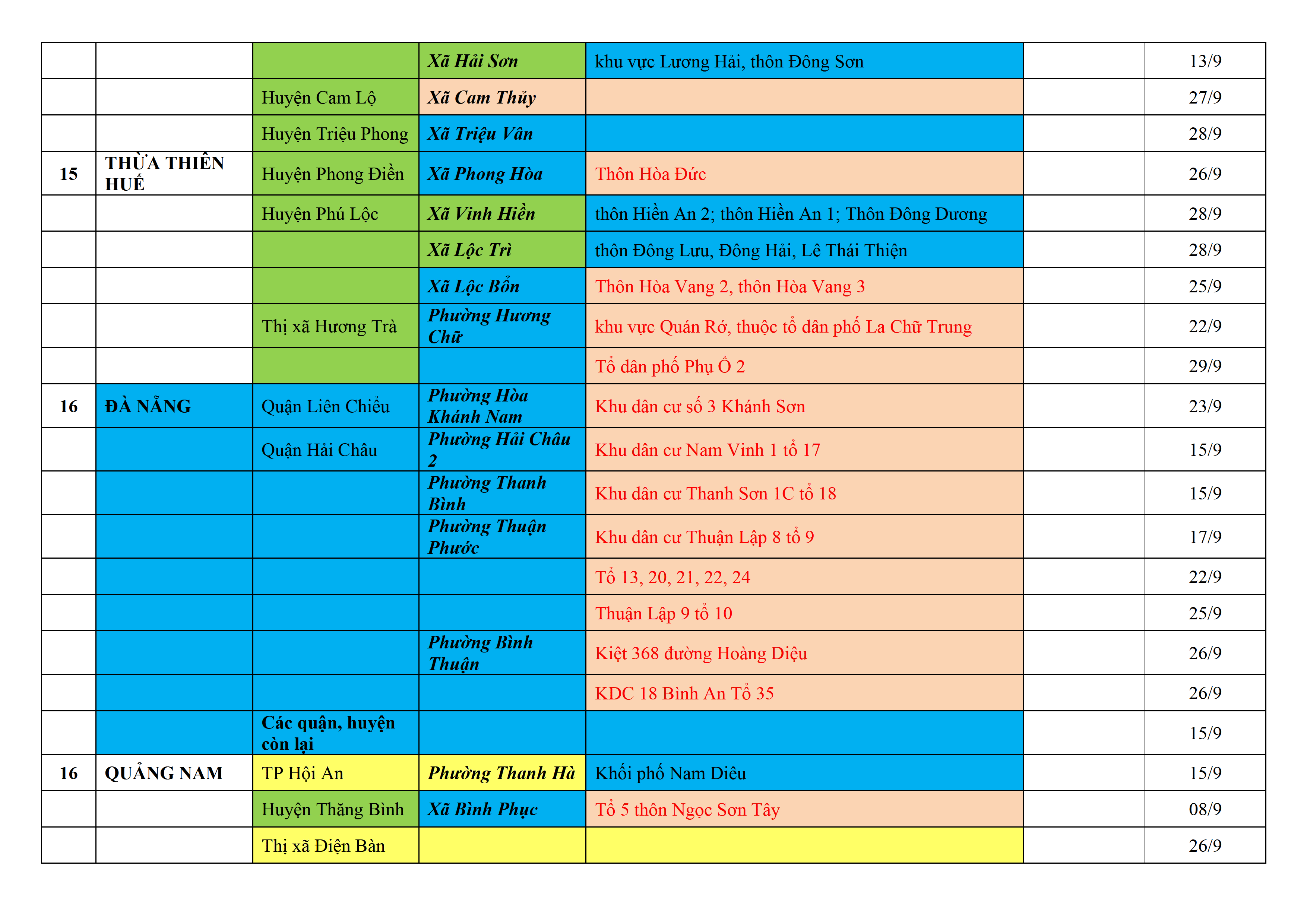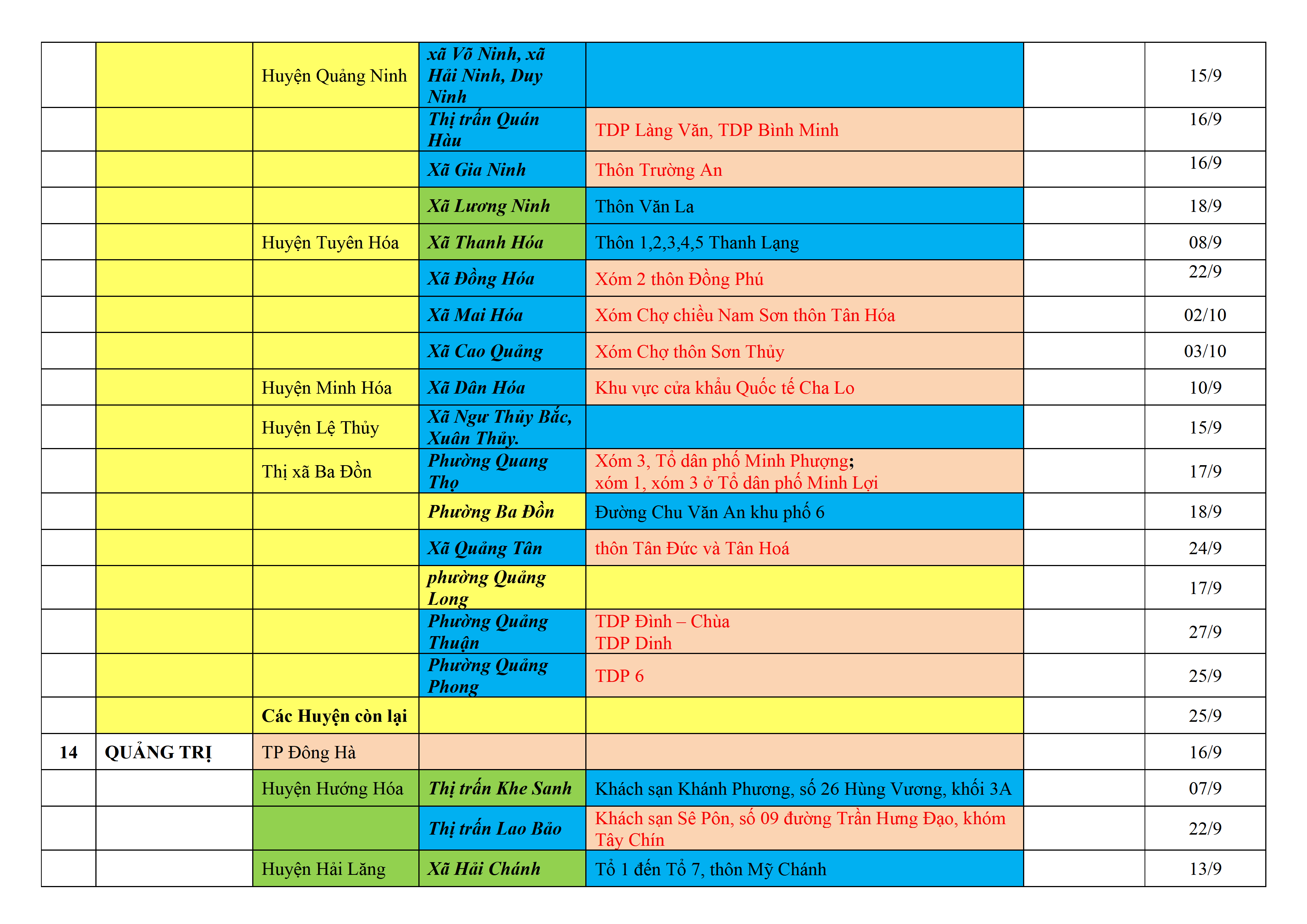 Biện pháp phòng, chống dịch COVID-19: Áp dụng biện pháp tương ứng màu sắc ô cột theo thôn xóm; xã phường; quận huyện; tỉnh thành phố. Cách ly y tế dựa vào việc tiếp xúc, đi đến địa điểm và nơi cư trú có ca bệnh, theo Thông báo của Bộ Y tế, các tỉnh thành phố.