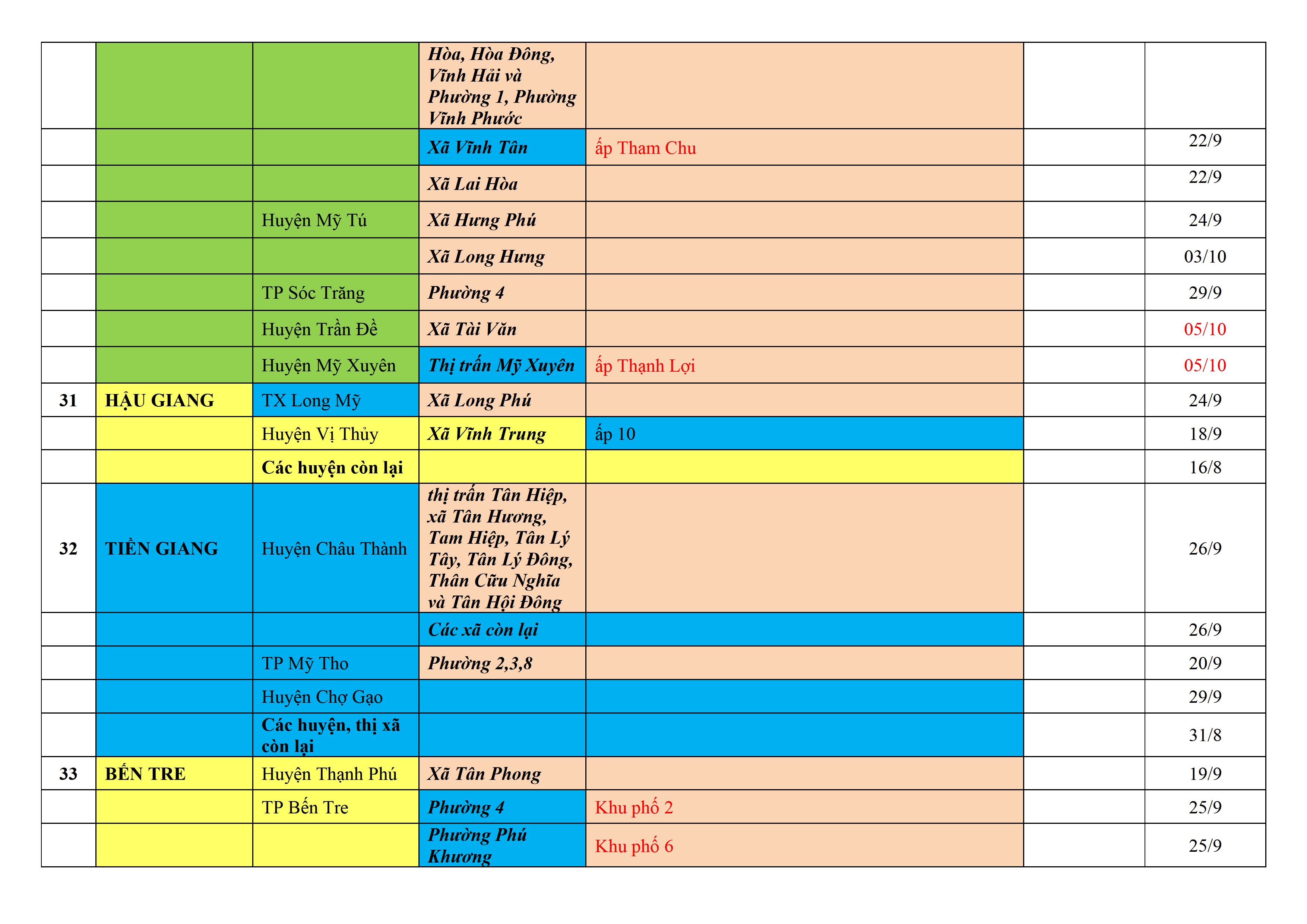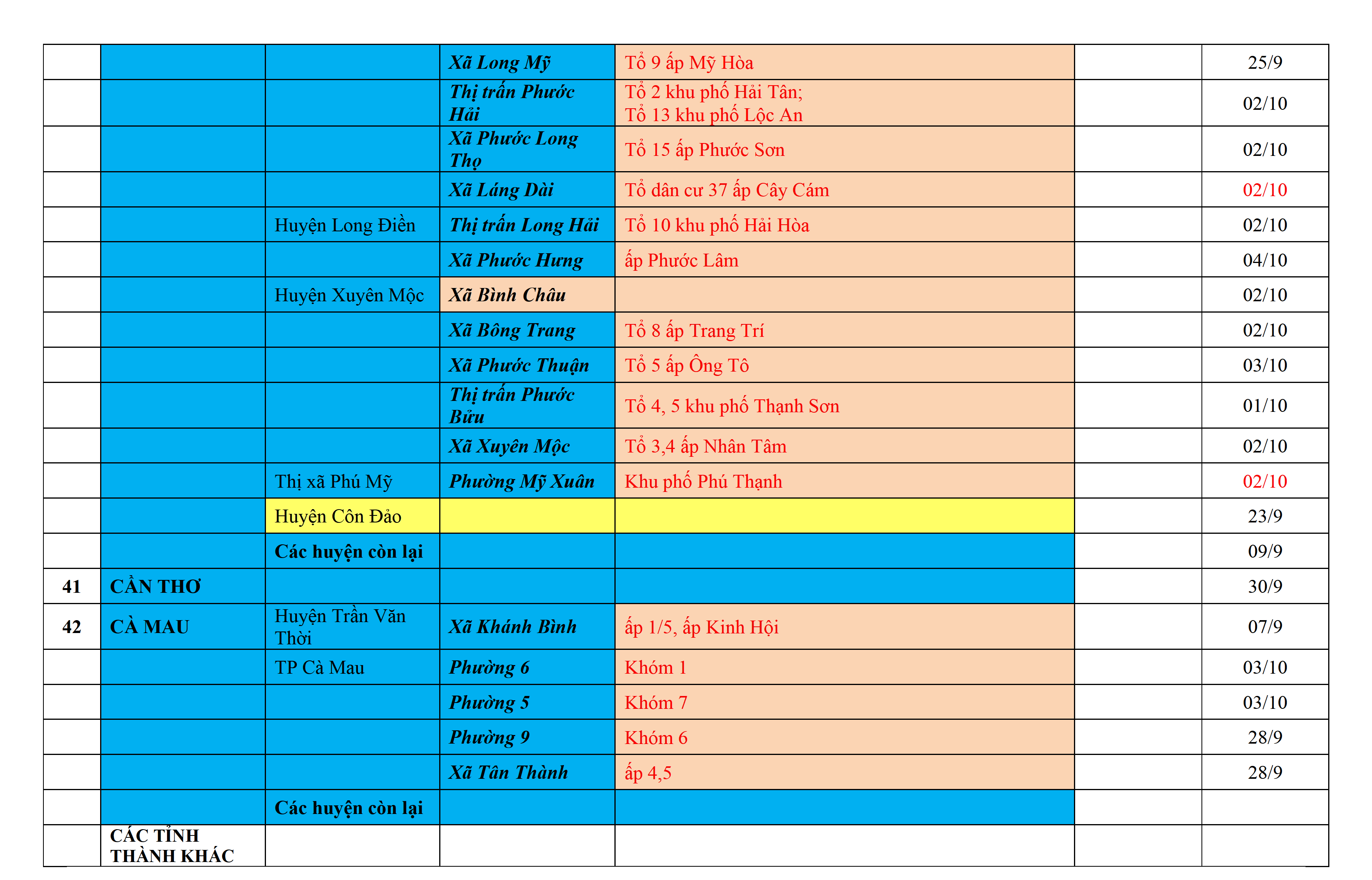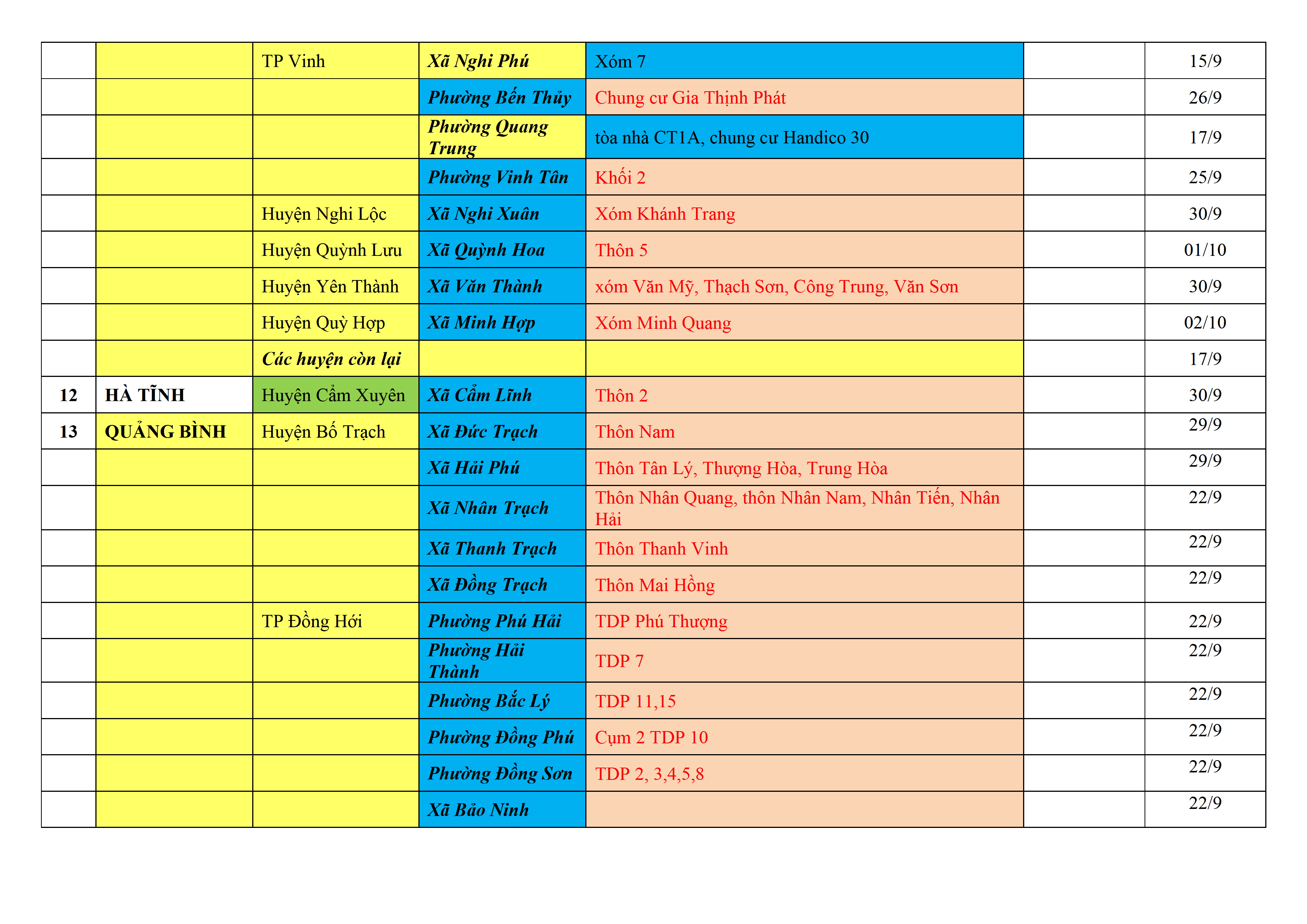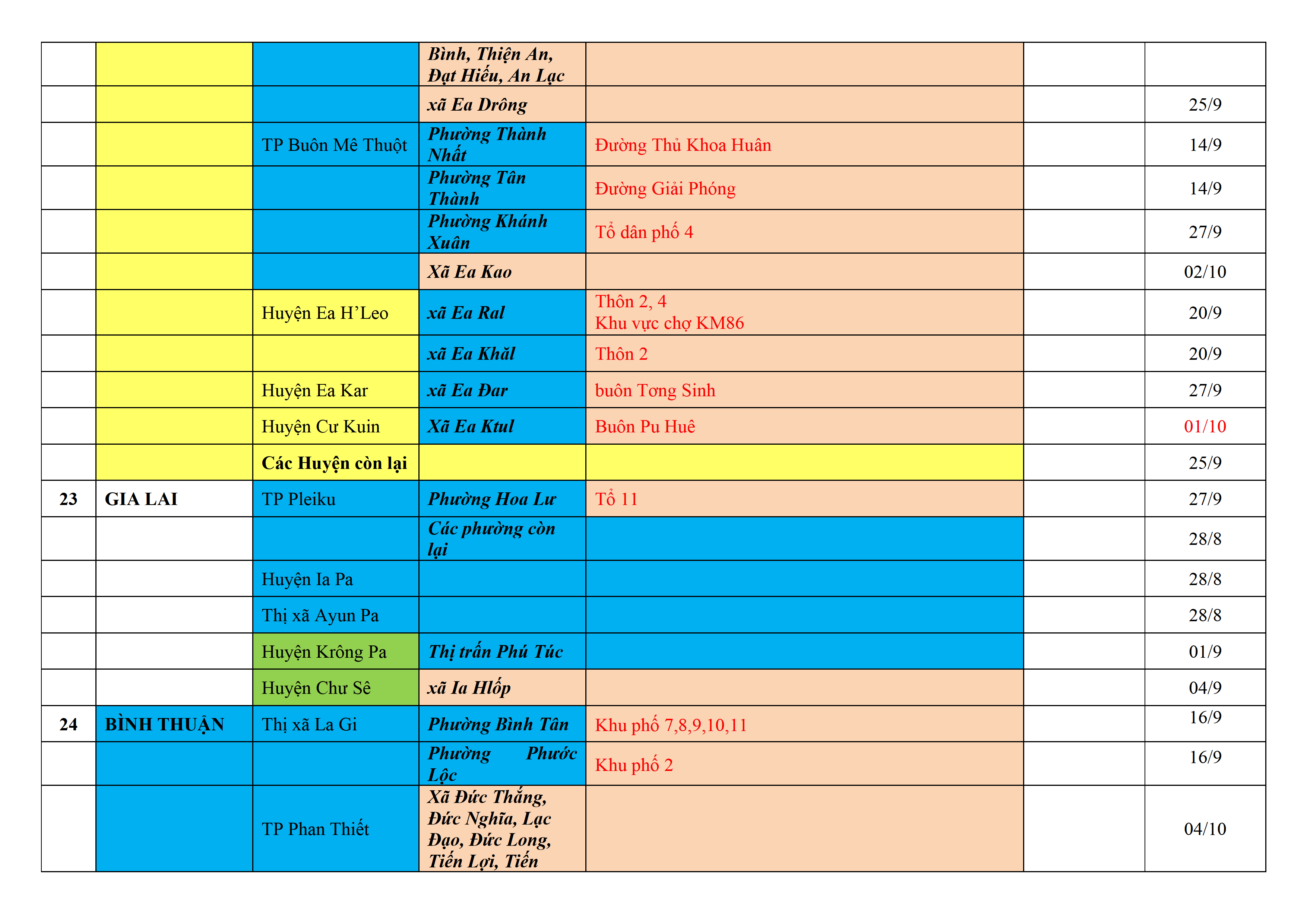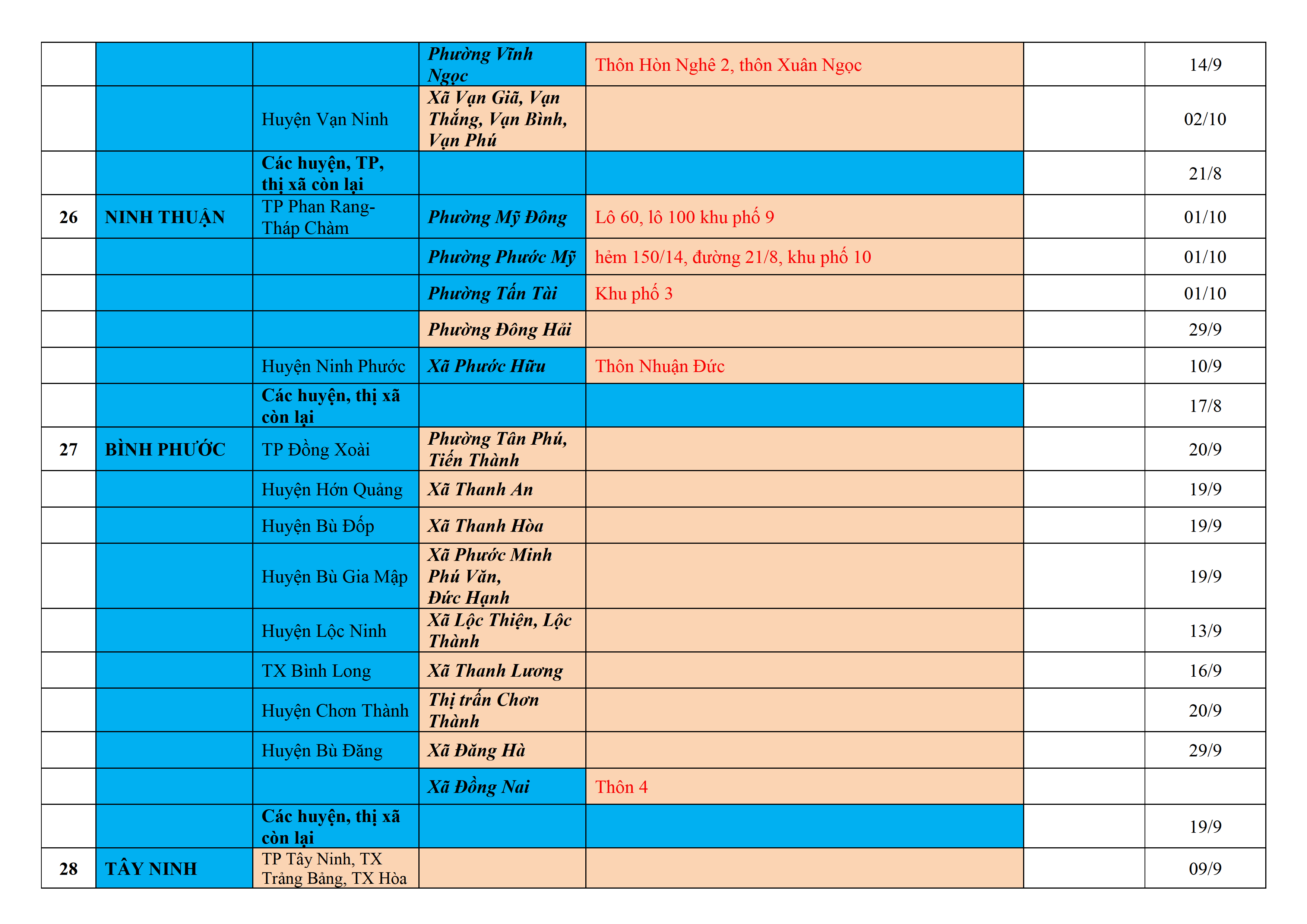 Biện pháp phòng, chống dịch COVID-19: Áp dụng biện pháp tương ứng màu sắc ô cột theo thôn xóm; xã phường; quận huyện; tỉnh thành phố. Cách ly y tế dựa vào việc tiếp xúc, đi đến địa điểm và nơi cư trú có ca bệnh, theo Thông báo của Bộ Y tế, các tỉnh thành phố.