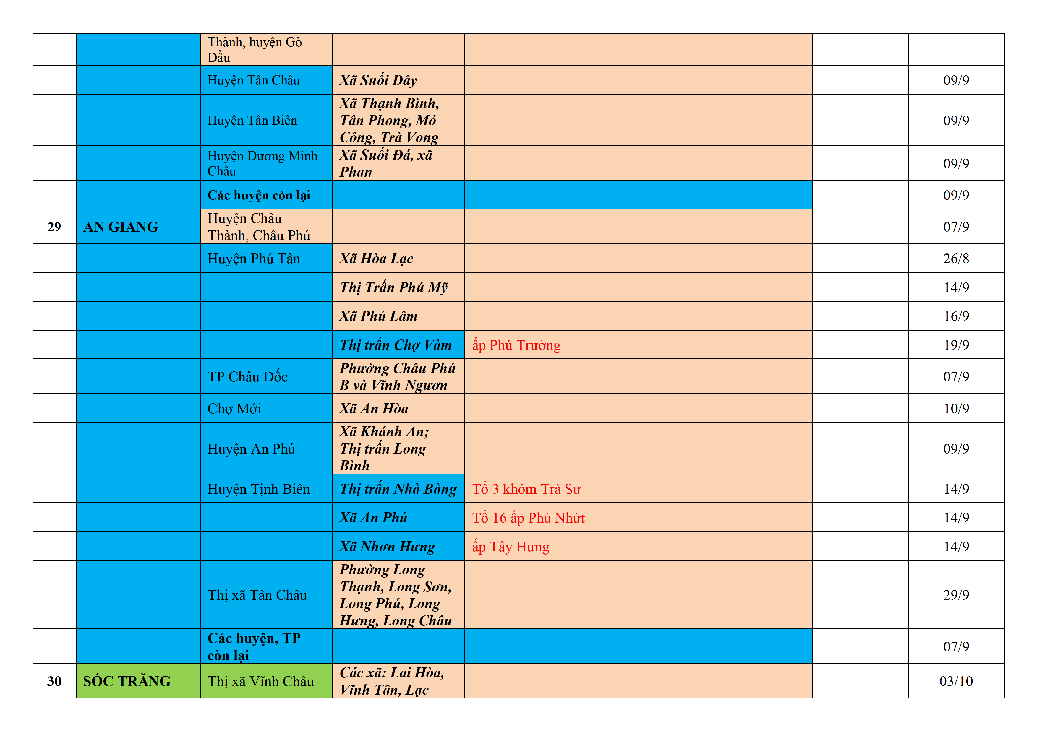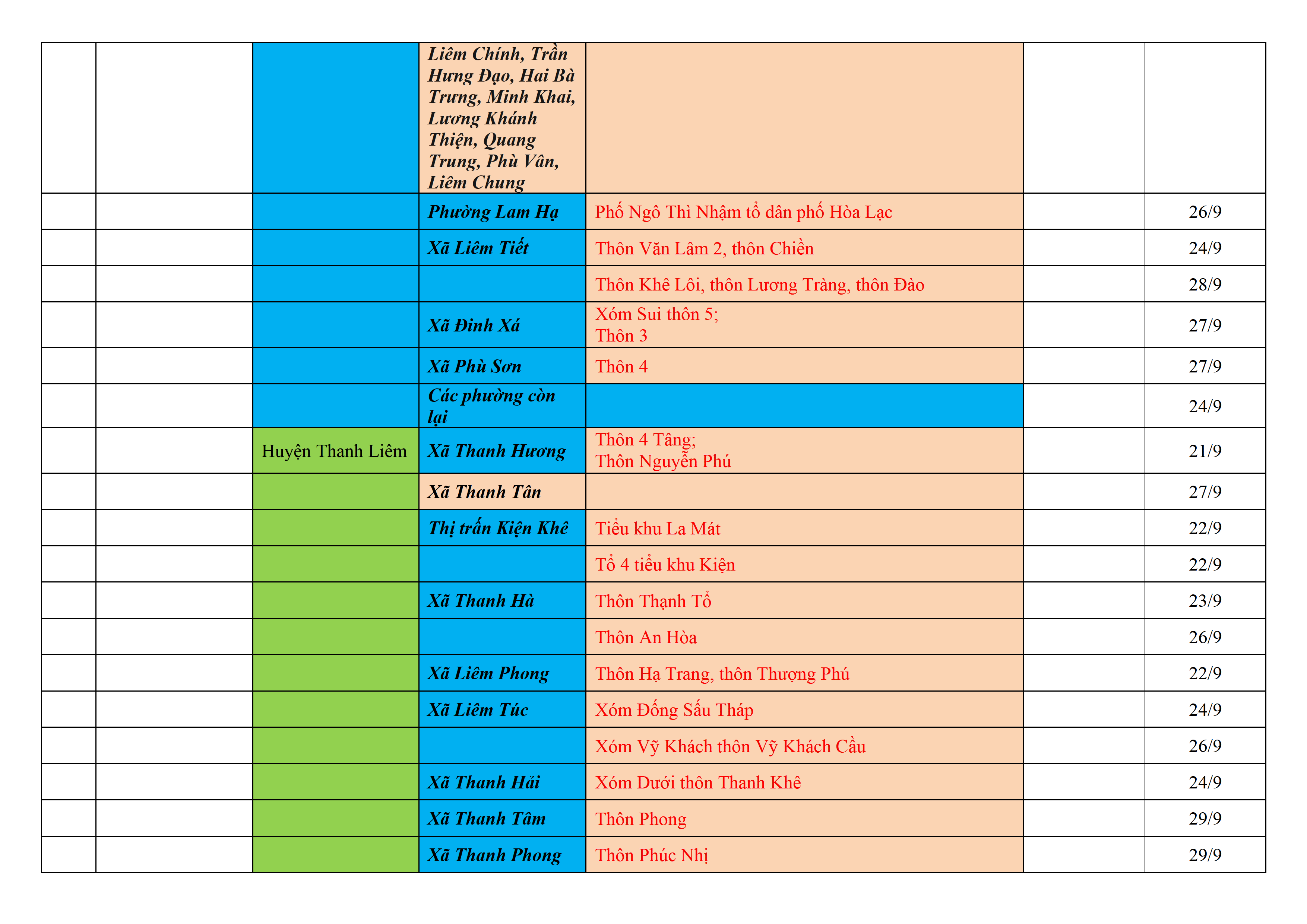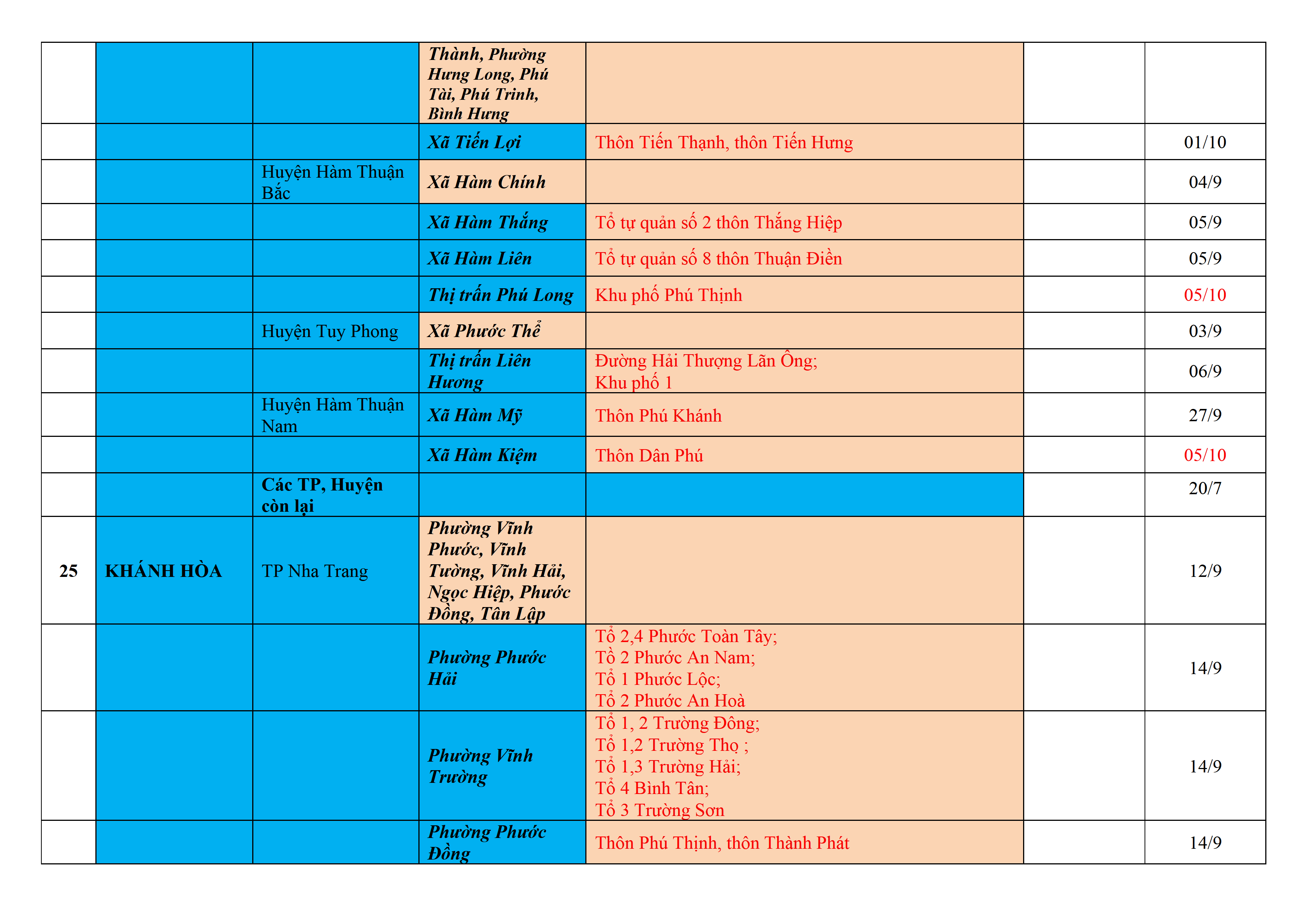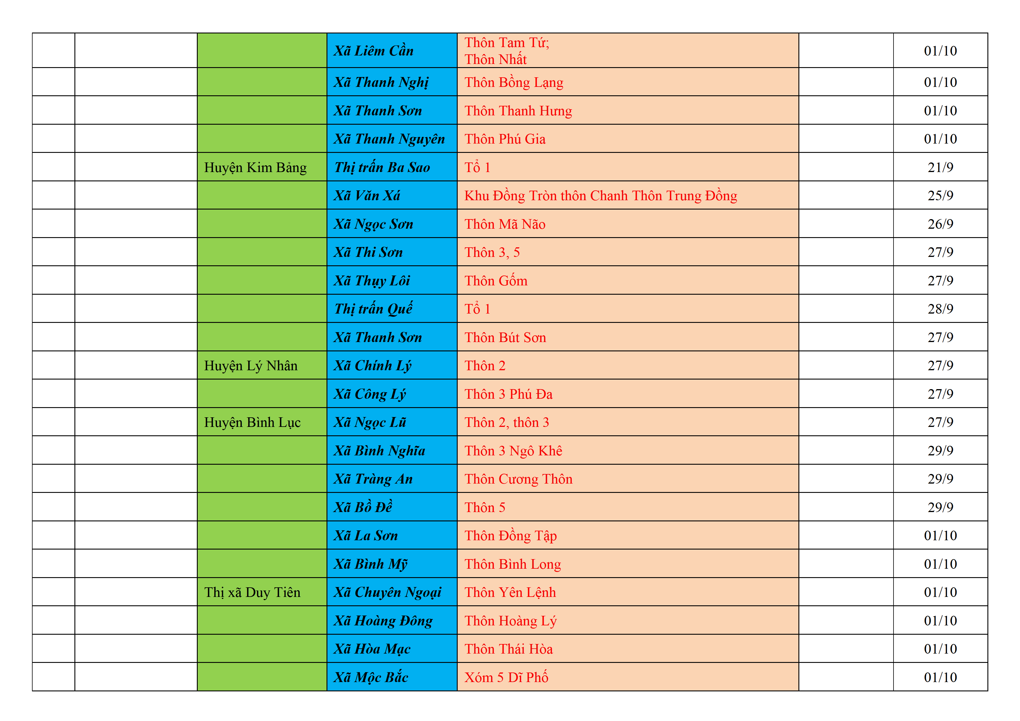 Biện pháp phòng, chống dịch COVID-19: Áp dụng biện pháp tương ứng màu sắc ô cột theo thôn xóm; xã phường; quận huyện; tỉnh thành phố. Cách ly y tế dựa vào việc tiếp xúc, đi đến địa điểm và nơi cư trú có ca bệnh, theo Thông báo của Bộ Y tế, các tỉnh thành phố.