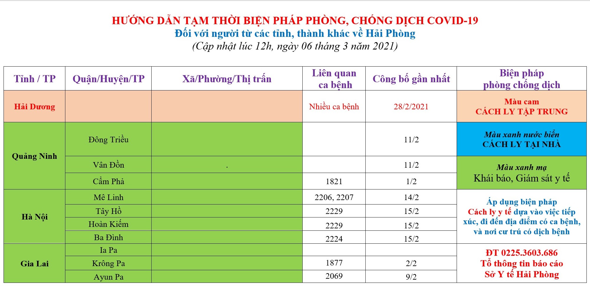 Sở Y tế Hải Phòng ban hành hướng dẫn tạm thời biện pháp phòng chống dịch COVID-19 đối với người từ các tỉnh, thành khác về thành phố như sau (thông tin cập nhật vào 12h00’ ngày 6/3/2021):